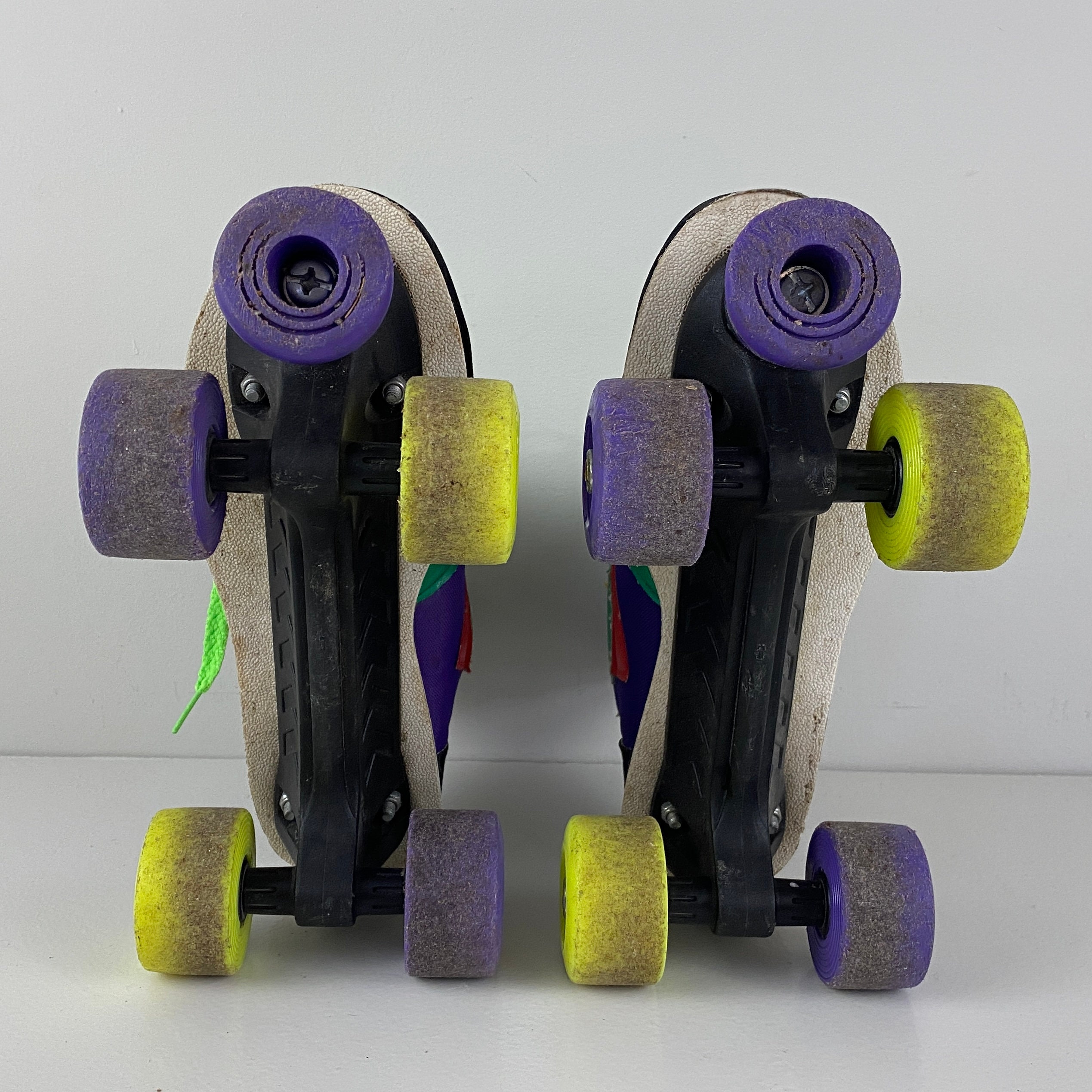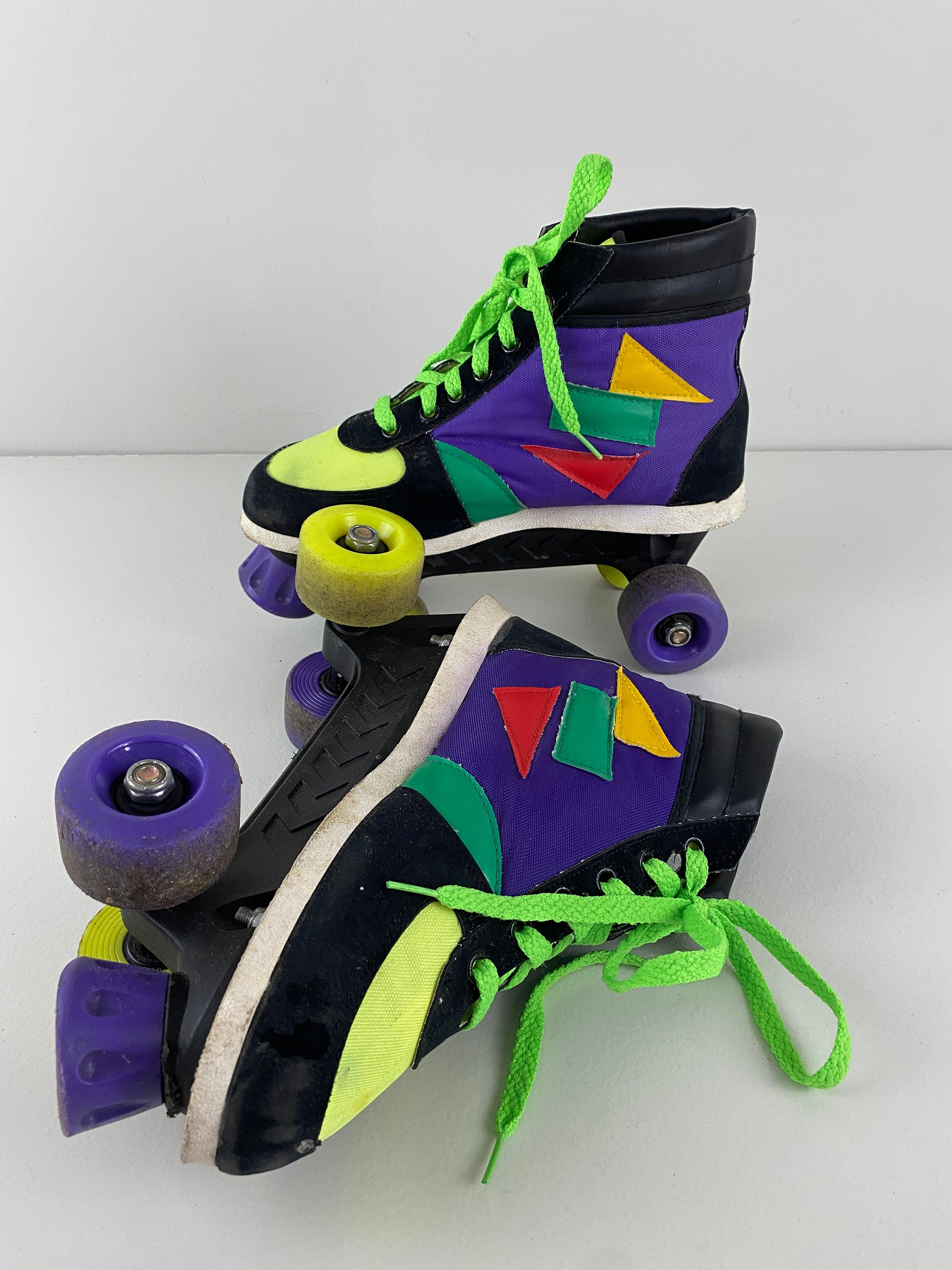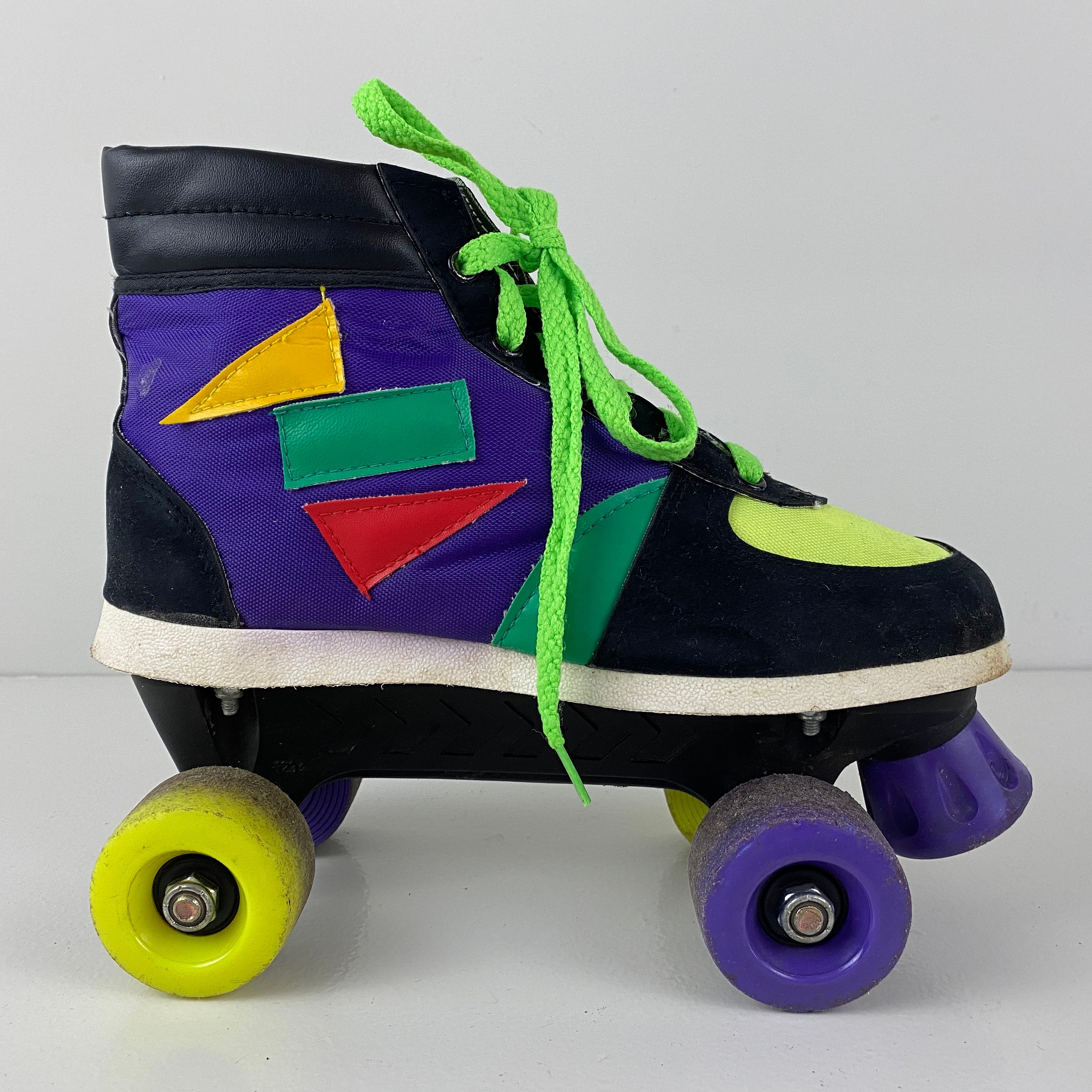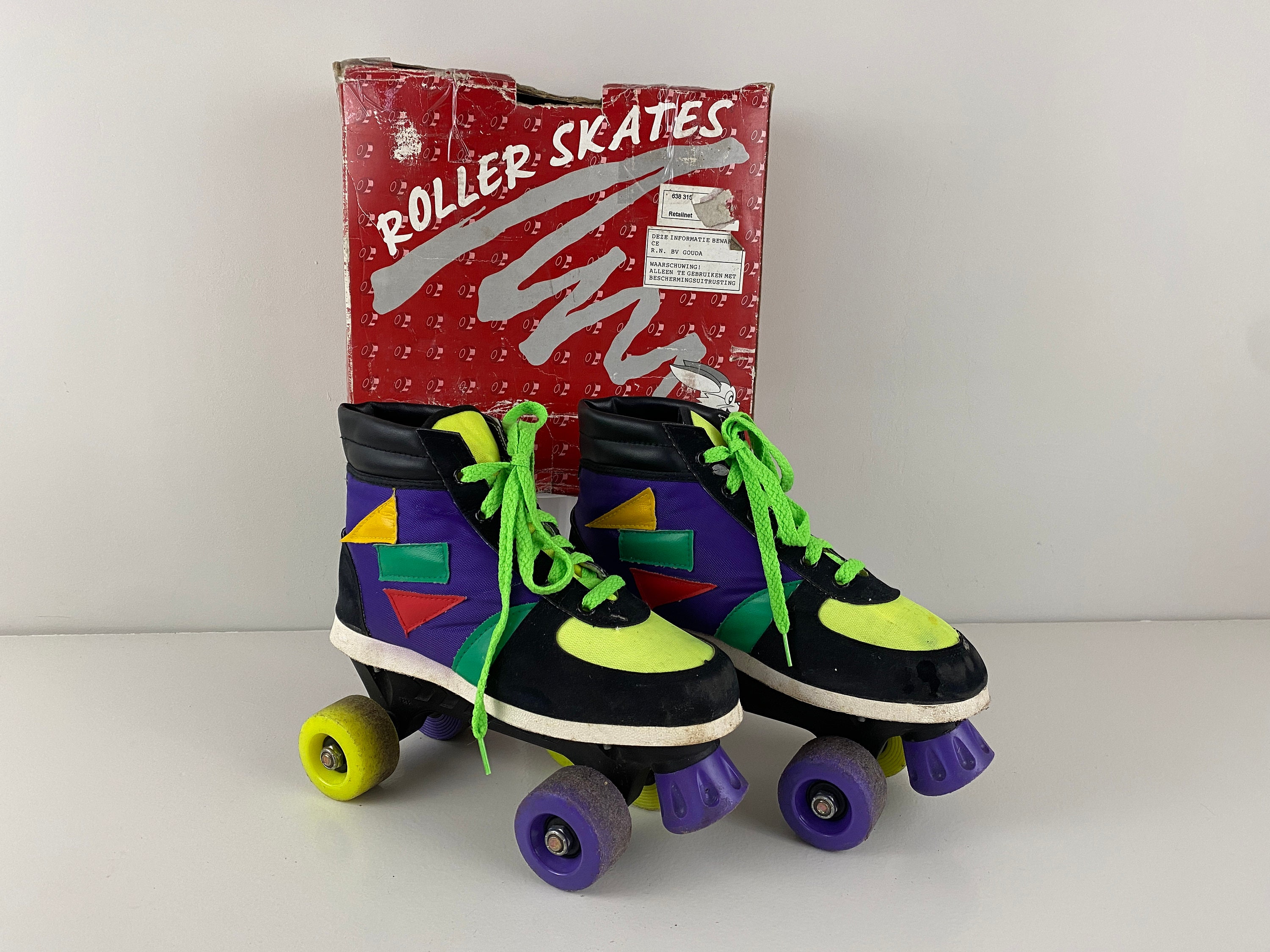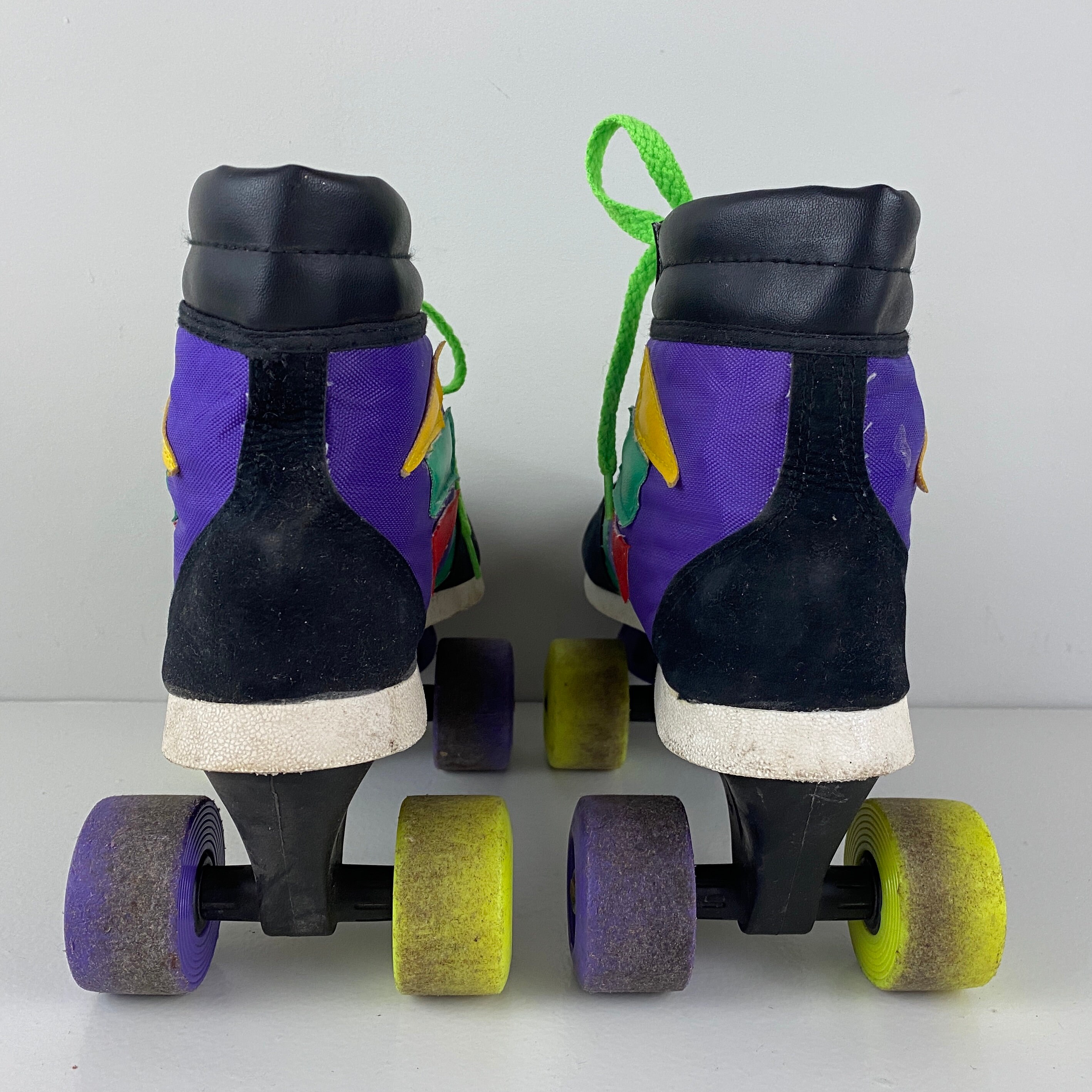 Vintage retro ‘90s disco roller skates. Black faux leather and suede with yellow, green and red faux leather decorations. White sole, green laces and yellow & purple wheels. Size: Size: EU 35 USwoman 4.0, US UK 2.5. The toe to heel length outside is app. 24 cm (9.45"). The inner sole measures app. 23 cm (9.06"). In original box.