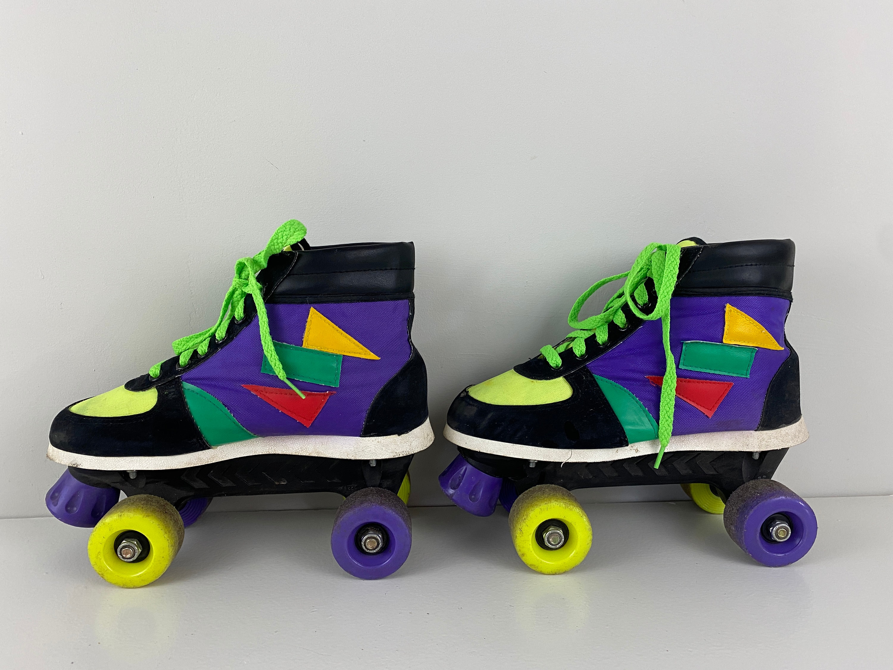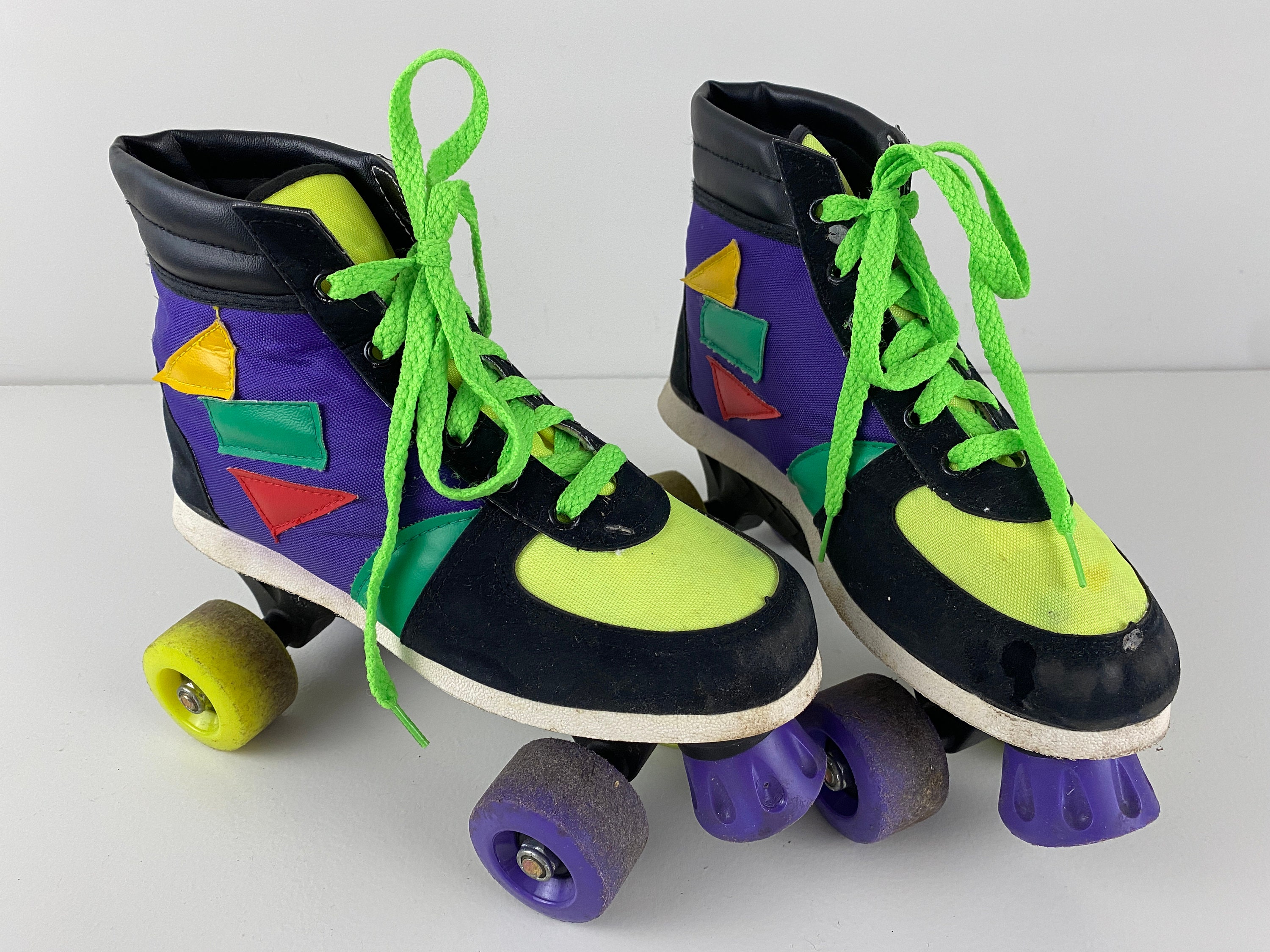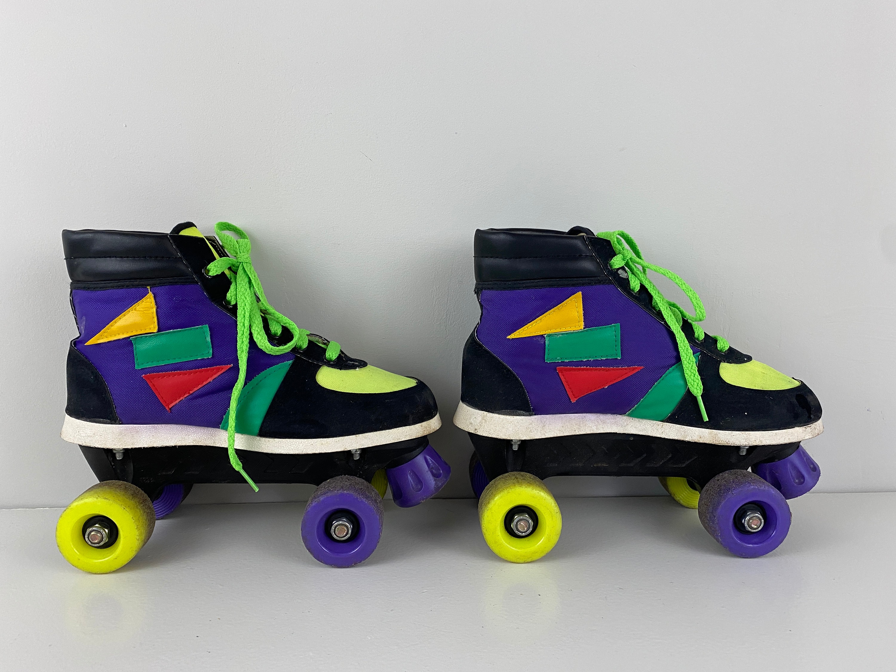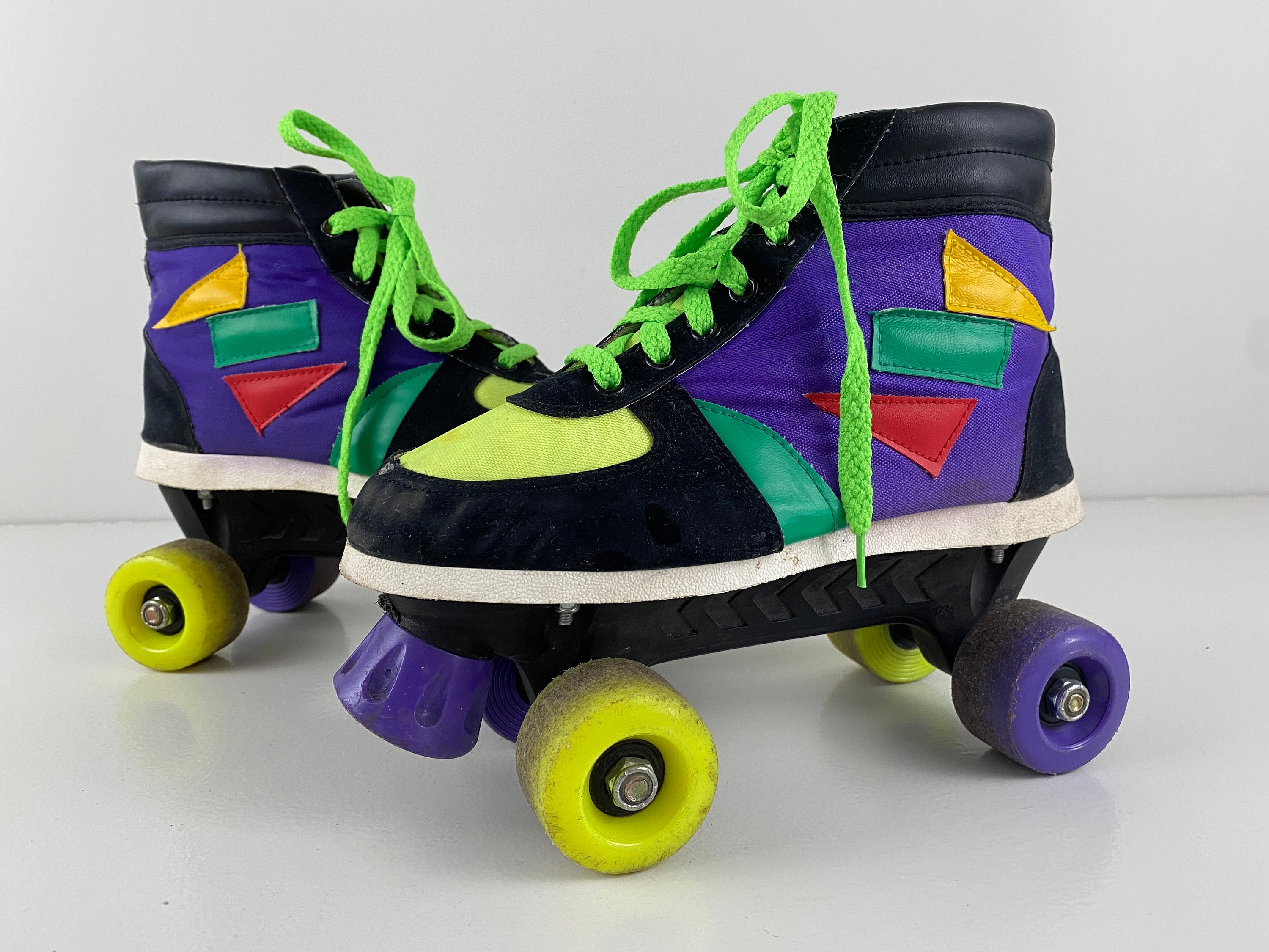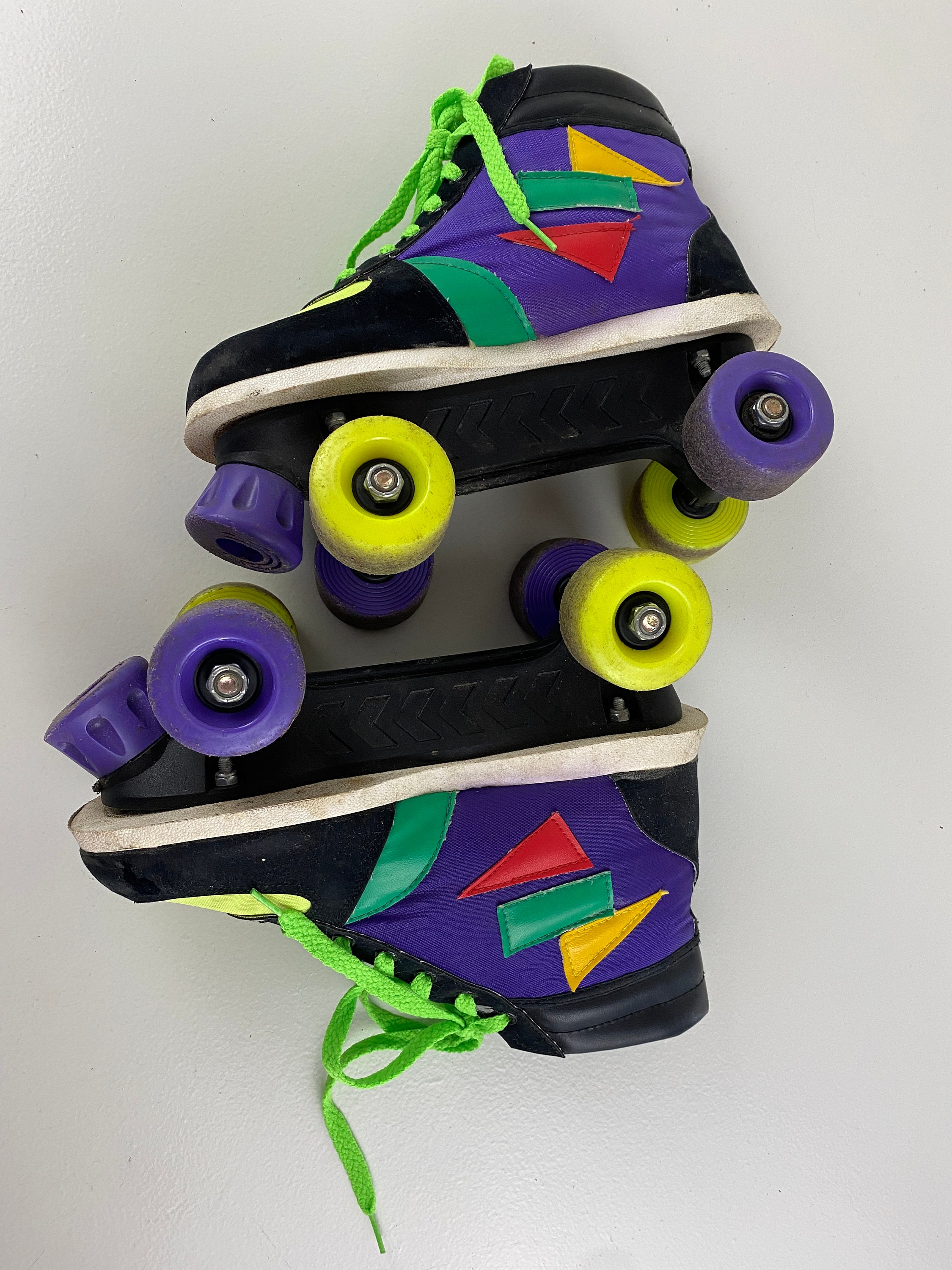 Vintage retro ‘90s disco roller skates. Black faux leather and suede with yellow, green and red faux leather decorations. White sole, green laces and yellow & purple wheels. Size: Size: EU 35 USwoman 4.0, US UK 2.5. The toe to heel length outside is app. 24 cm (9.45"). The inner sole measures app. 23 cm (9.06"). In original box.