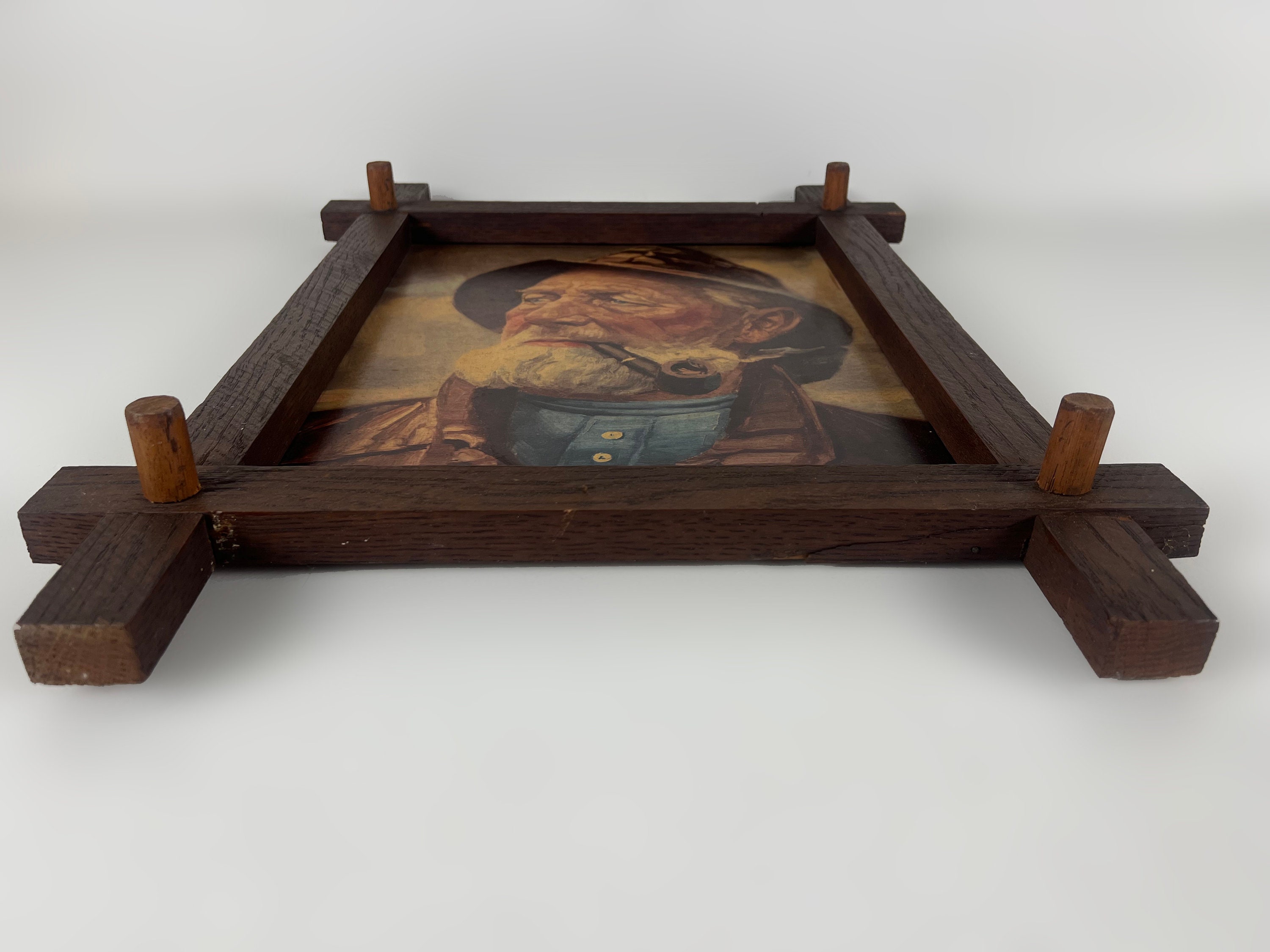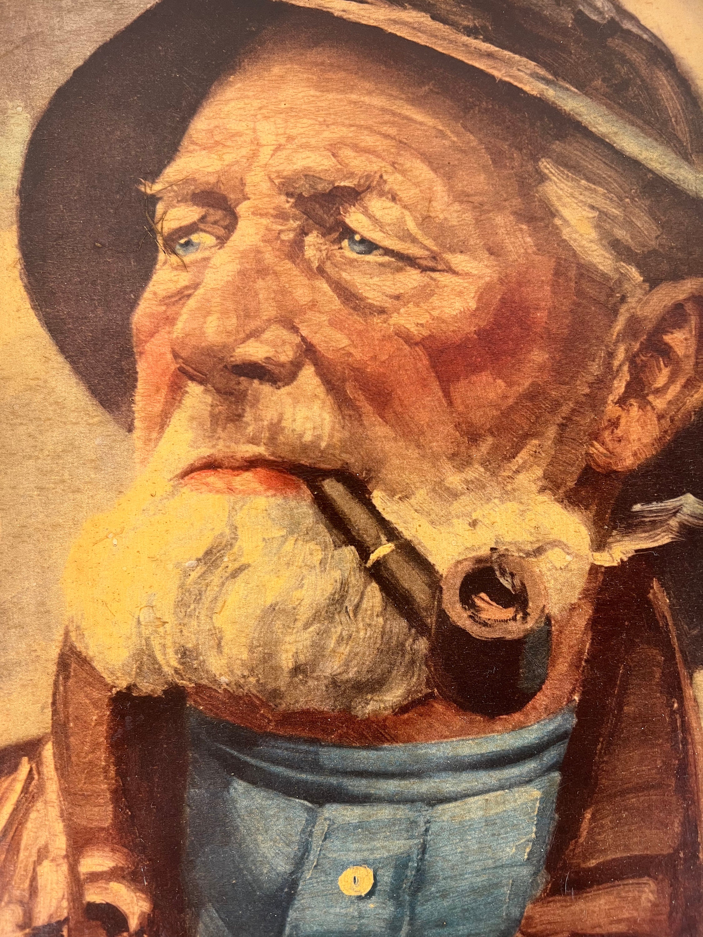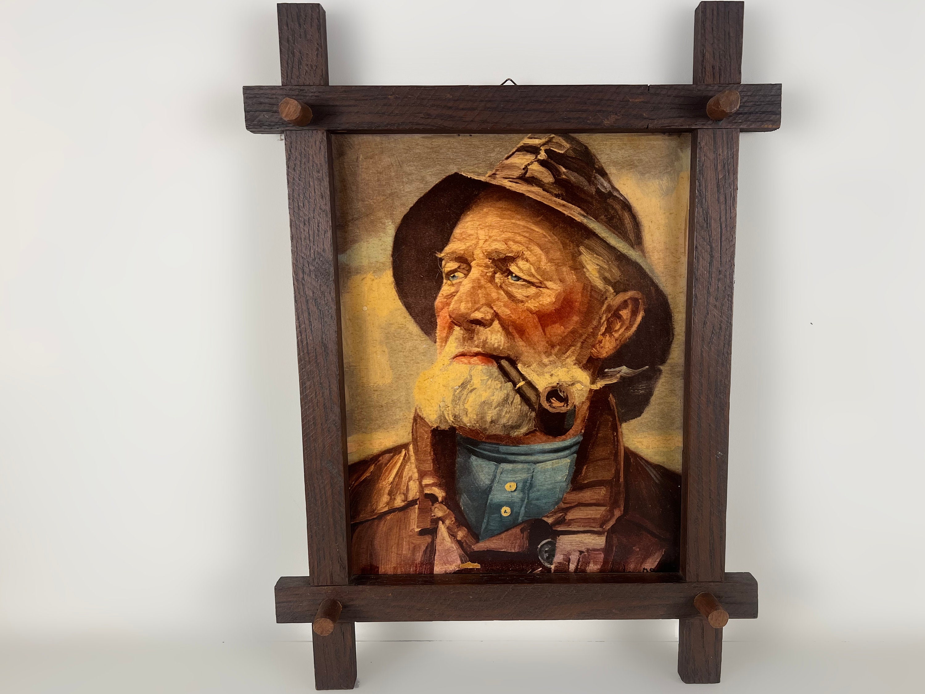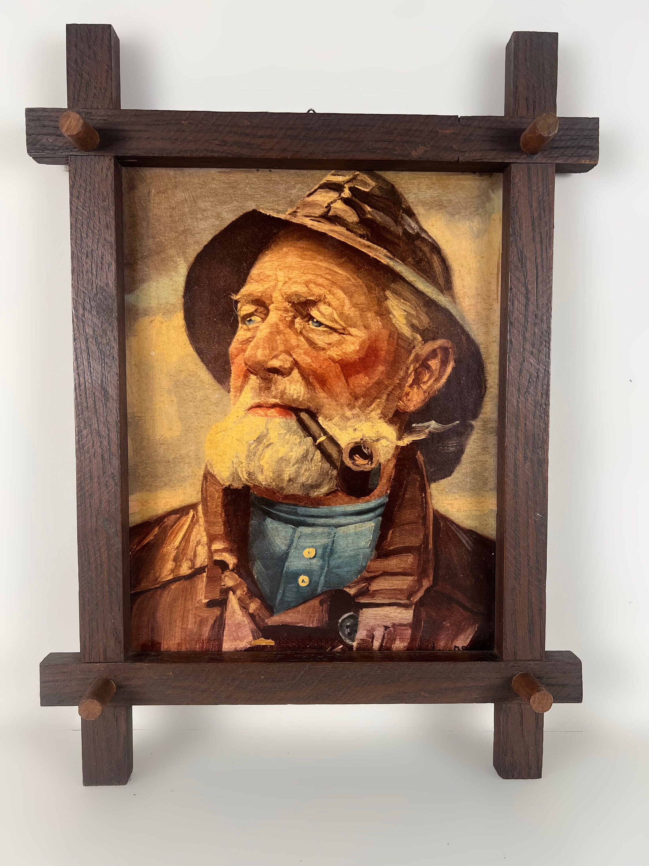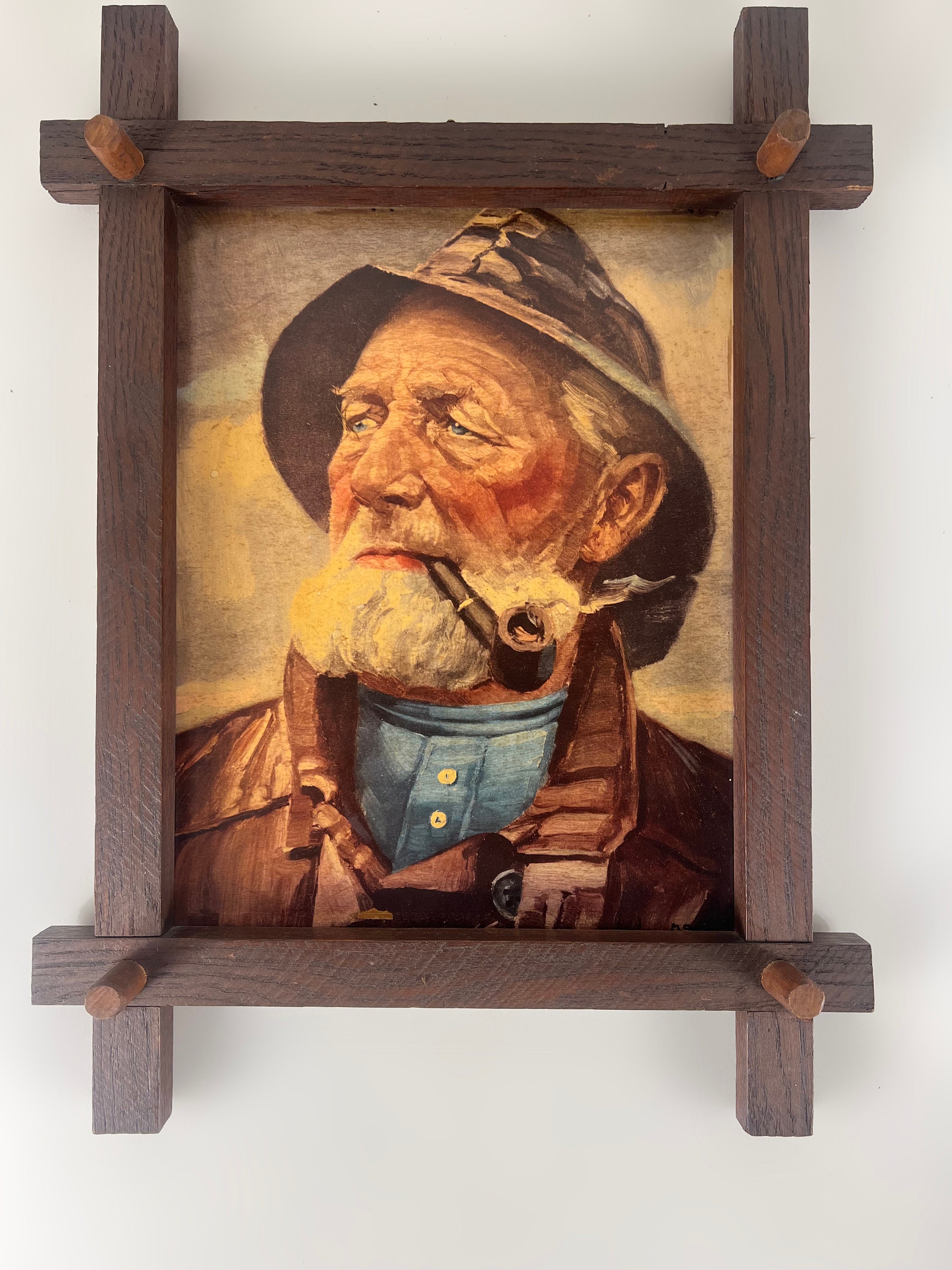 Very nice vintage wood framed portrait art print of pipe-smoking fisherman, old sailor, mid century wall art 1970's. Original by Harry Haerendel. The paper art print is glued on hard board and it has a typical 70s wooden frame.