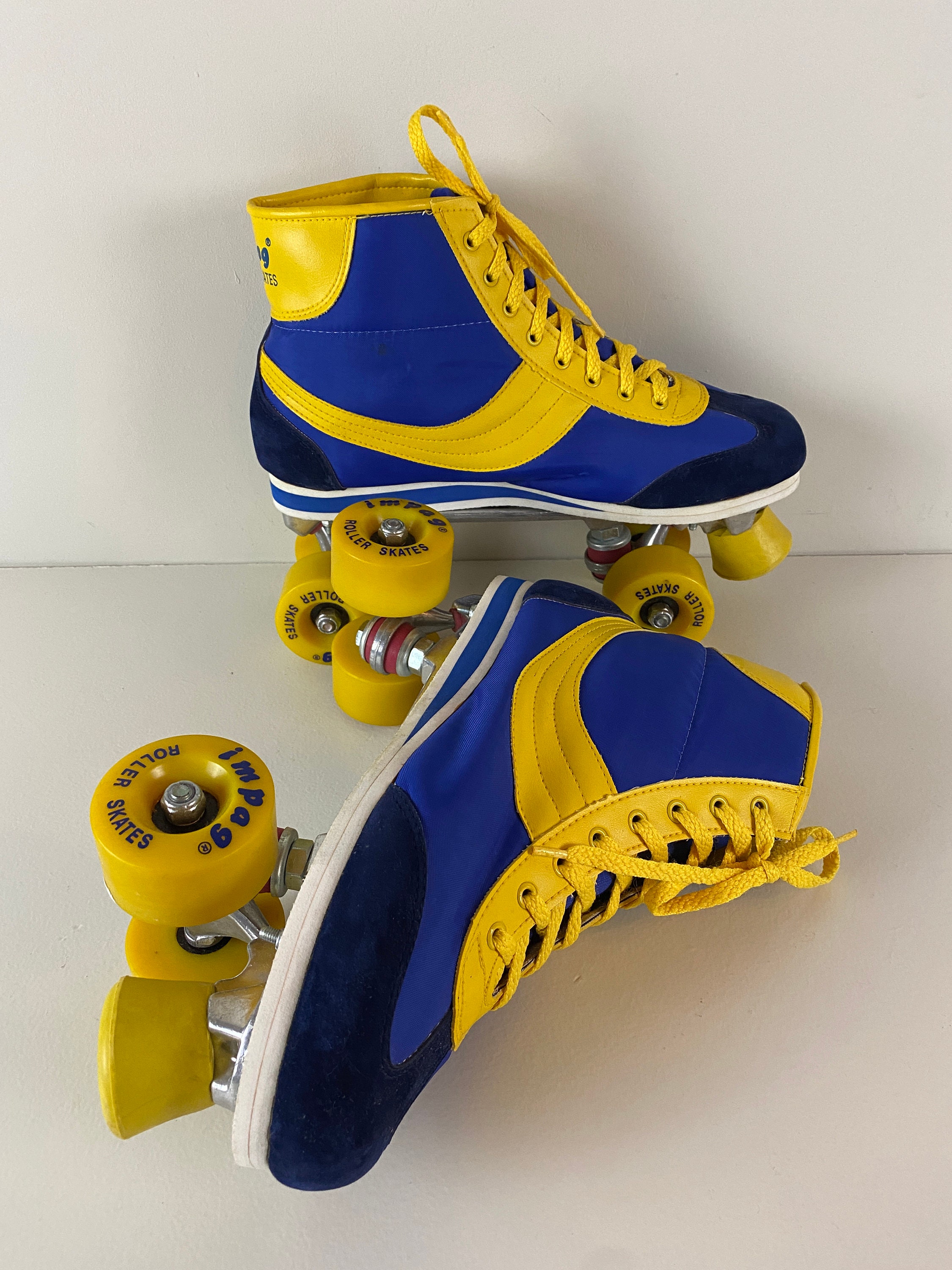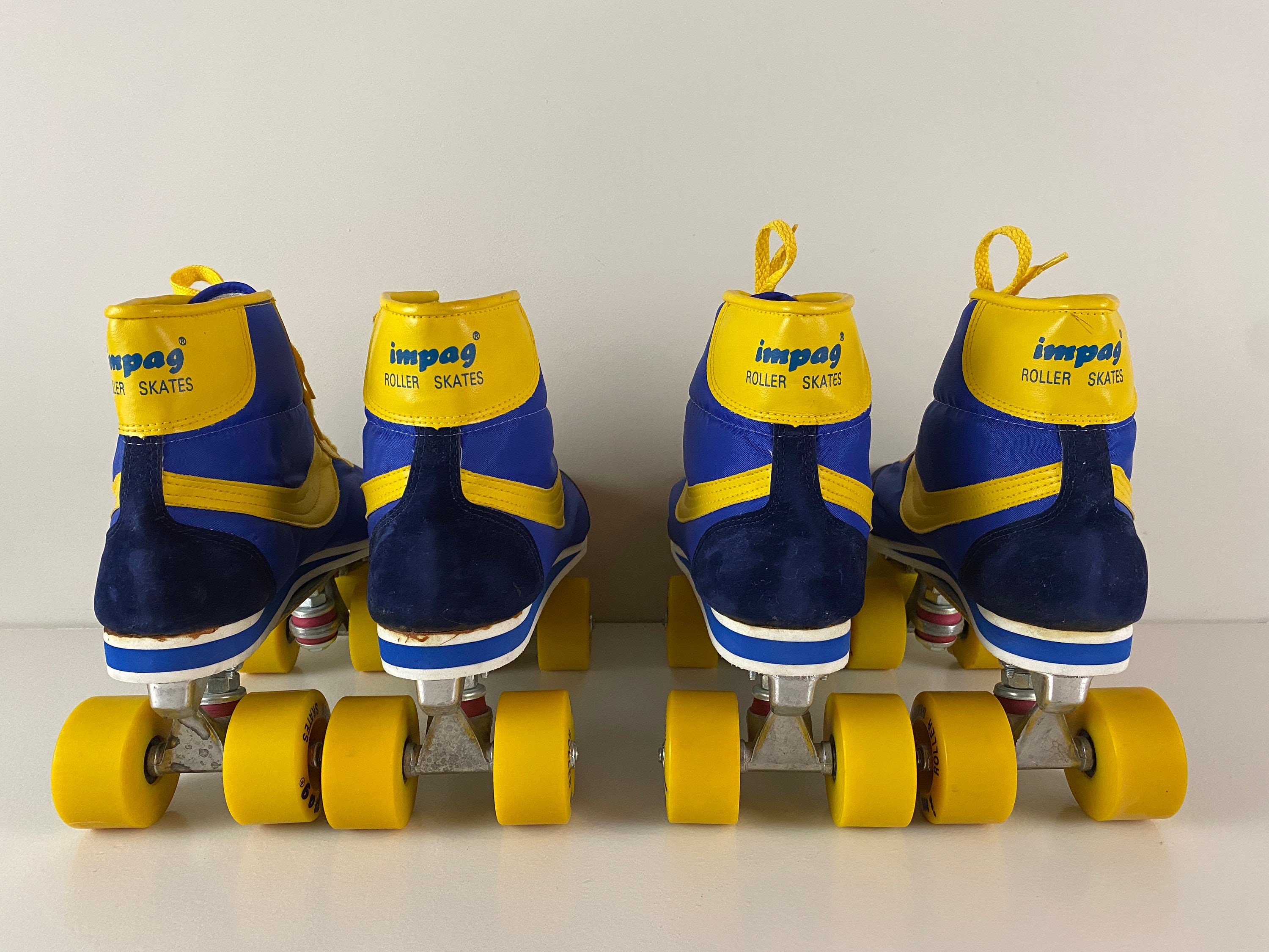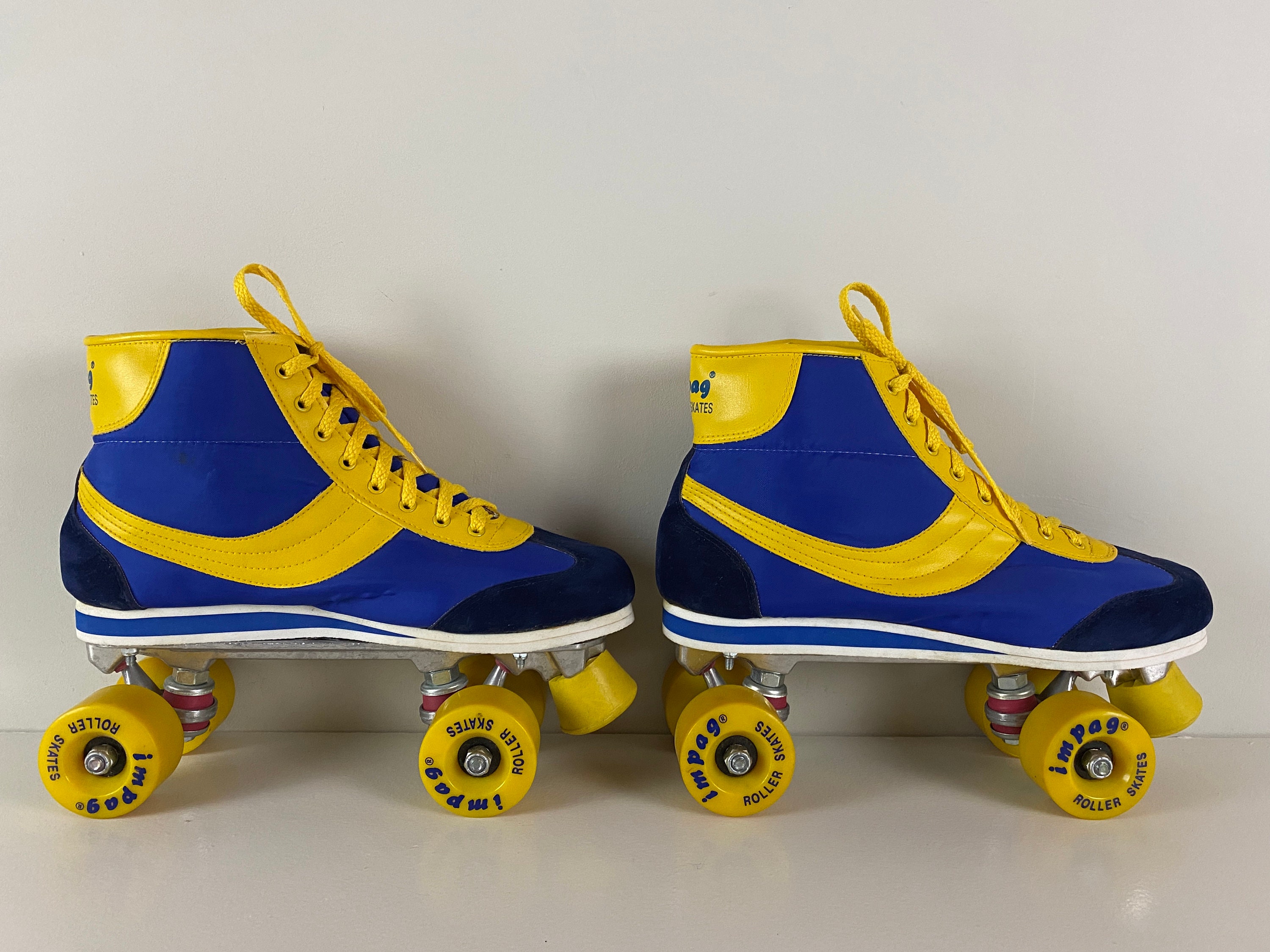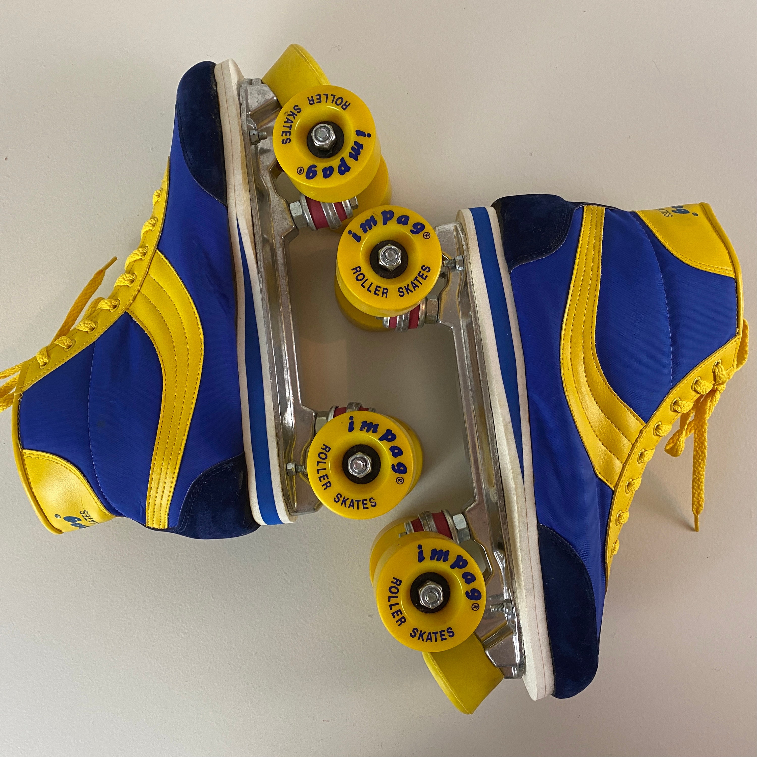 Vintage 70s Retro Roller skates in blue and yellow, IMPAG disco roller skates, EU 45 USwoman 12.5, USman 10.5, UK 10 / 10.5