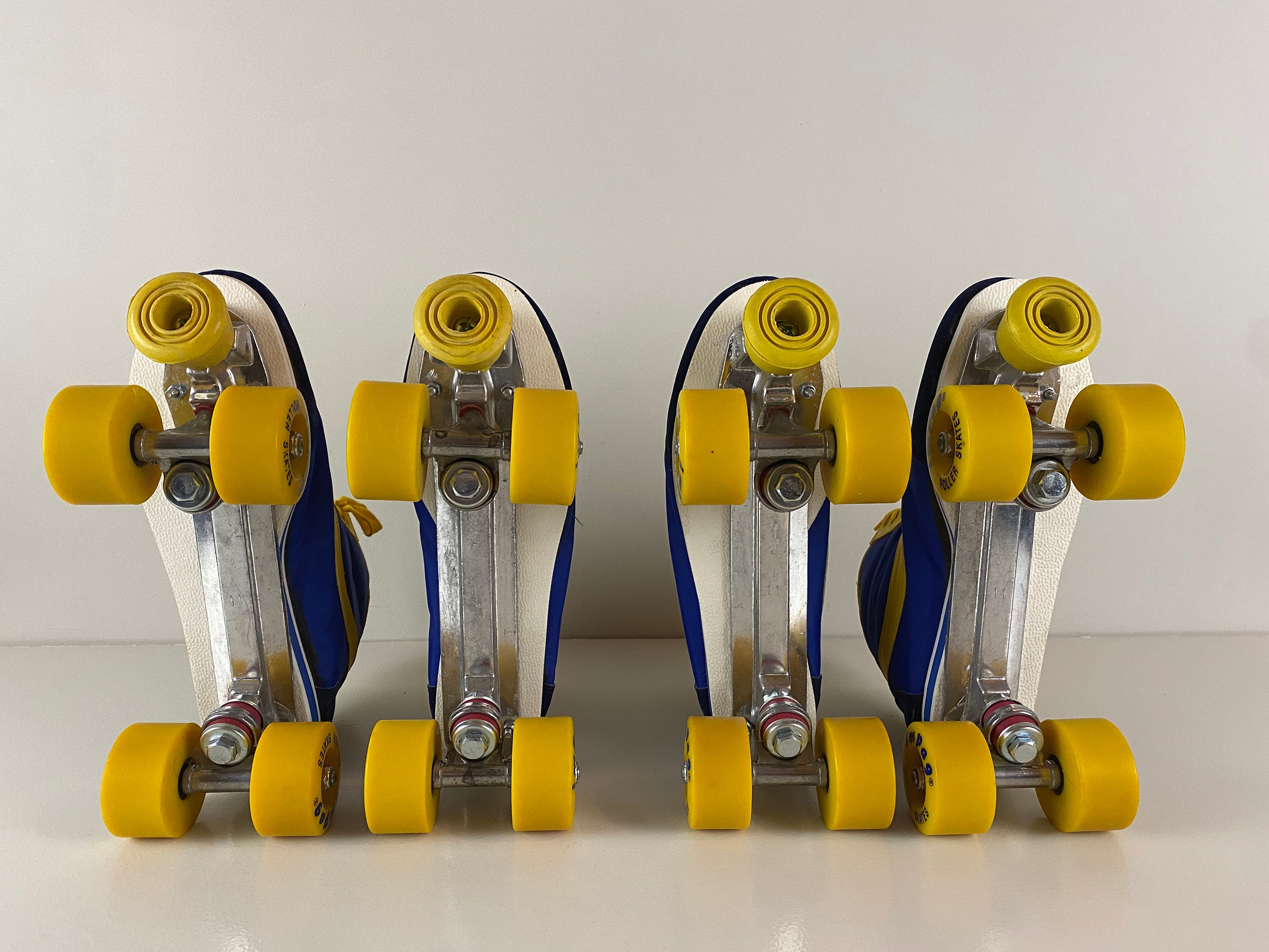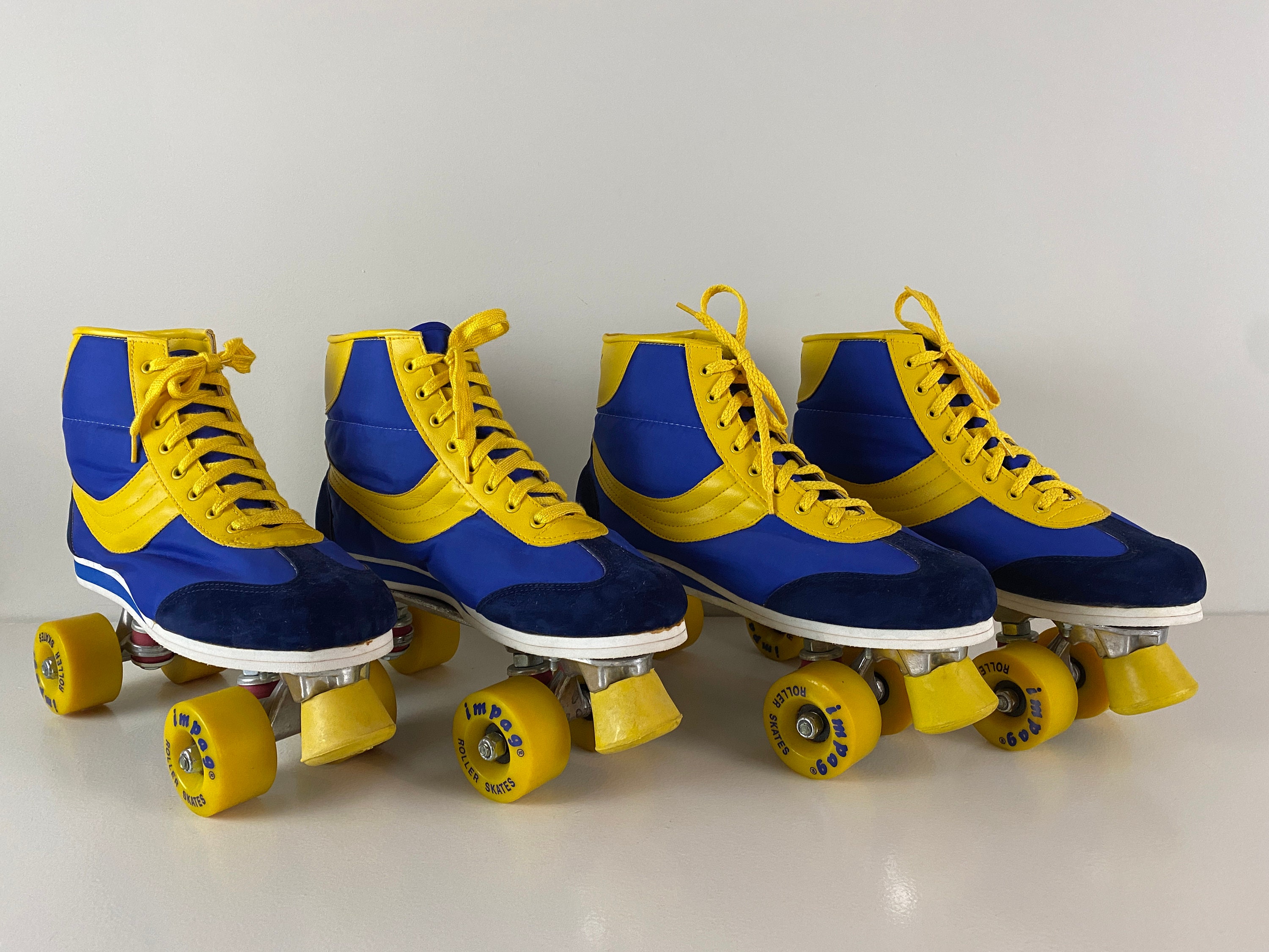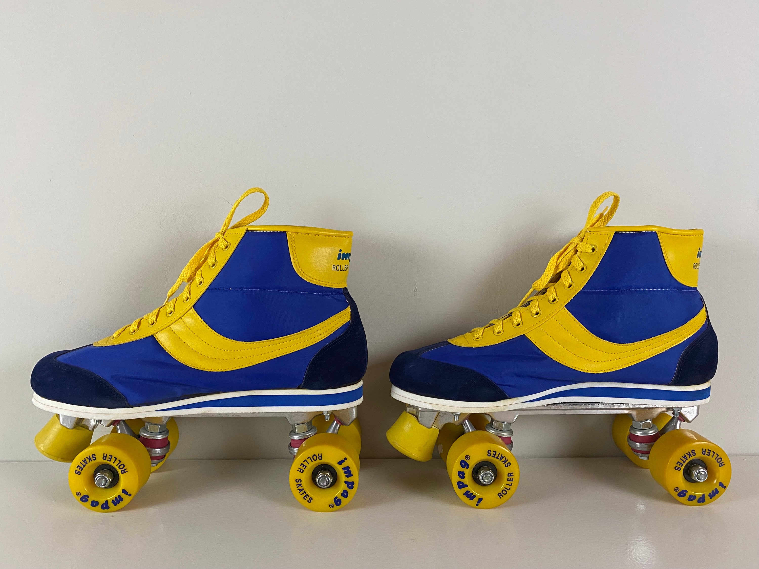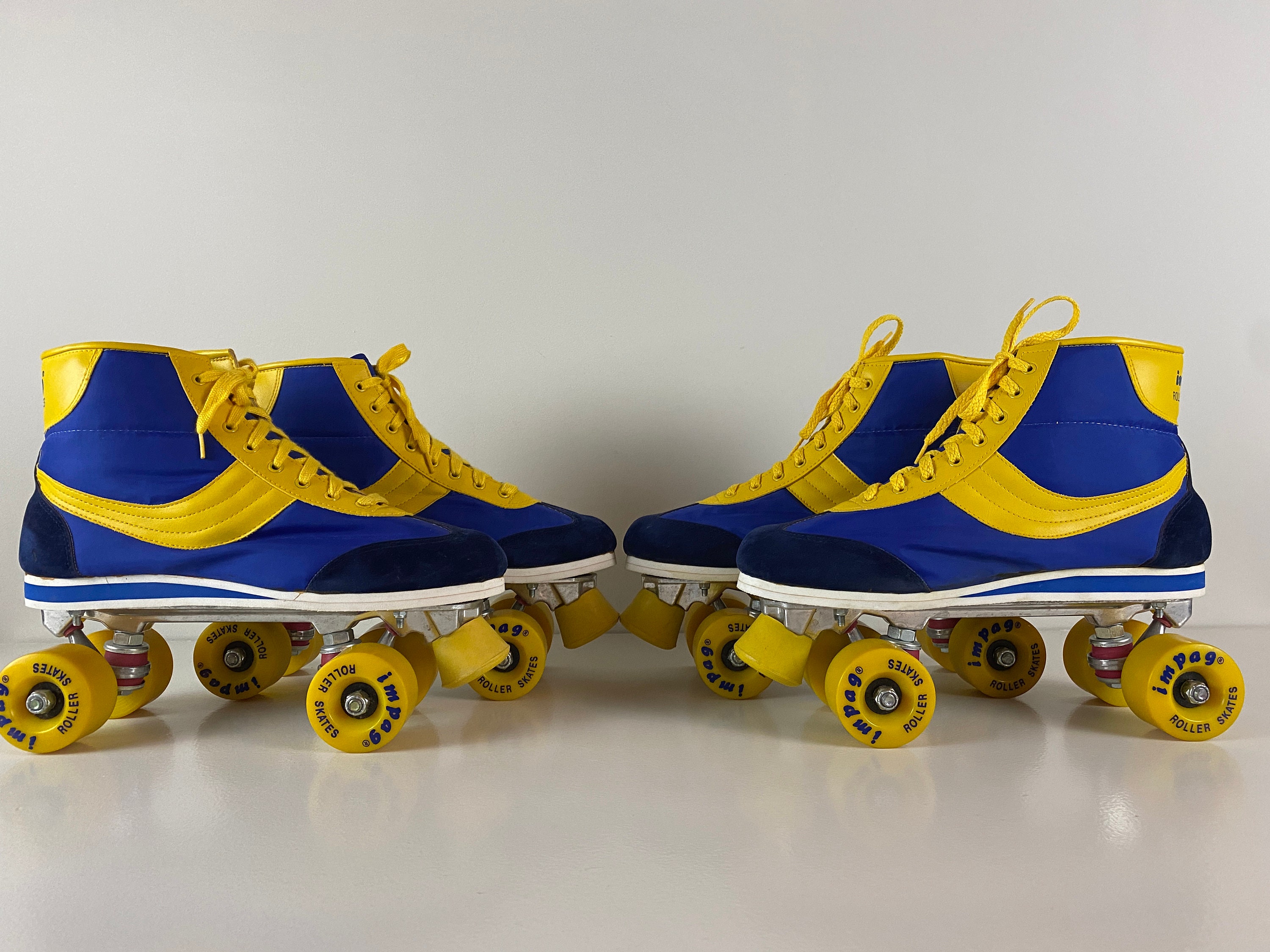Vintage 70s Retro Roller skates in blue and yellow, IMPAG disco roller skates, EU 45 USwoman 12.5, USman 10.5, UK 10 / 10.5