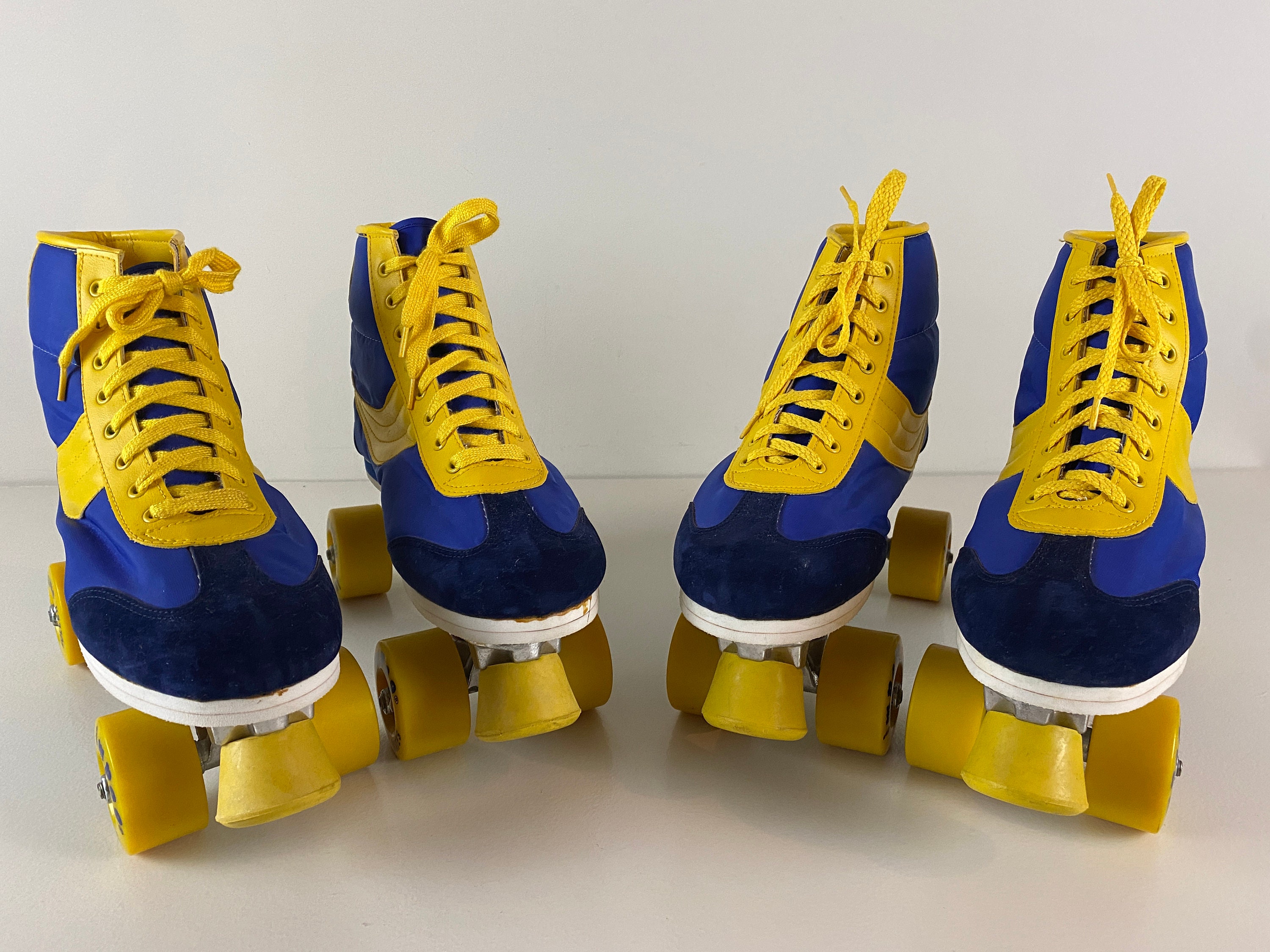 Vintage ‘70s disco roller skates, yellow faux leather, blue faux suede en yellow laces, stoppers and wheels. Mark: Impag. Size: EU 45 USwoman 12.5, USman 10.5, UK 10 / 10.5. The toe to heel length outside is app. 31 cm (12.20 inches). The inner sole measures app. 28 cm (11.02 inches).