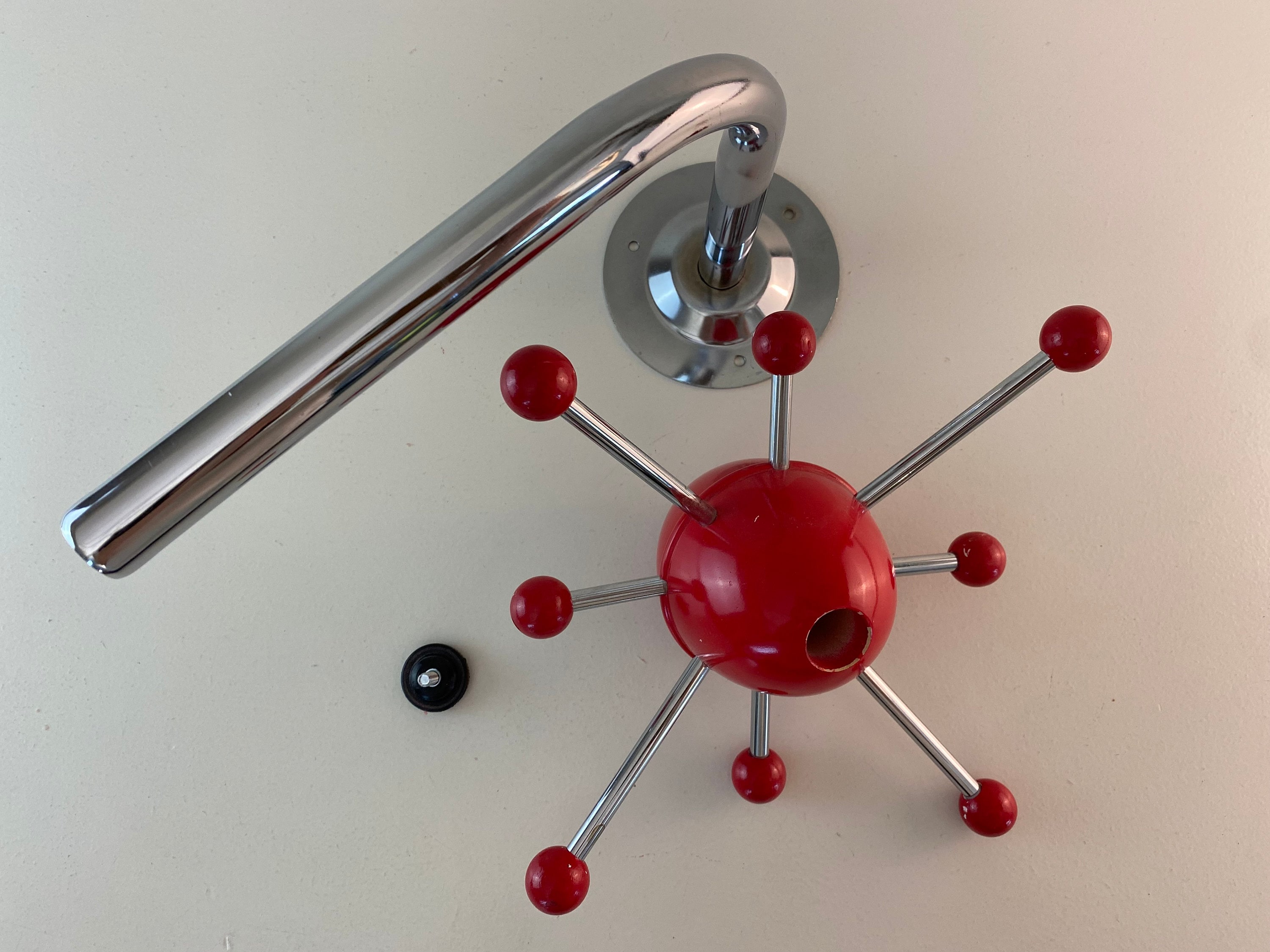 Red sputnik atomic coat rack, coat hanger, Osvaldo Borsani collection 1990s, retro space age design.