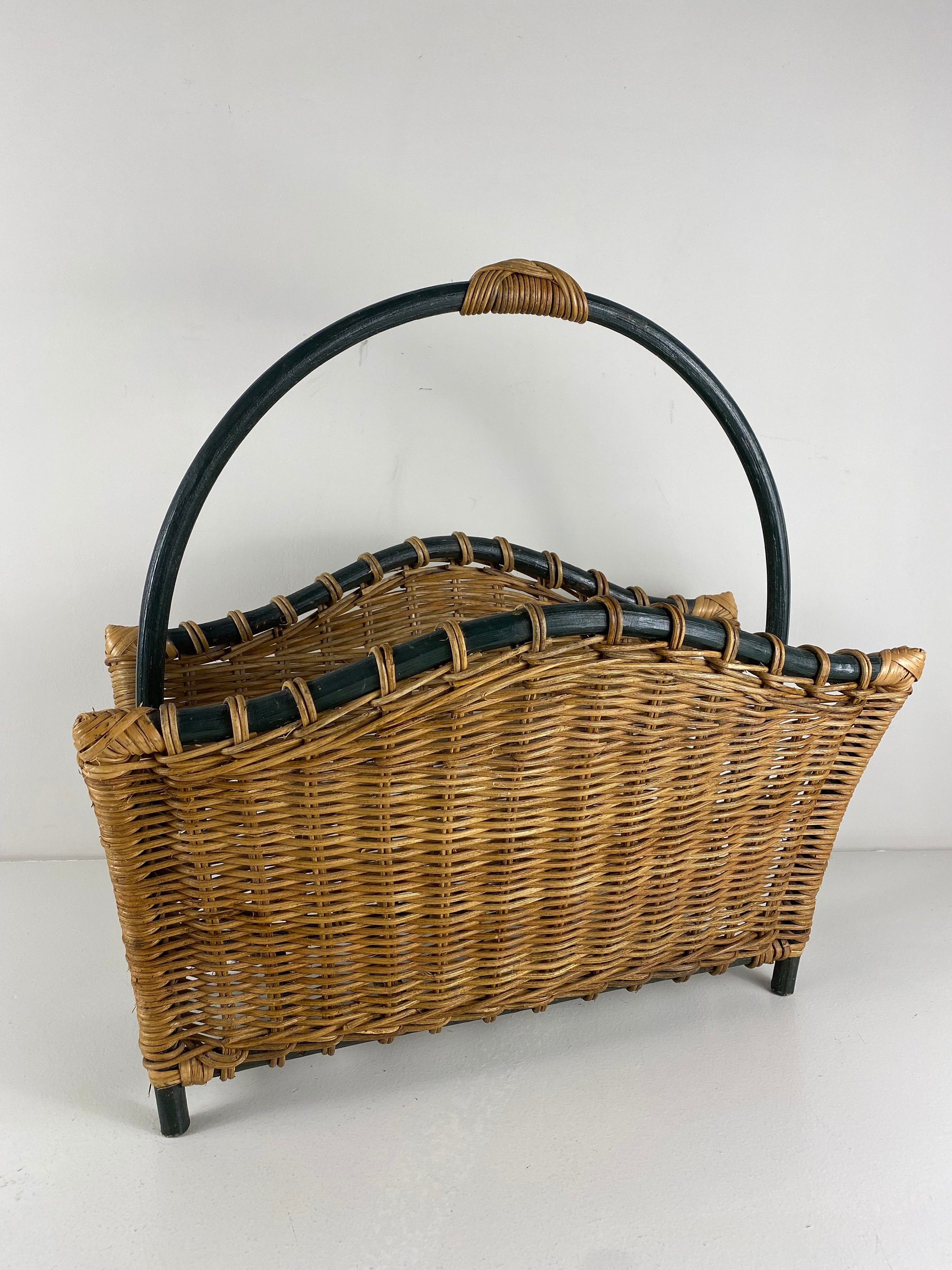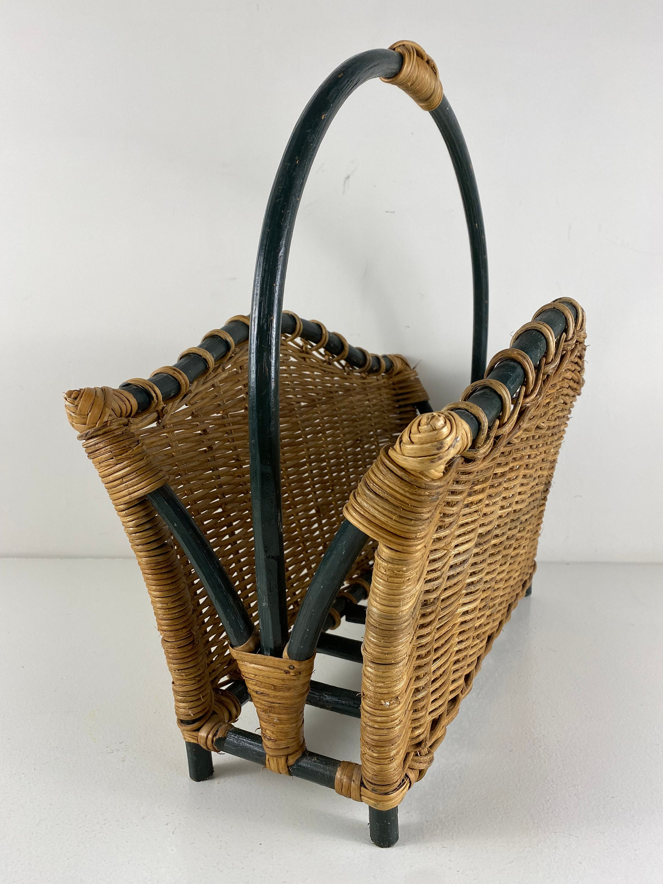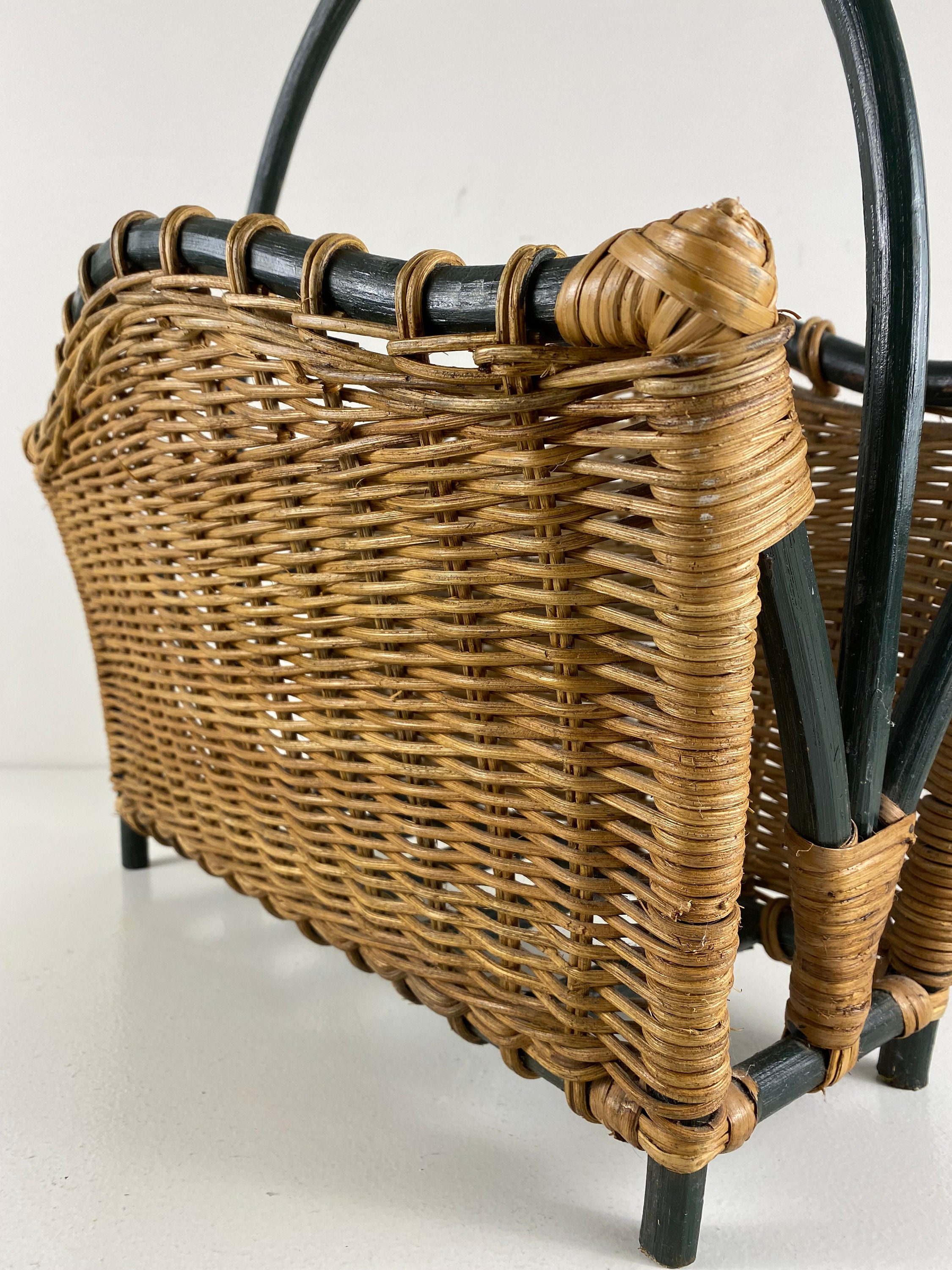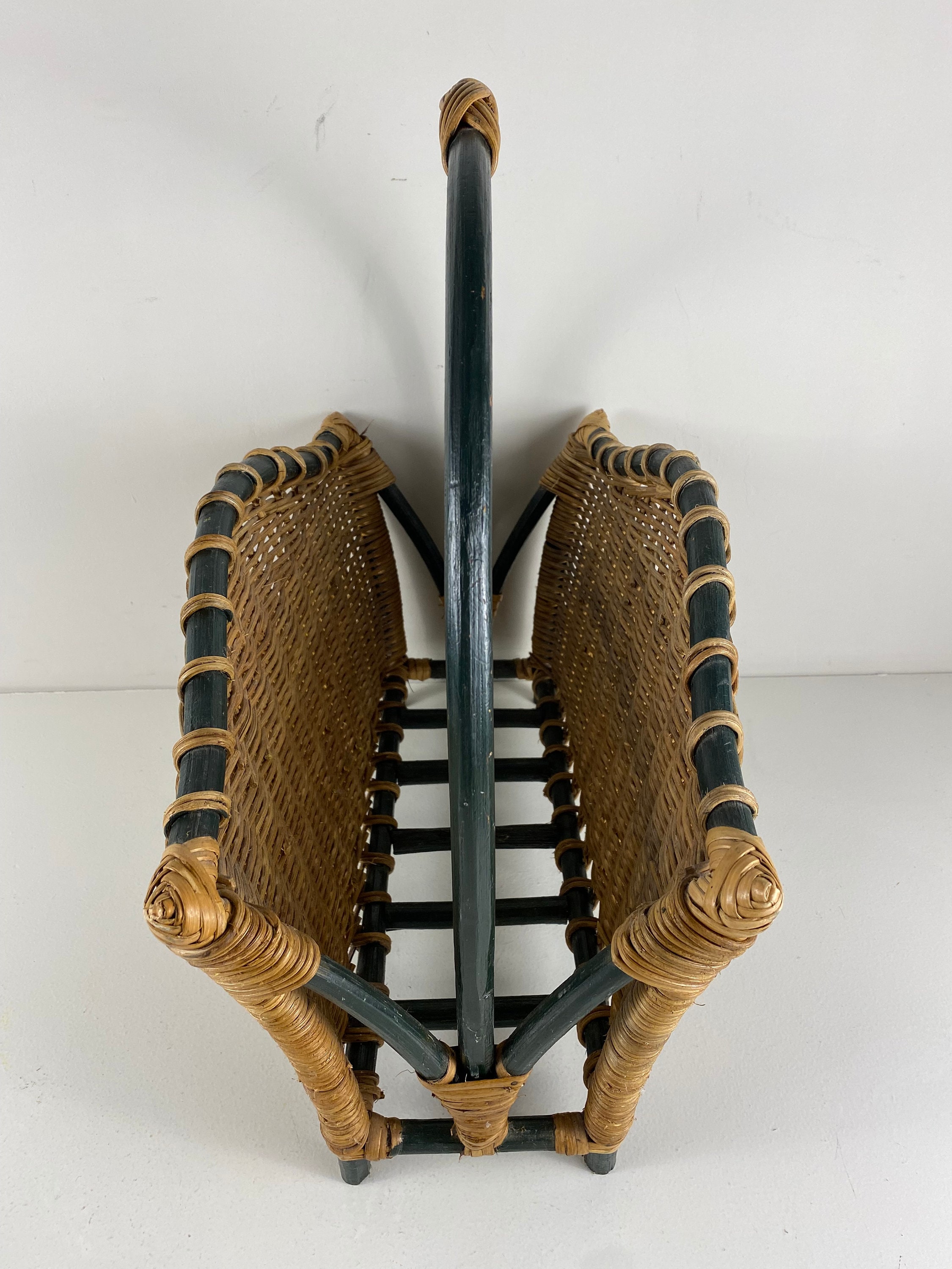 Bamboo and wicker magazine holder, magazine rack. Rattan basket with green handle and feet. It has 1 large section to hold your magazines or newspapers. Lovely vintage from the 1970's mid century modern. This could be a great addition to your eclectic or boho interior.