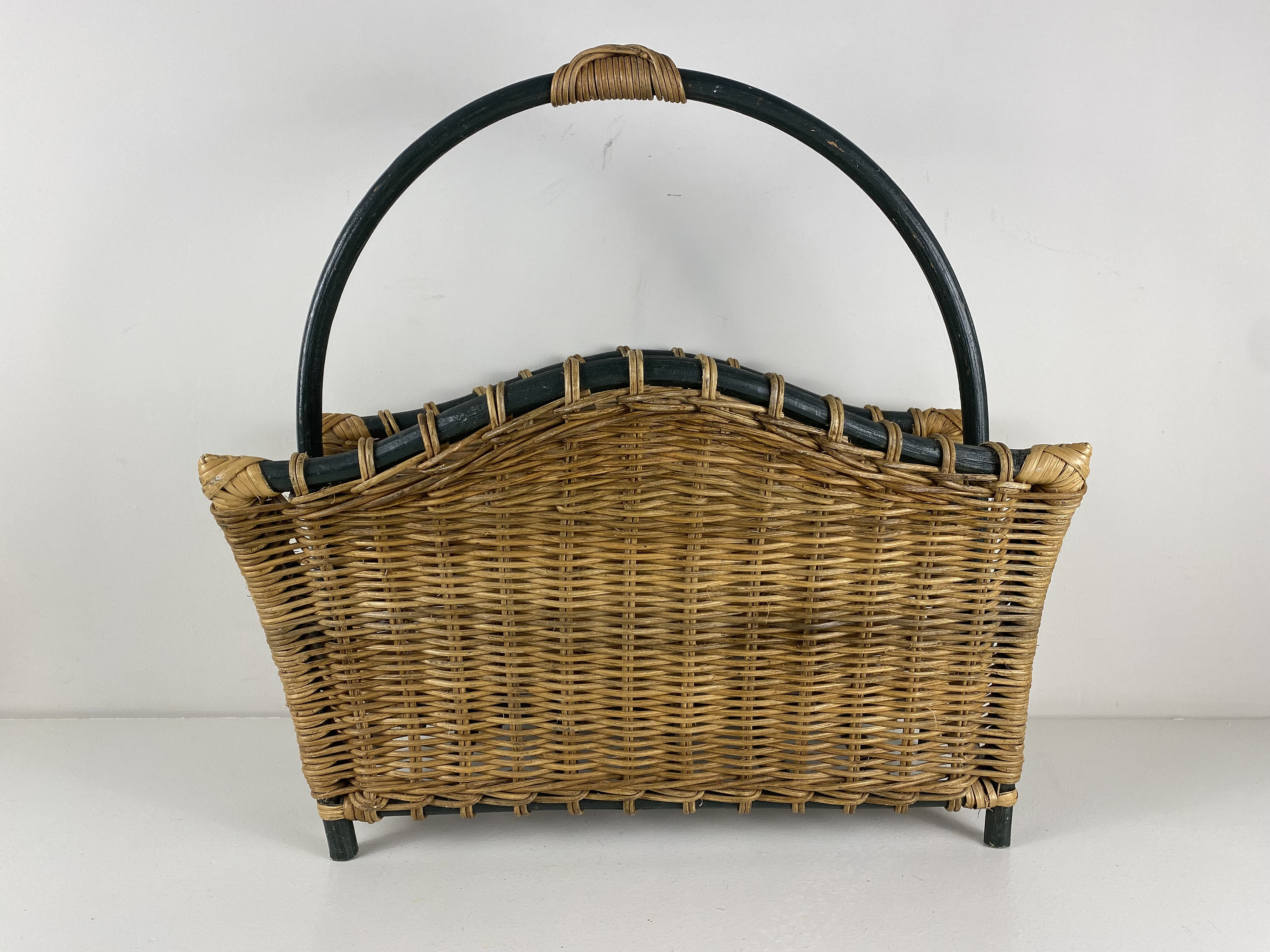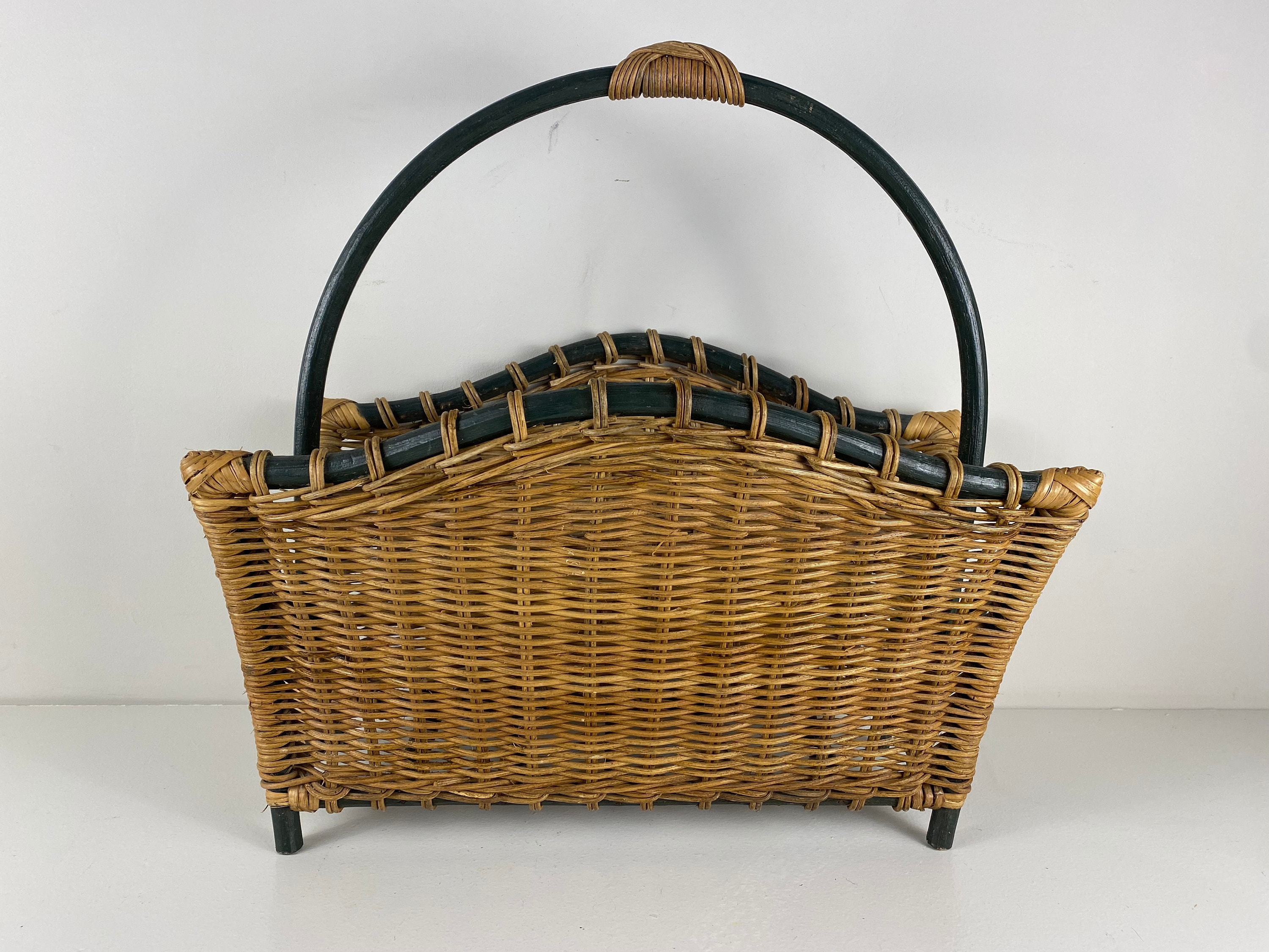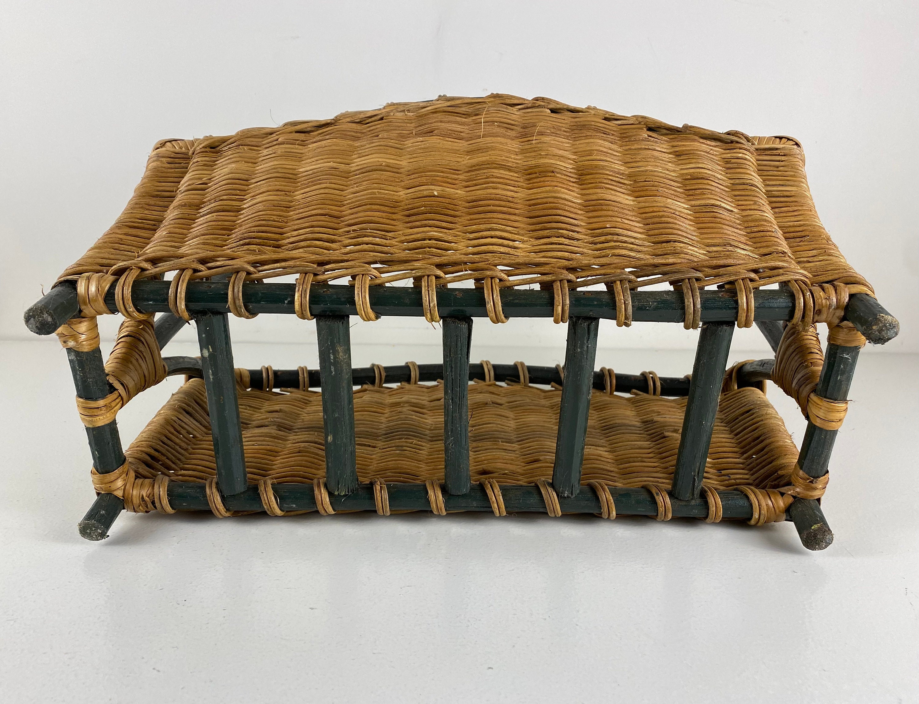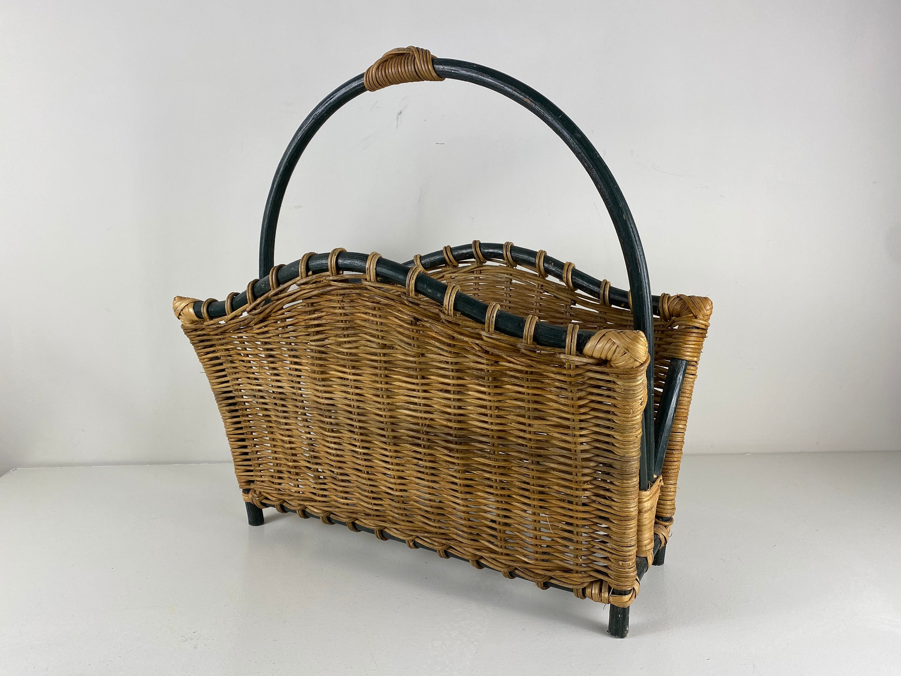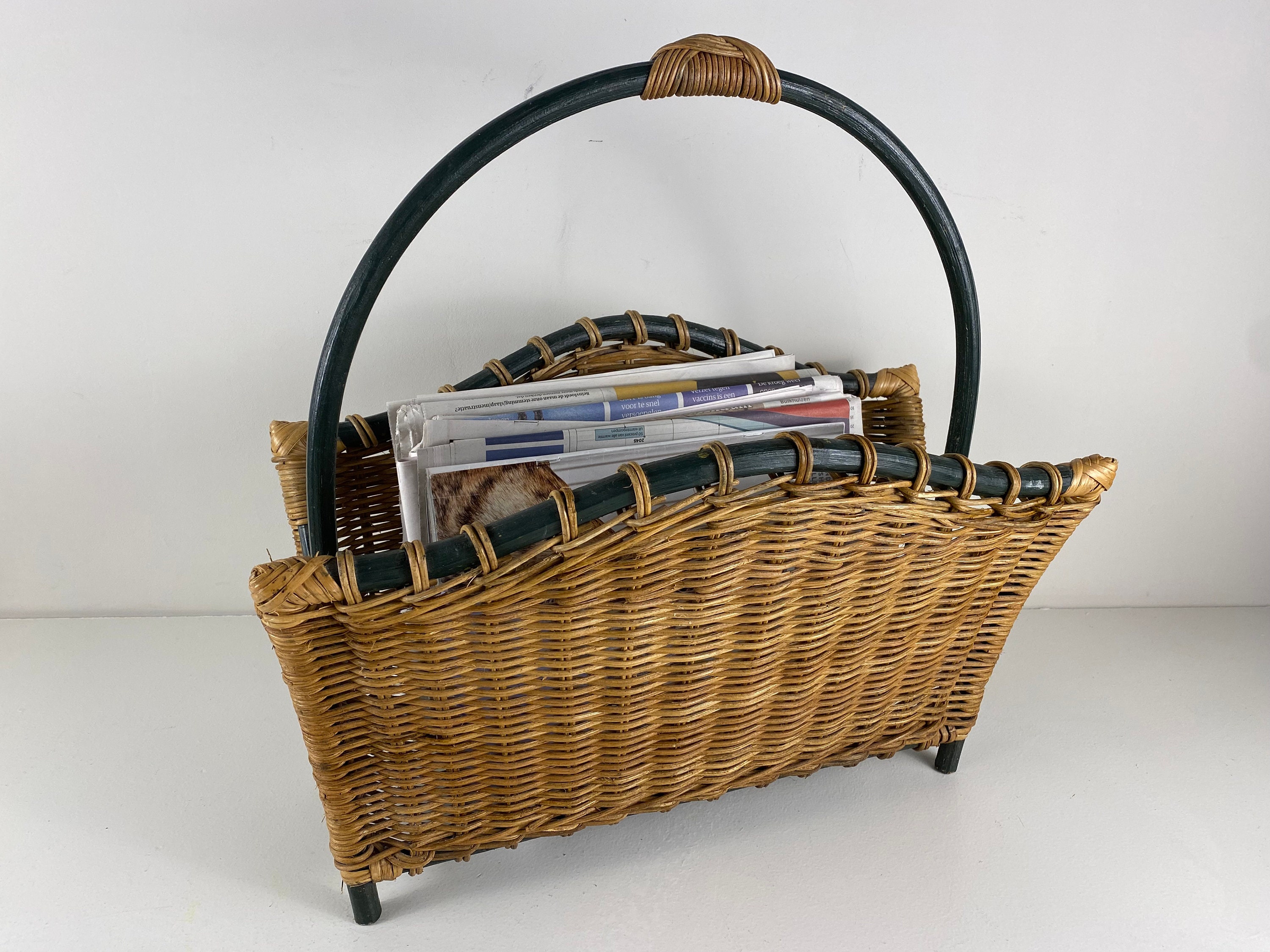 Bamboo and wicker magazine holder, magazine rack. Rattan basket with green handle and feet. It has 1 large section to hold your magazines or newspapers. Lovely vintage from the 1970's mid century modern. This could be a great addition to your eclectic or boho interior.