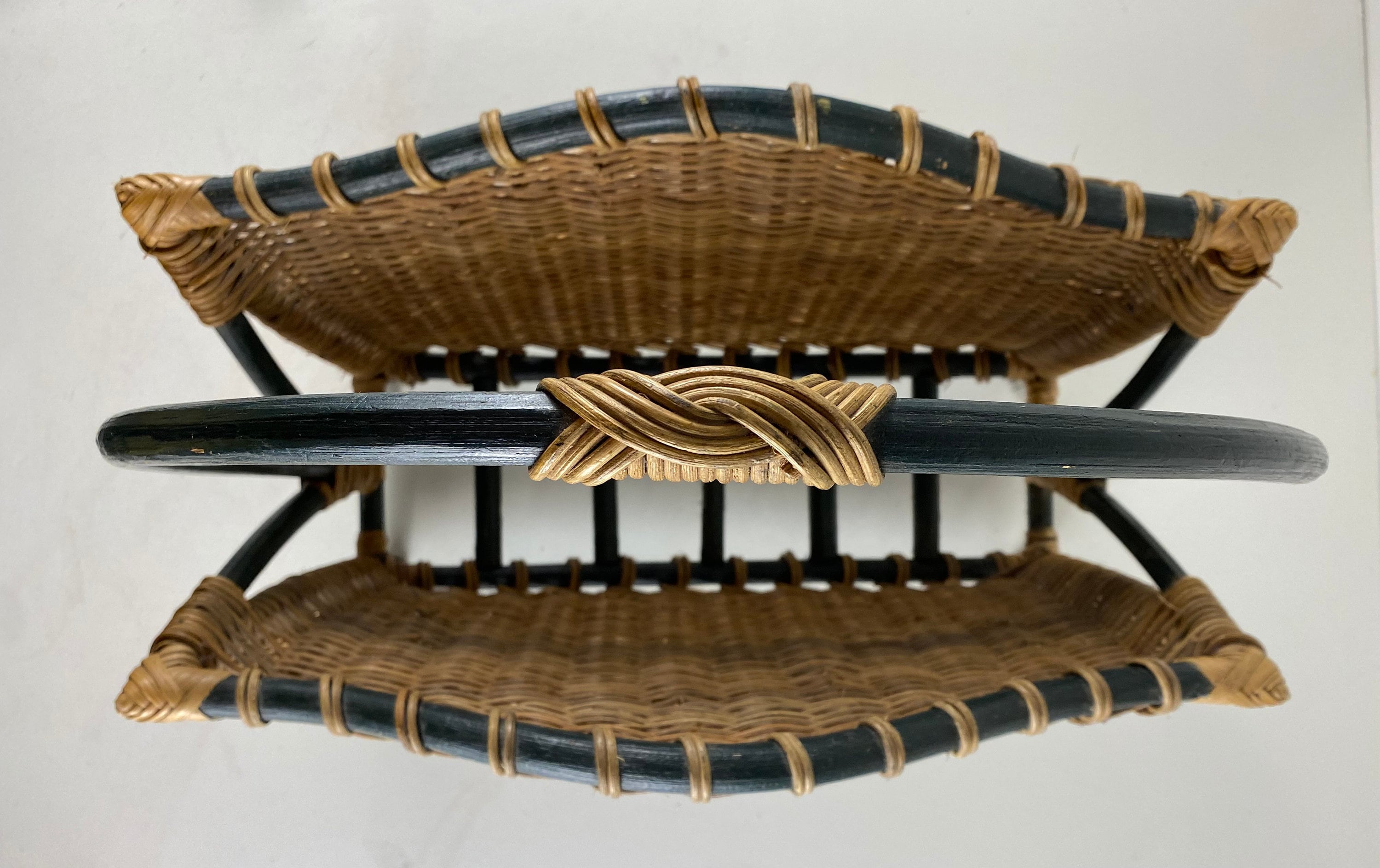 Bamboo and wicker magazine holder, magazine rack, rattan basket with handle, vintage boho from the 1970's, mid century modern
