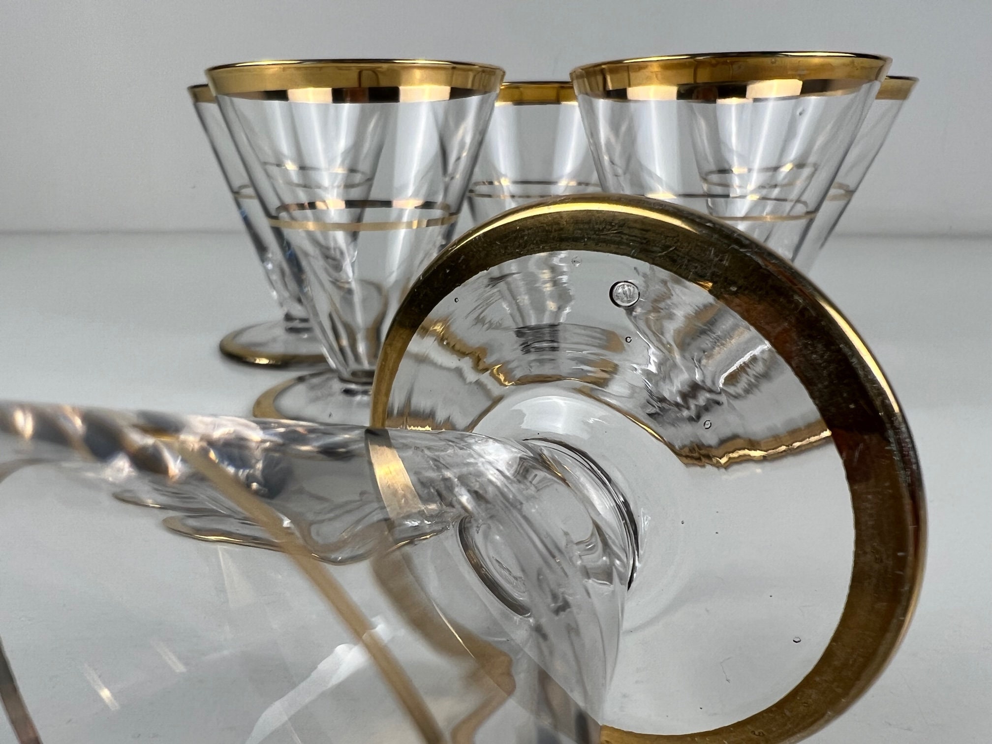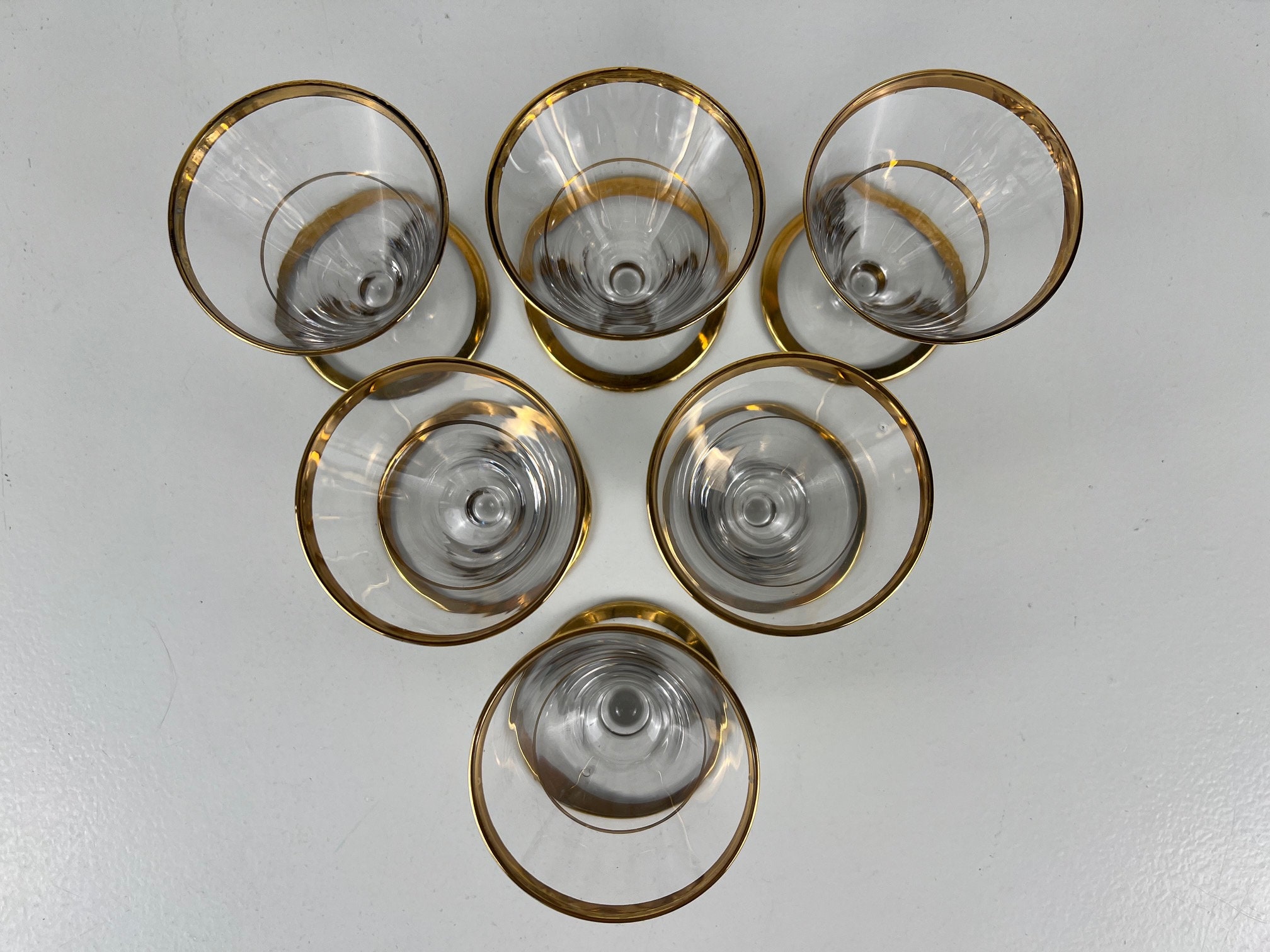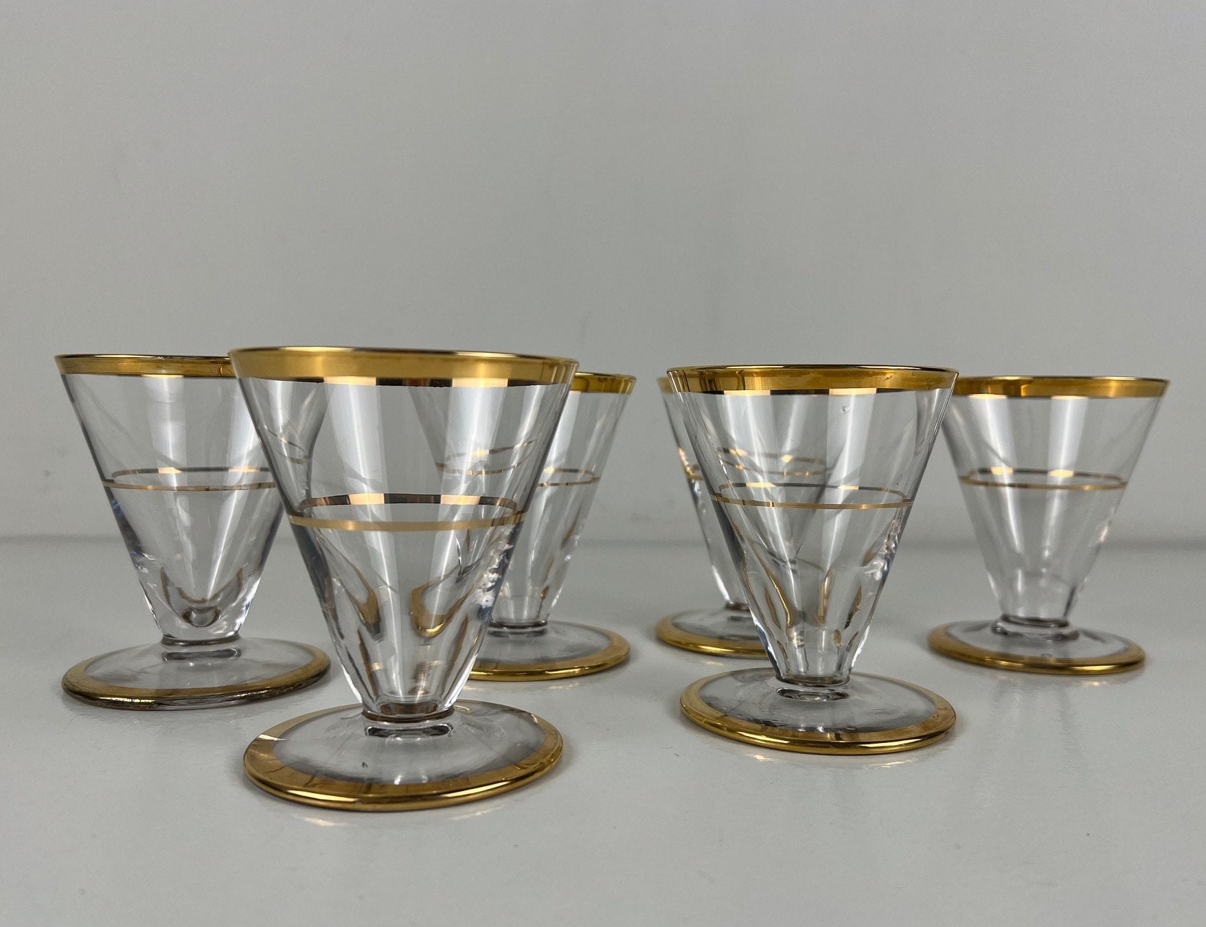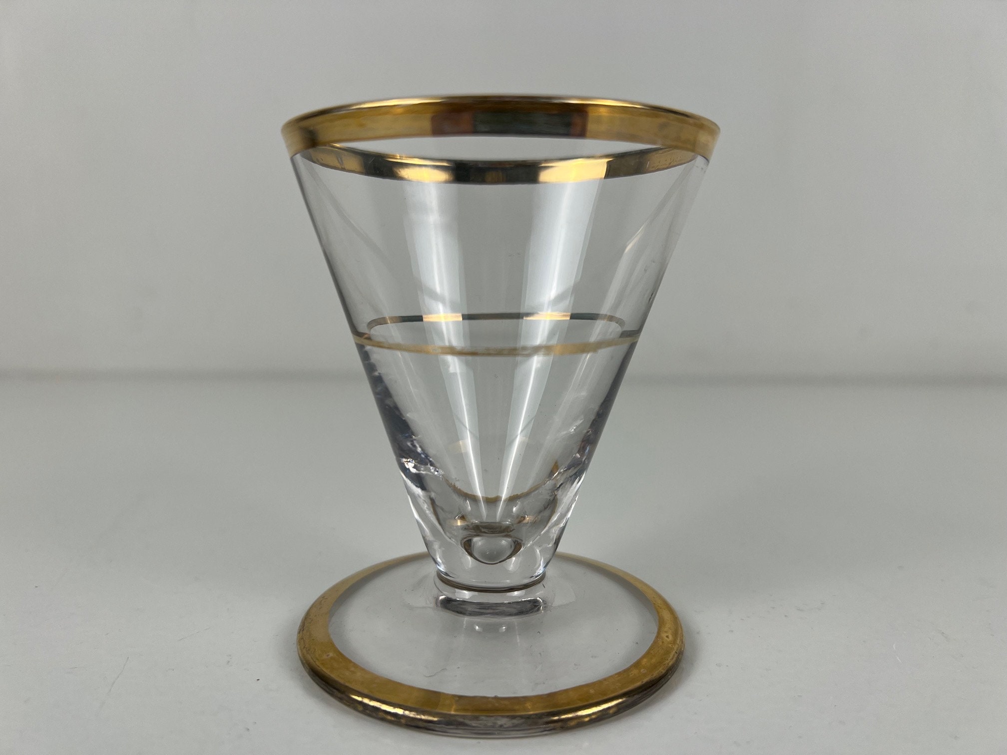 6 rare v-shaped cocktail glasses, cosmopolitan glasses with gold rim, 50s mid century design barware, beautiful handmade vintage glassware decorated with gold rims.