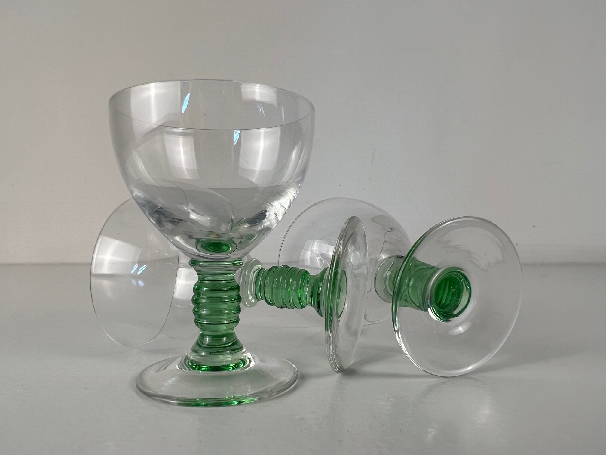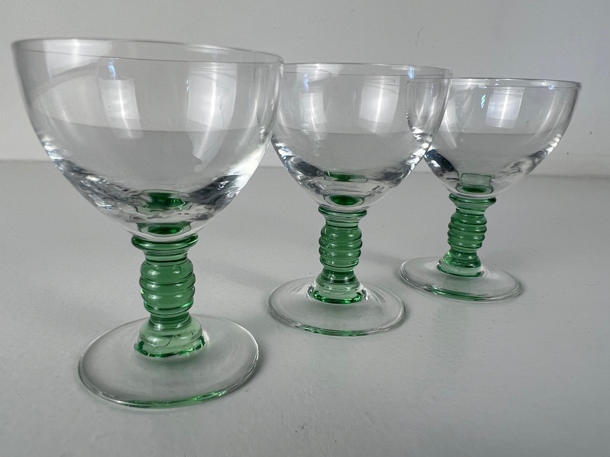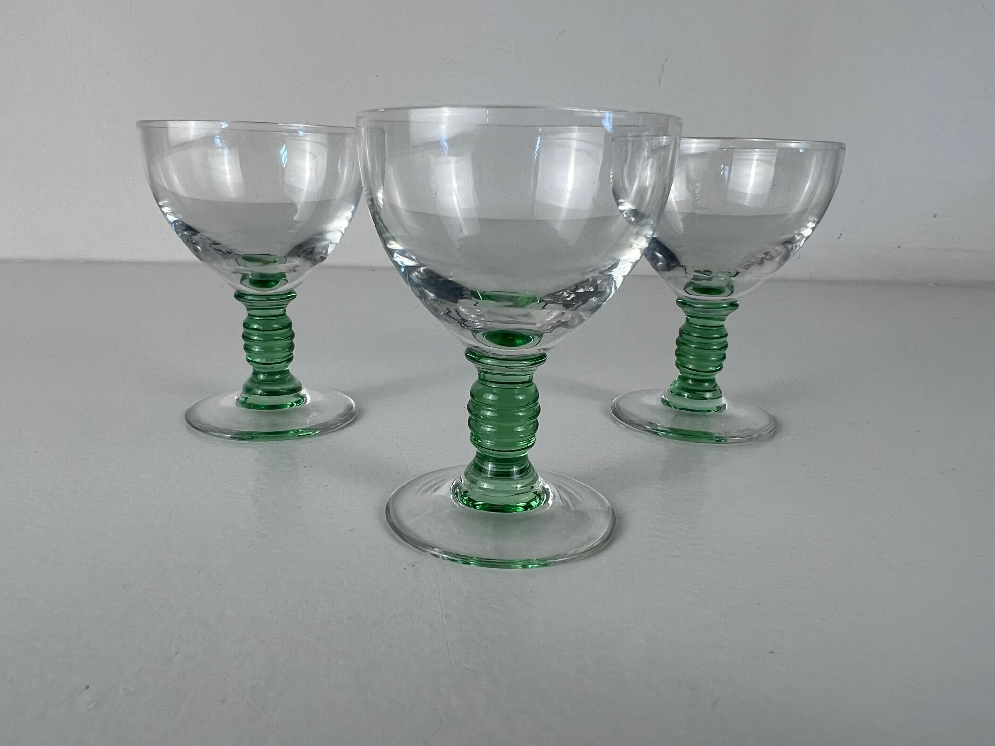 3 delicate shot glasses, liquor glasses, beautiful decorated sea green stem and clear glass chalice - Vintage from the 1930s-1940s