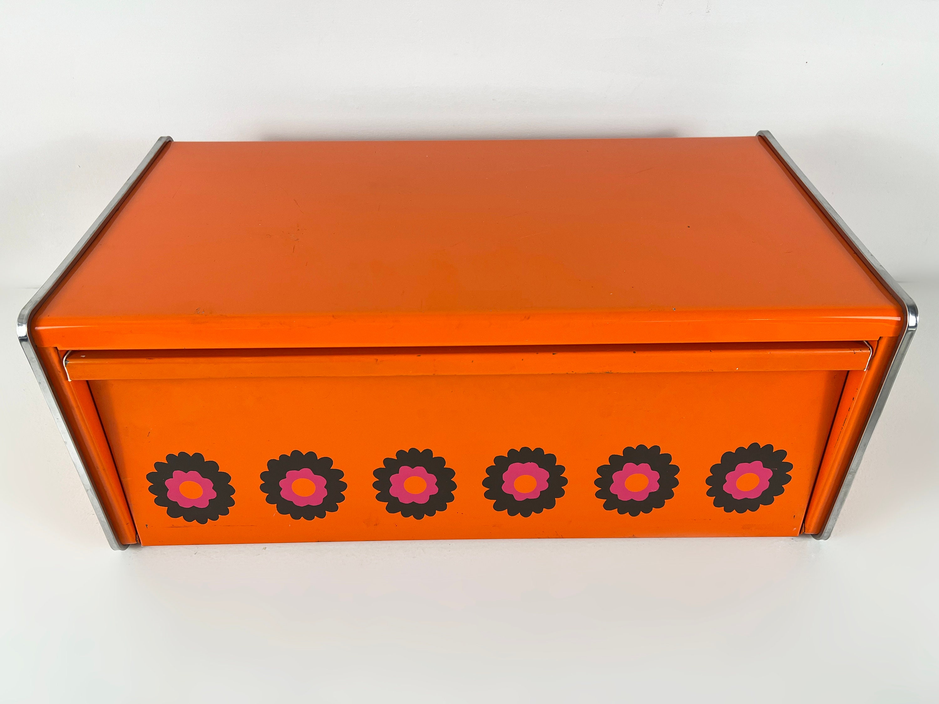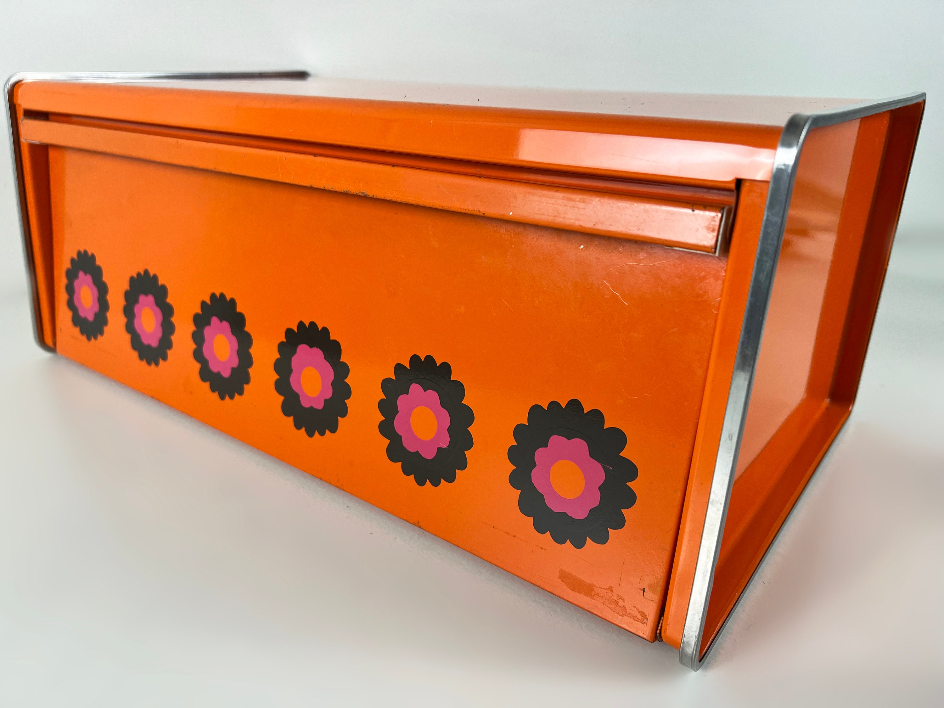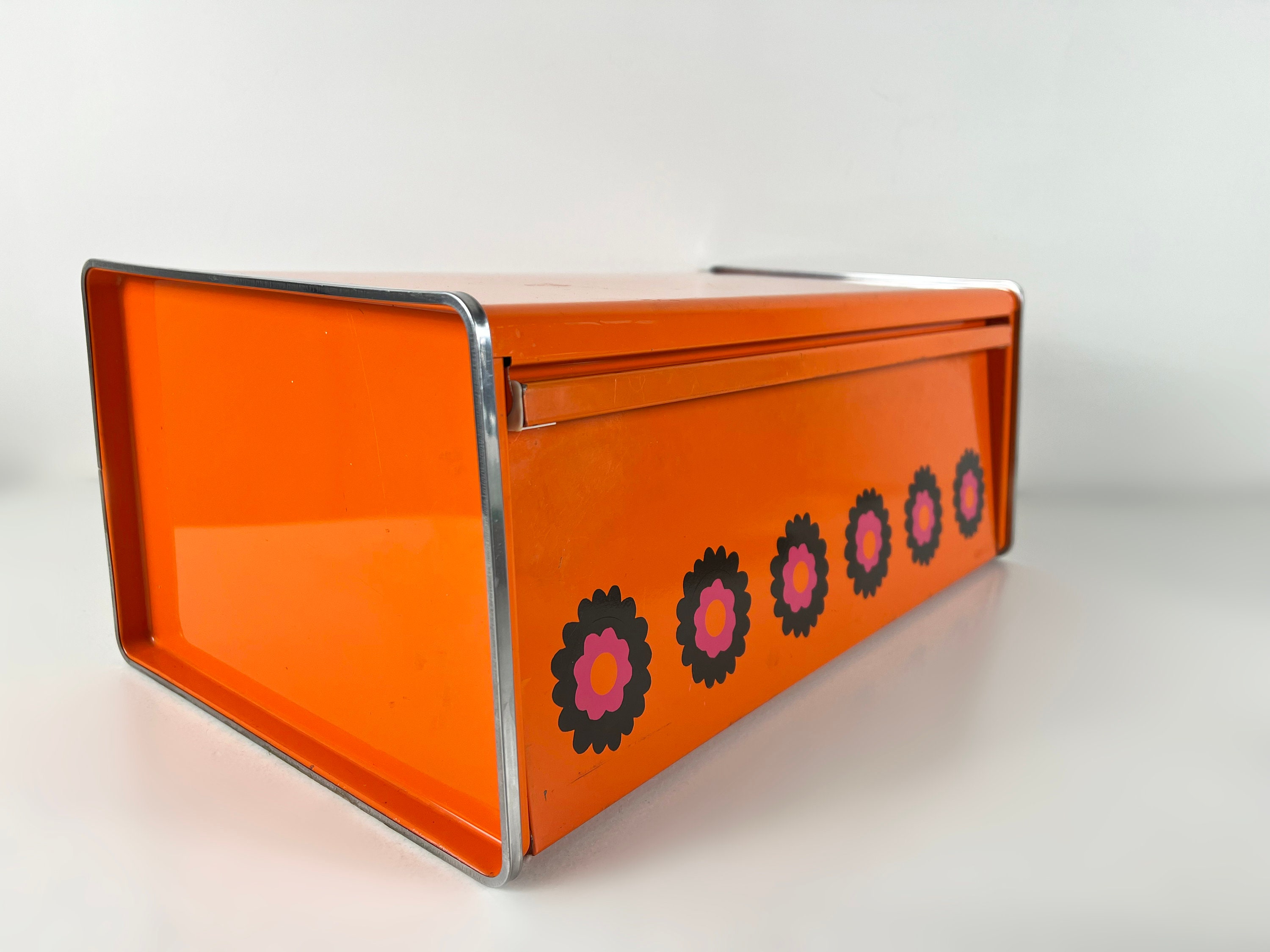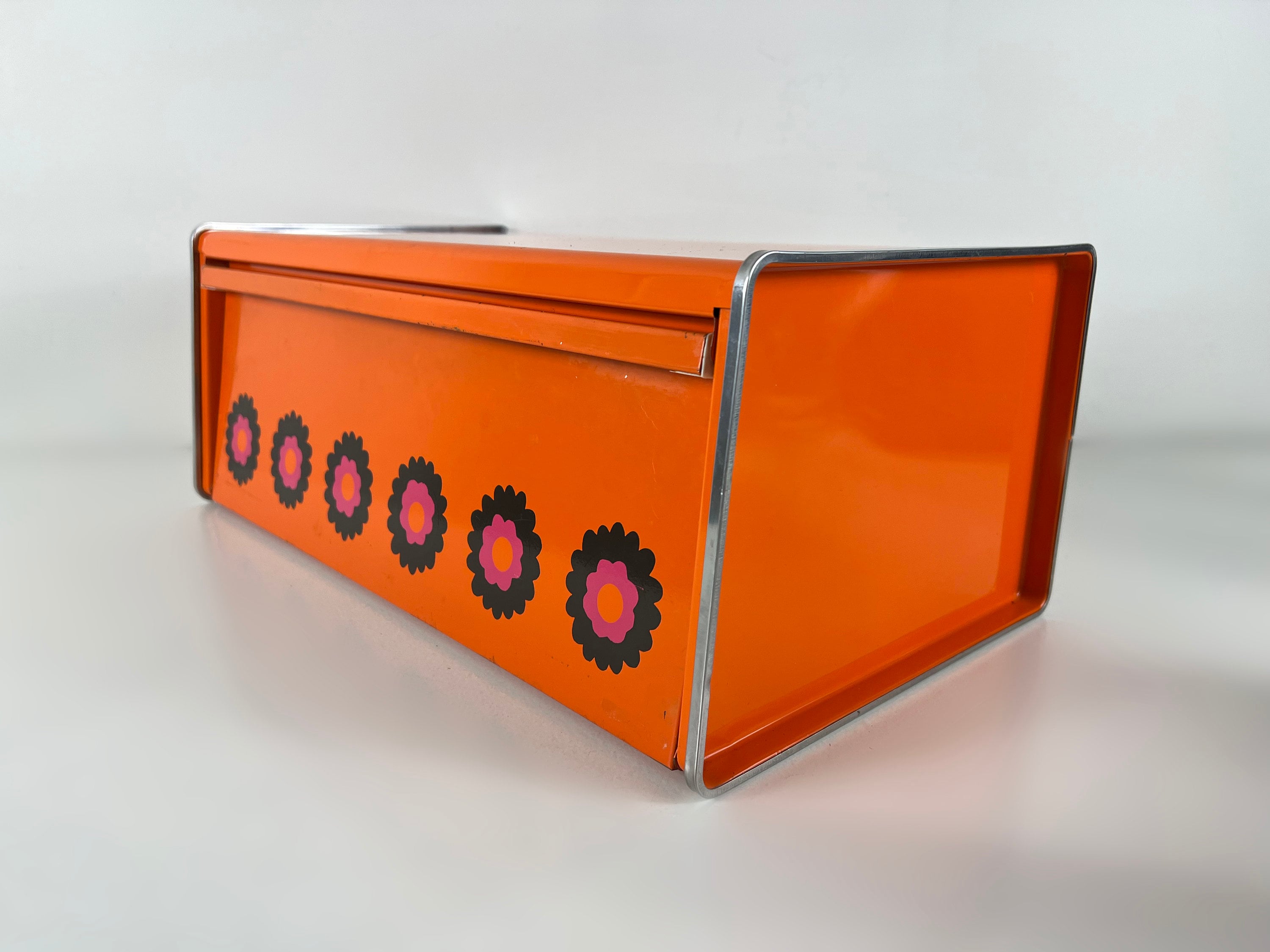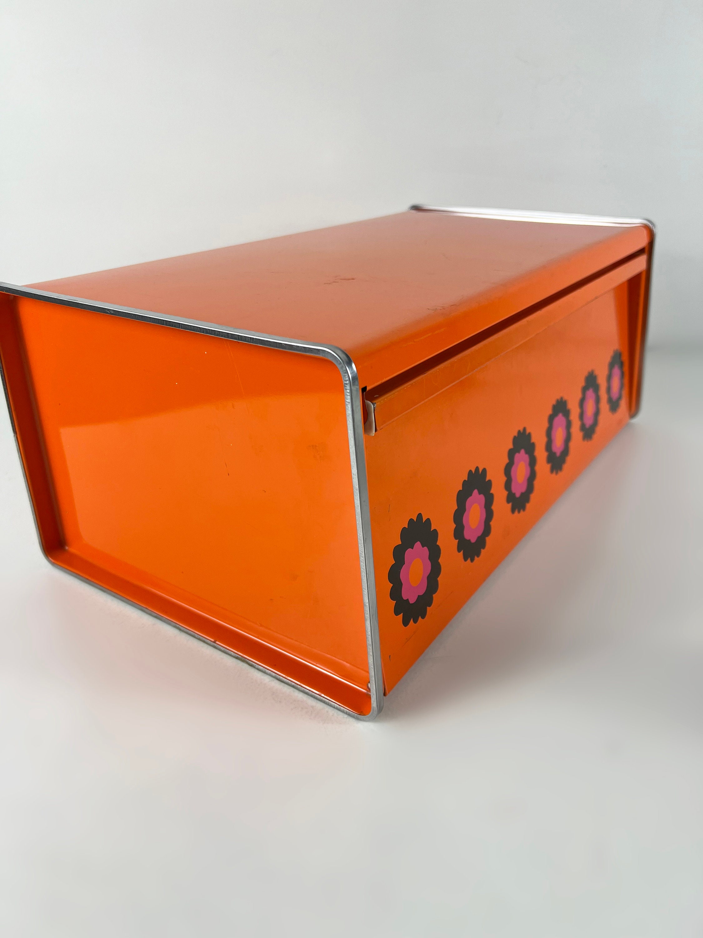 Brabantia Patrice bread bin, orange bread box, bread bin with a flowery design, Dutch vintage mid century design 1970s