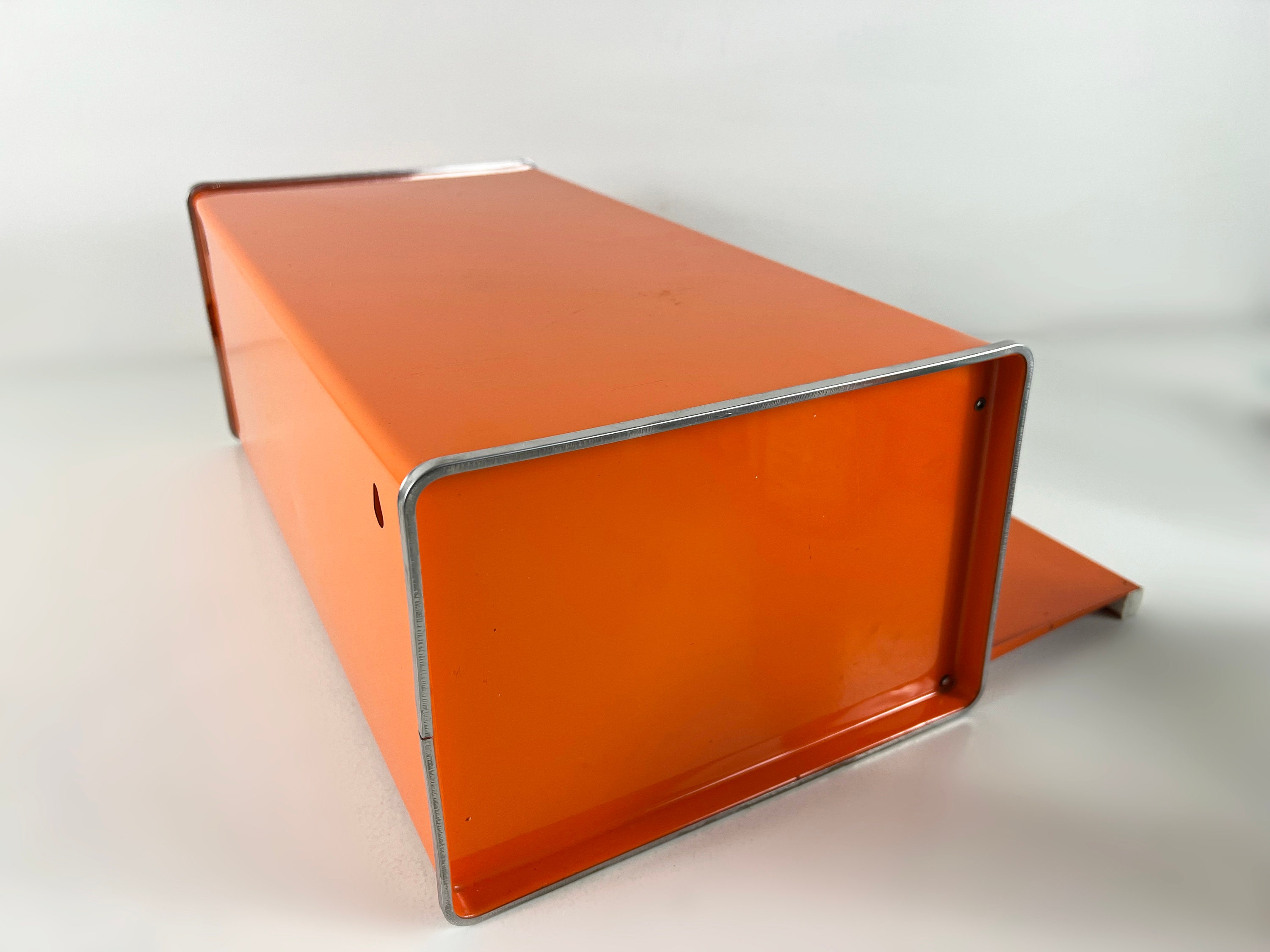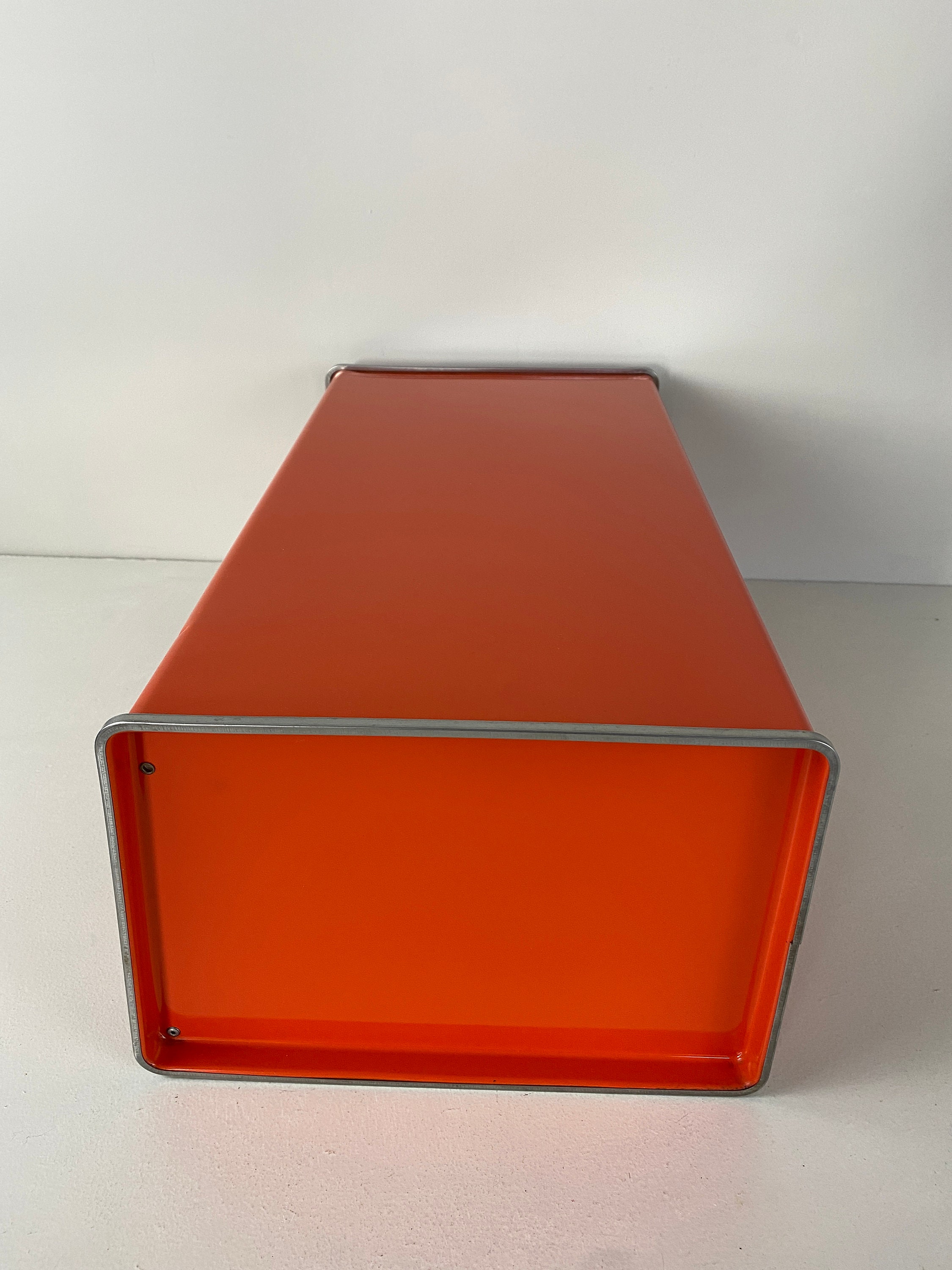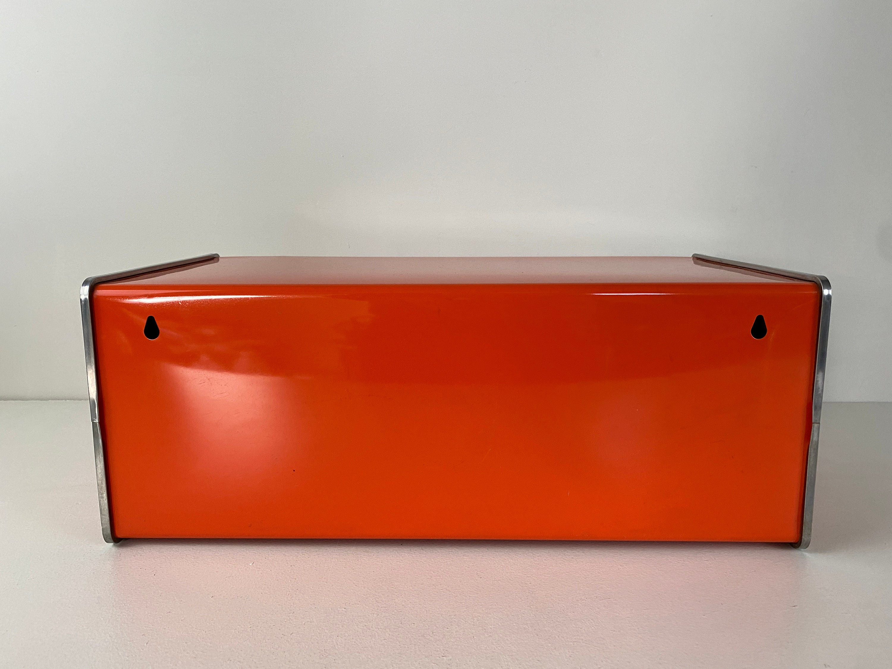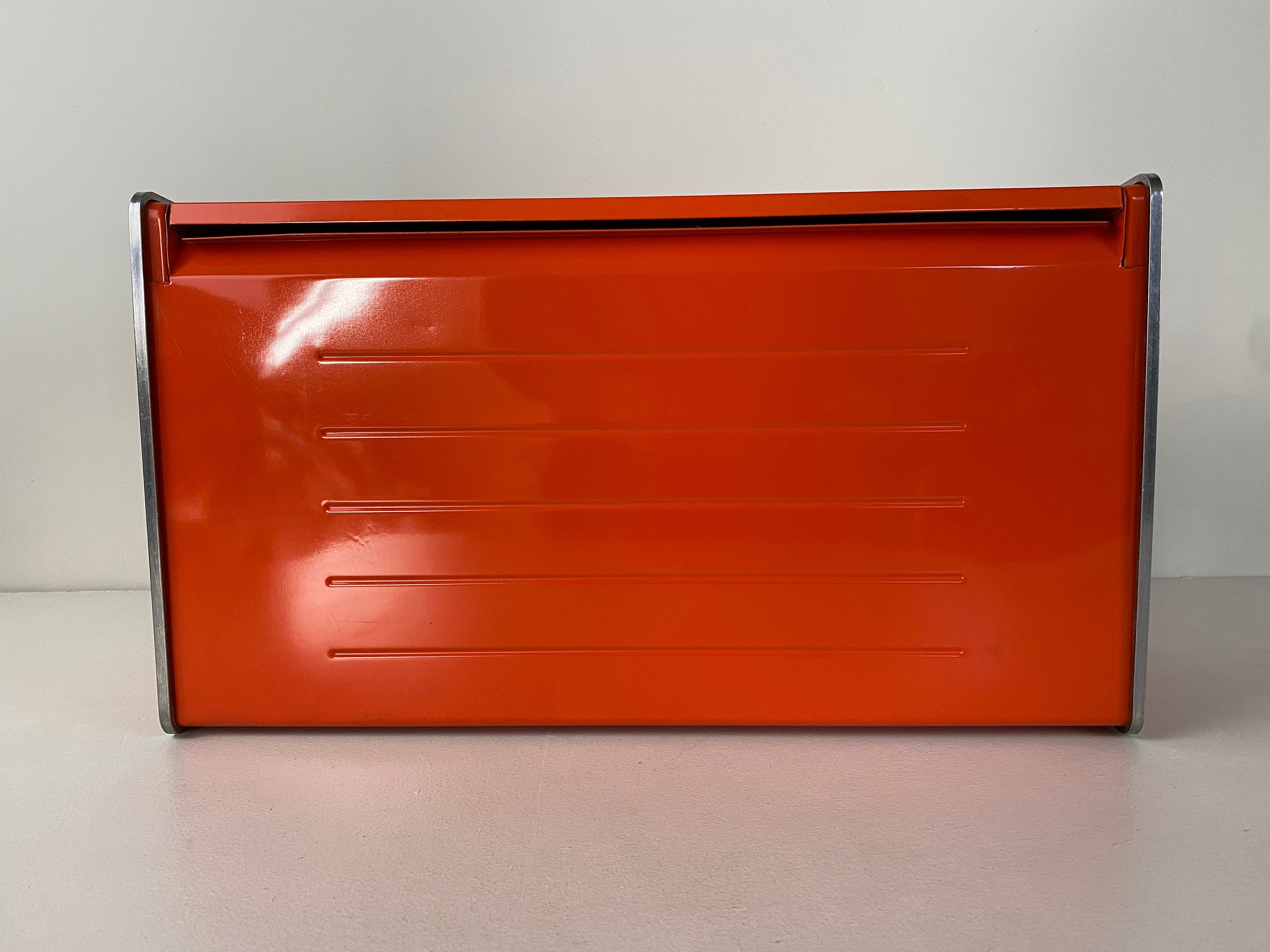 Vintage Brabantia Patrice Bread Bin bright orange with a flowery design. Mid century design from Holland from the 1970s.