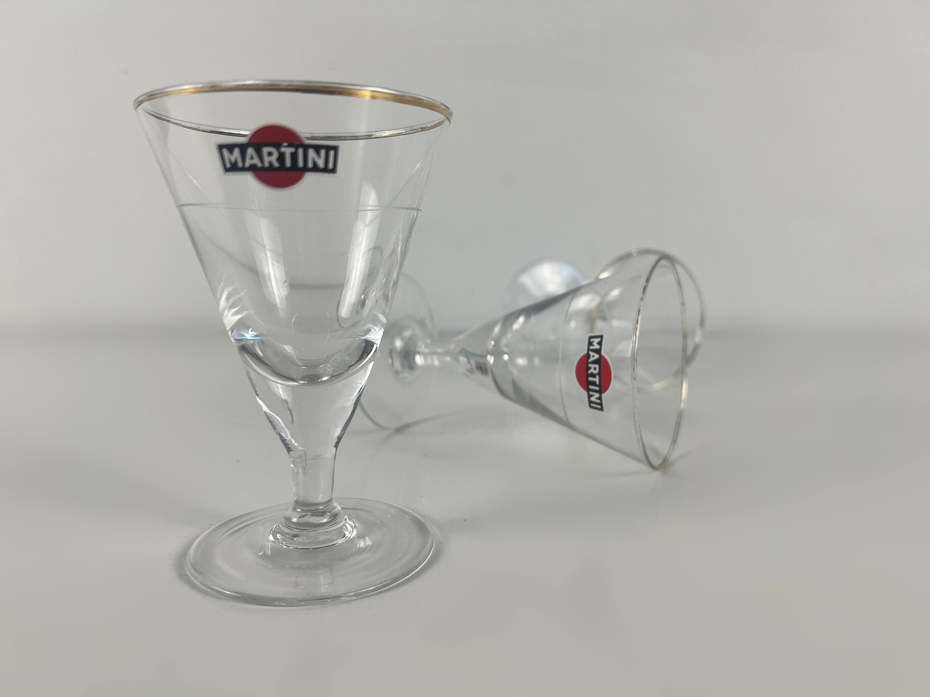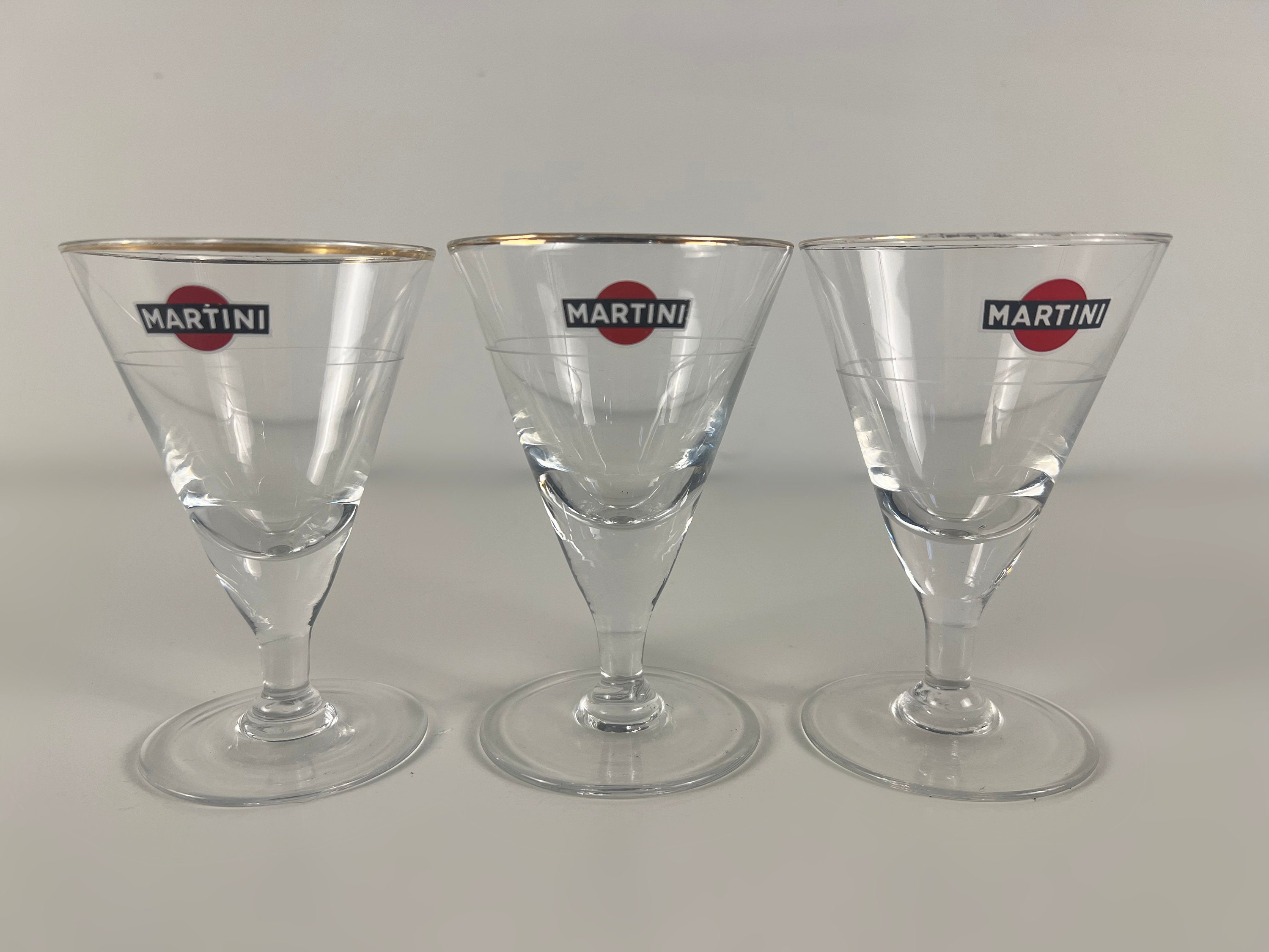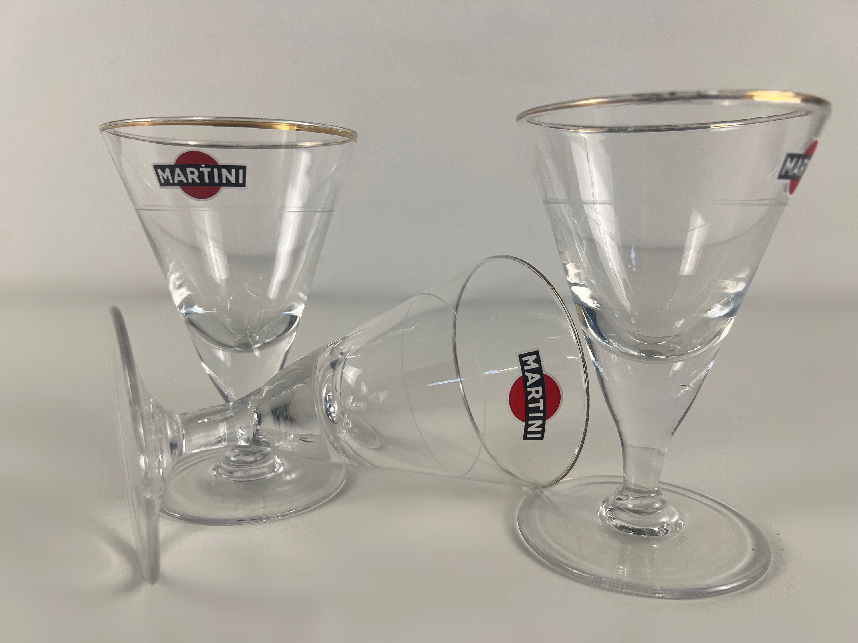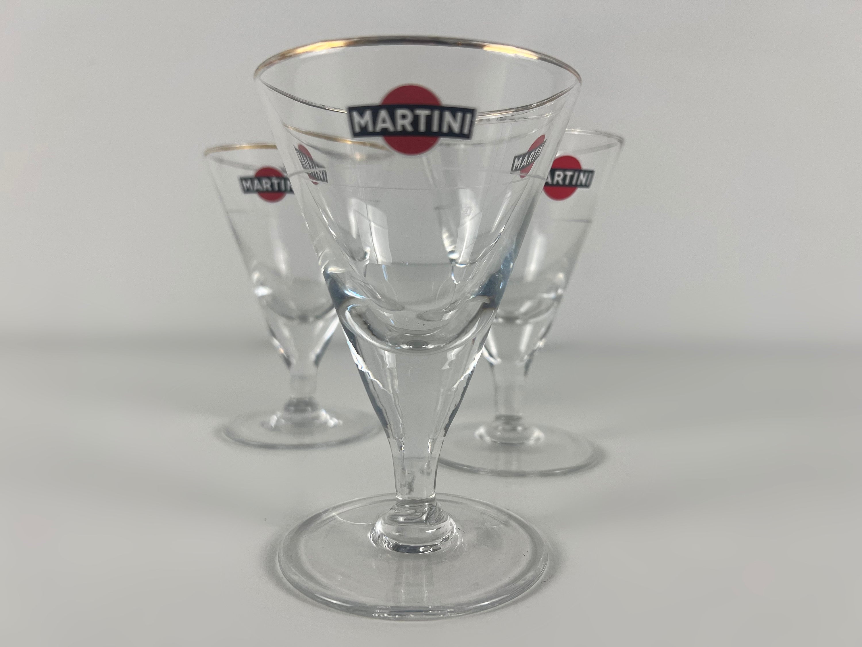 Set of 3 stylish and rare old Italian Martini vermouth, cocktail glasses from the 1950s or 1960s. The glasses are in overall good vintage condition regarding their age. The golden rims have faded on multiple spots from frequent use. The glasses are hand or mouth blown. They are slightly irregular in shape and contain a few small trapped air bubbles. A great addition to your mid century modern bar set up!