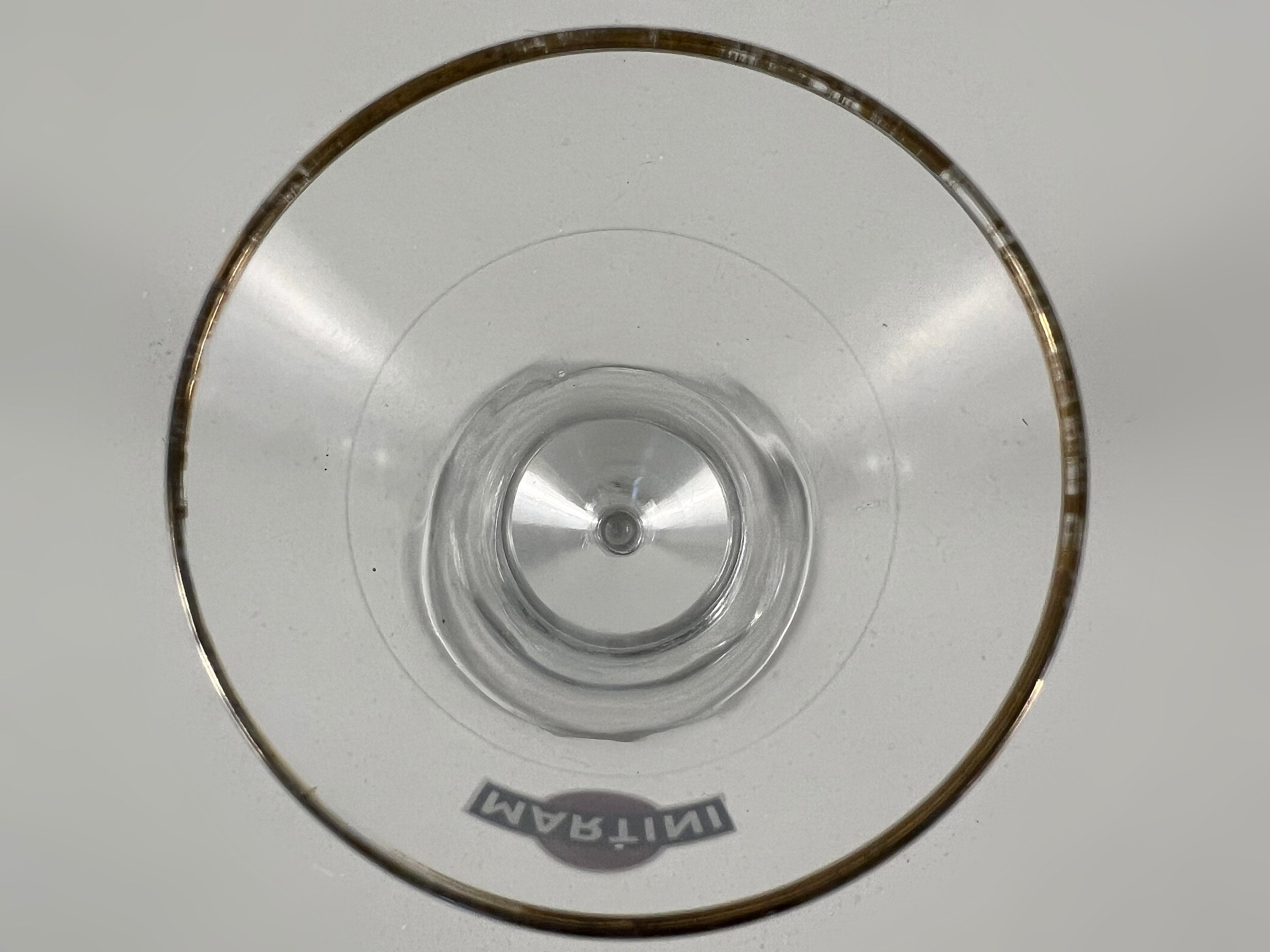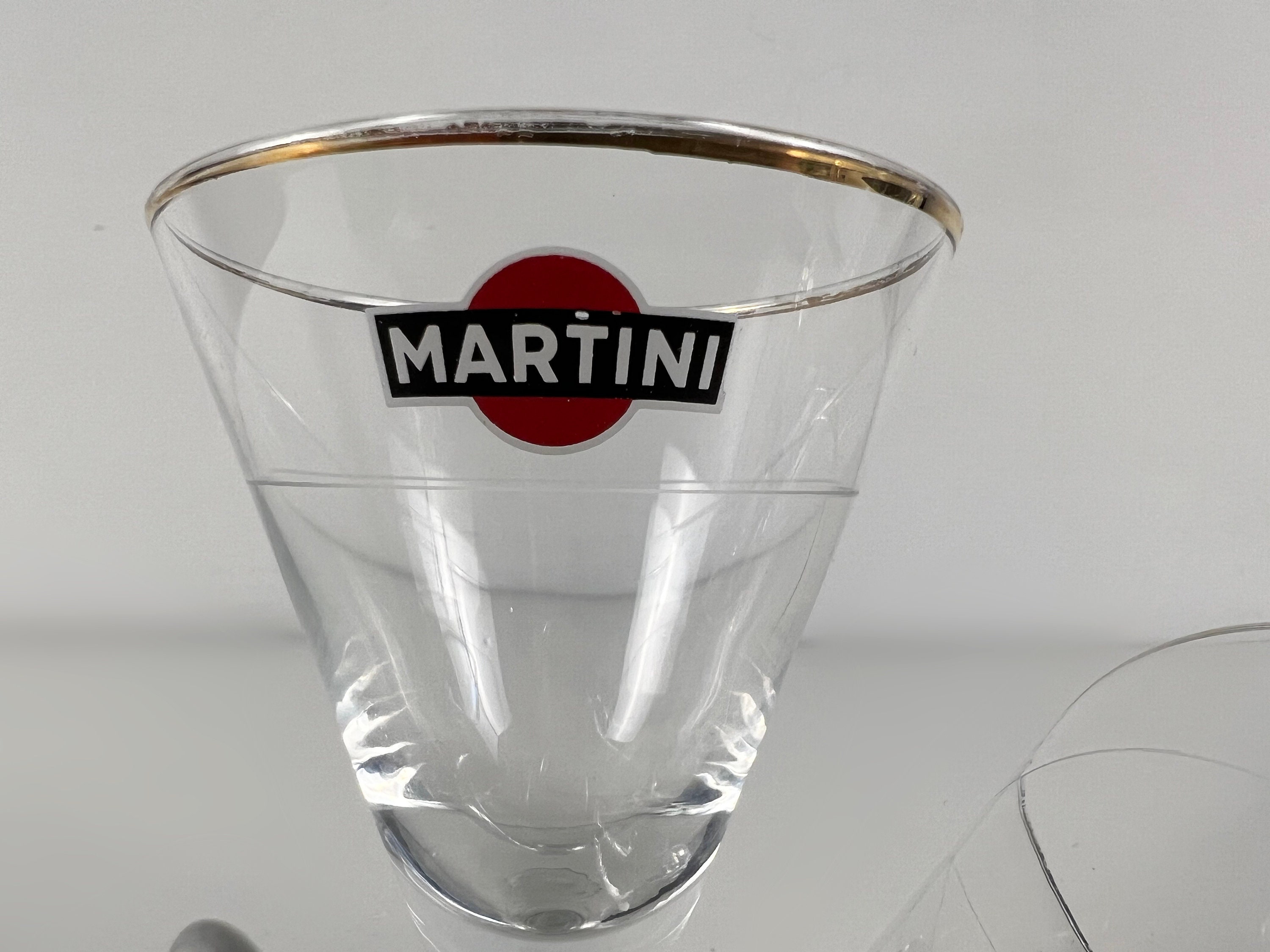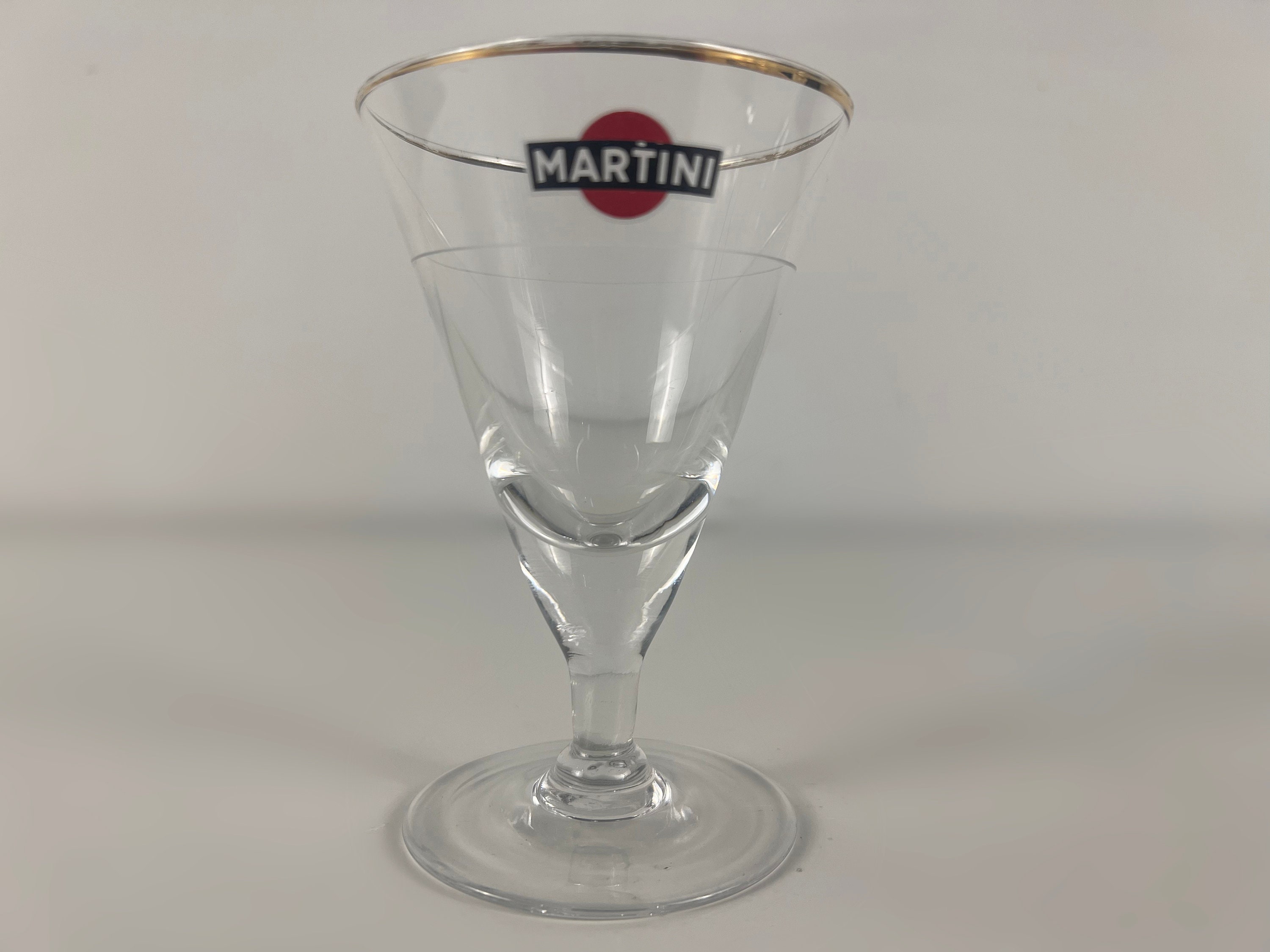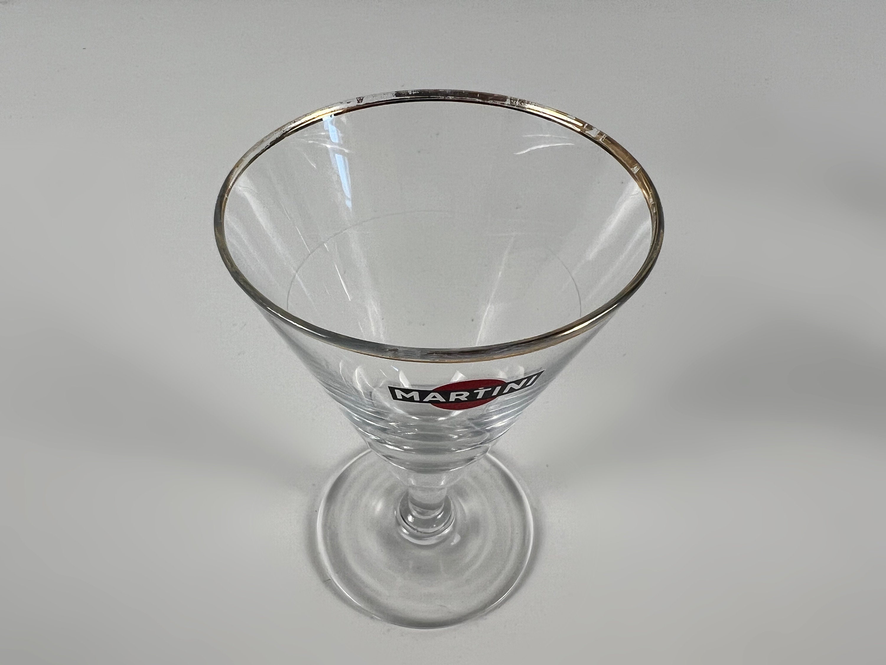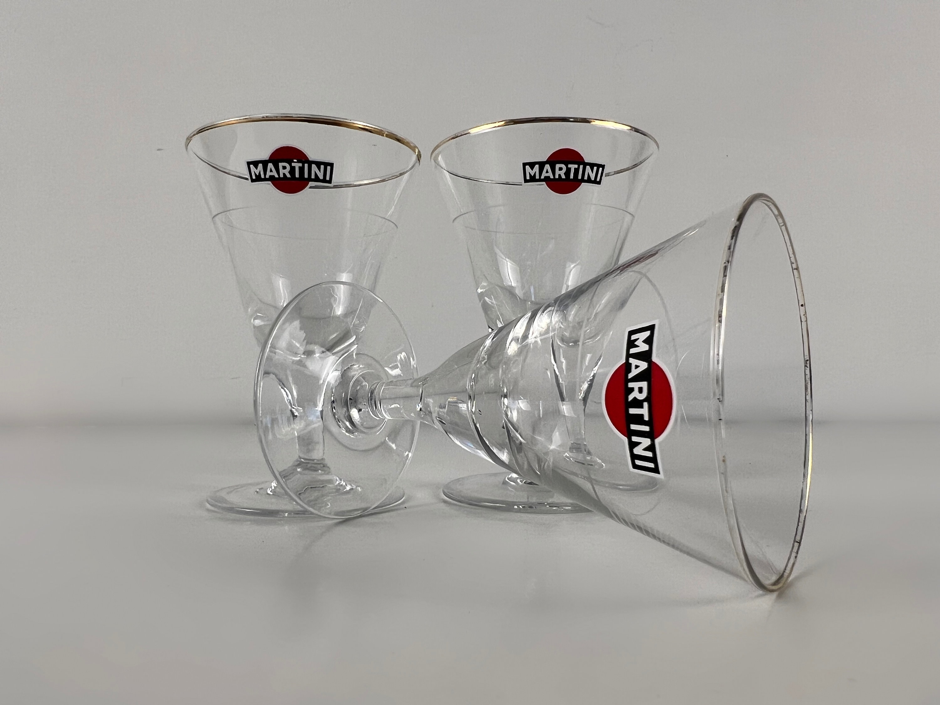 Set of 3 stylish and rare old Italian Martini vermouth, cocktail glasses from the 1950s or 1960s. The glasses are in overall good vintage condition regarding their age. The golden rims have faded on multiple spots from frequent use. The glasses are hand or mouth blown. They are slightly irregular in shape and contain a few small trapped air bubbles. A great addition to your mid century modern bar set up!