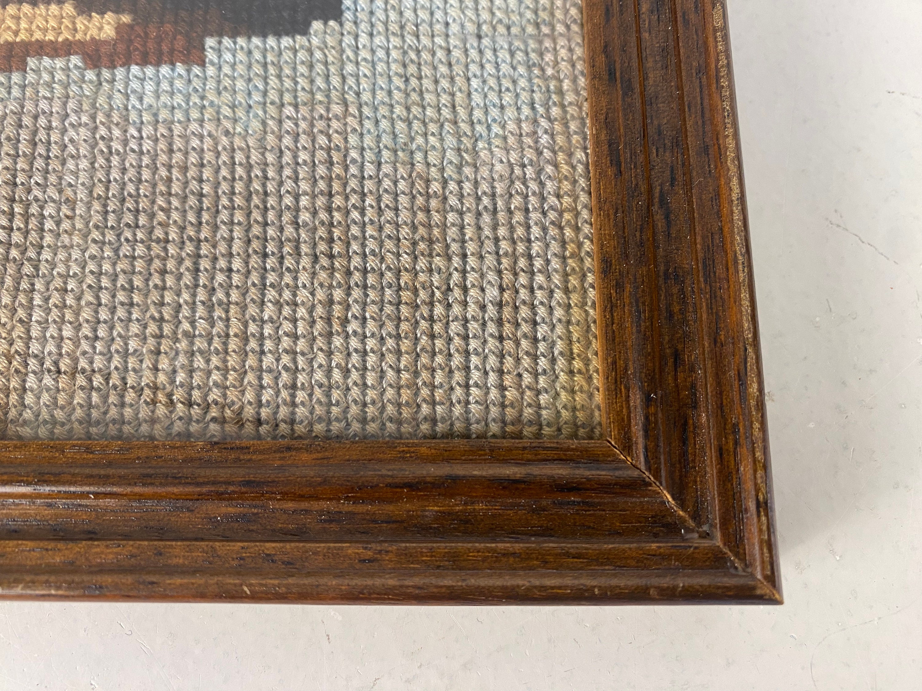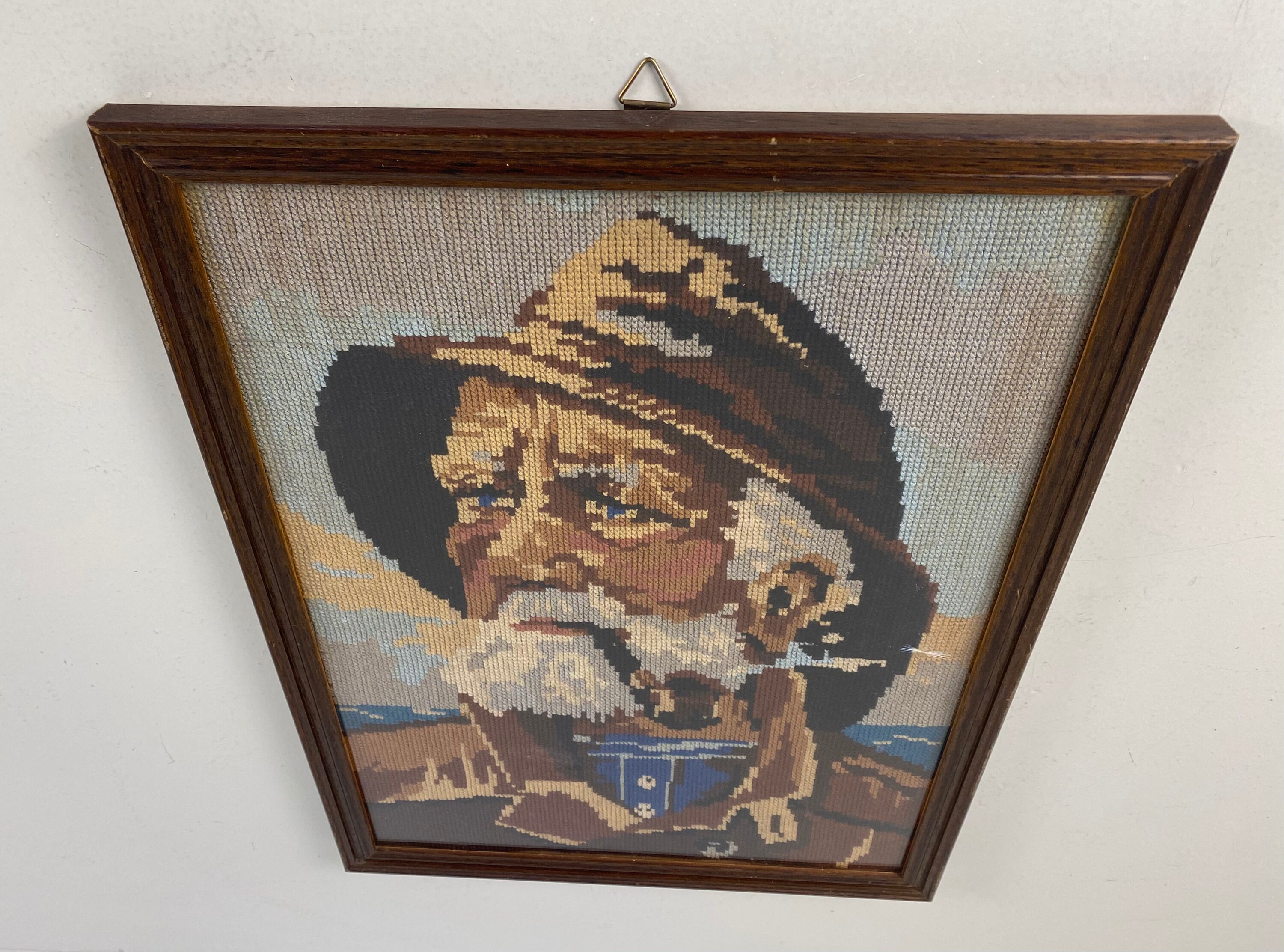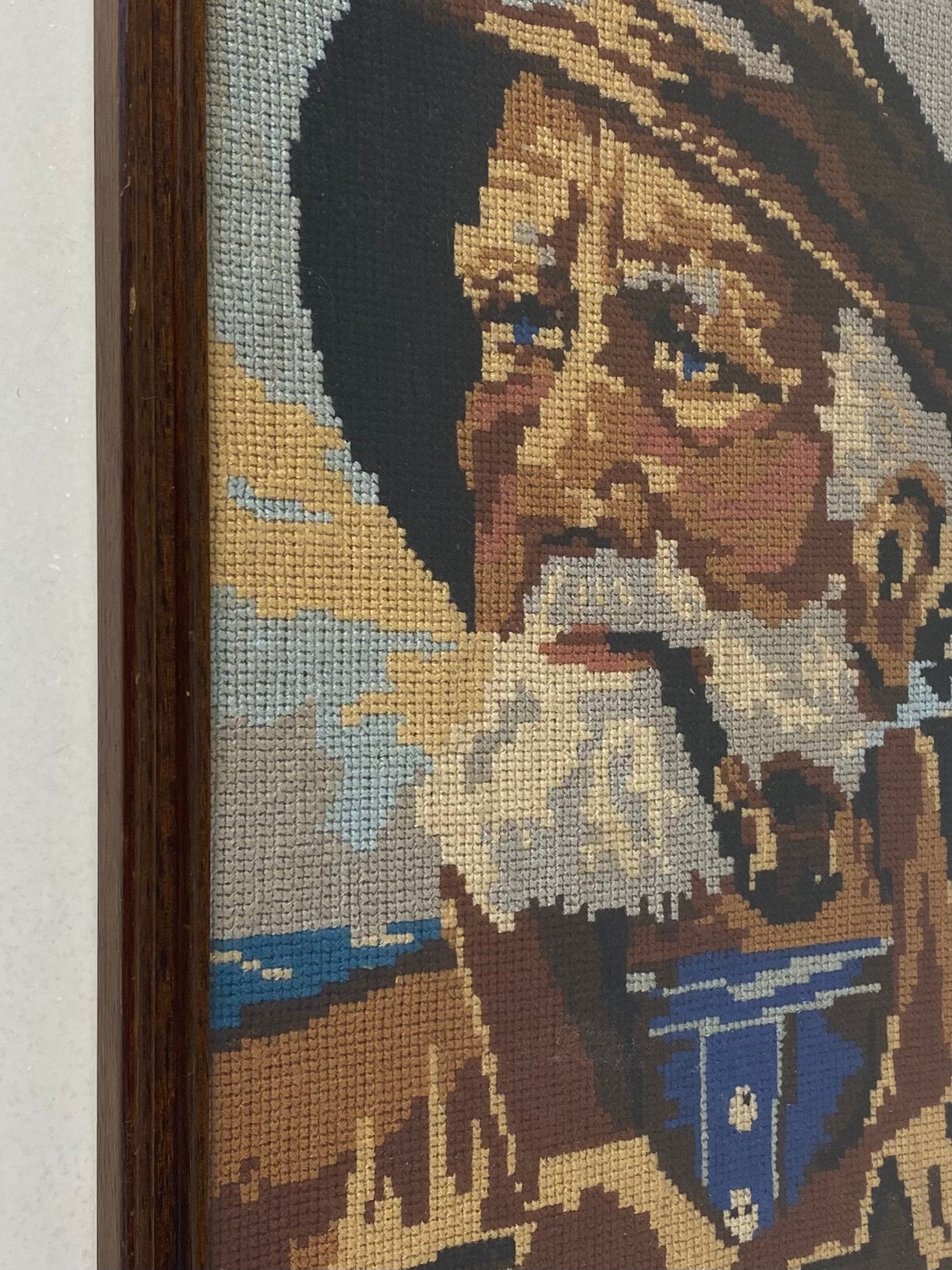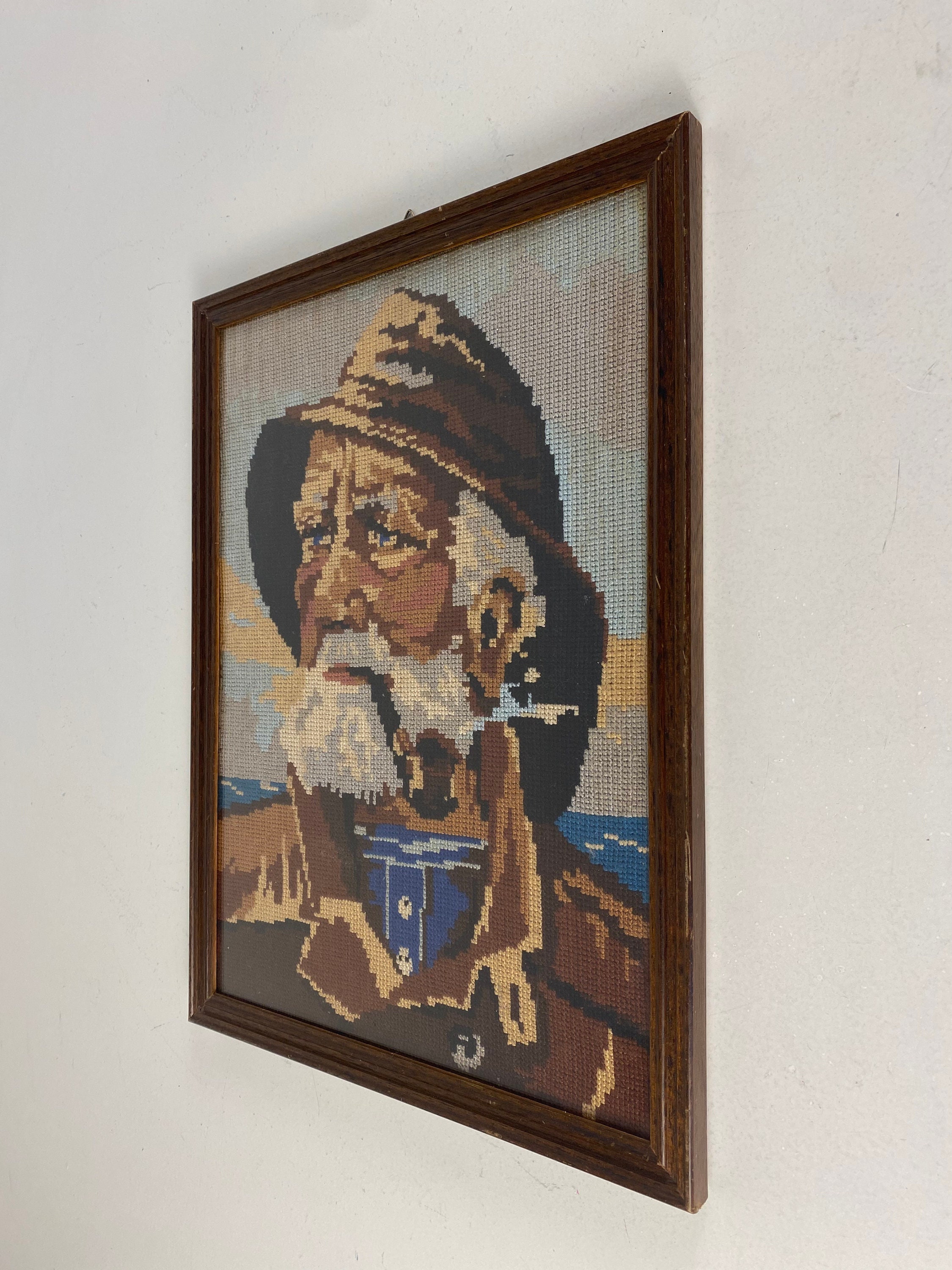 Very nice vintage wood framed embroidery portrait of Dorus Rijkers, a pipe-smoking fisherman, an old sailor. With glass front. Mid century wall art from the 1970's. Original by Harry Haerendel.