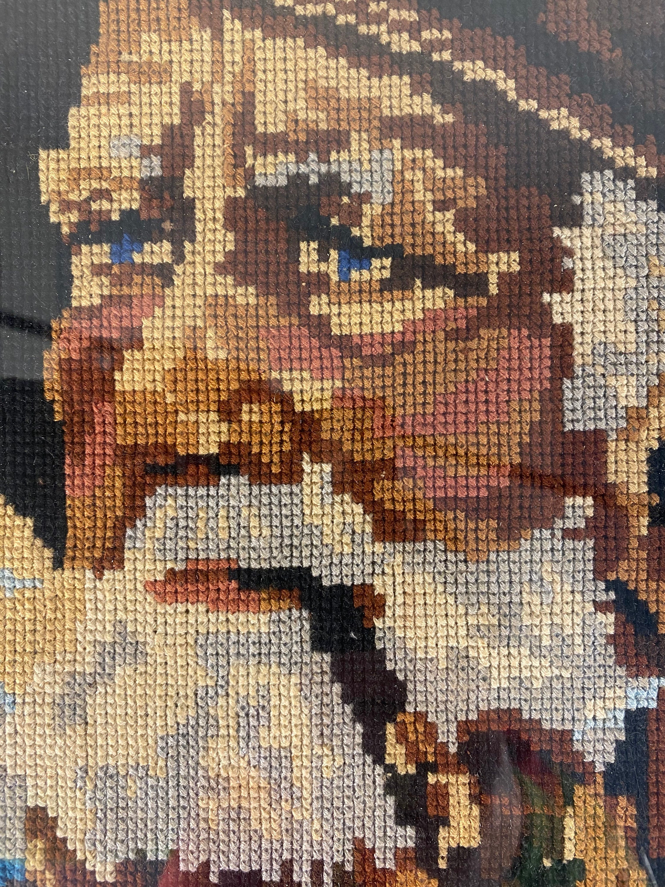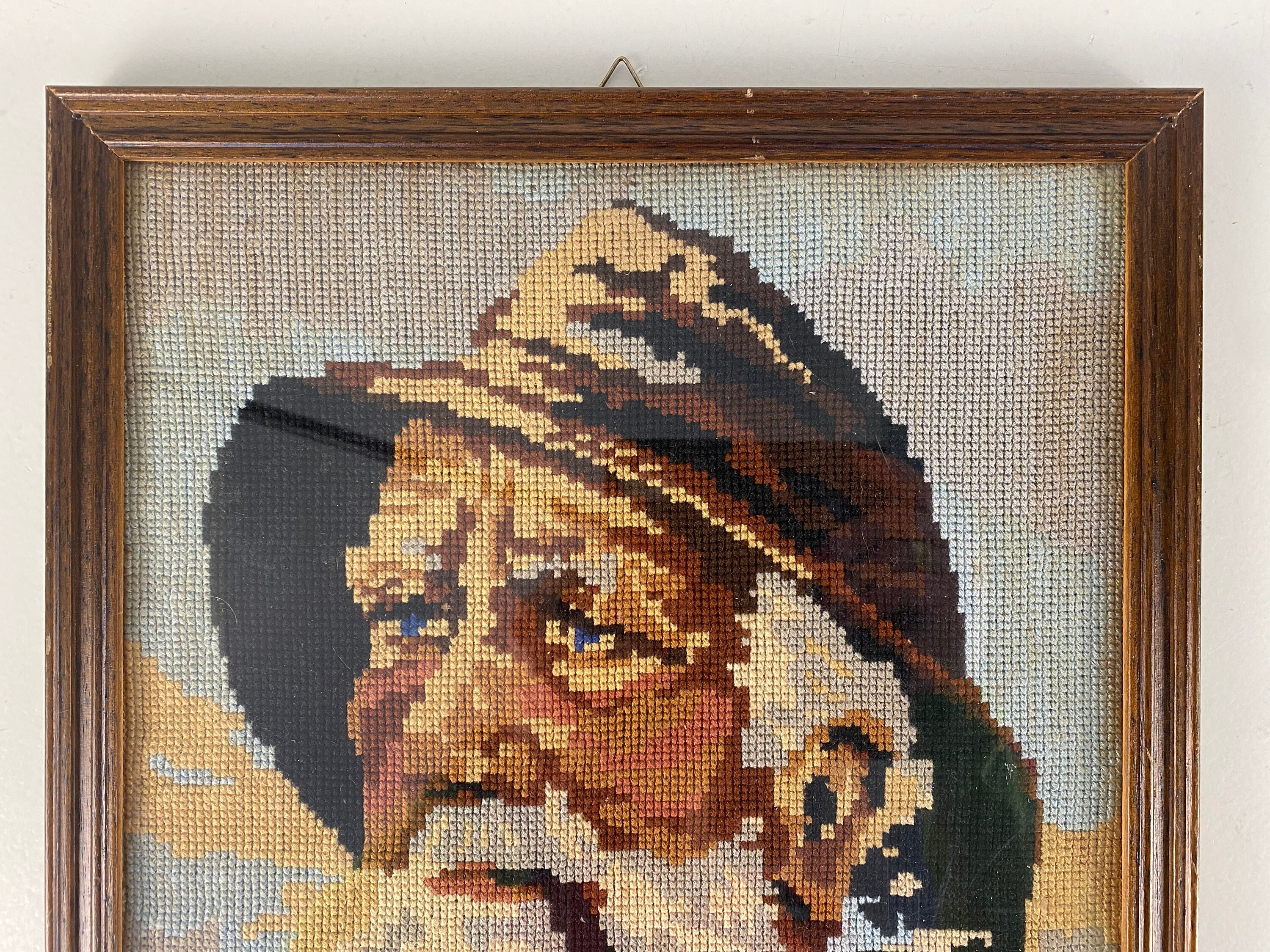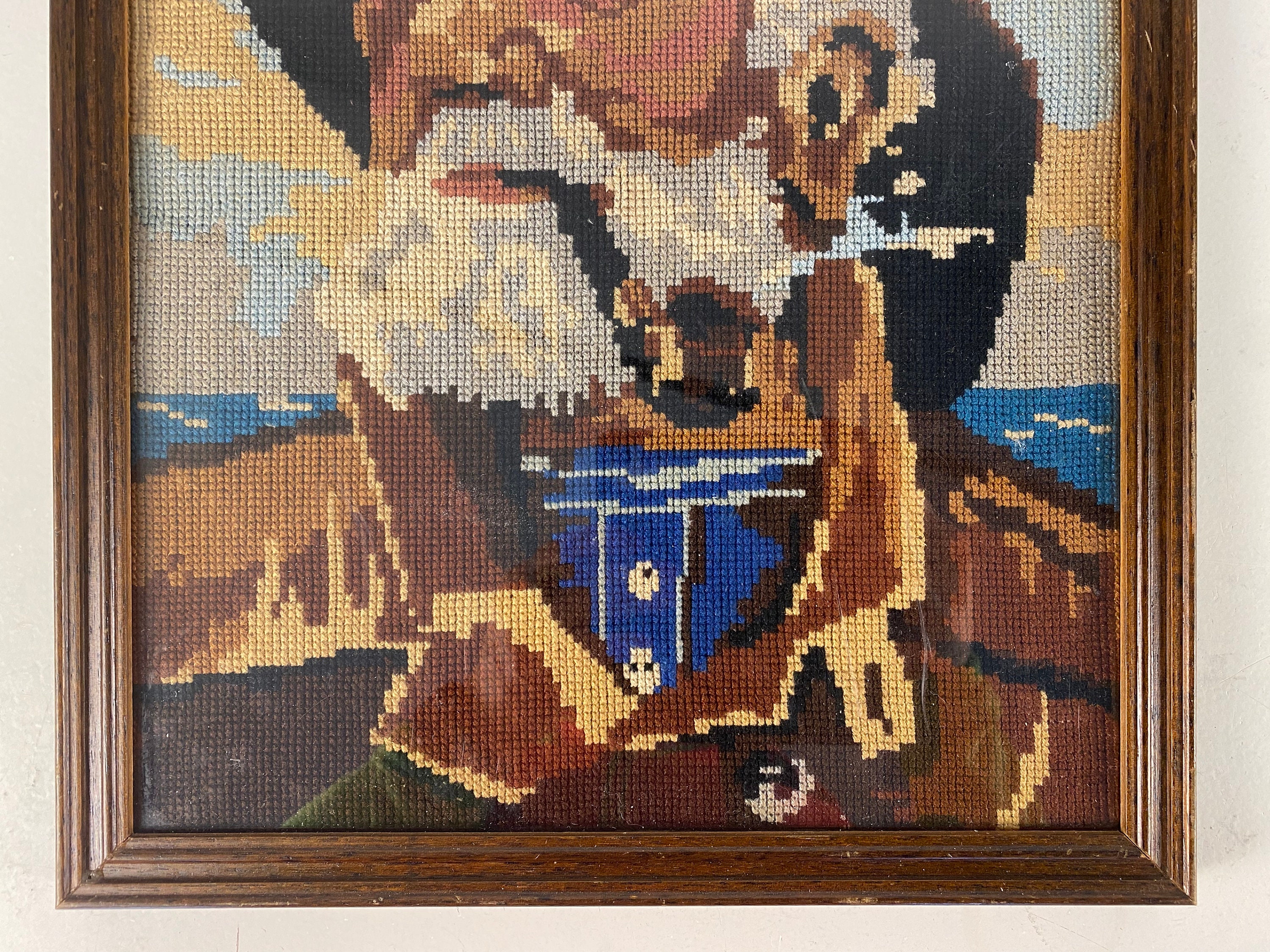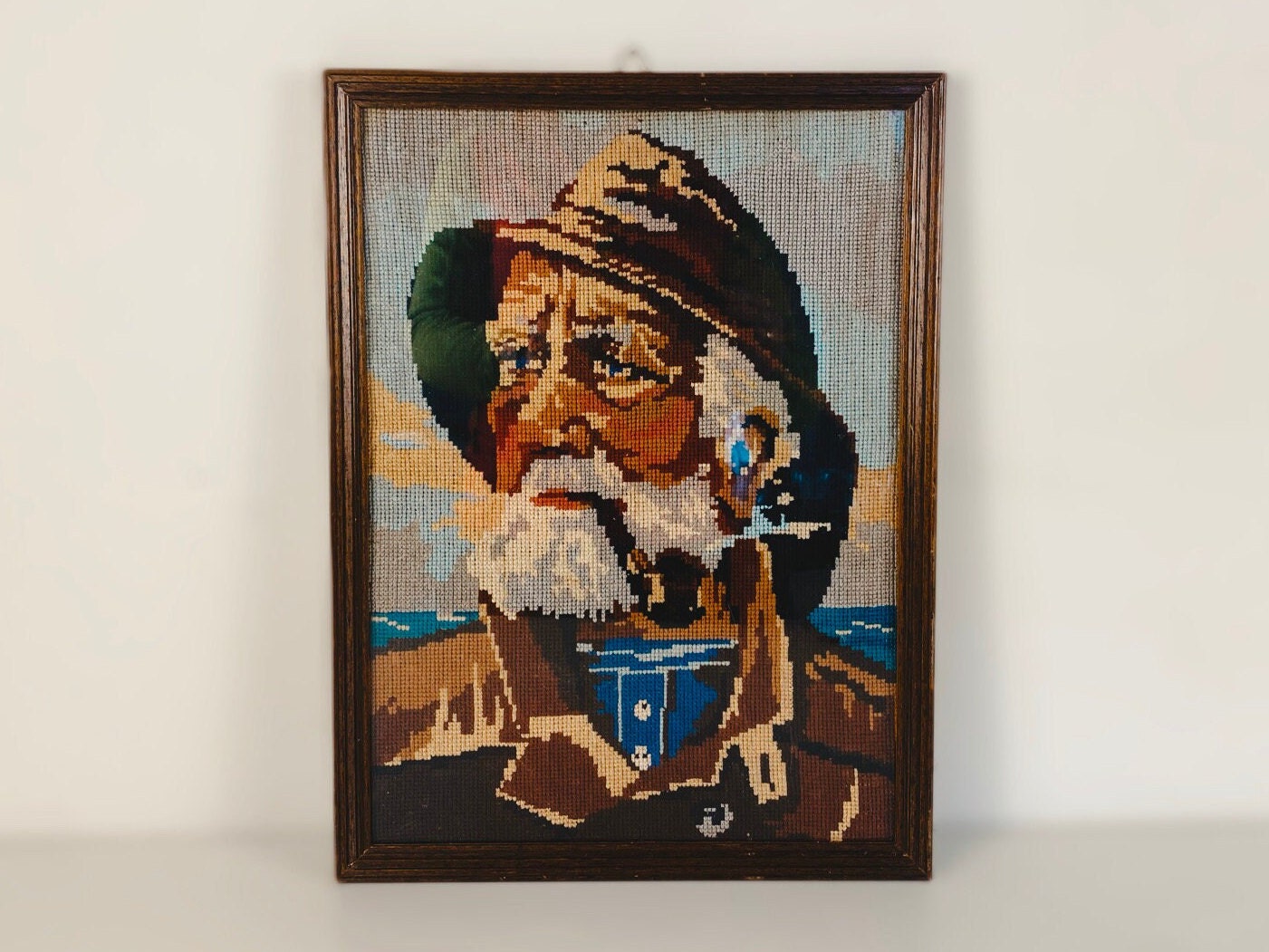 Vintage embroidery framed portrait of Dorus Rijkers, a pipe-smoking fisherman, mid century wall art 1970's, Original by Harry Haerendel