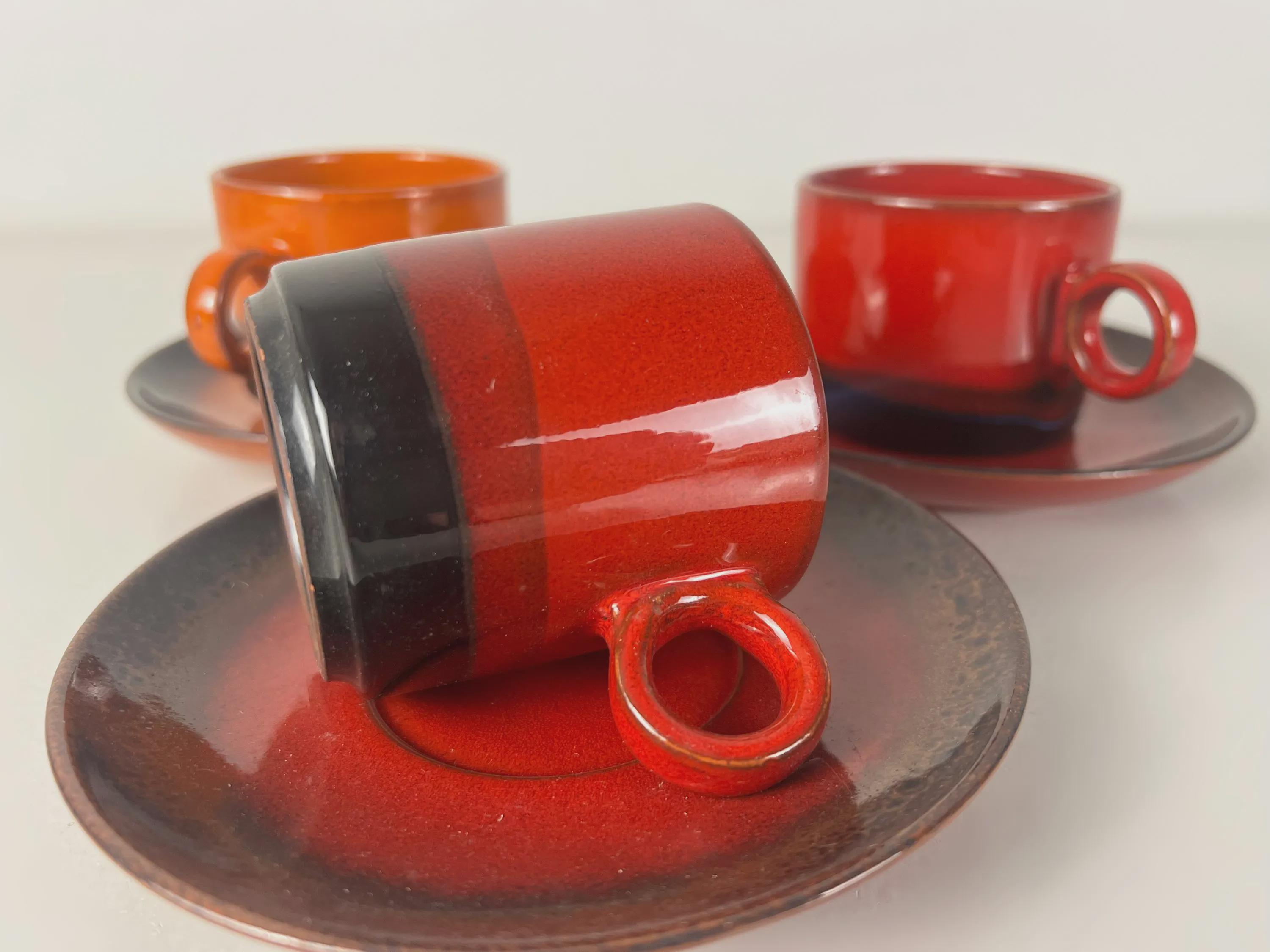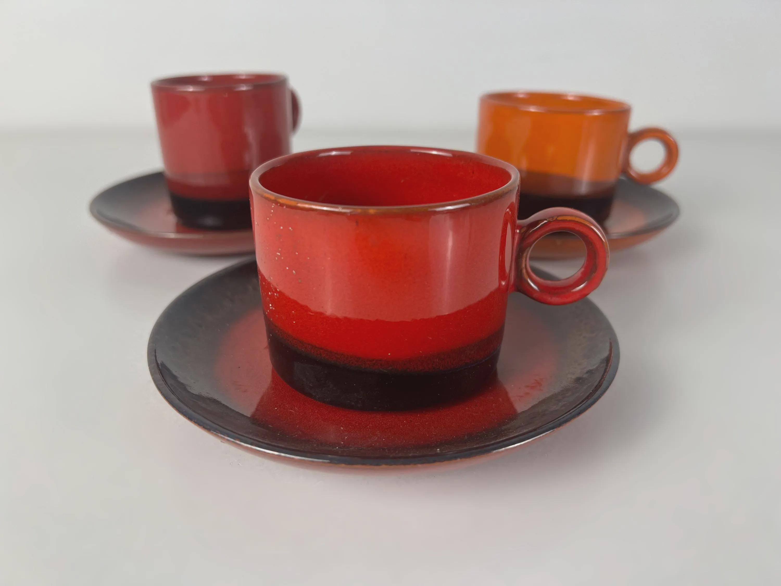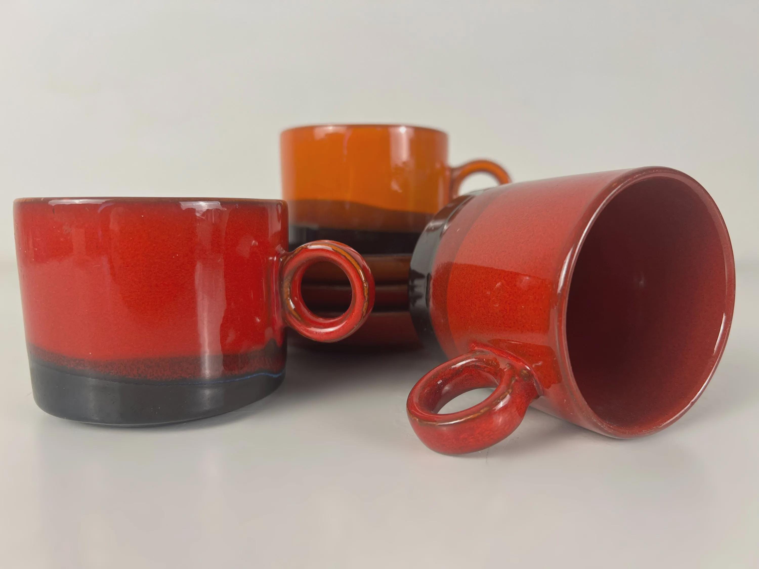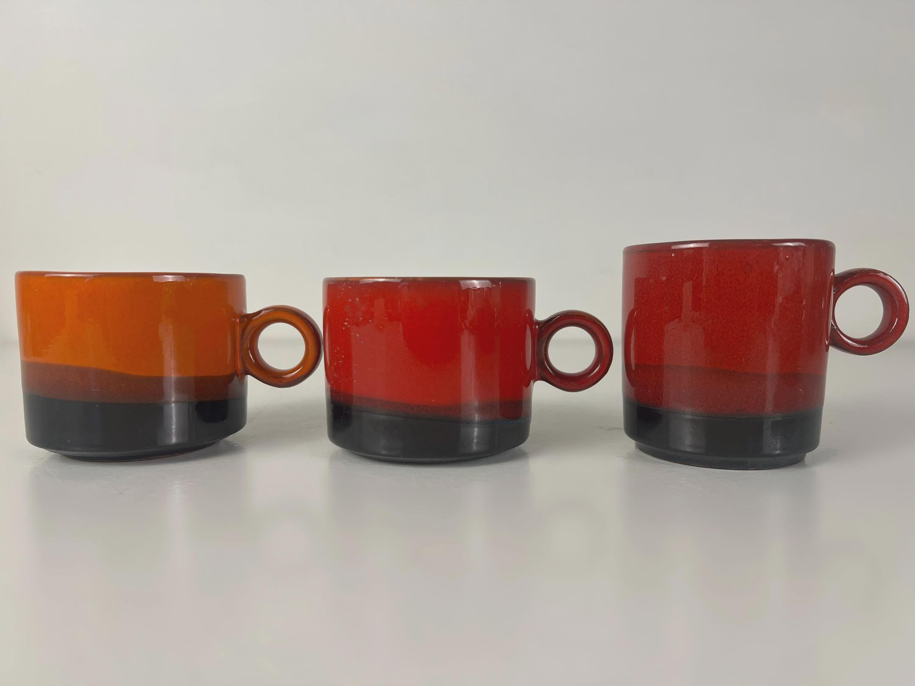 The set consists of two coffee or tea cups in the same size, one in orange to brown, the other in red to brown. The third cup is higher with a smaller diameter and is also red to brown colored. All three have identical handles. Great 70s feel and design.