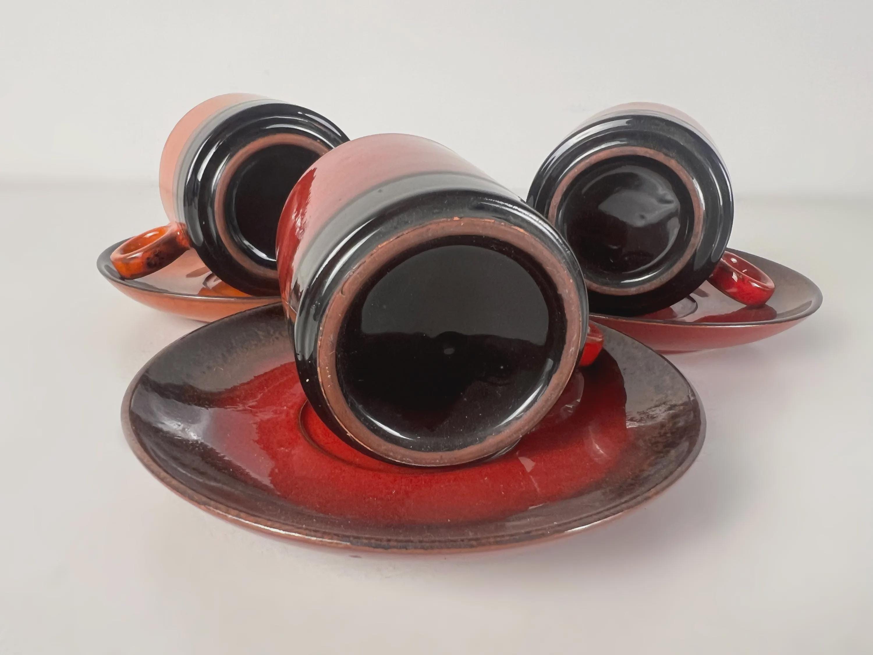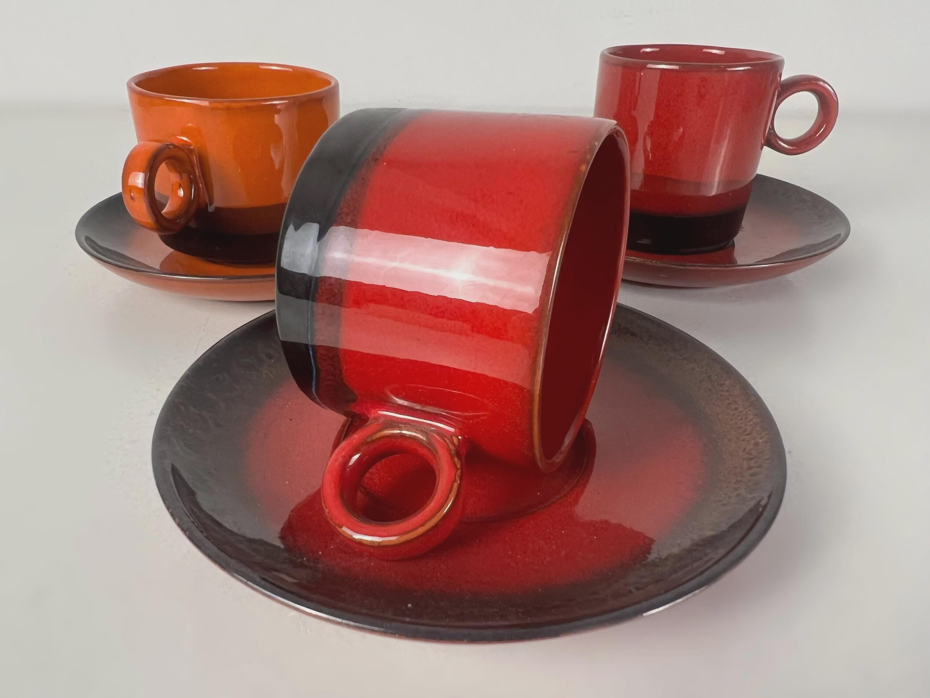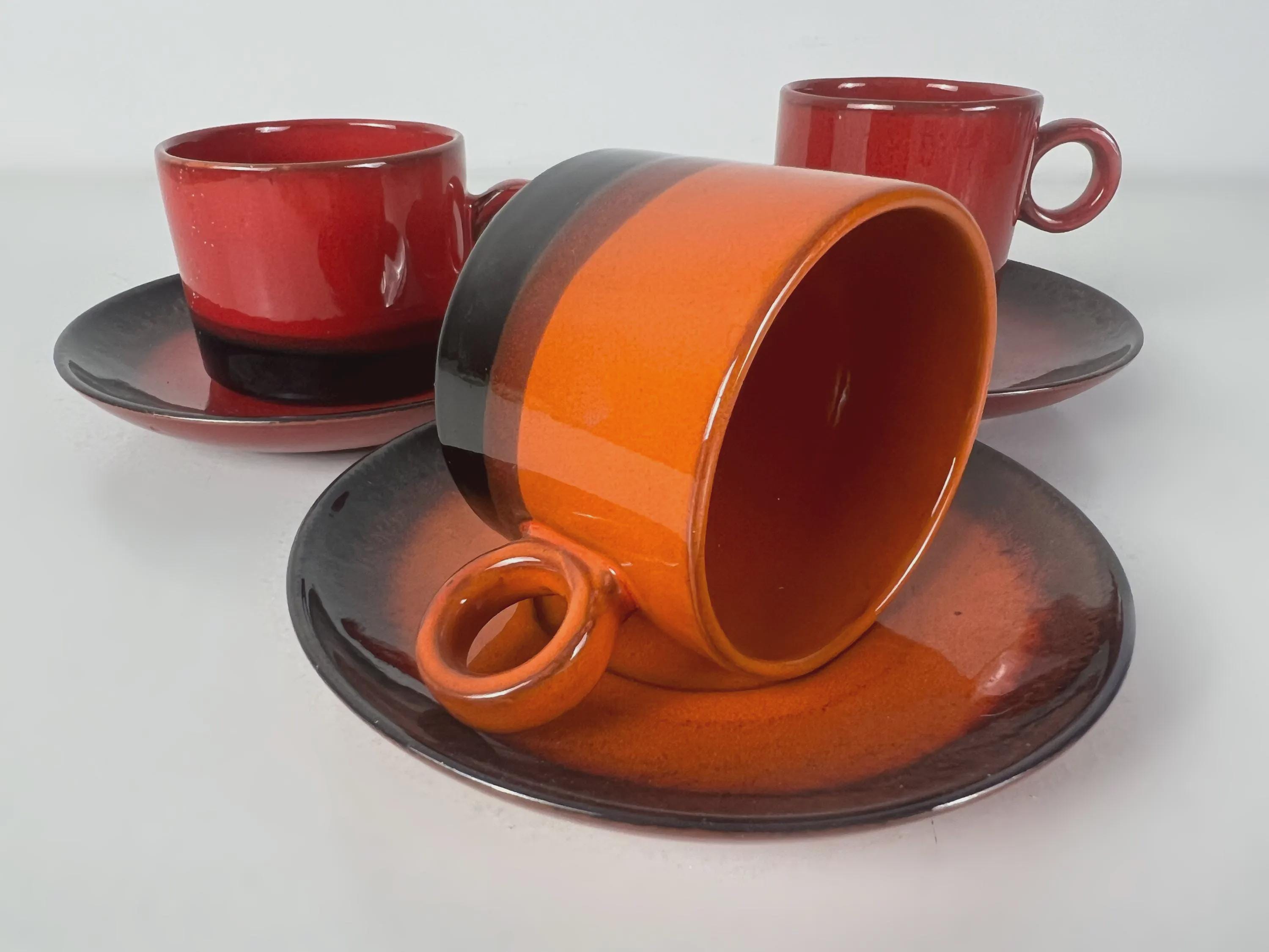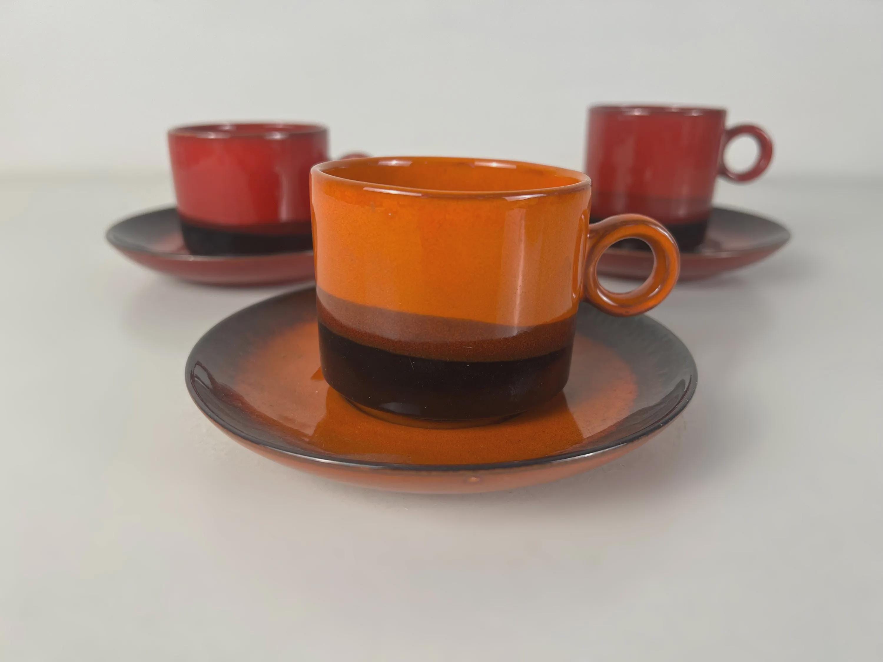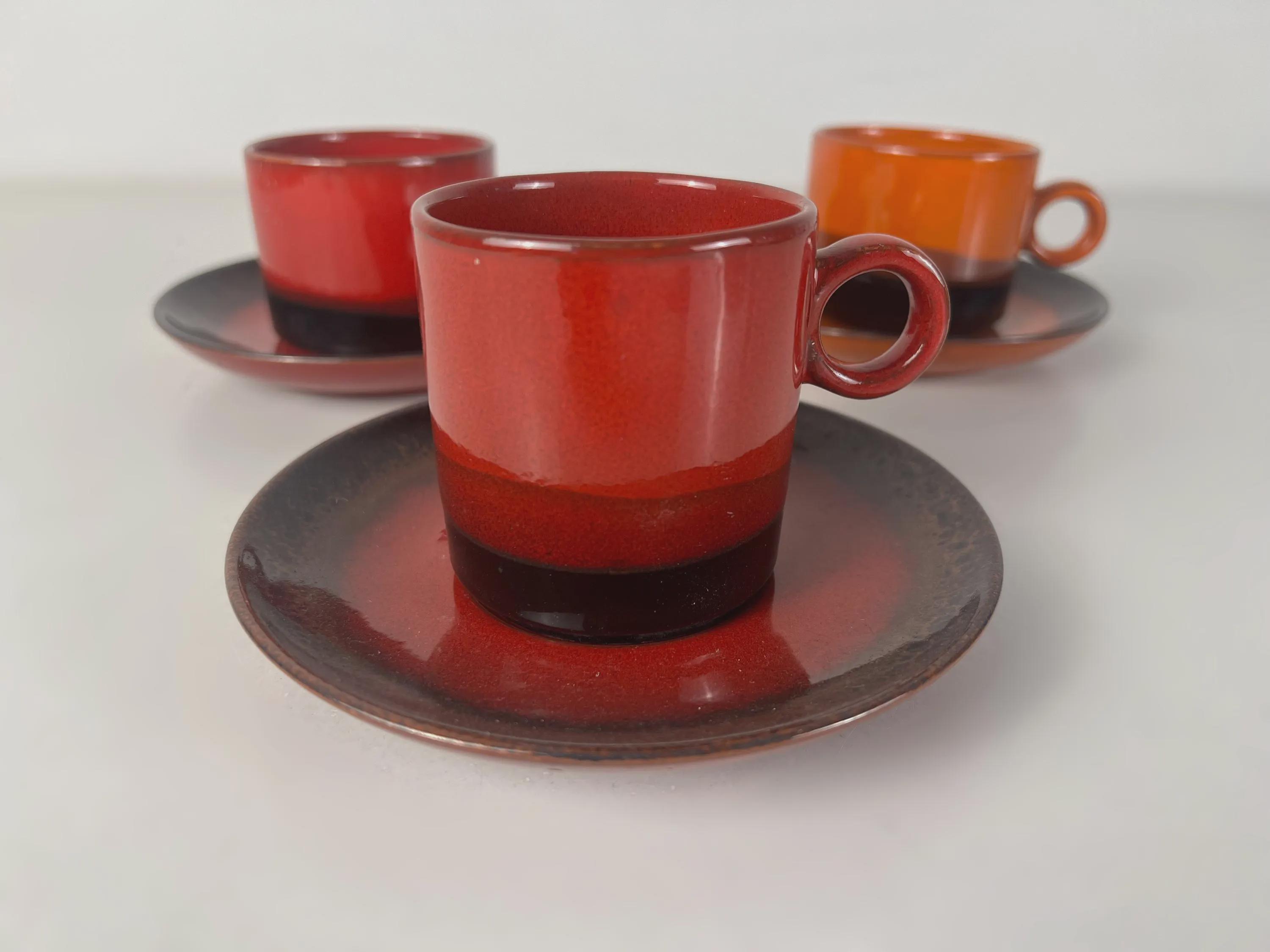 The set consists of two coffee or tea cups in the same size, one in orange to brown, the other in red to brown. The third cup is higher with a smaller diameter and is also red to brown colored. All three have identical handles. Great 70s feel and design.