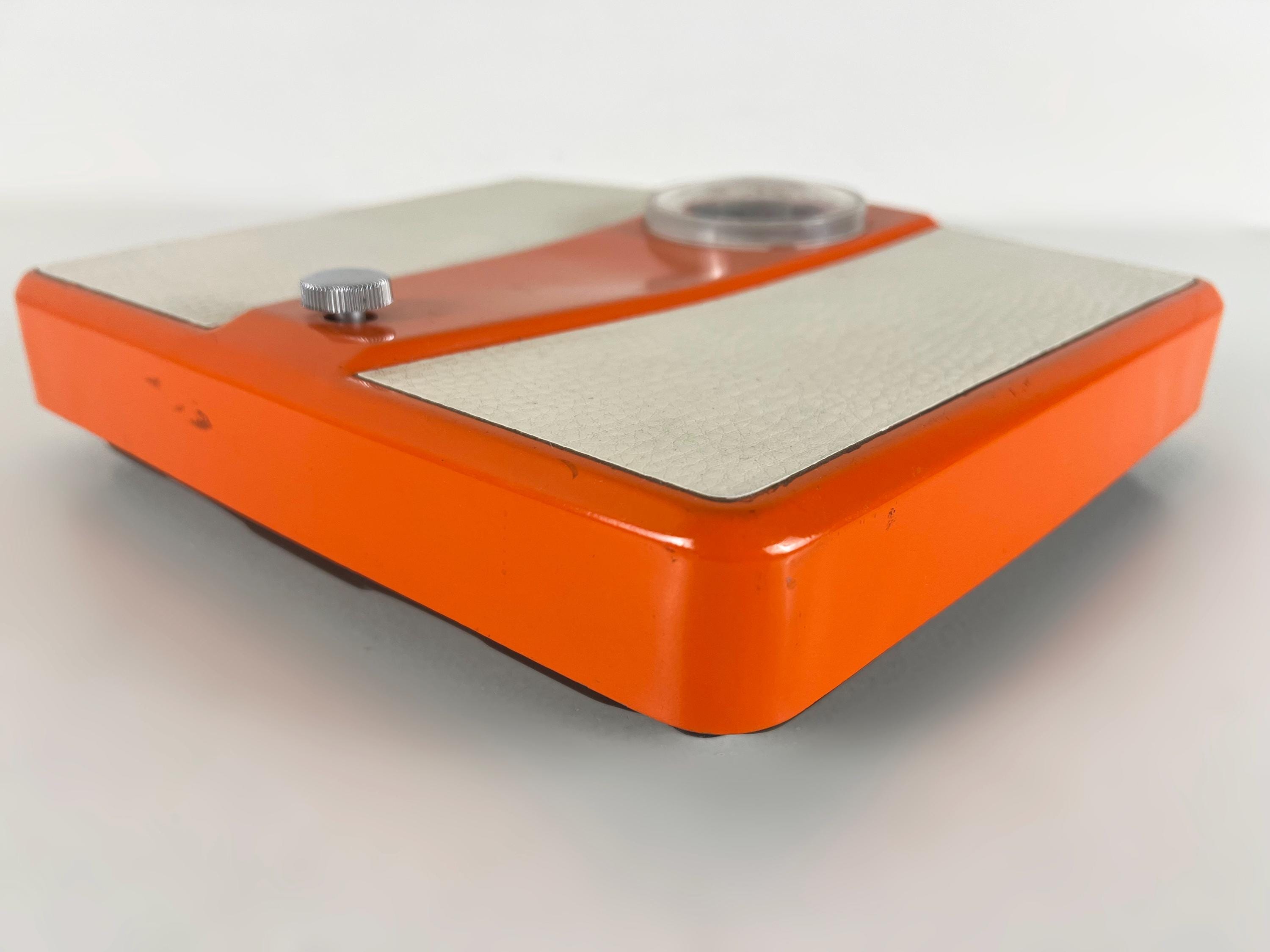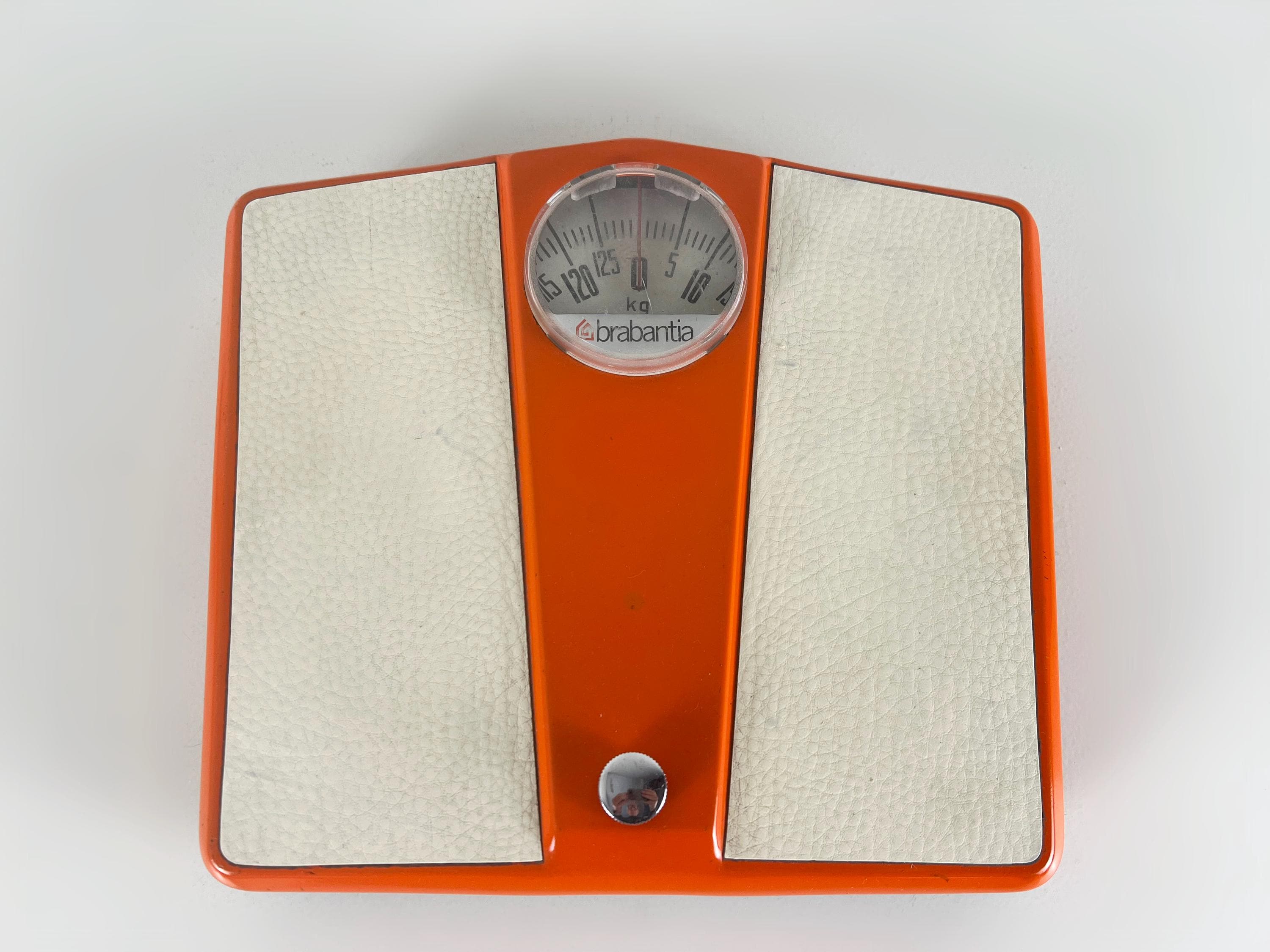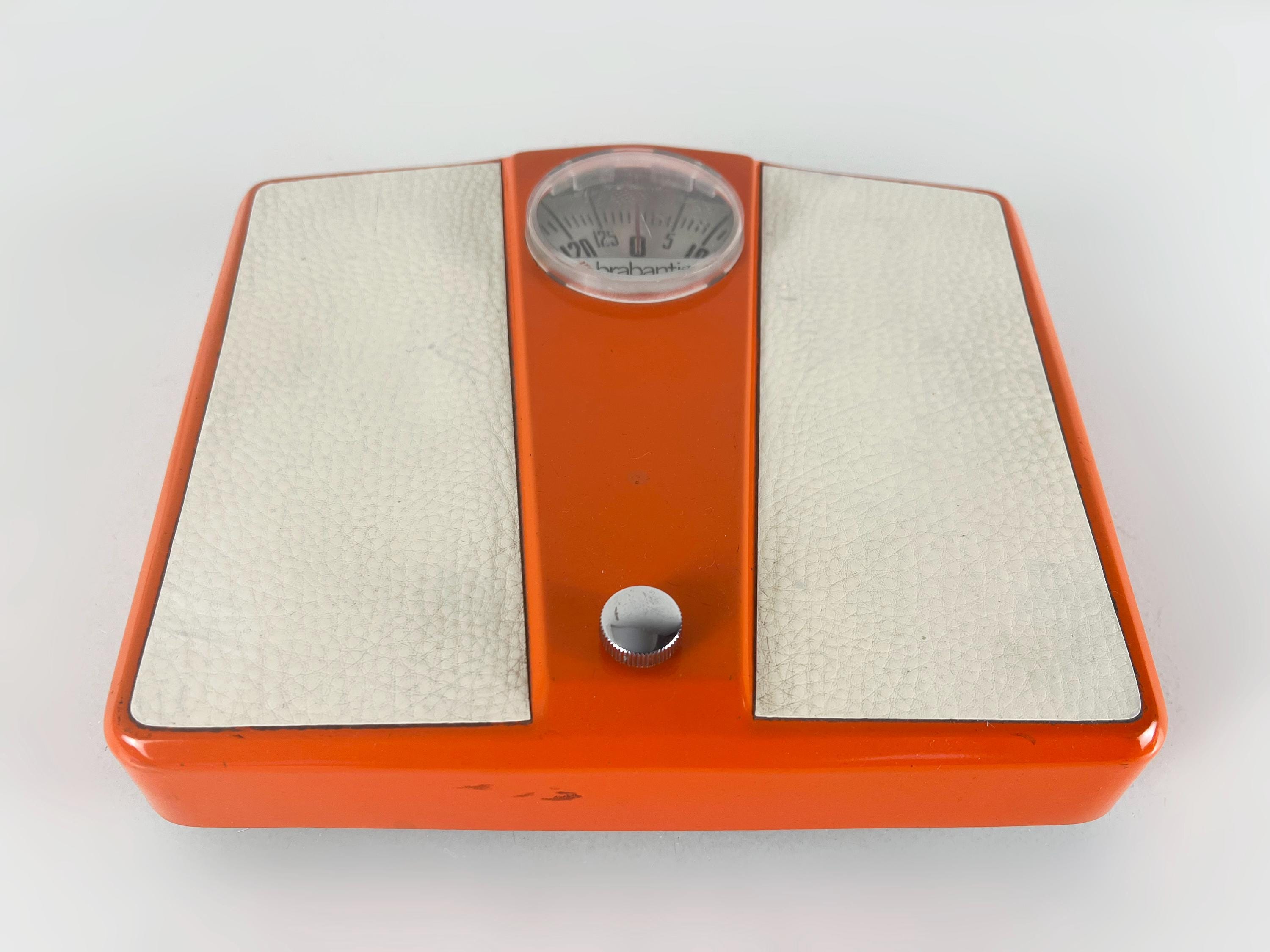 Mice mid century mechanical bathroom scale in orange metal with white vinyl inserts. This Dutch made retro item is quite sturdy and of course works just as well today as ever. It weighs kg (up to 130 kg ) and not lb.