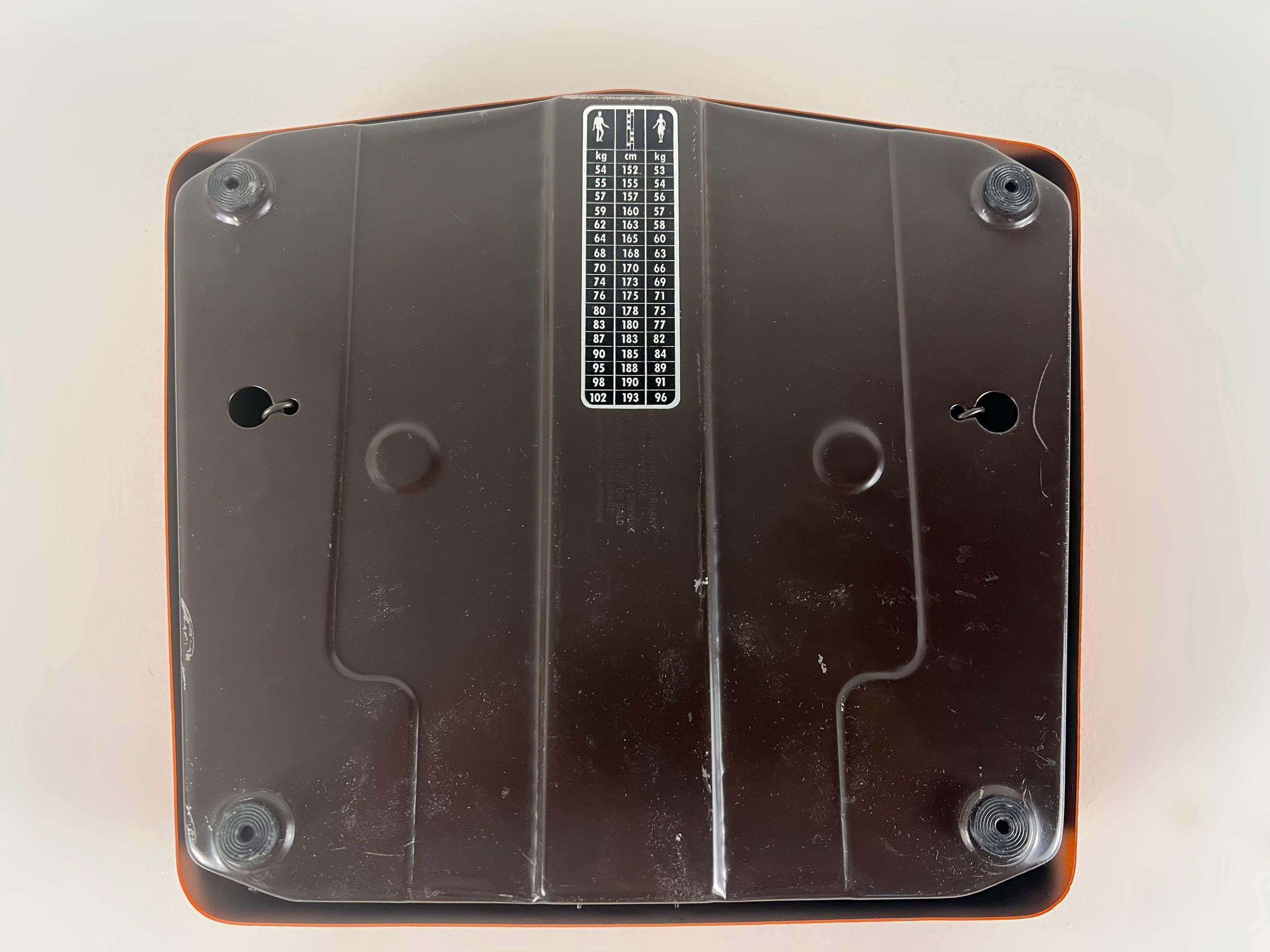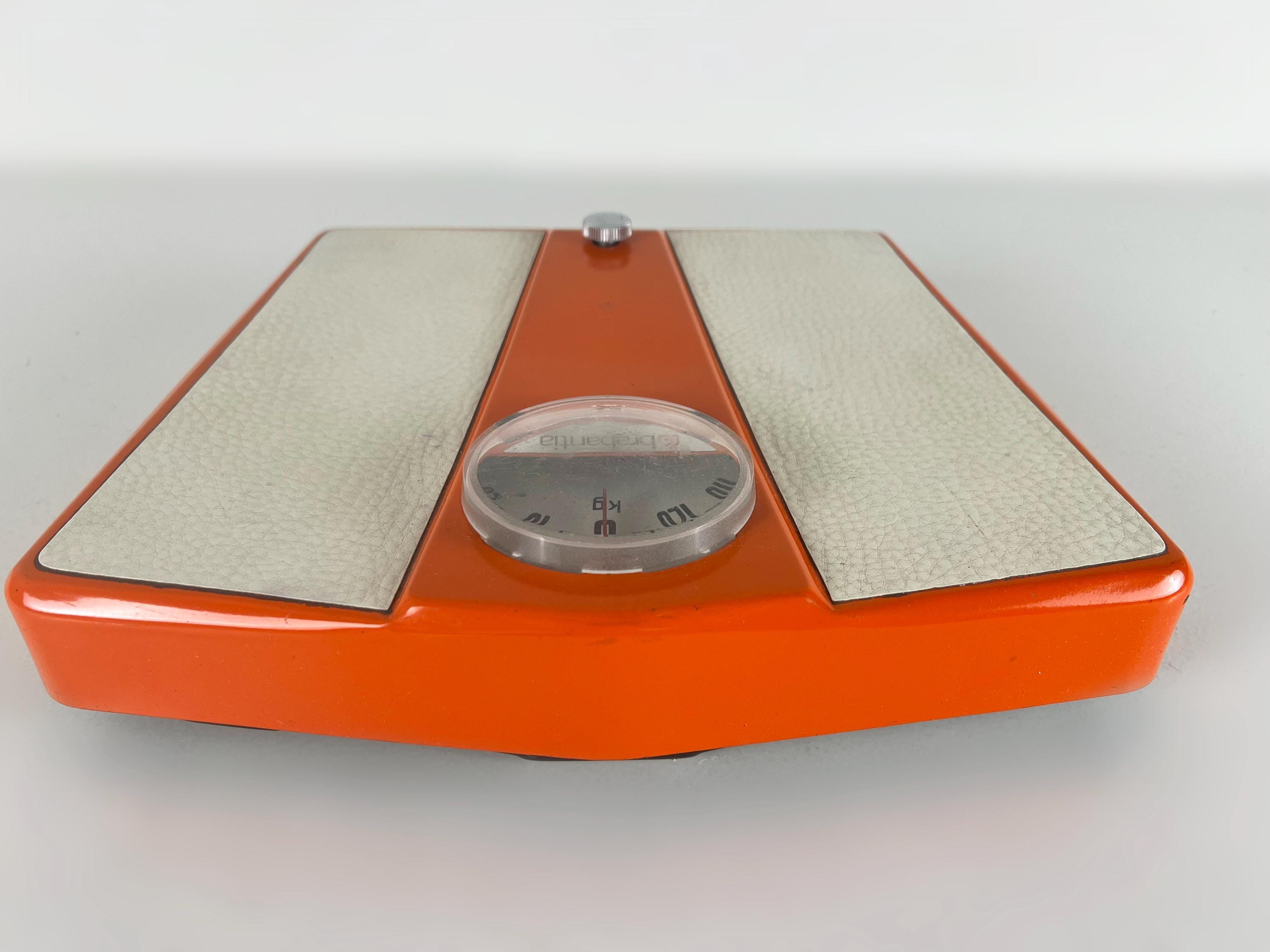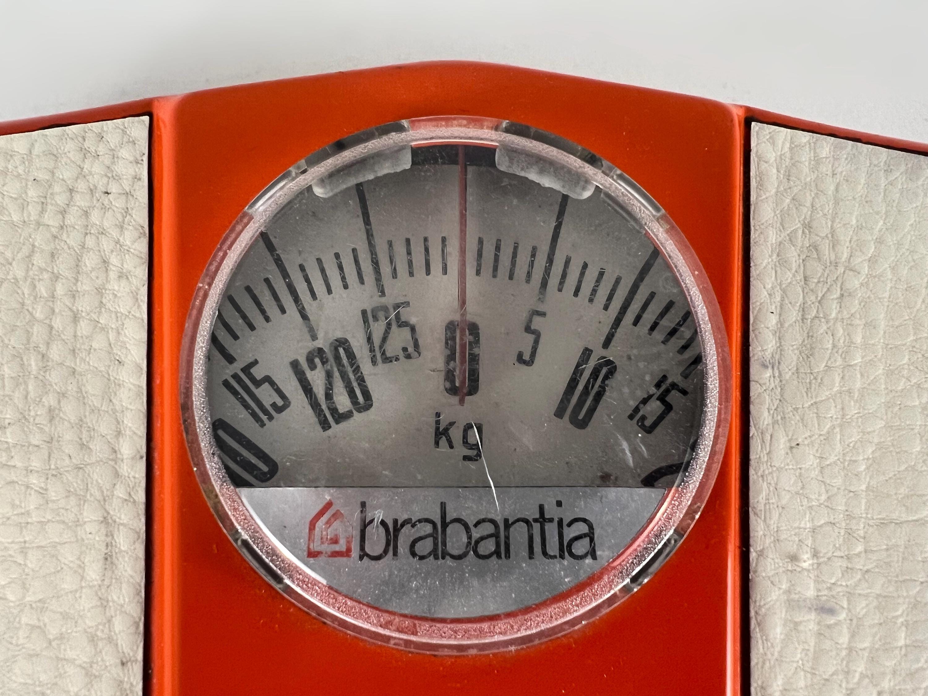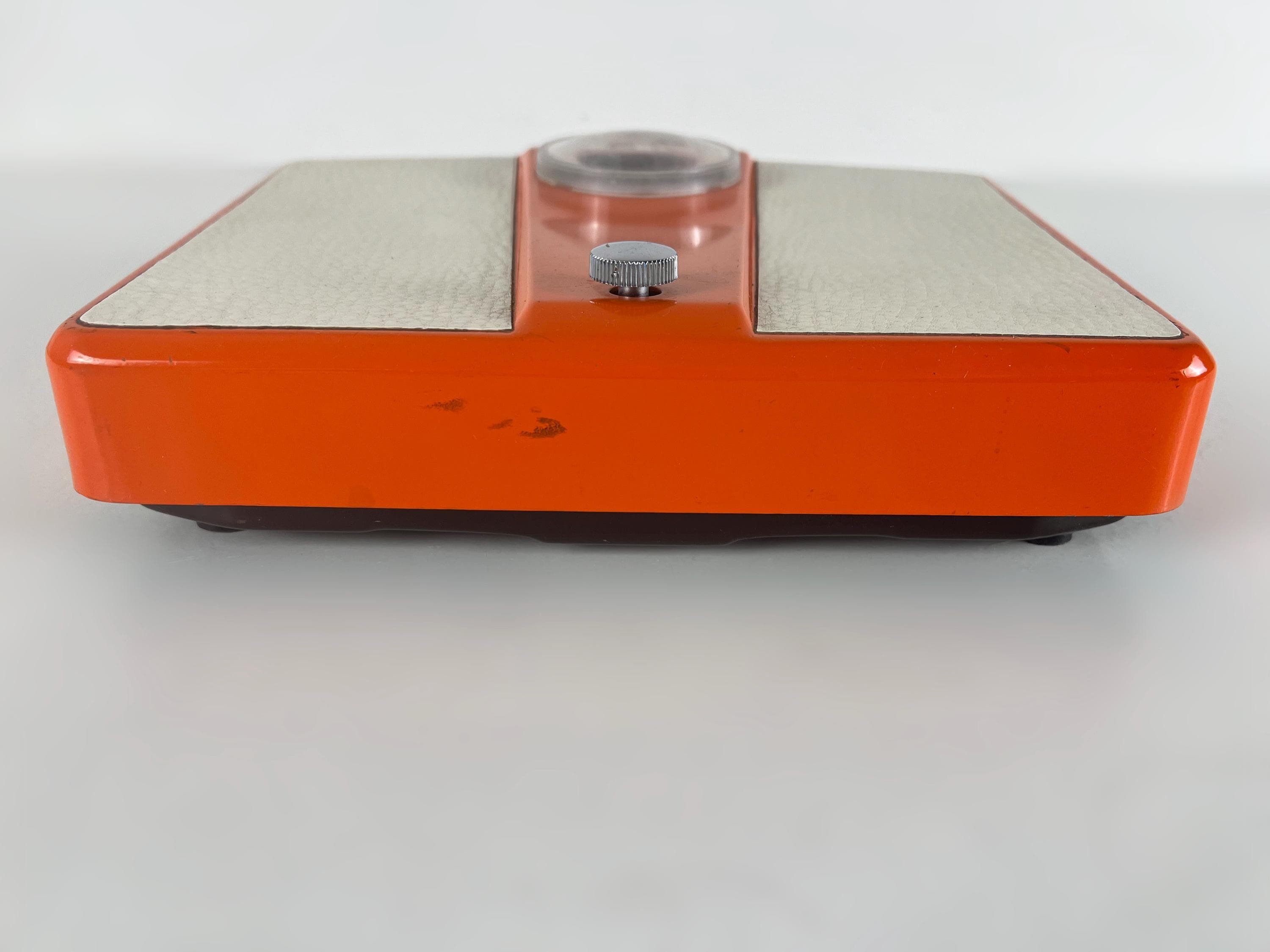Mice mid century mechanical bathroom scale in orange metal with white vinyl inserts. This Dutch made retro item is quite sturdy and of course works just as well today as ever. It weighs kg (up to 130 kg ) and not lb.