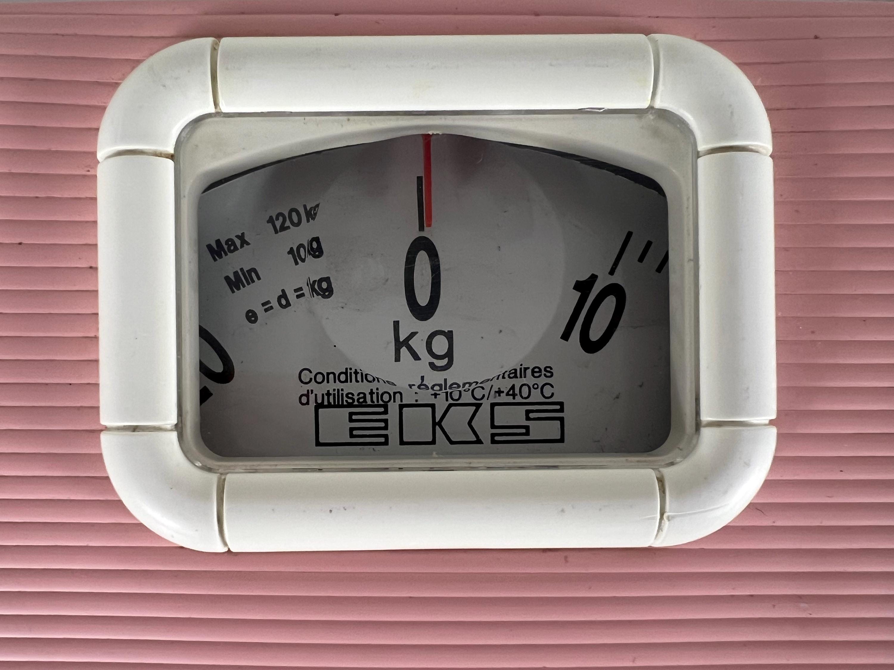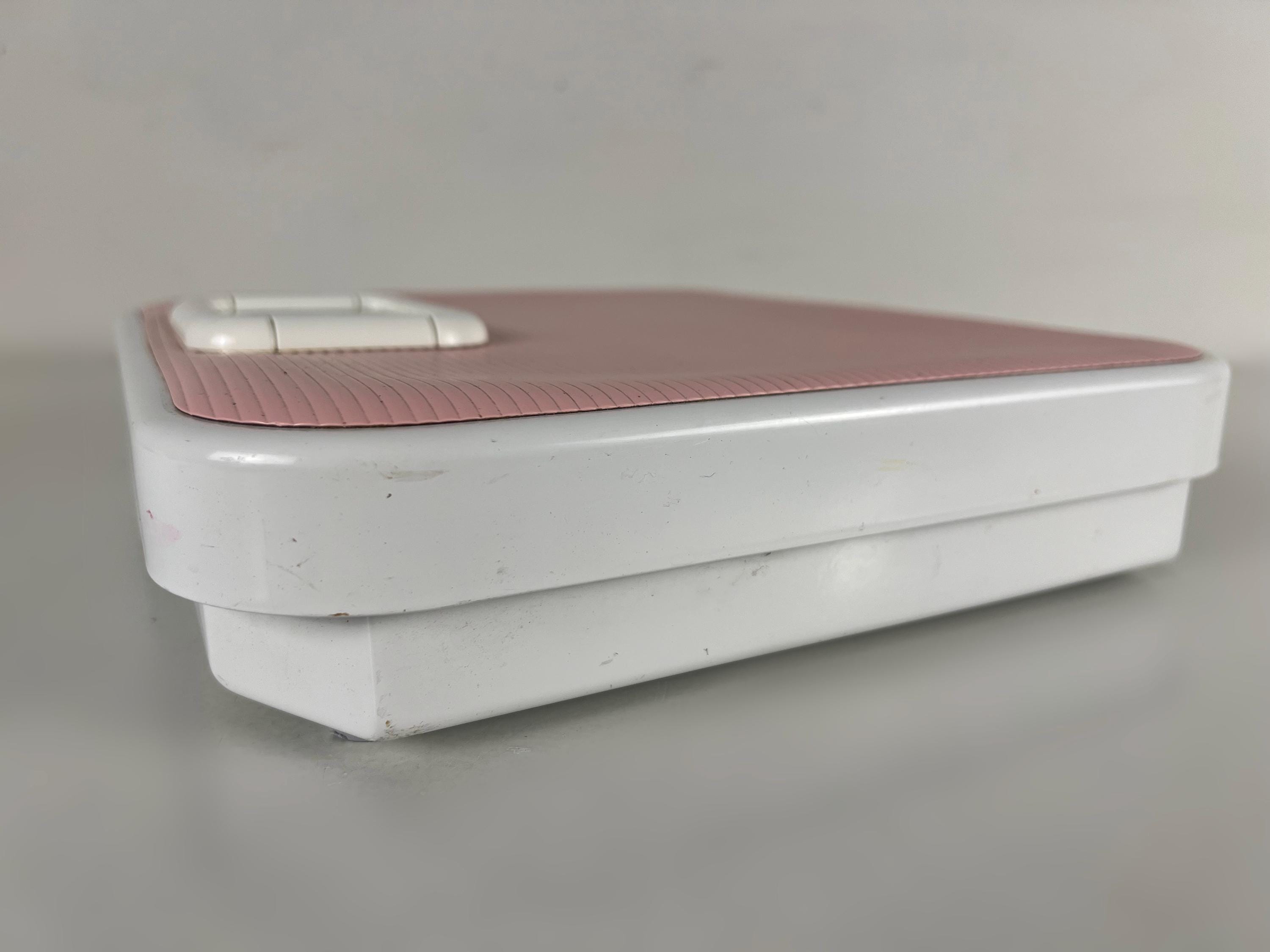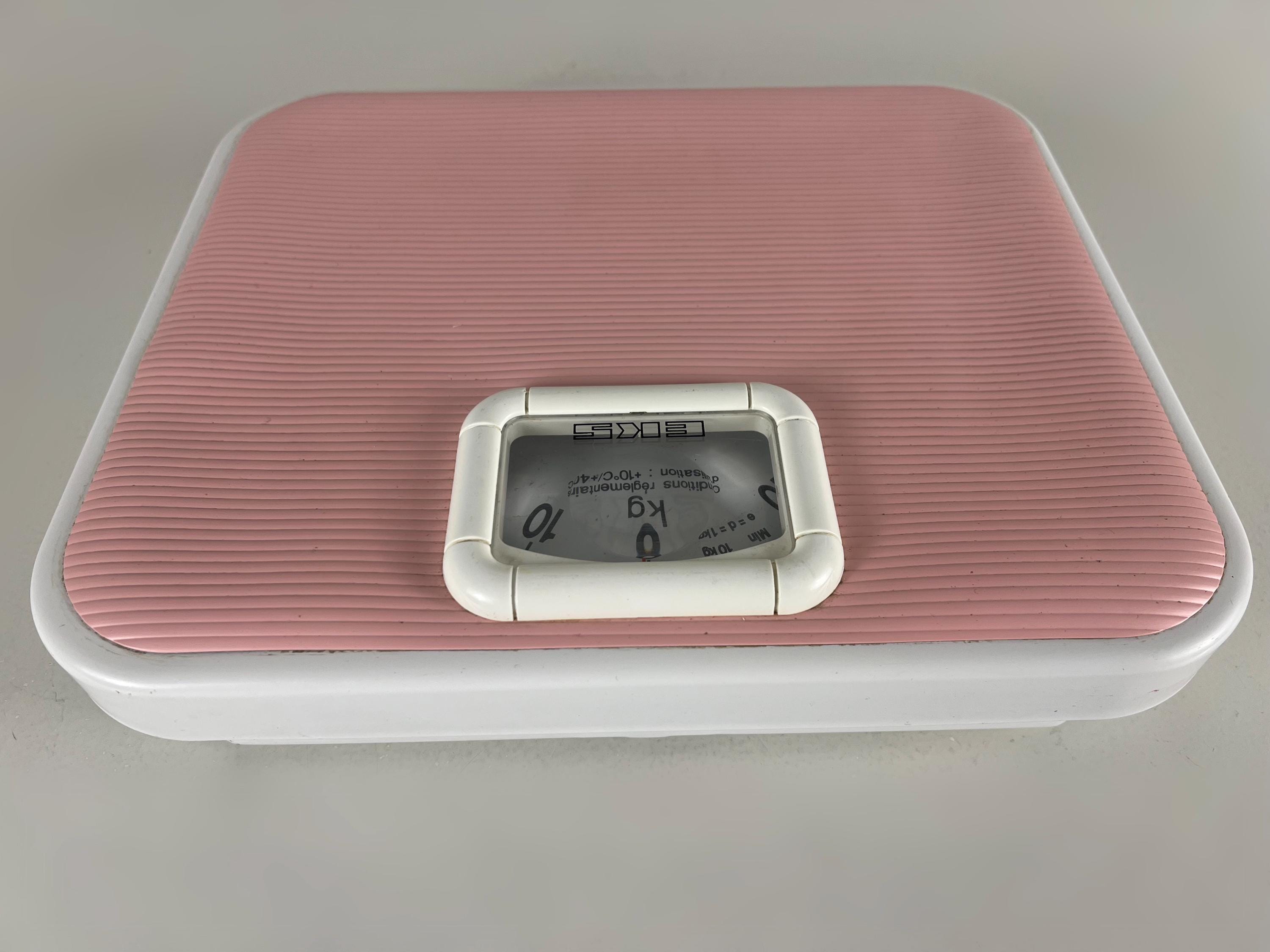 This metal mid century bathroom scale in pink and white is in good vintage condition This French made retro item is quite sturdy and of course works just as well today as ever. It weighs kg (up to 120 kg) and not lb.
