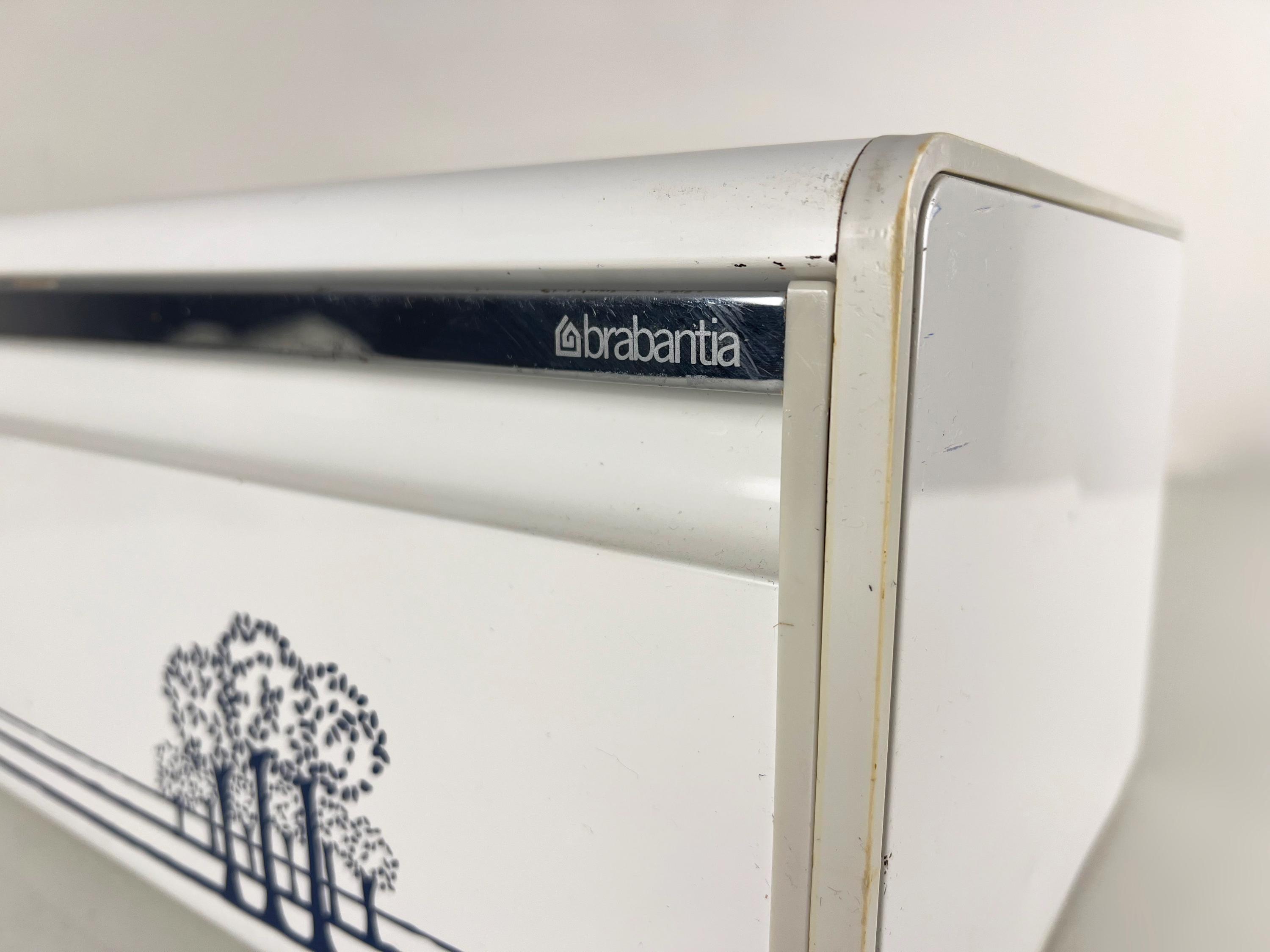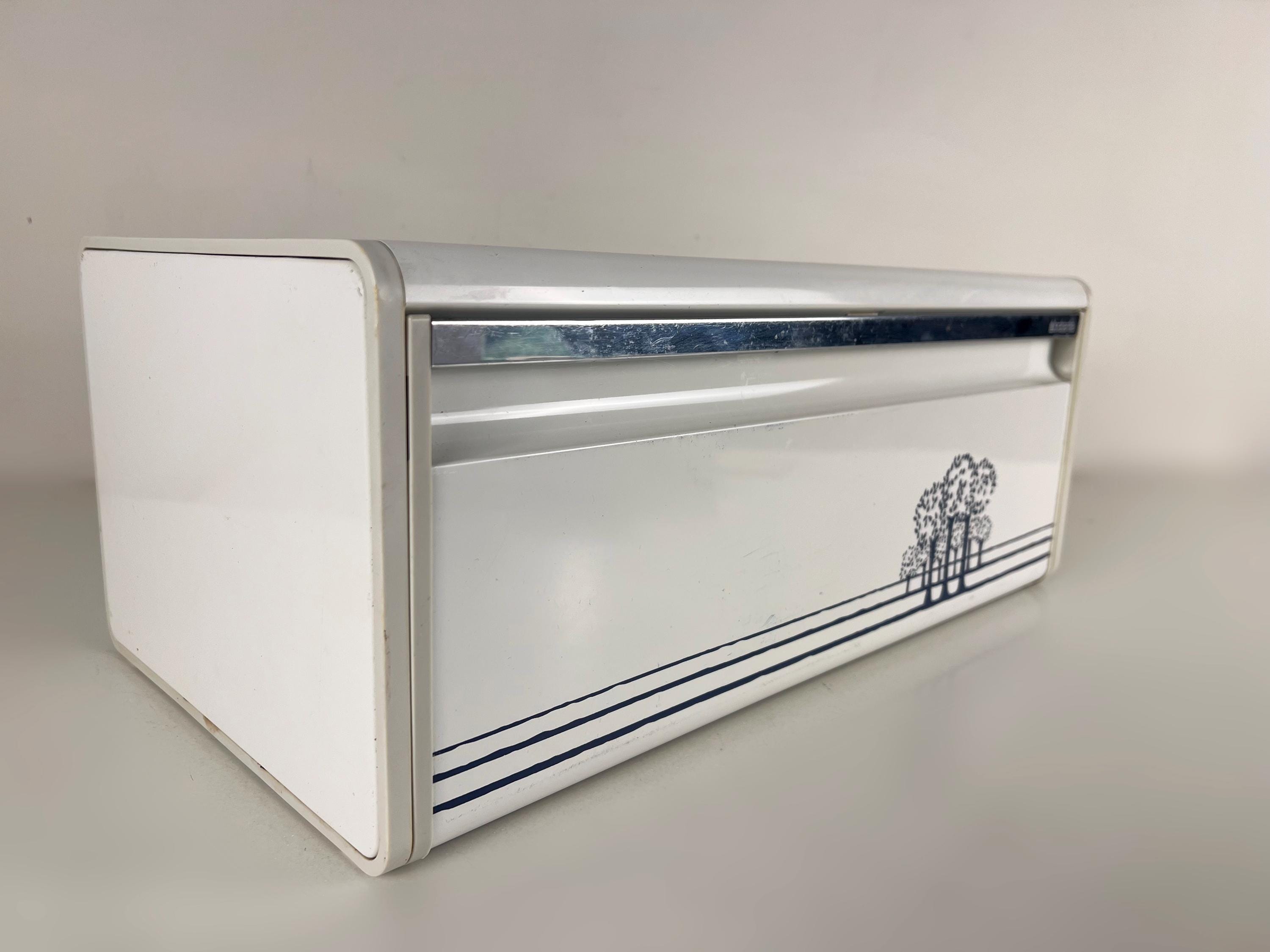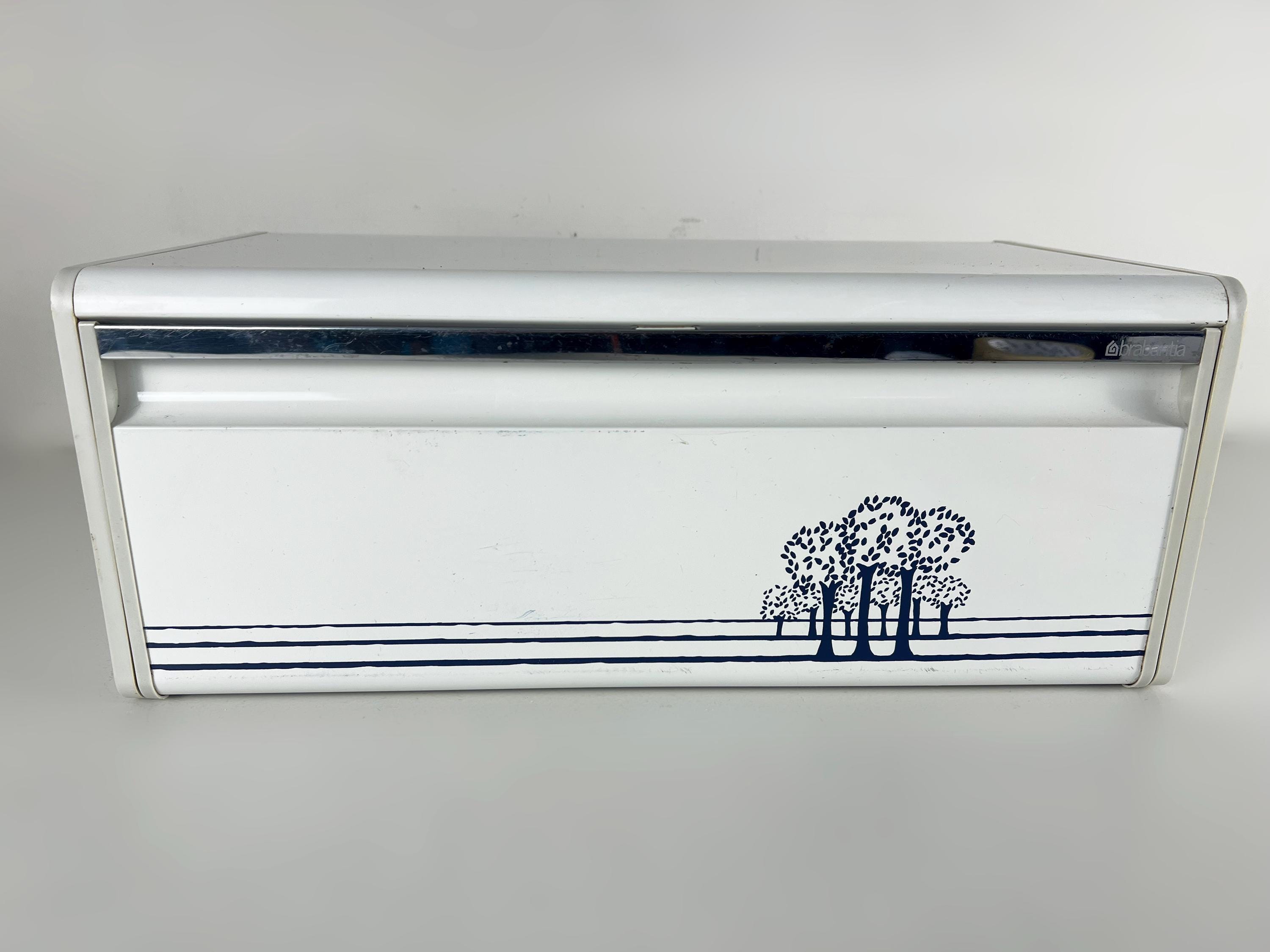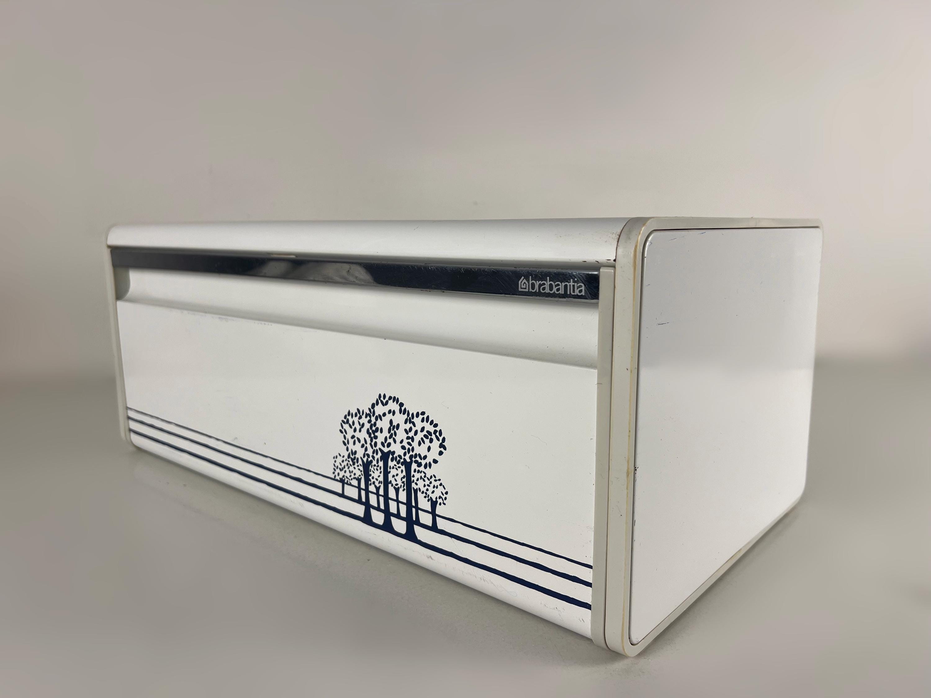 Brabantia bread box white metal bread box with a blue decor of trees, vintage mid century design 1980s