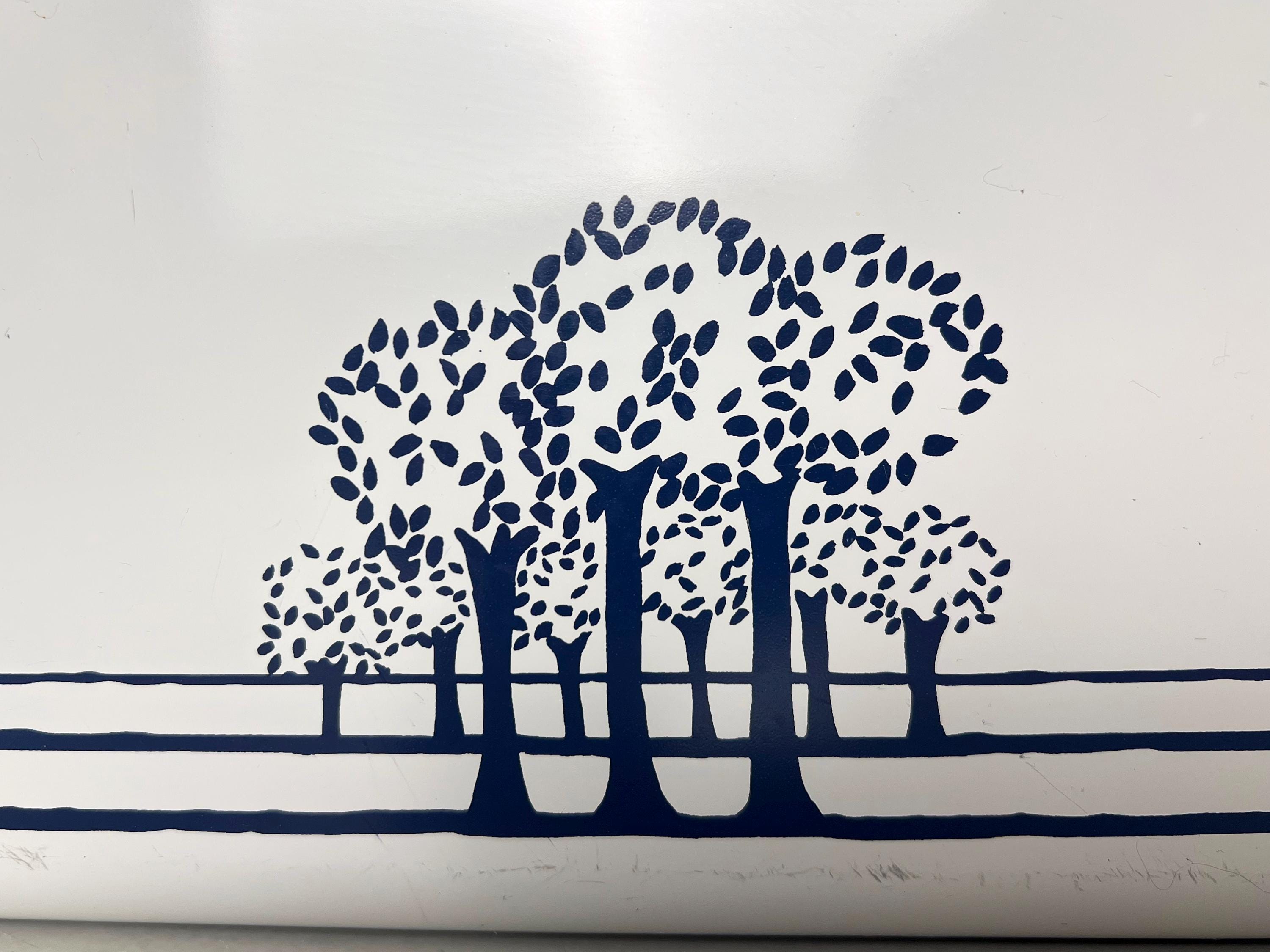 Sturdy metal Brabantia bread bin, bread box in white, nicely decorated with a decor of trees in blue. Holland 1980s