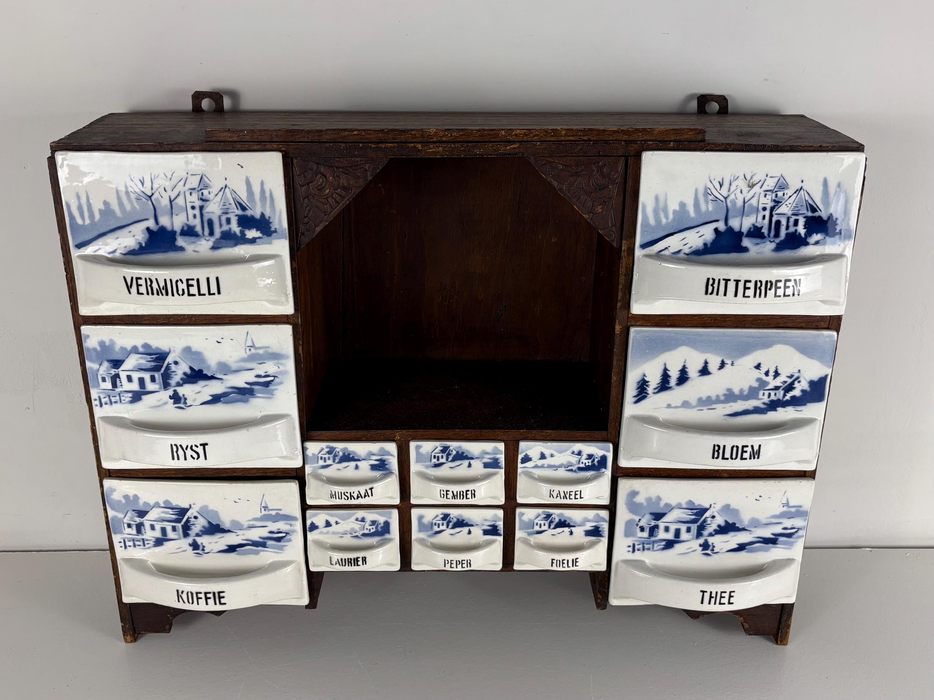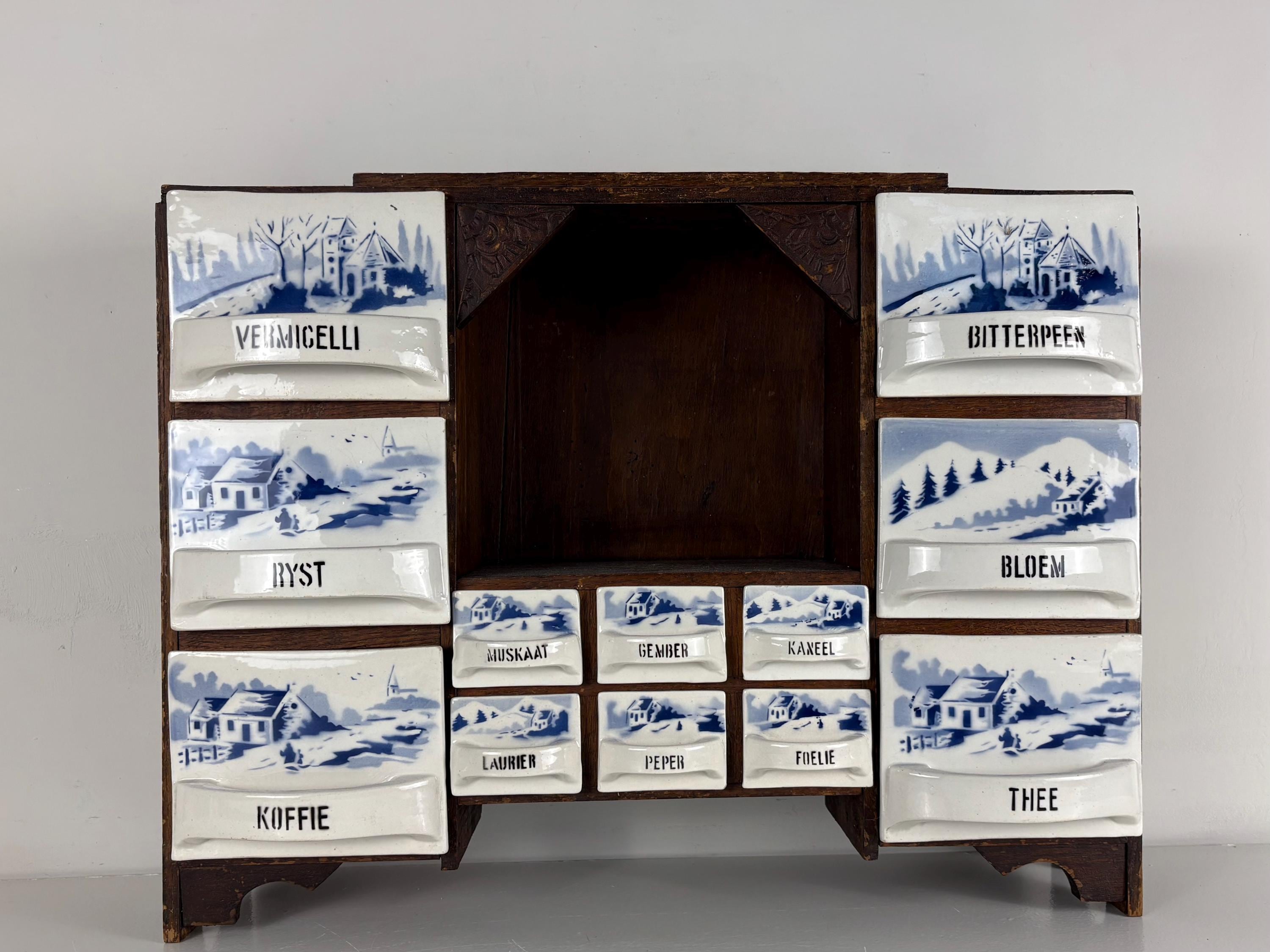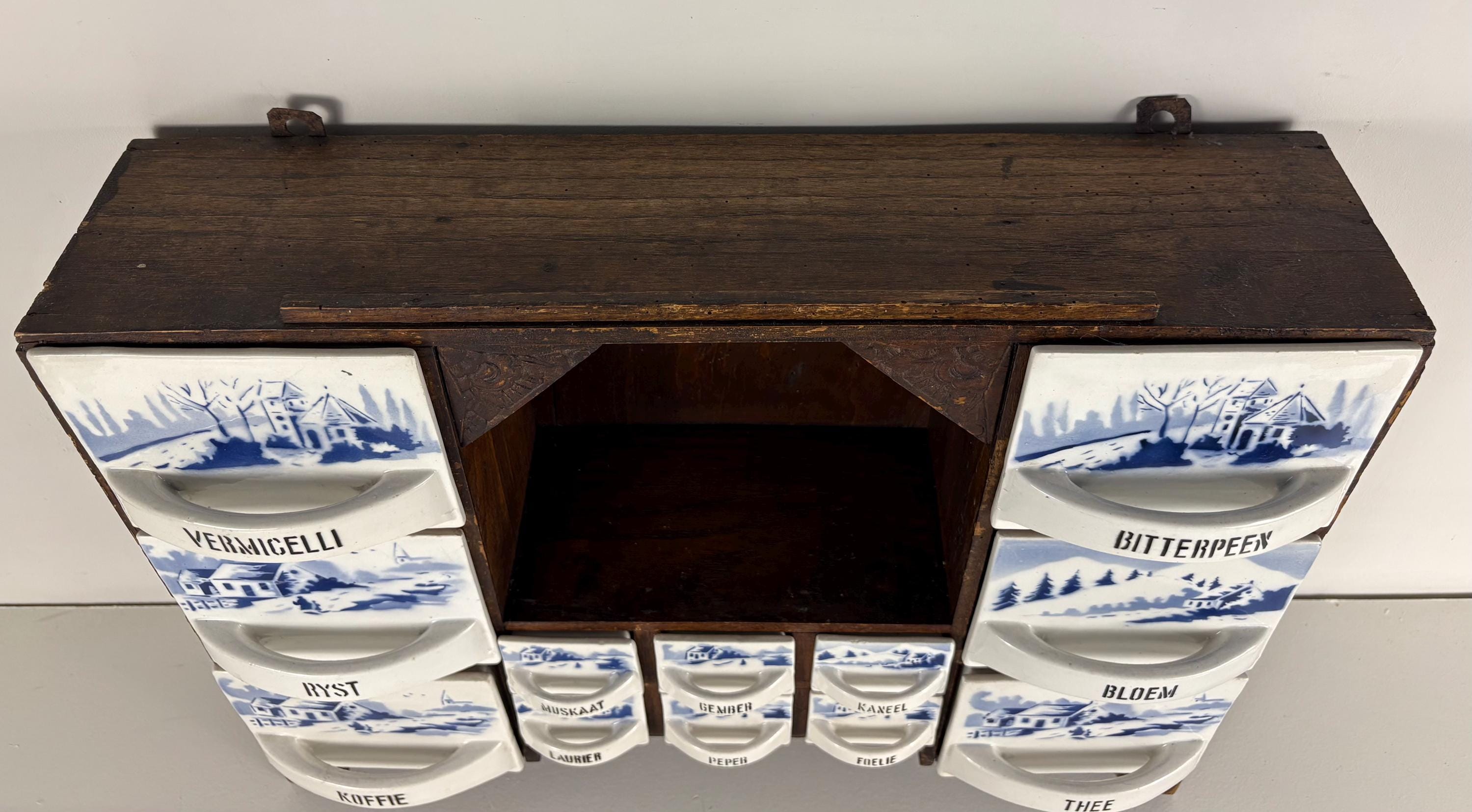 Beautiful old wooden spice rack cabinet. The spice cabinet has 12 porcelain drawers in white and blue, 6 larger and 6 smaller drawers. Beautiful vintage antique from Belgium from around the 1930s. It has the following names on the drawers: vermicelli, rice, coffee, bitter carrot, flower, tea, coffee, nutmeg, ginger, cinnamon, bay leaf, pepper and mace.