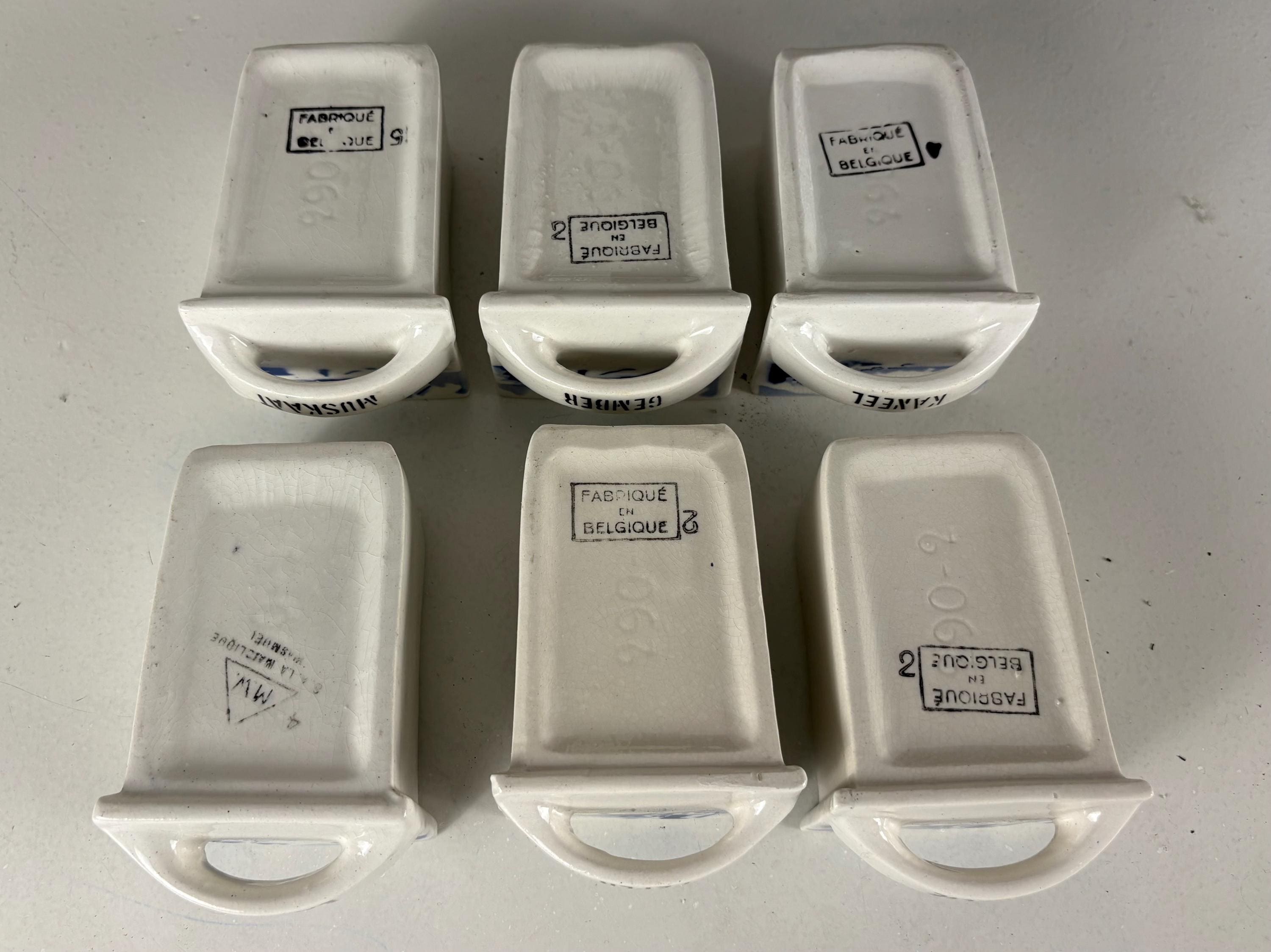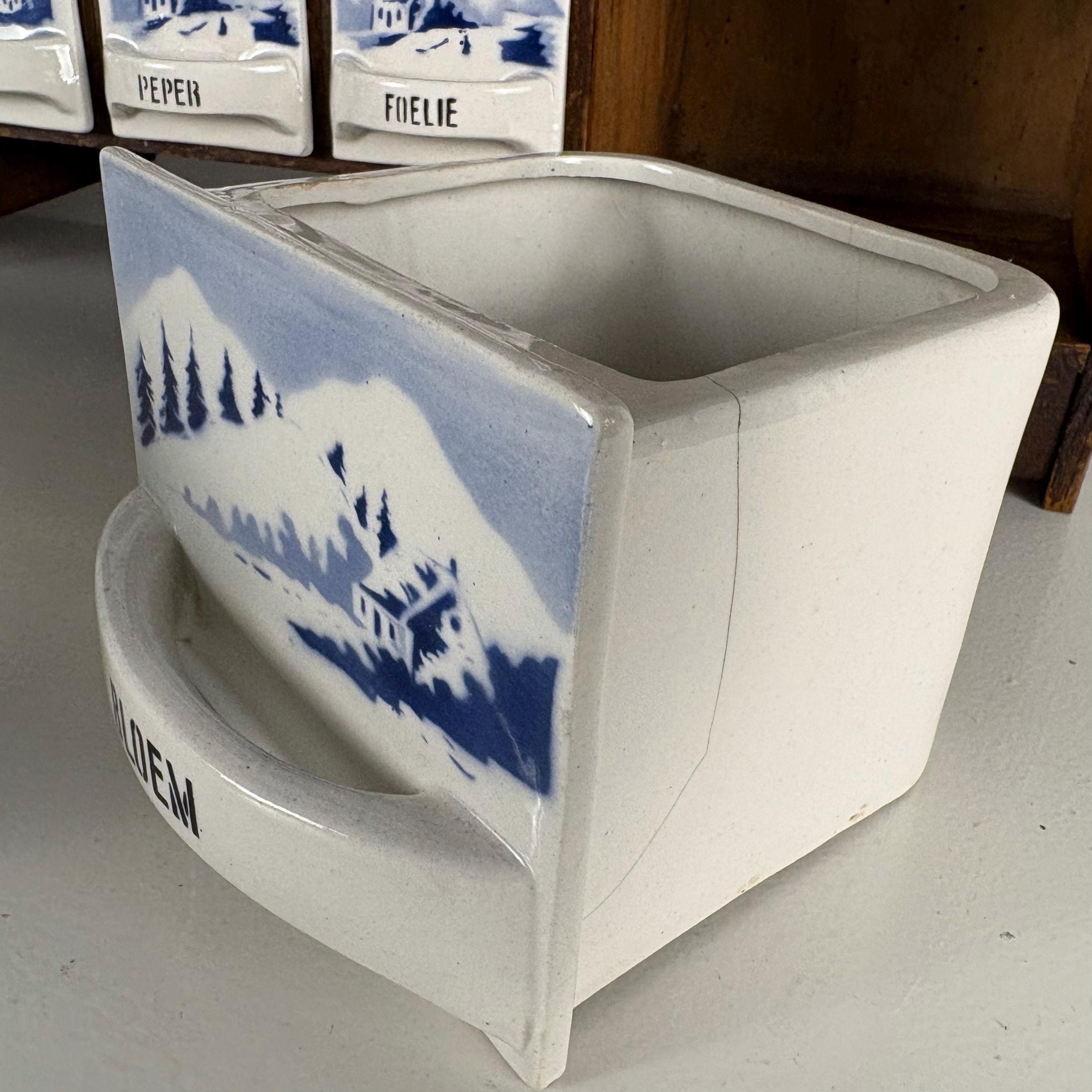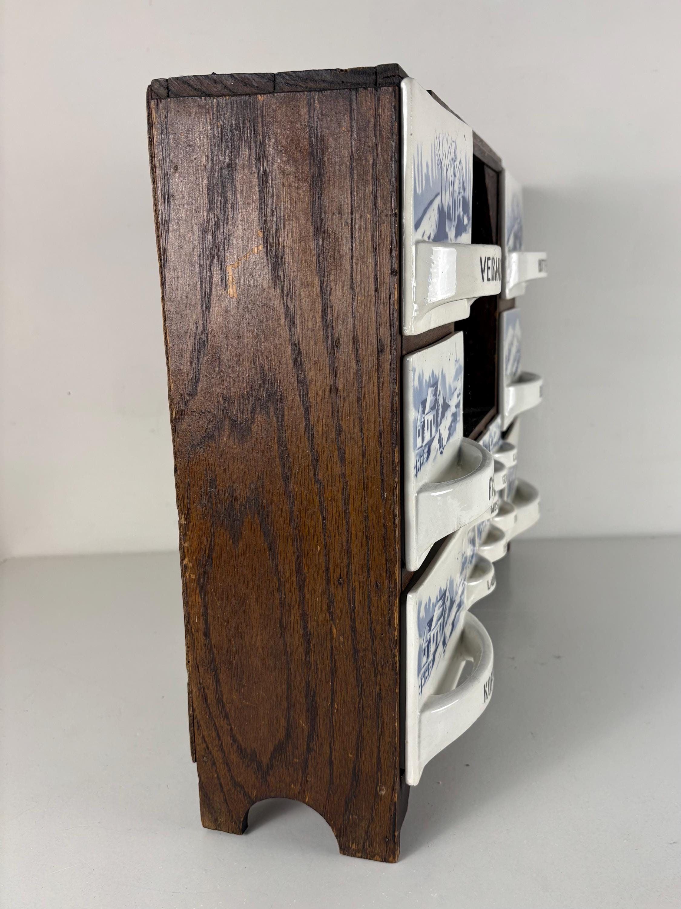 Beautiful old wooden spice rack cabinet. The spice cabinet has 12 porcelain drawers in white and blue, 6 larger and 6 smaller drawers. Beautiful vintage antique from Belgium from around the 1930s. It has the following names on the drawers: vermicelli, rice, coffee, bitter carrot, flower, tea, coffee, nutmeg, ginger, cinnamon, bay leaf, pepper and mace.