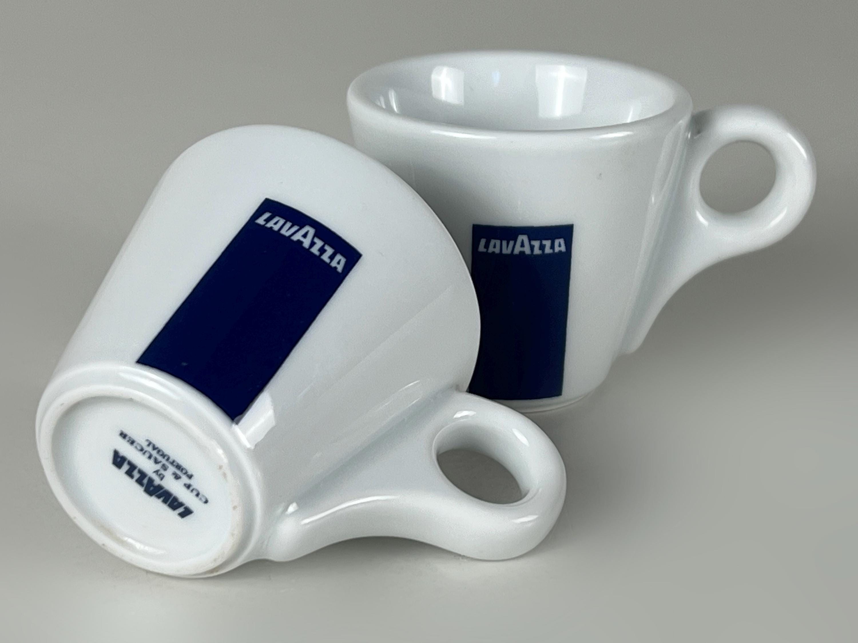 We offer a set of 2 hard porcelain bar quality espresso cups, decorated with Lavazza logo in blue. Produced by Cup & Saucer Portugal 2000s