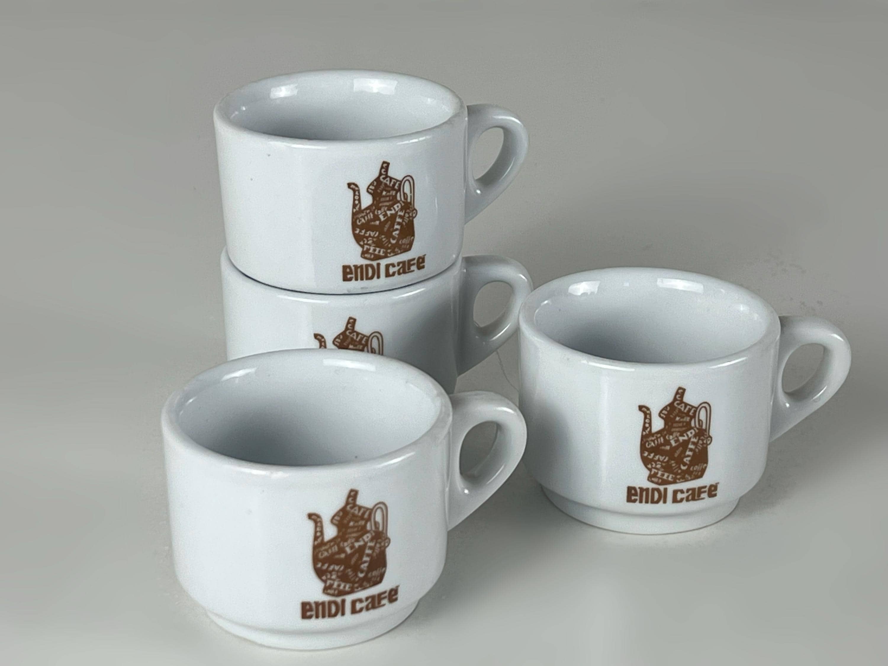 Set of 4 vintage Richard Ginori, bar quality espresso cups advertising Endi Caffe, manufactured in Italy 1980s