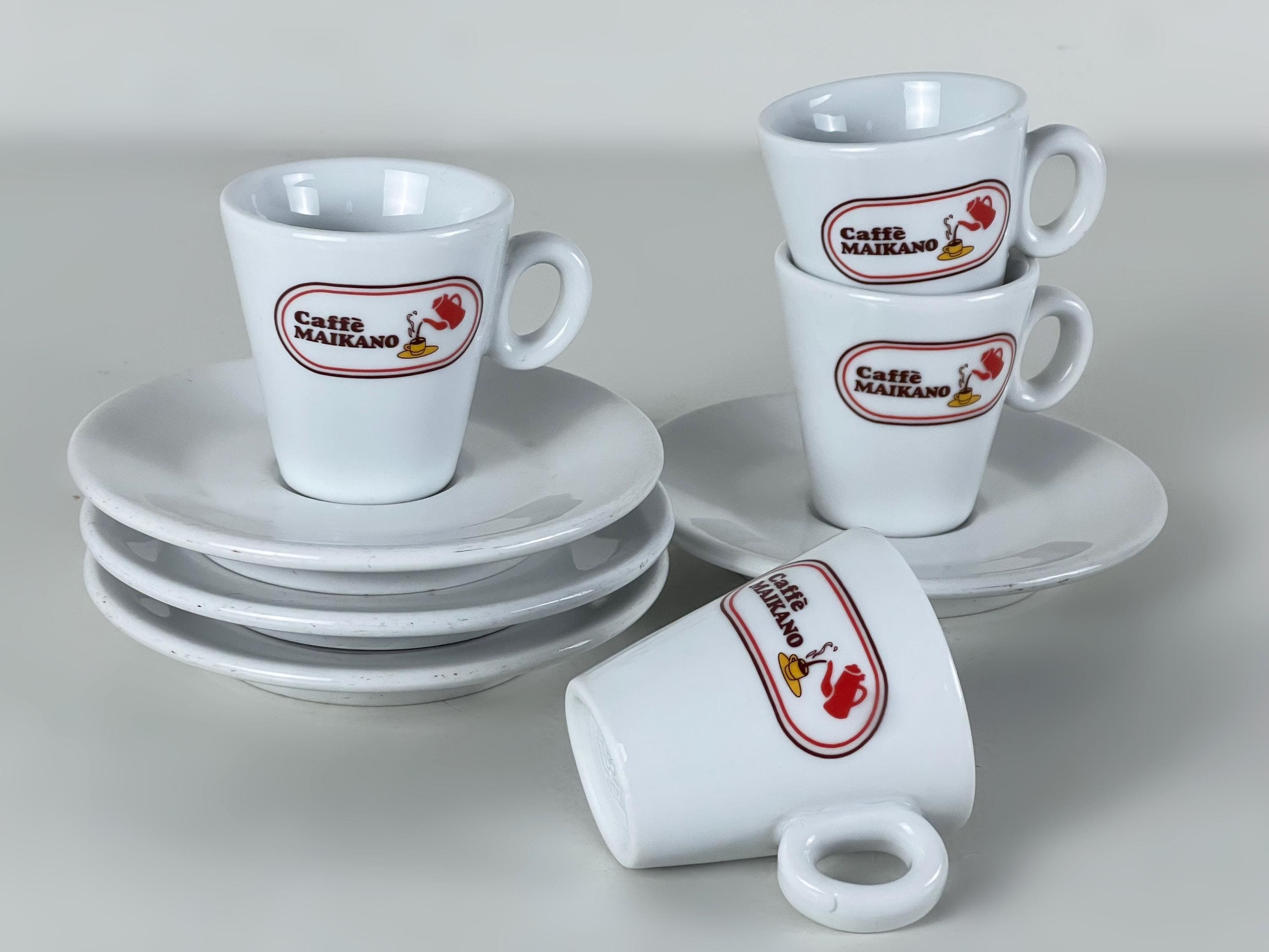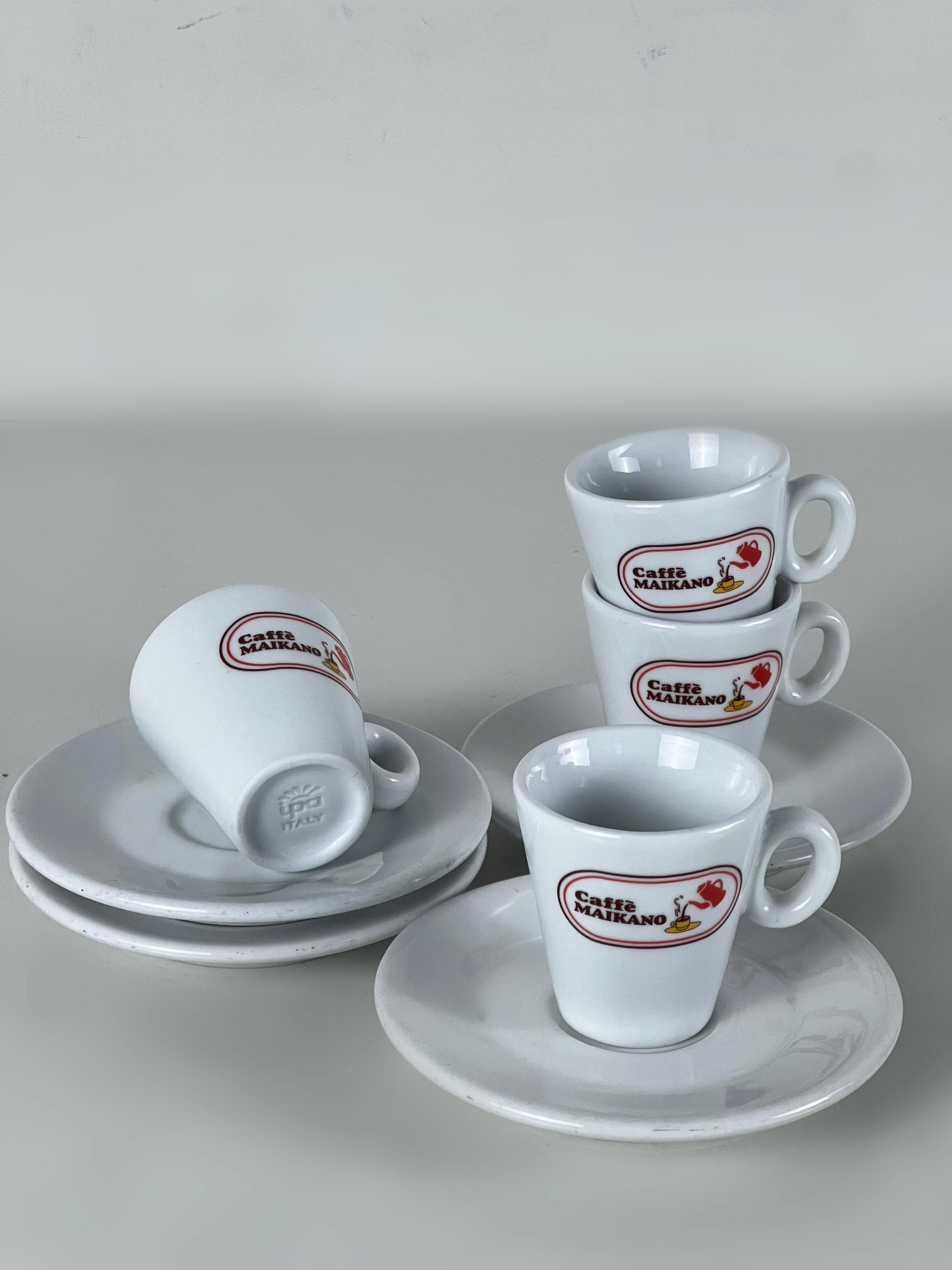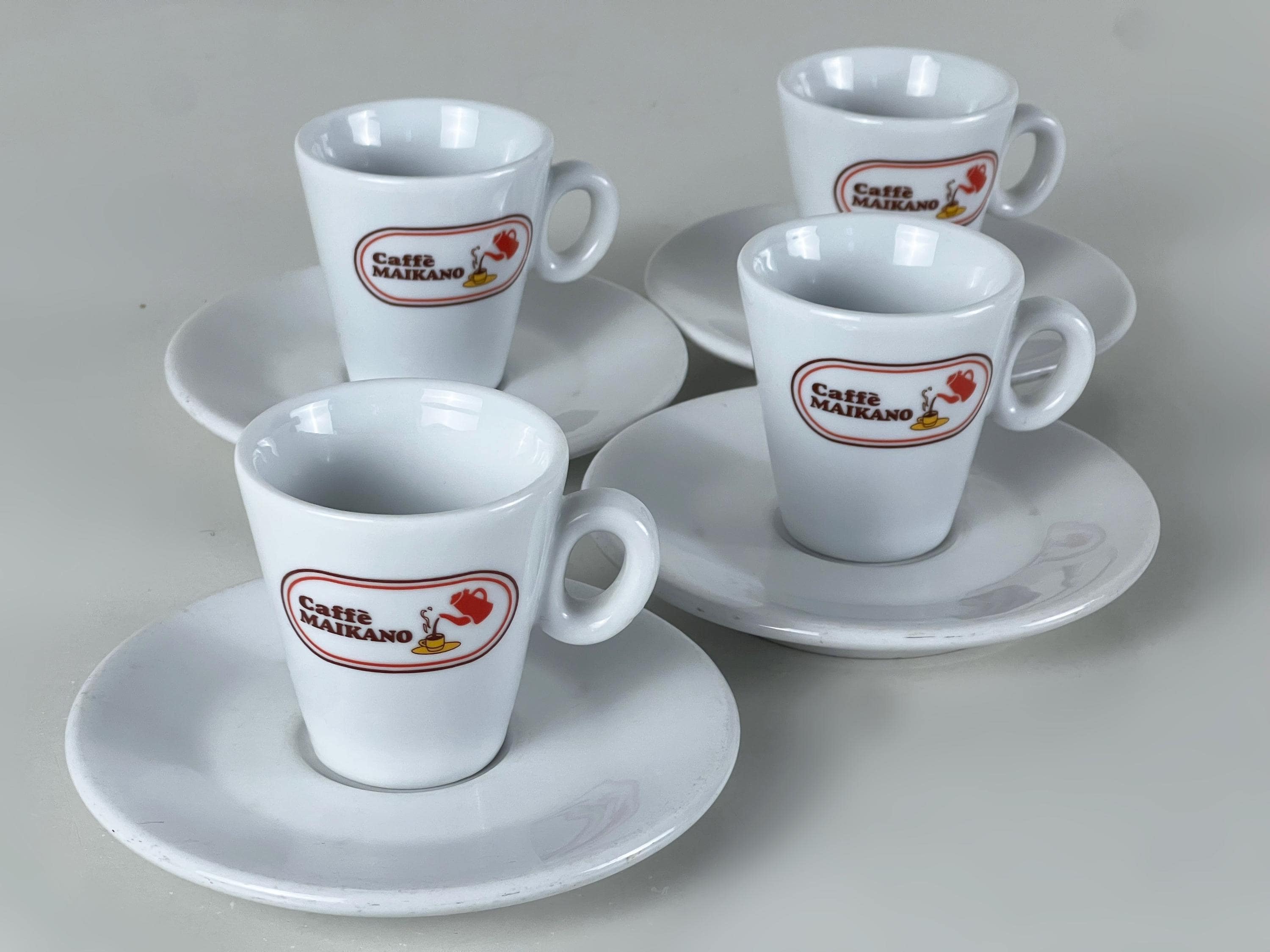 We offer a set of 4 coffee bar quality porcelain espresso cups, decorated with the Caffè Maikano logo complete with matching saucers. Manufactured by IPA, Italy 2000s