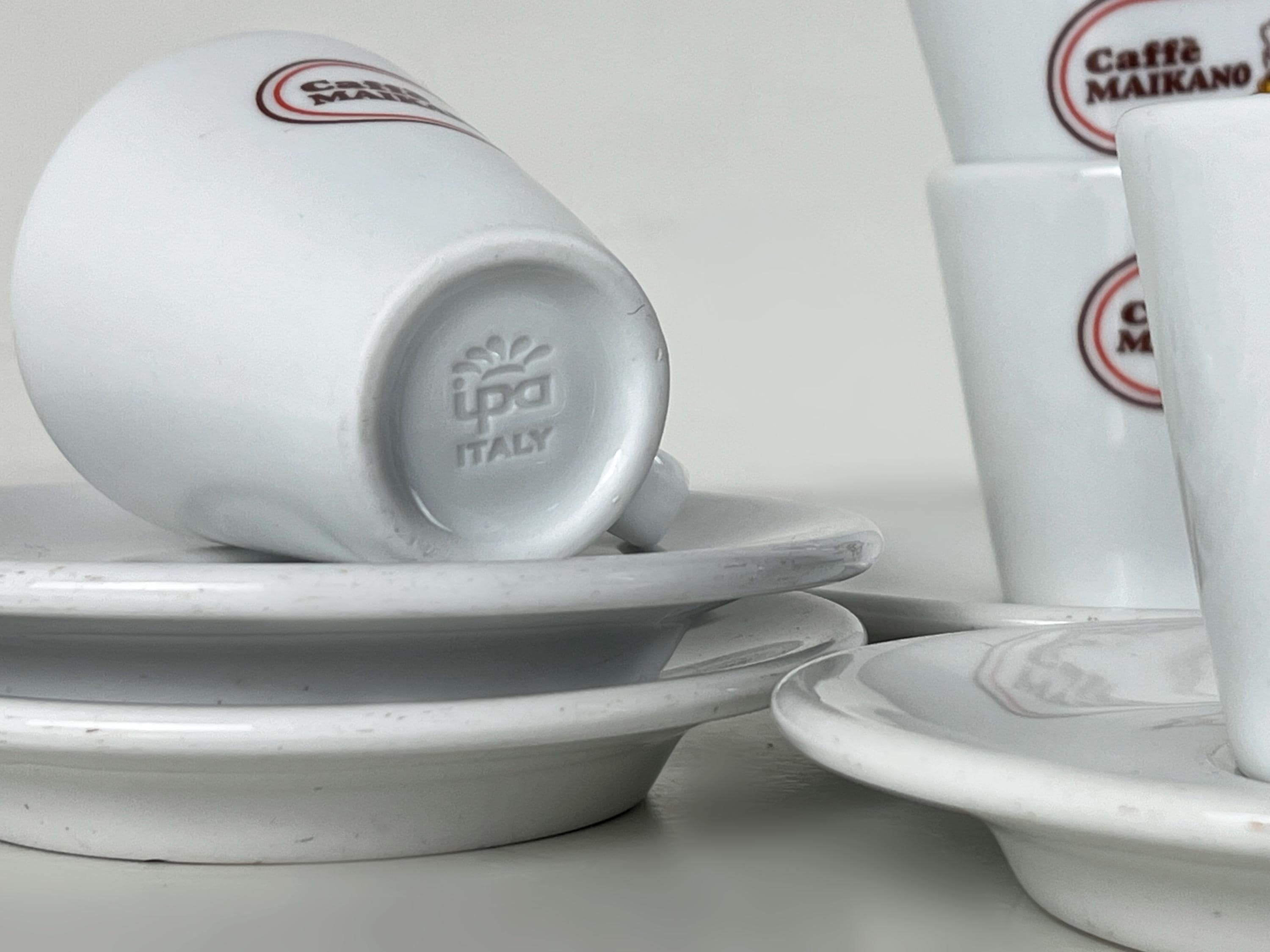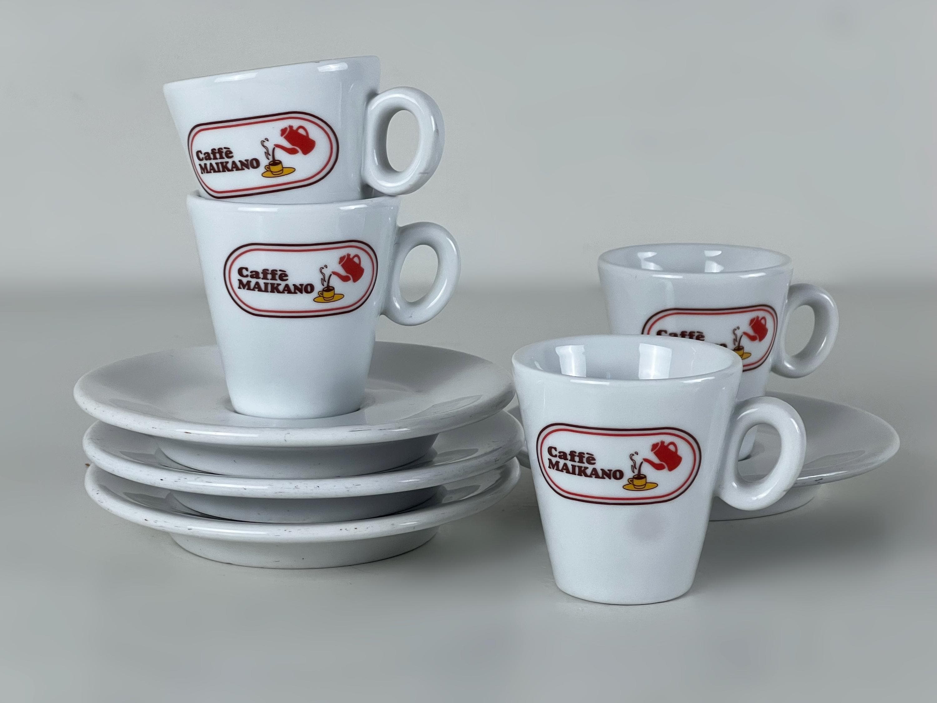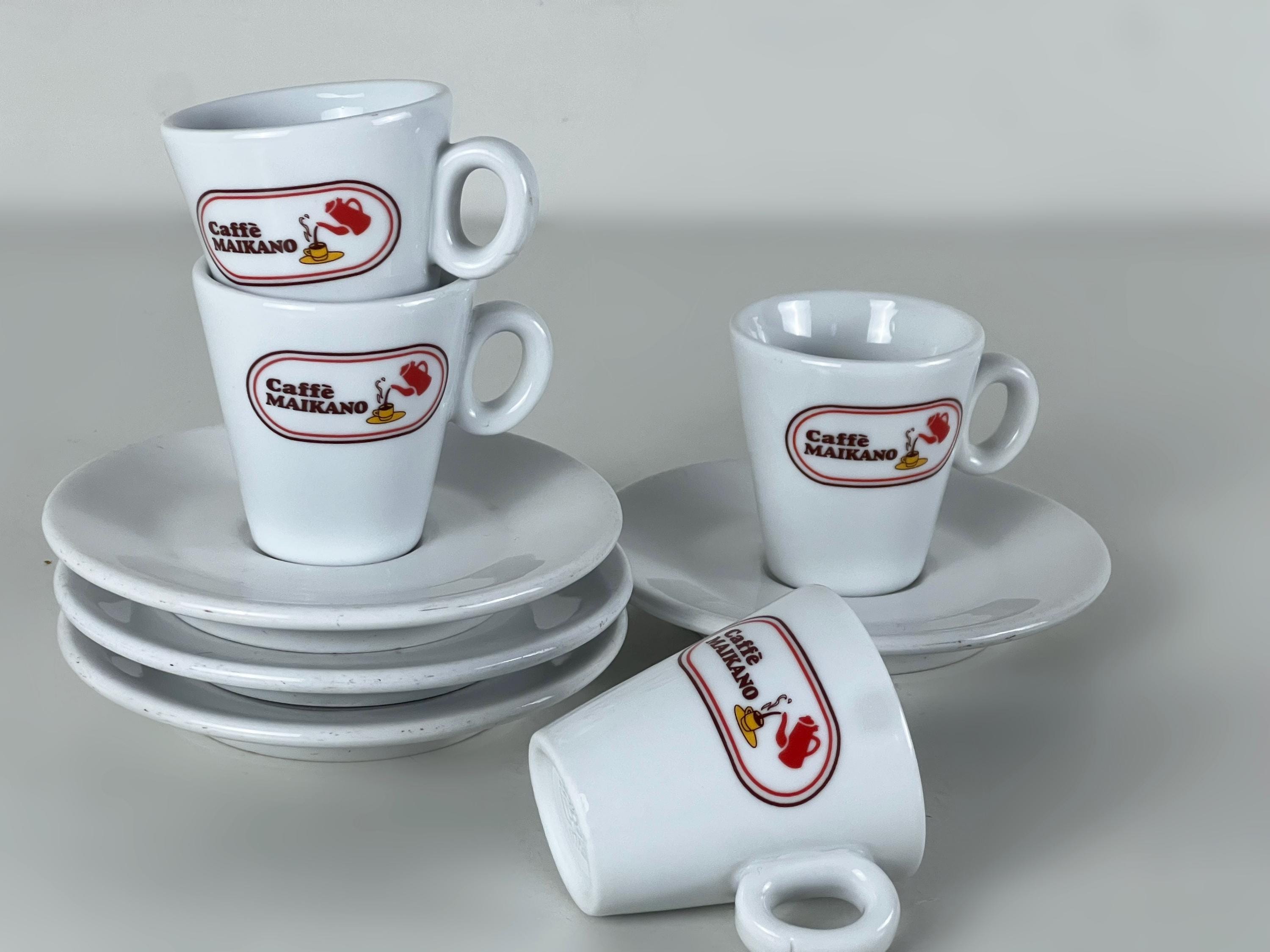 We offer a set of 4 coffee bar quality porcelain espresso cups, decorated with the Caffè Maikano logo complete with matching saucers. Manufactured by IPA, Italy 2000s