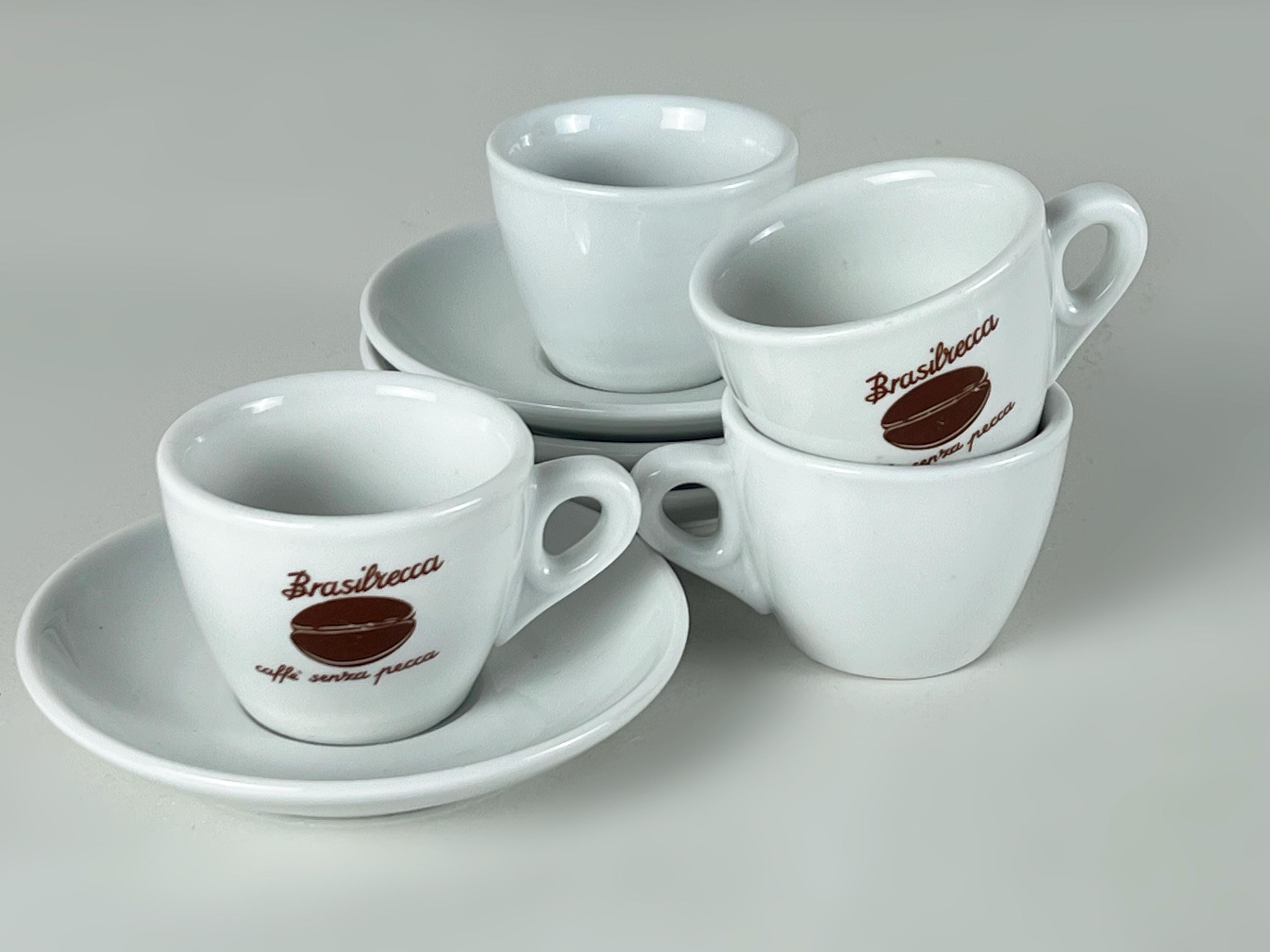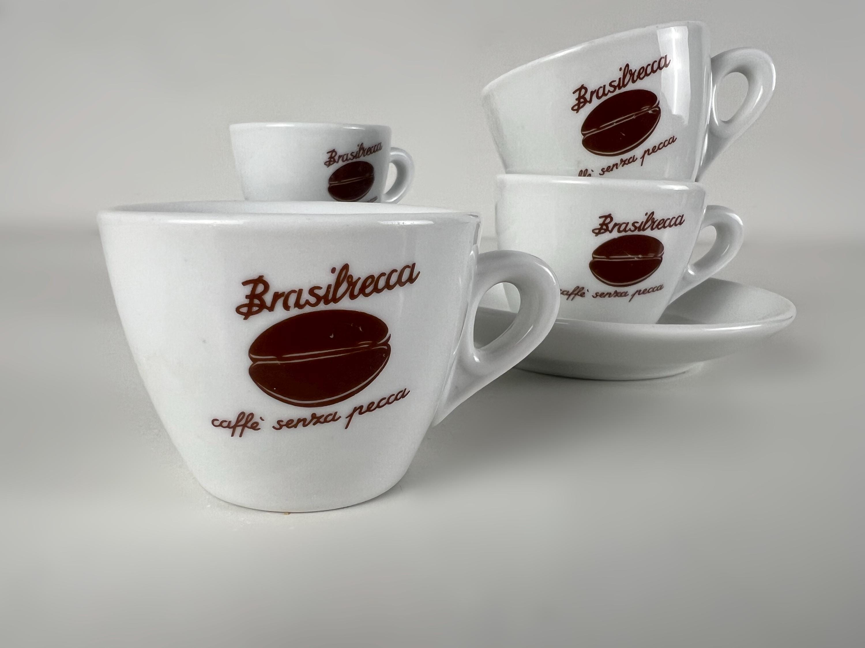The cups come with their matching saucers, and carry the Brasilrecca logo and the text caffè senza pecca