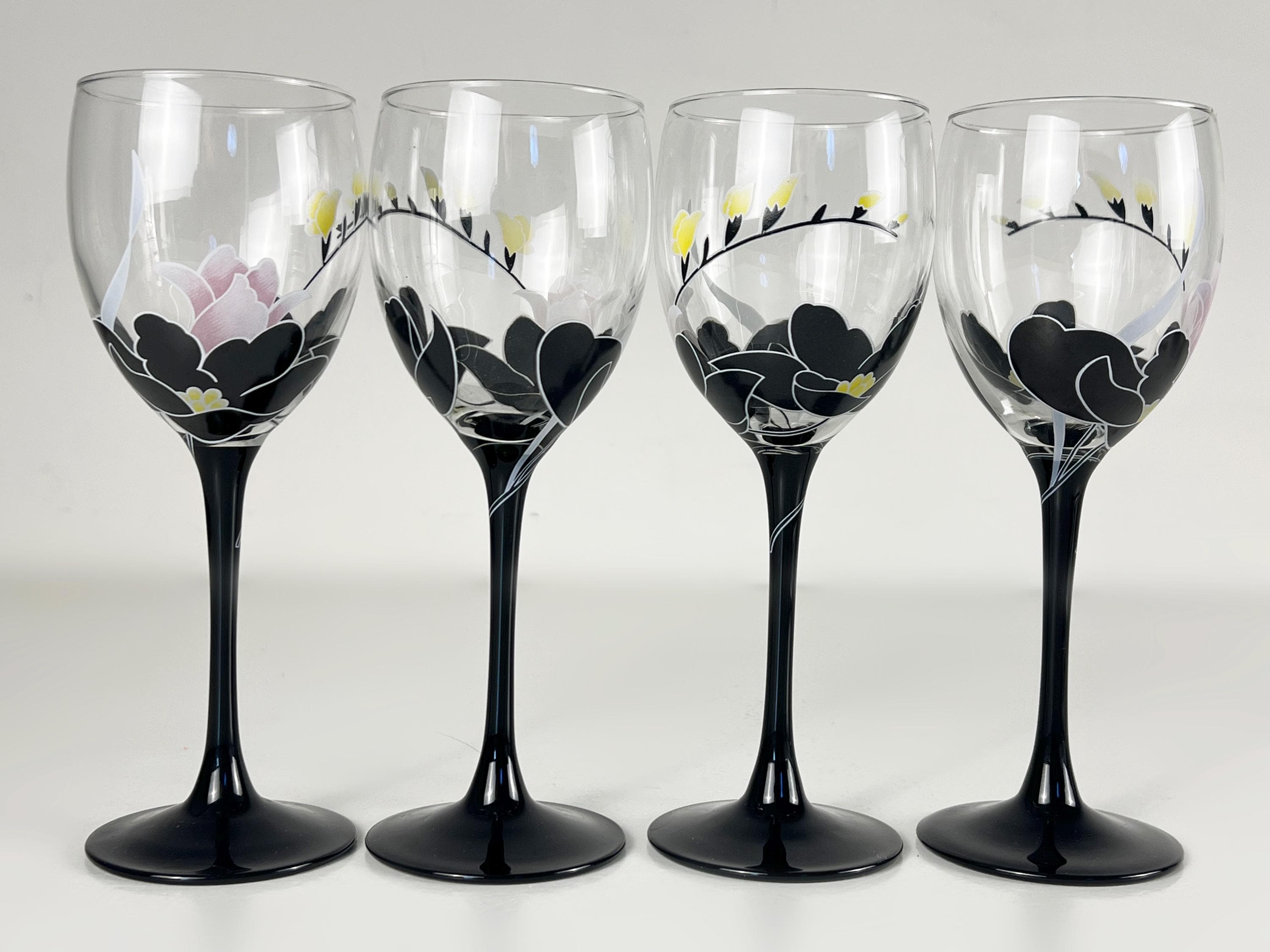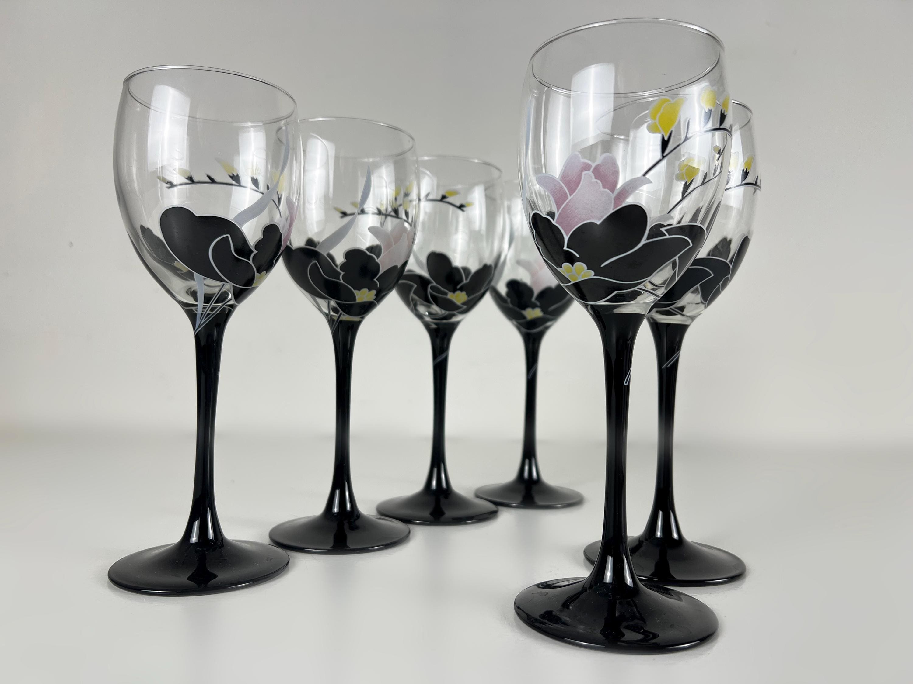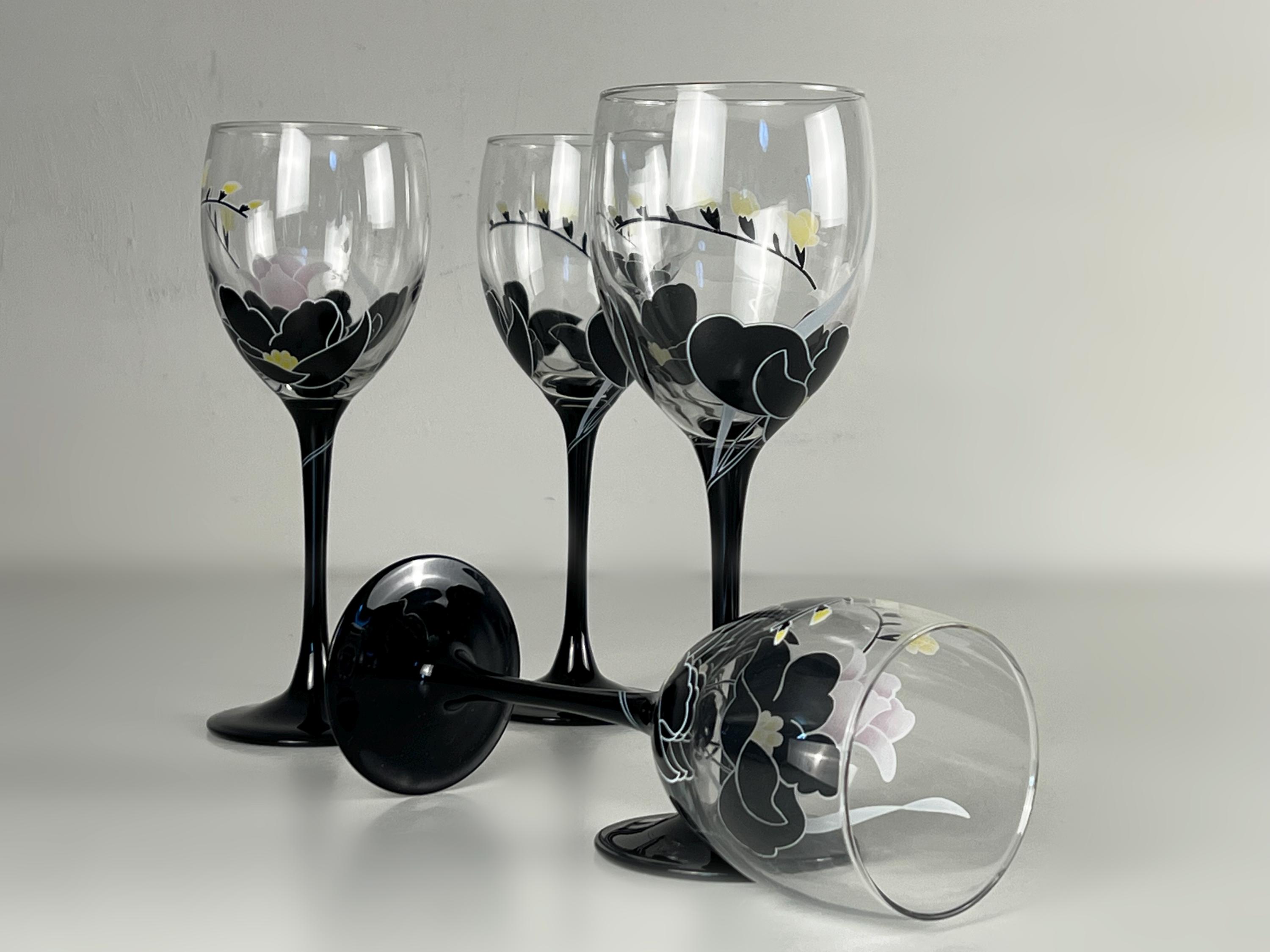 Beautiful vintage glassware, vintage wine glasses from Luminarc France, series Domino Anais floral decor wine glasses. 1970s glassware. The glasses have a black stem. A lovely addition for your mid century modern barware.