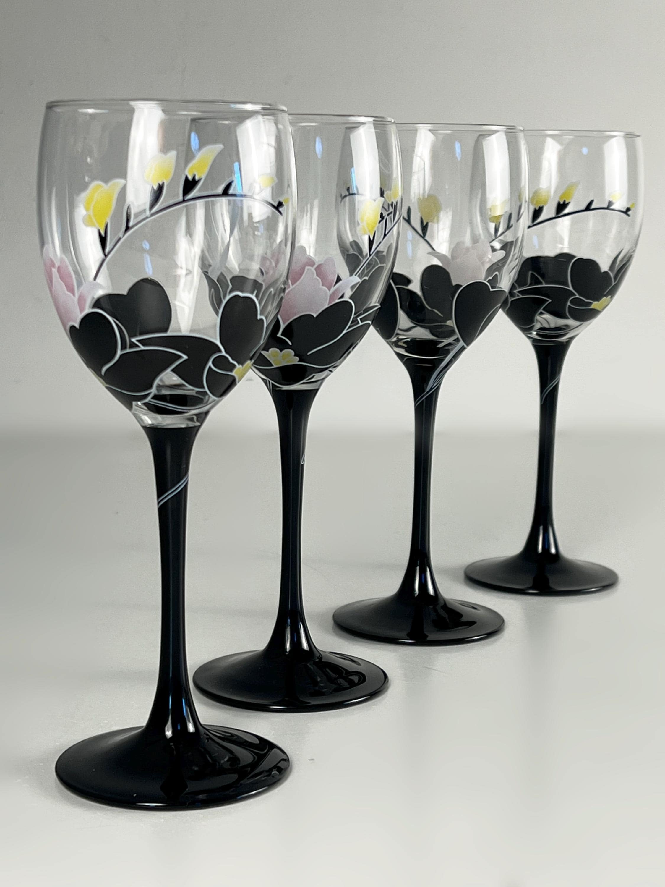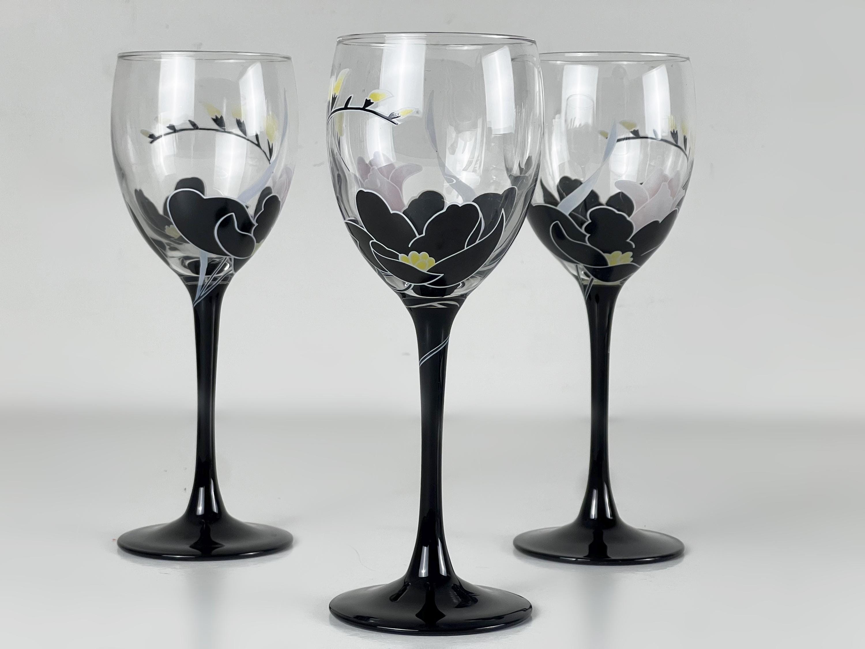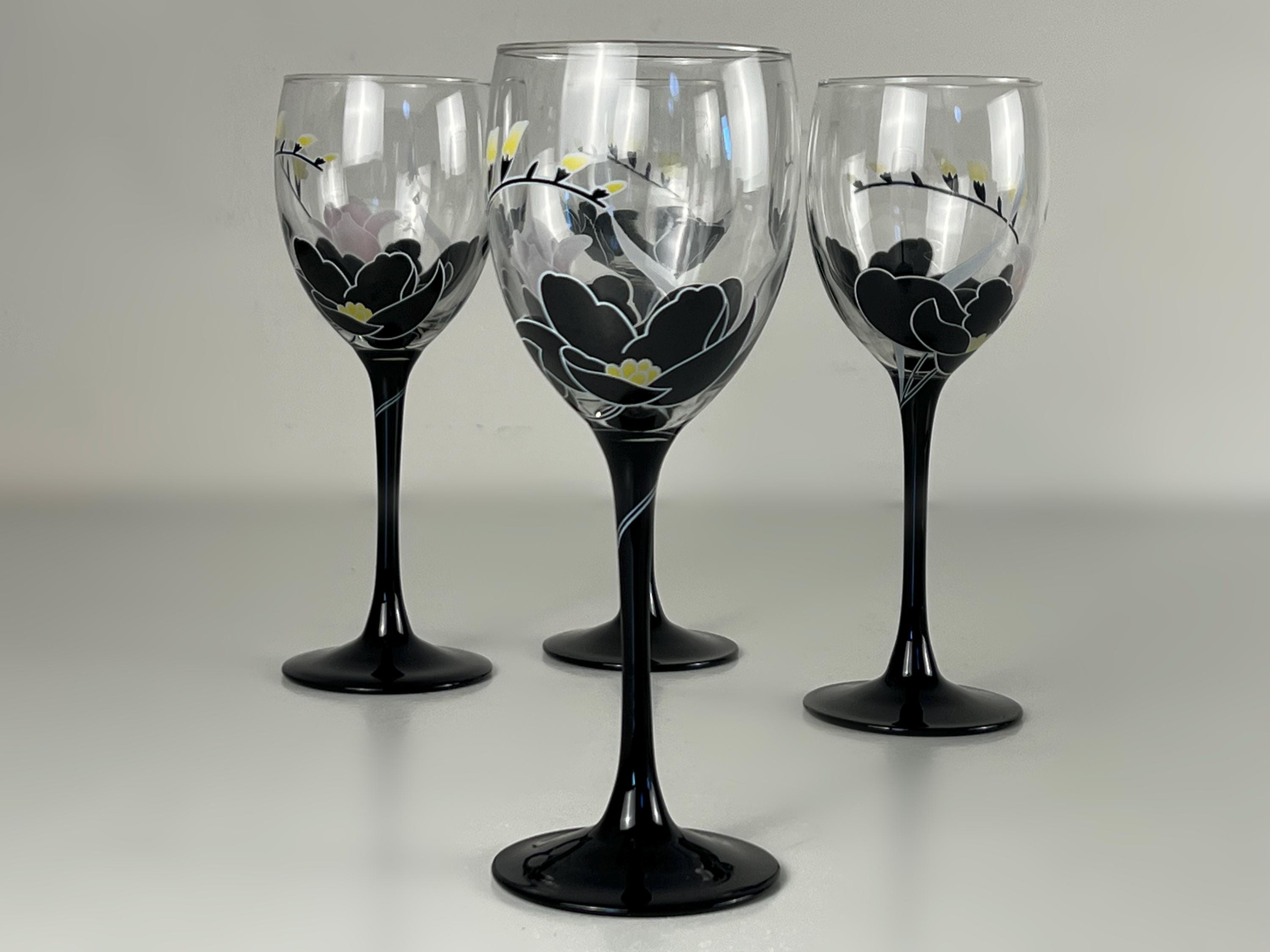 Beautiful vintage glassware, vintage wine glasses from Luminarc France, series Domino Anais floral decor wine glasses. 1970s glassware. The glasses have a black stem. A lovely addition for your mid century modern barware.
