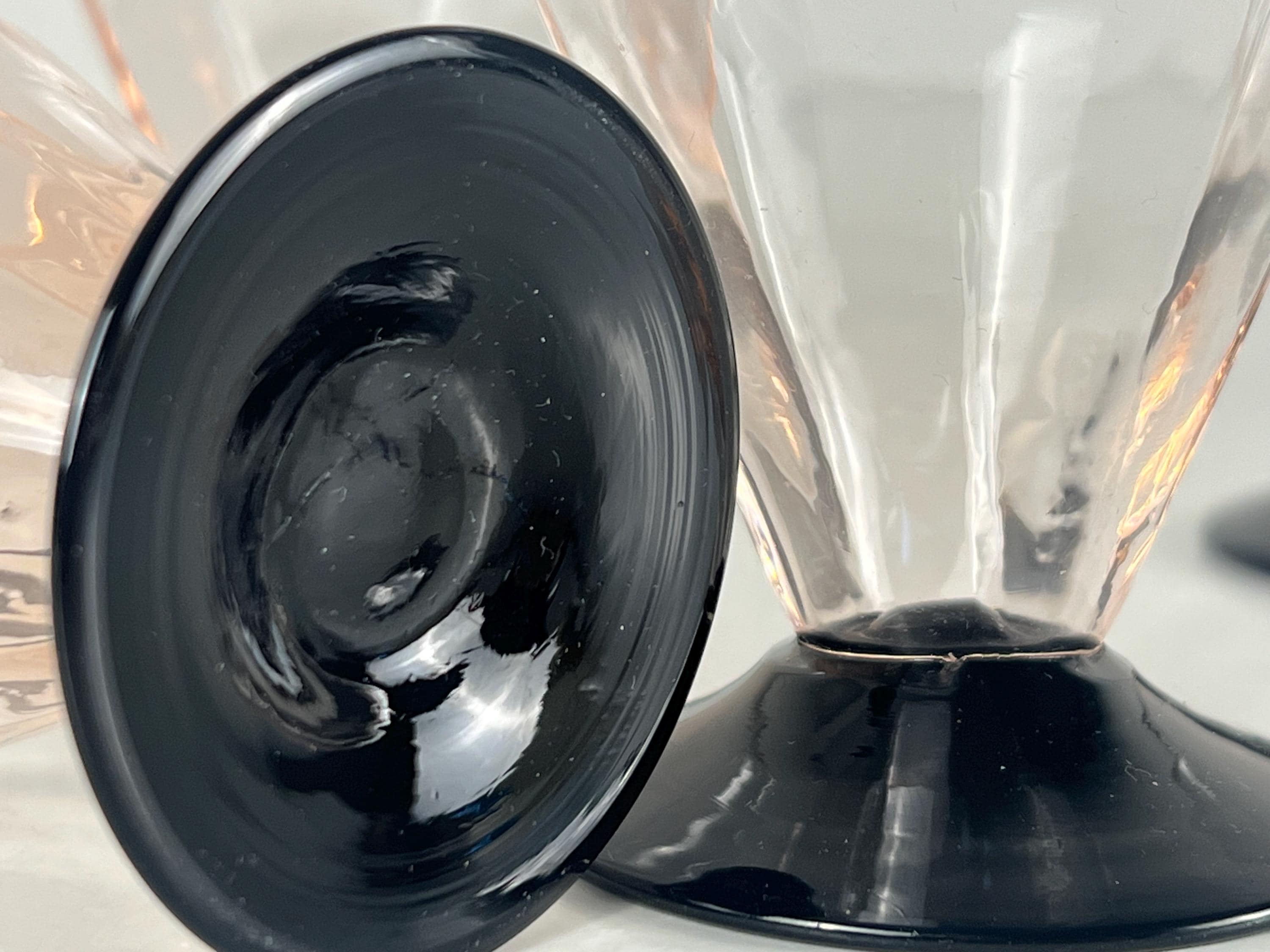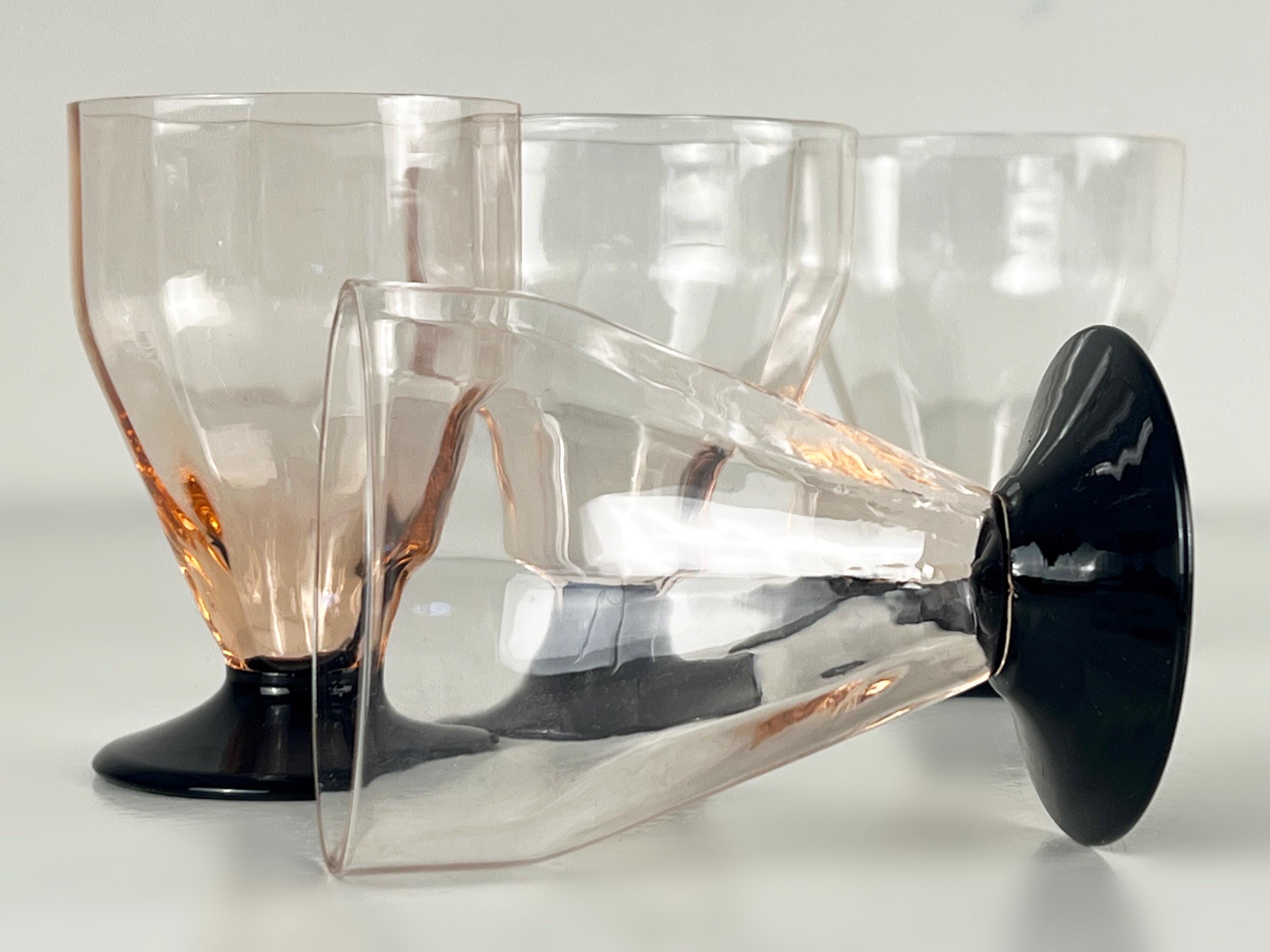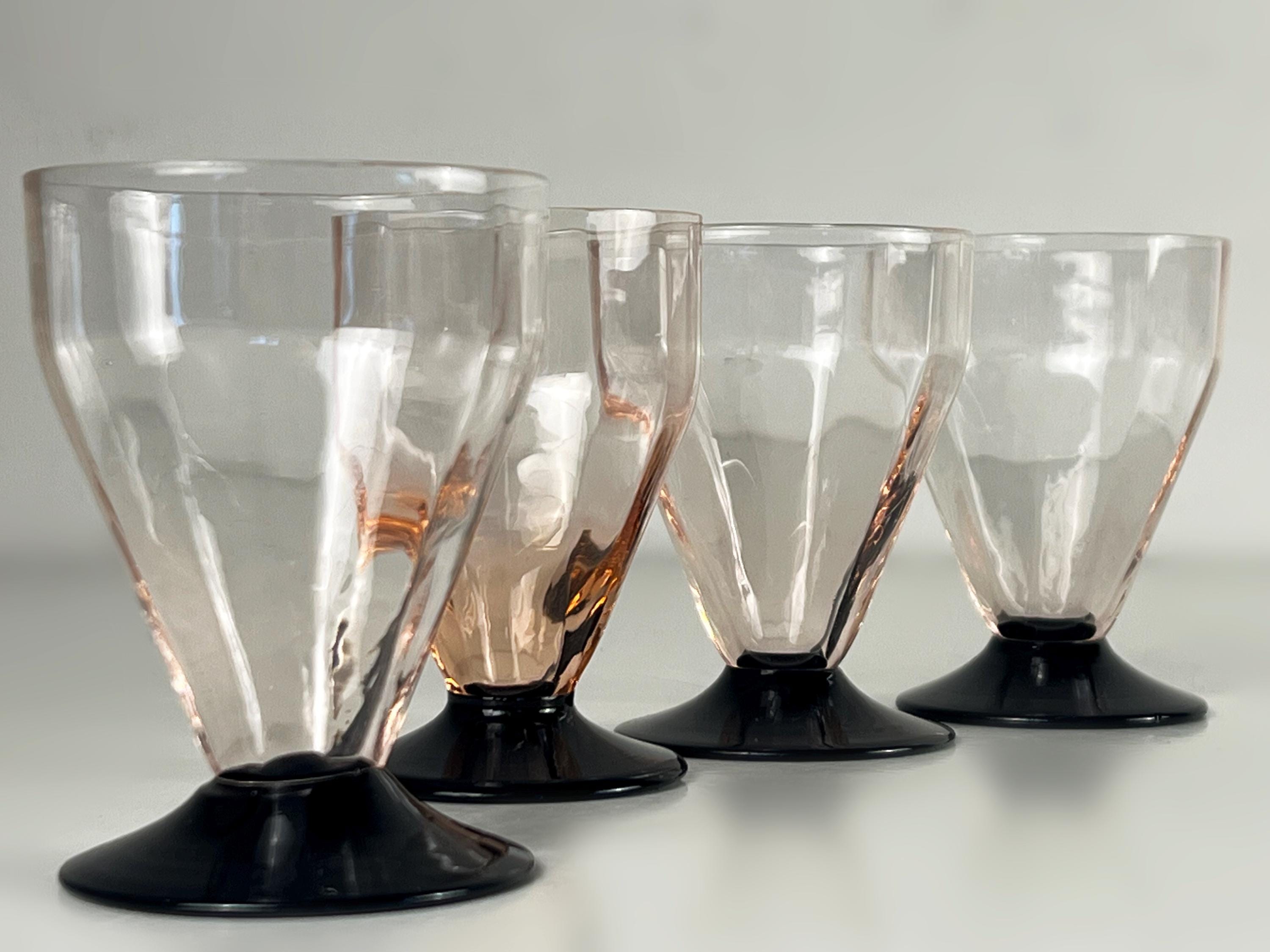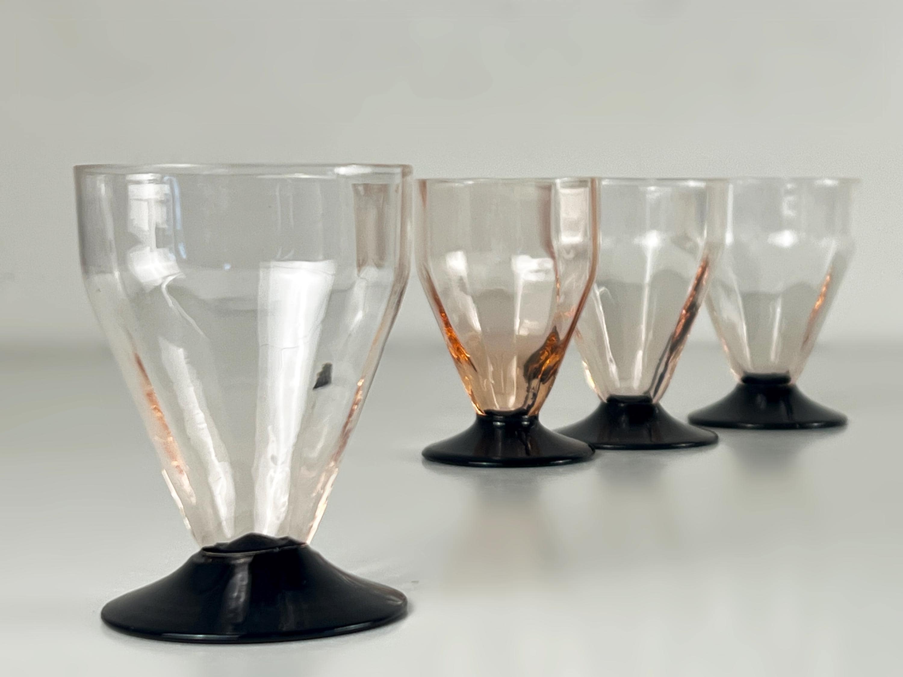 Sets of 4 small but beautiful Art Deco wine glasses with a light pink, orange glass chalice and a black glass base. These delicate hand made glasses have a scalloped shape. The glasses where most likely produced in Belgium