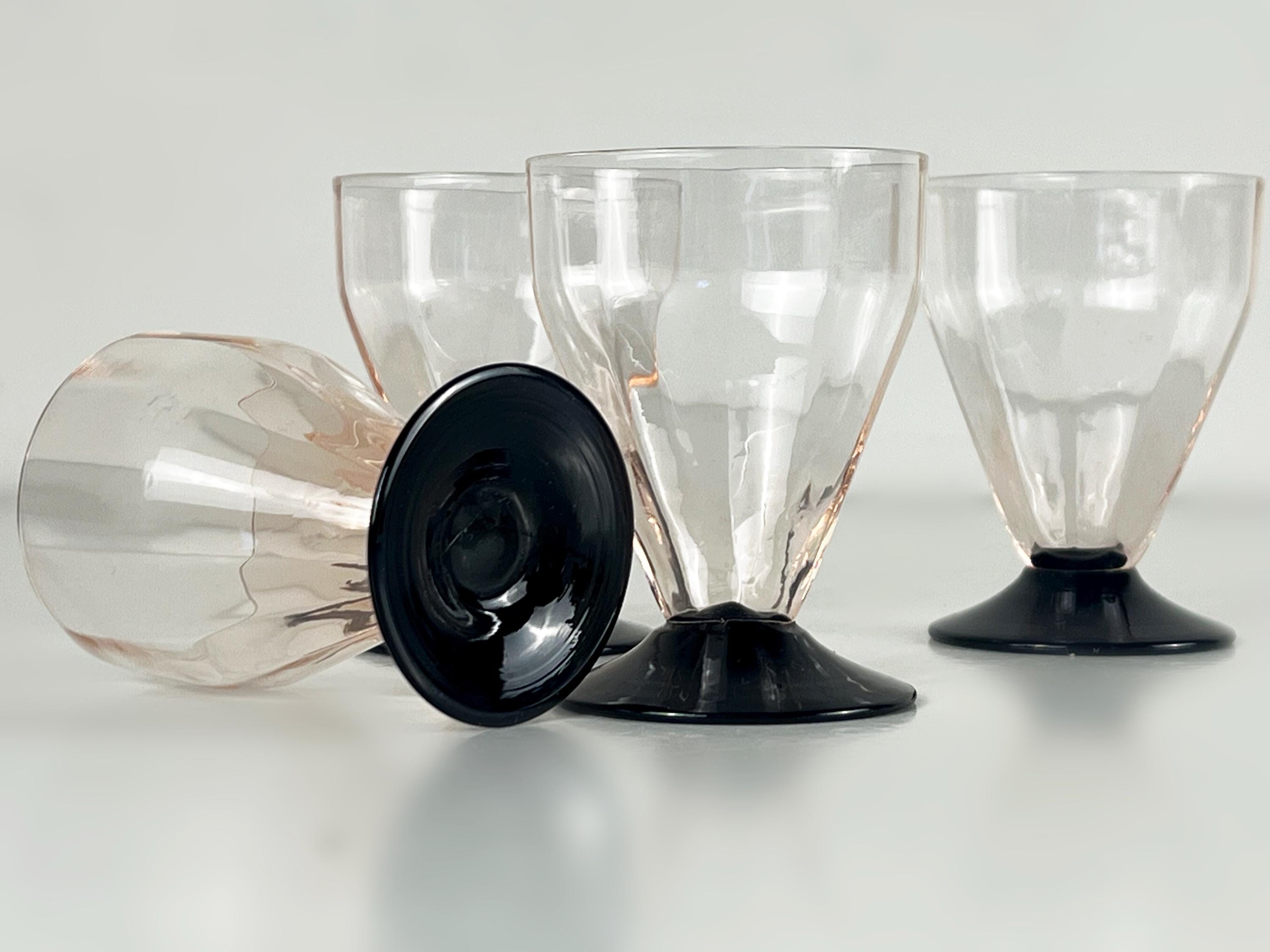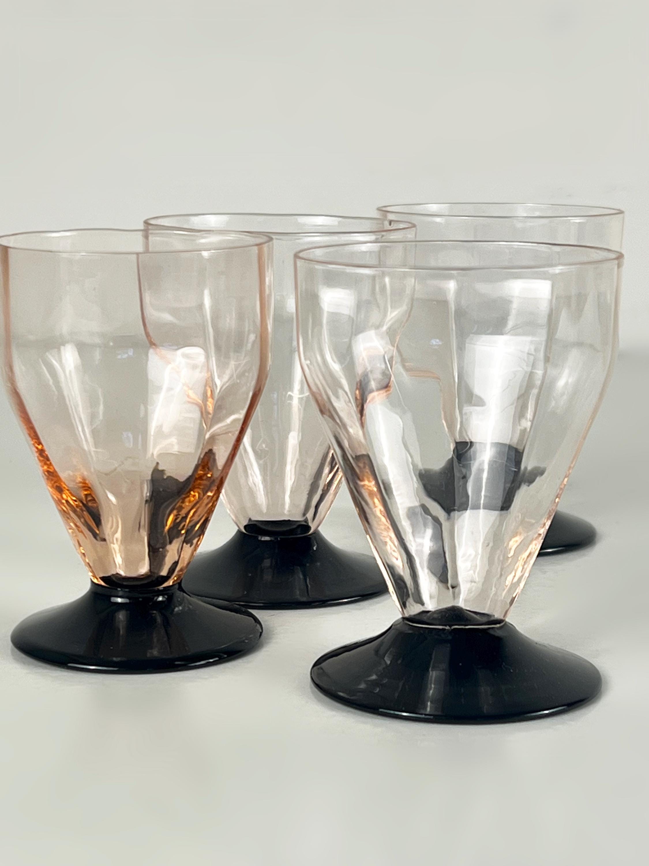 Sets of 4 small and delicate Art Deco wine glasses, orange, pink chalice and black glass base, hand made from the 1930s