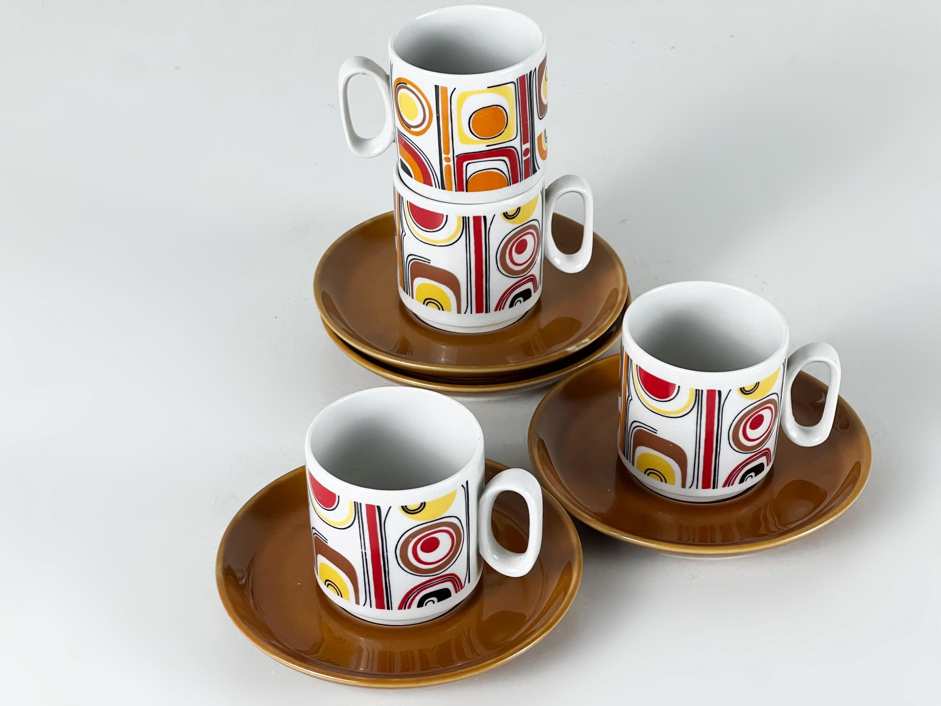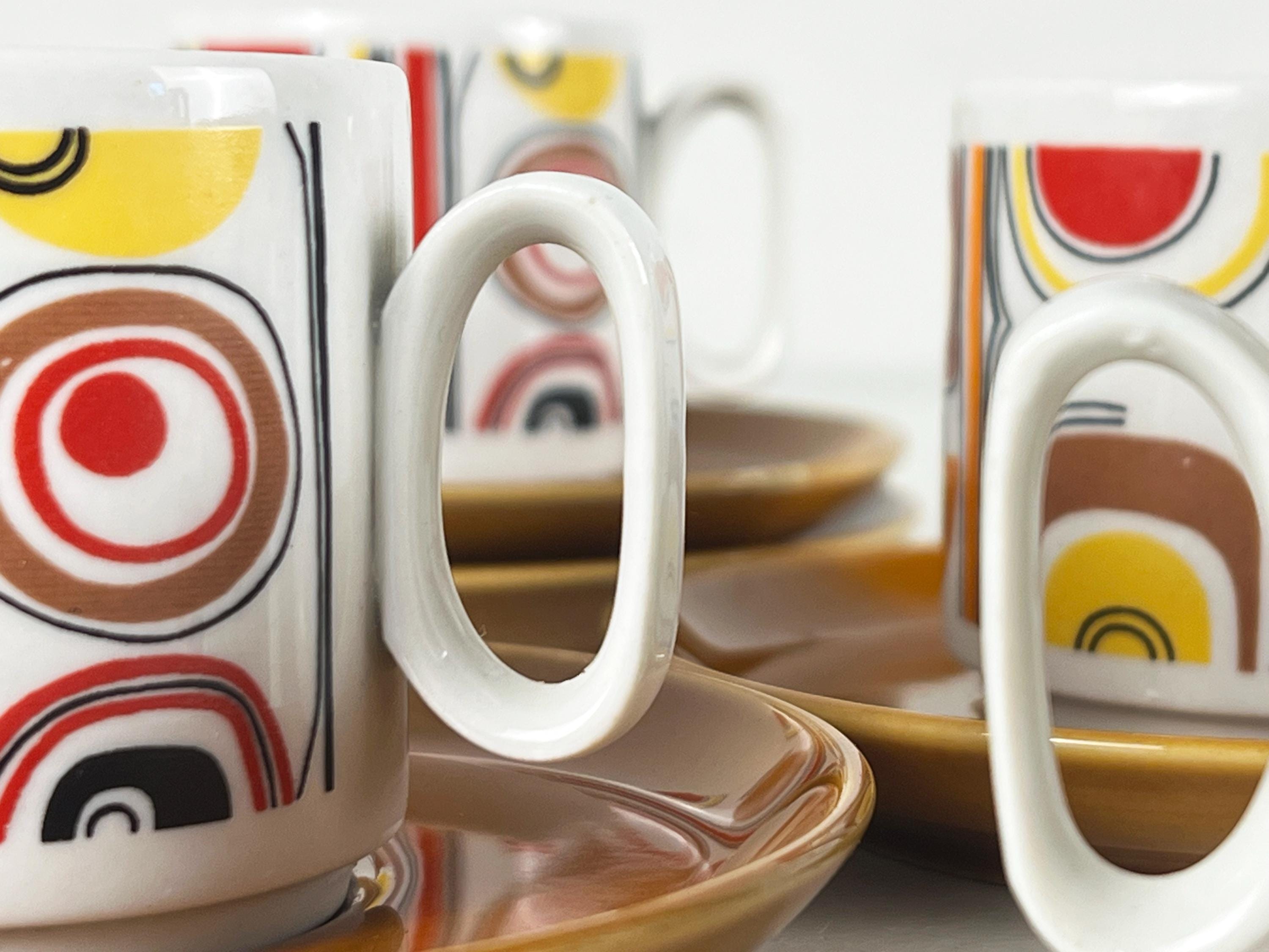 Great set of porcelain coffee, espresso cups and saucers, manufactured by Italian Tognana in the 1970s. The white cups feature the characteristic Tognana 1970s handles and are decorated with a colorful abstract pattern, matching very well with the brown saucers.