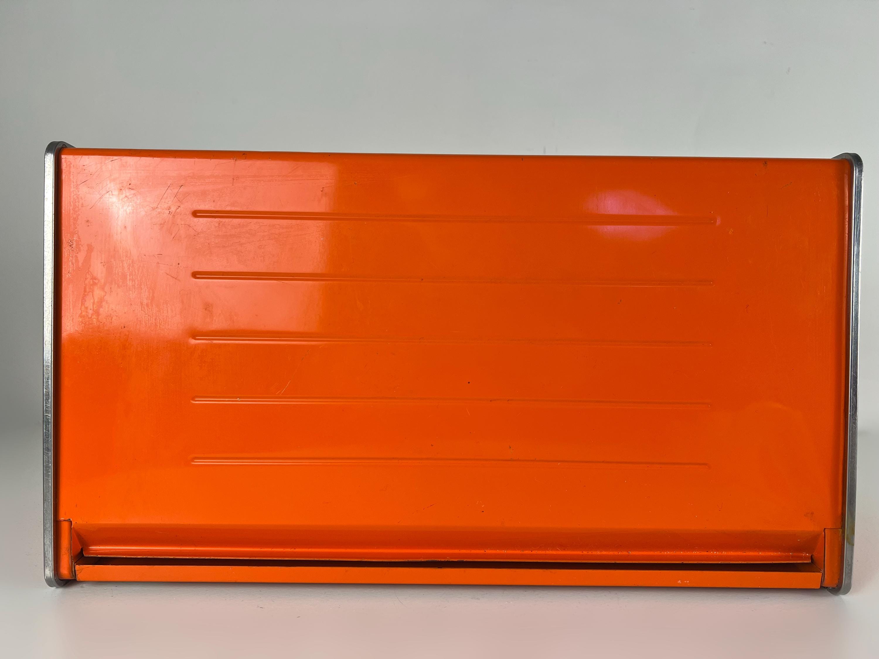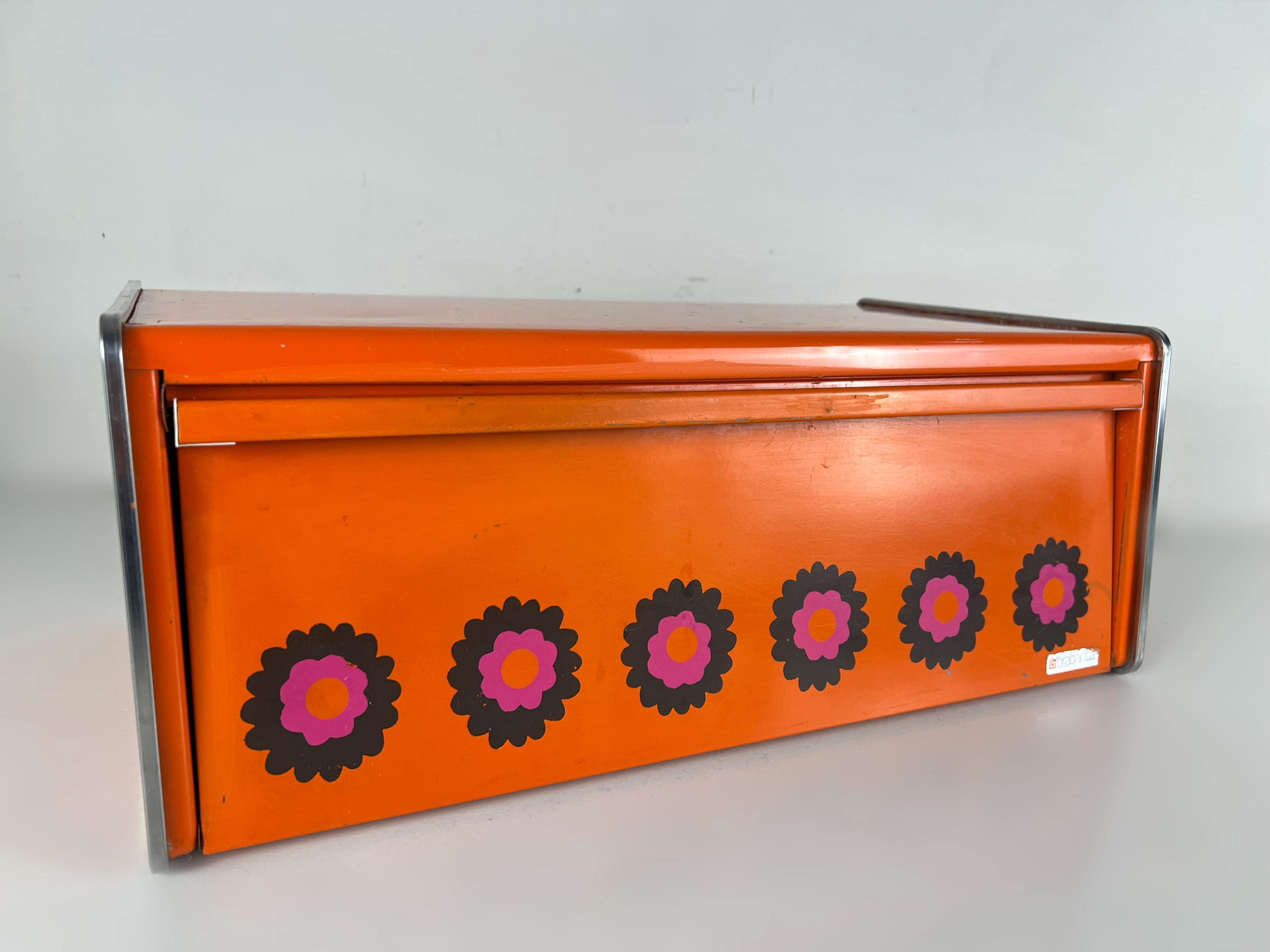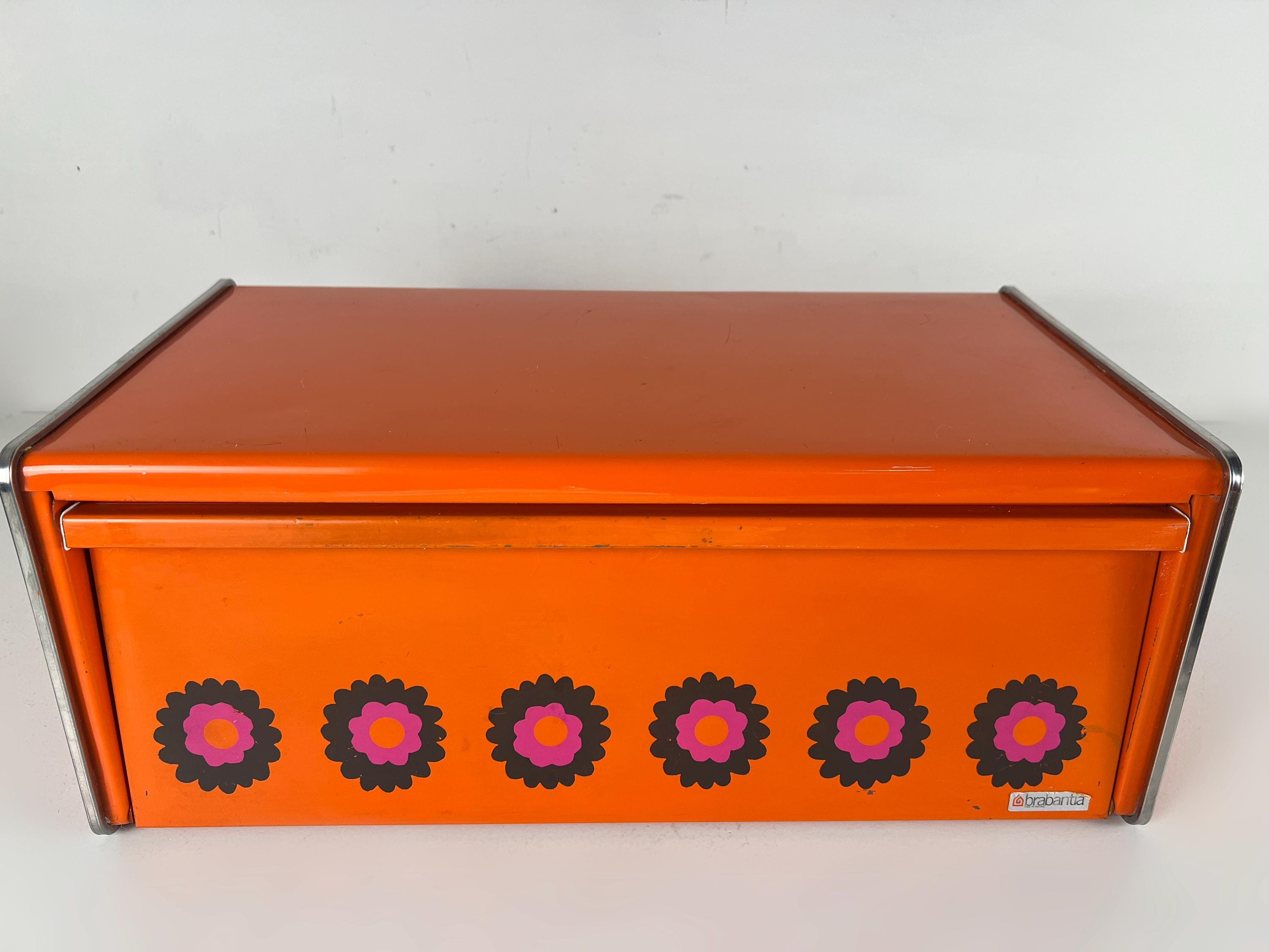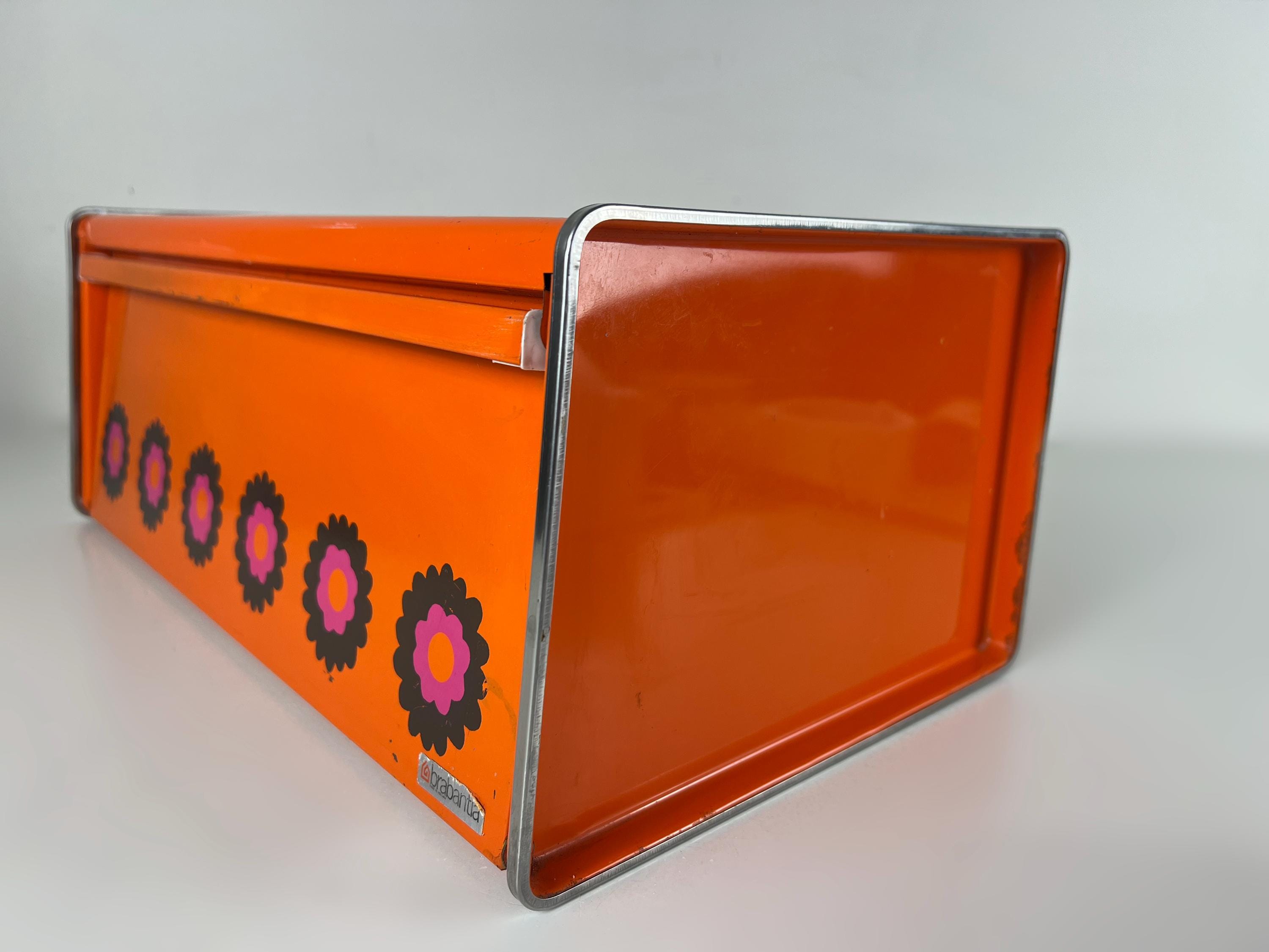 Brabantia orange metal bread box, Brabantia Patrice bread box with a flowery design, vintage mid century design 1970s