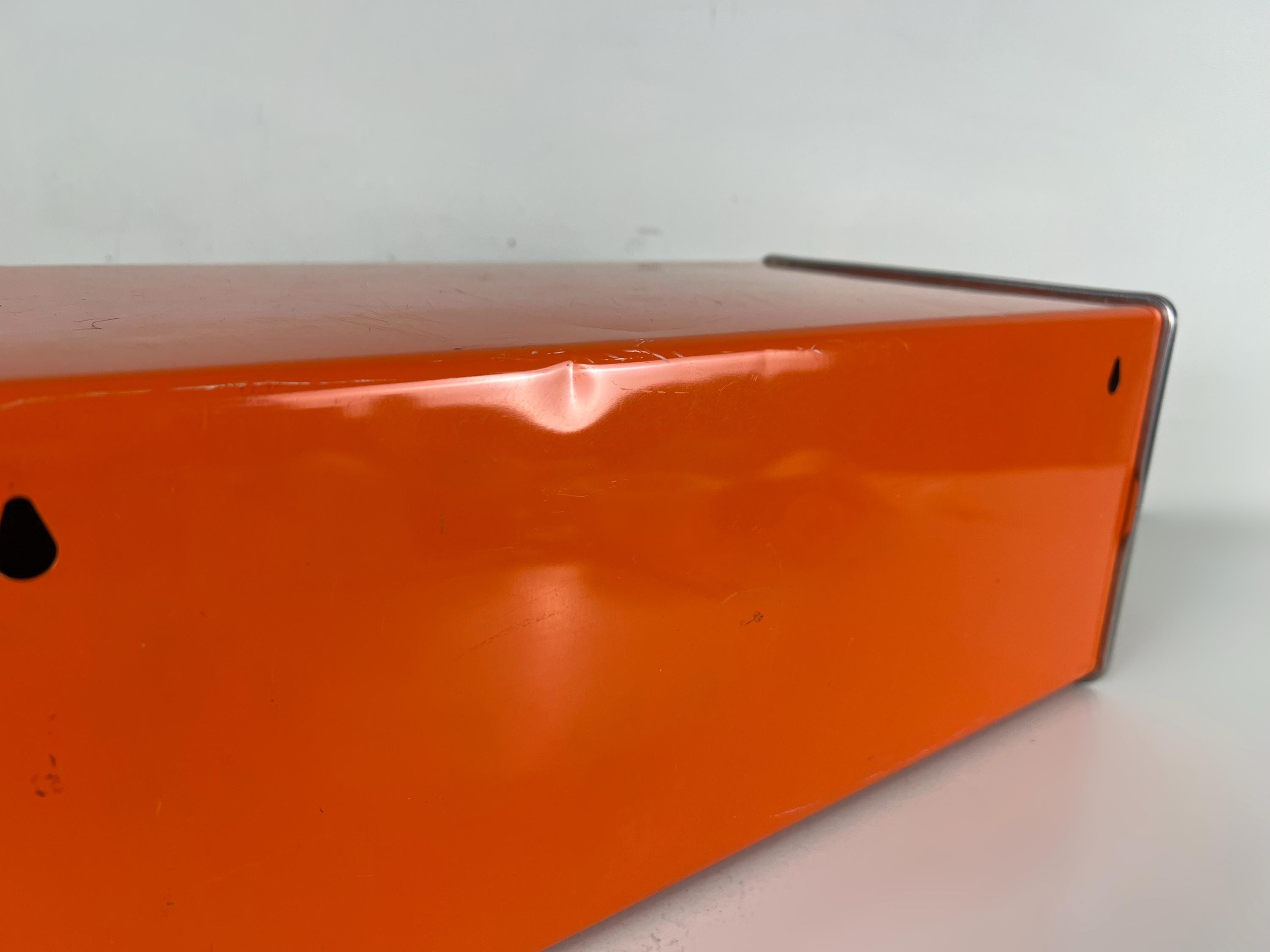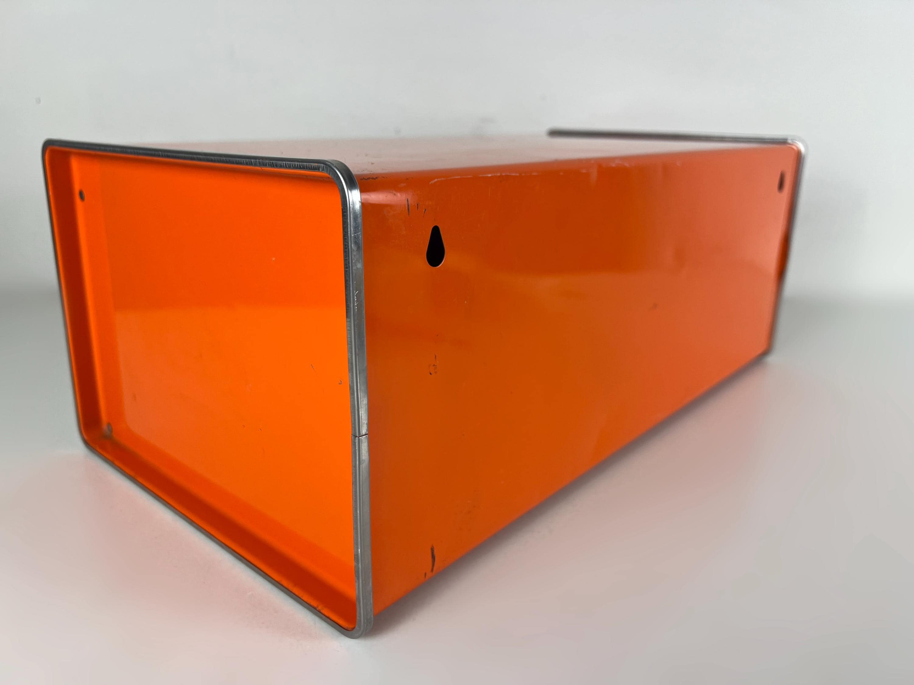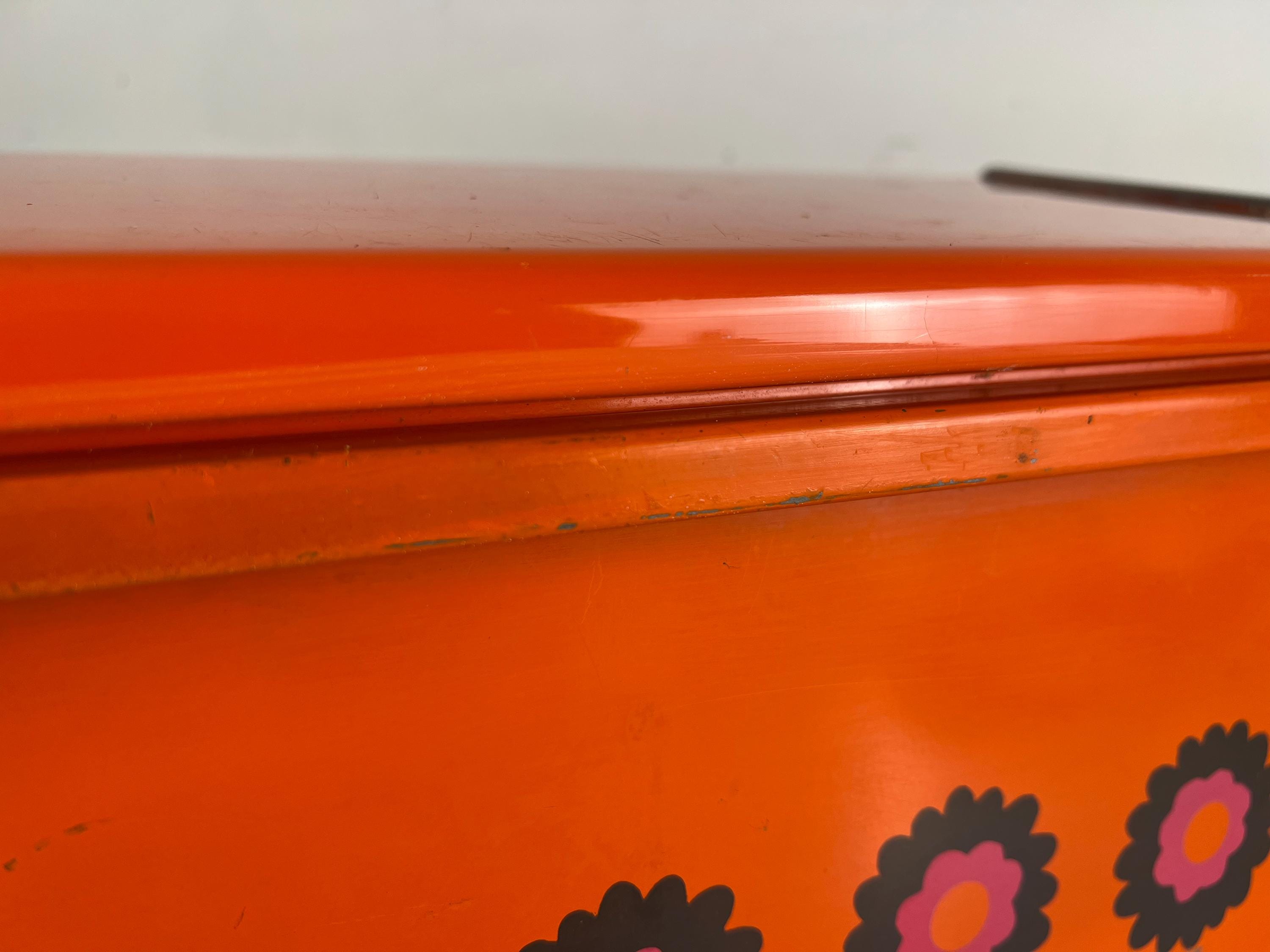 Vintage Brabantia Patrice Bread Bin bright orange with a flowery design. Mid century design from Holland from the 1970s.