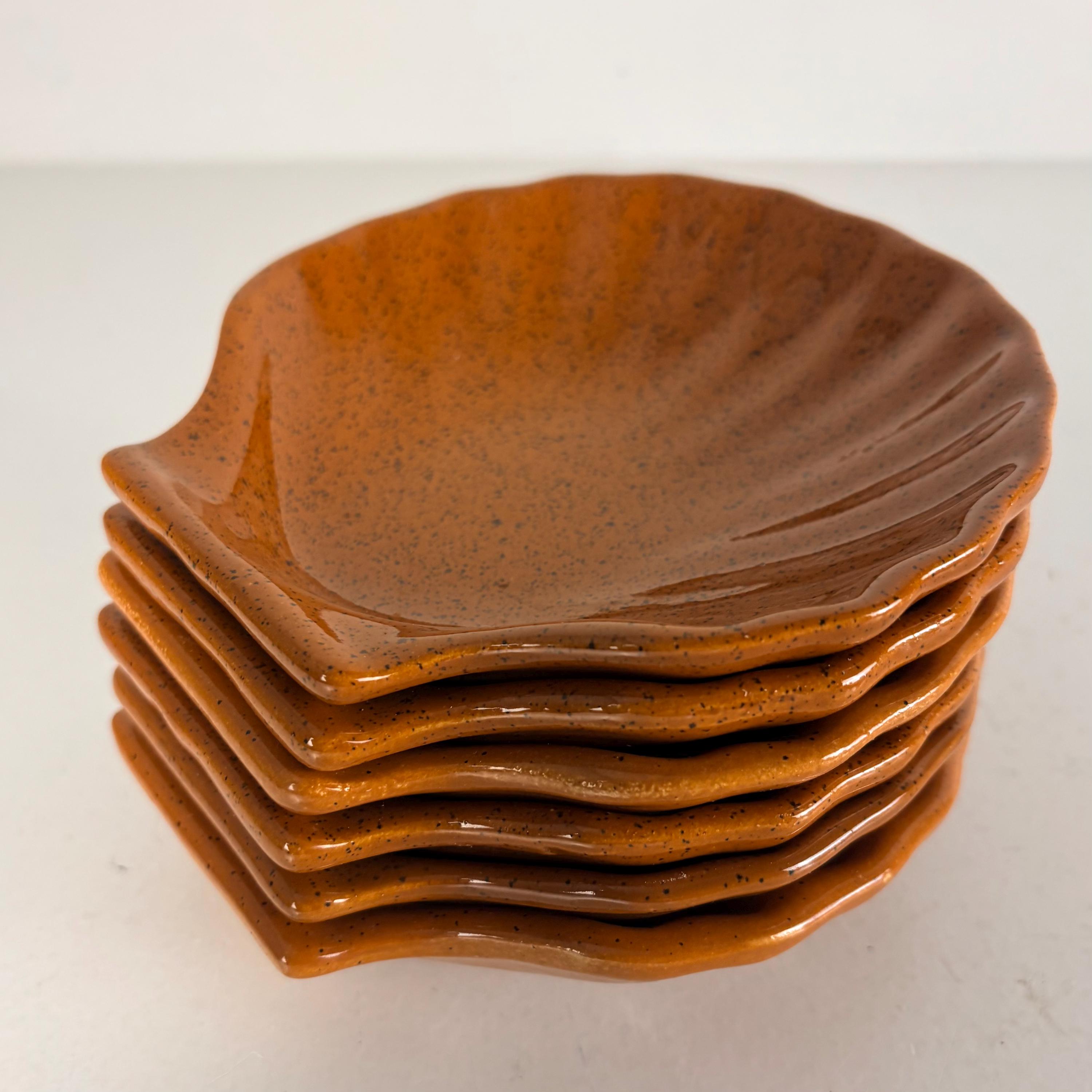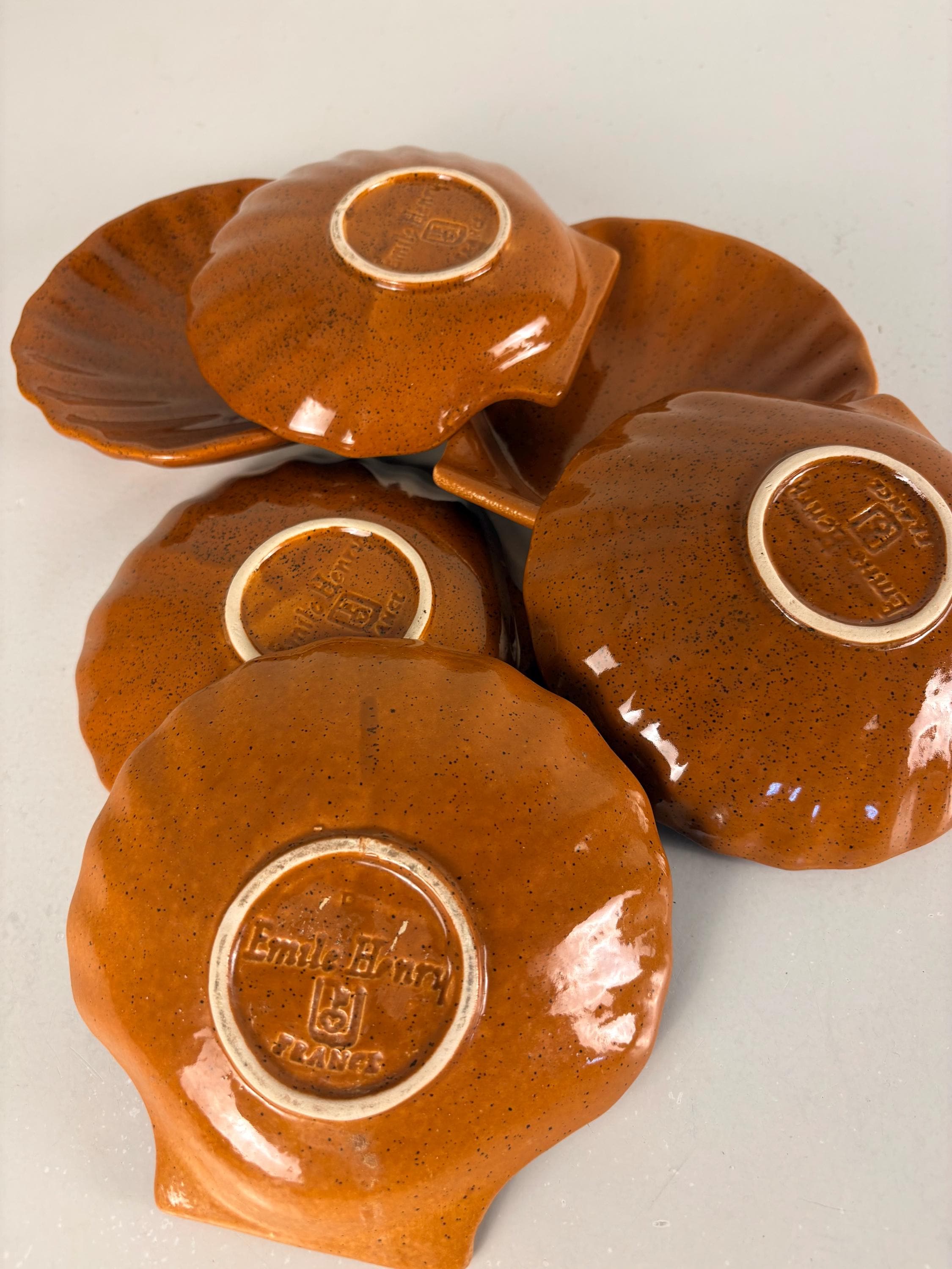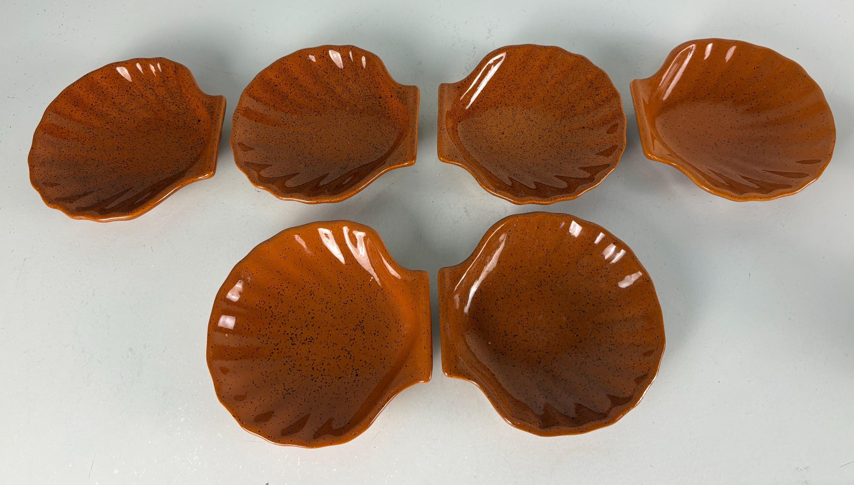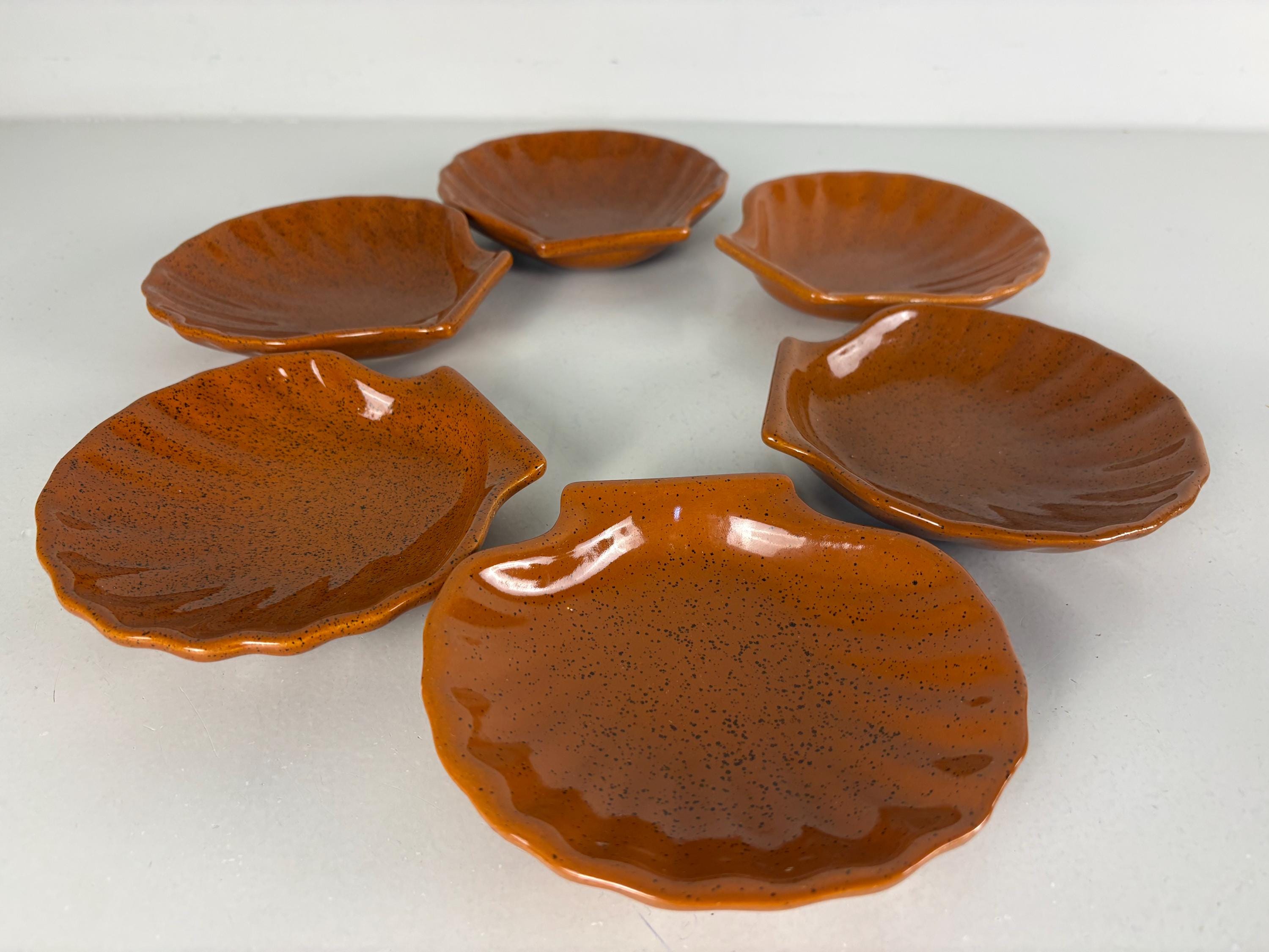 Set of 6 vintage seafood, shellfish, plates, sea scallop, Coquilles Saint-Jacques plates. The brown plates have the Emile Henry France logo mark at the bottom, made in France 1970s