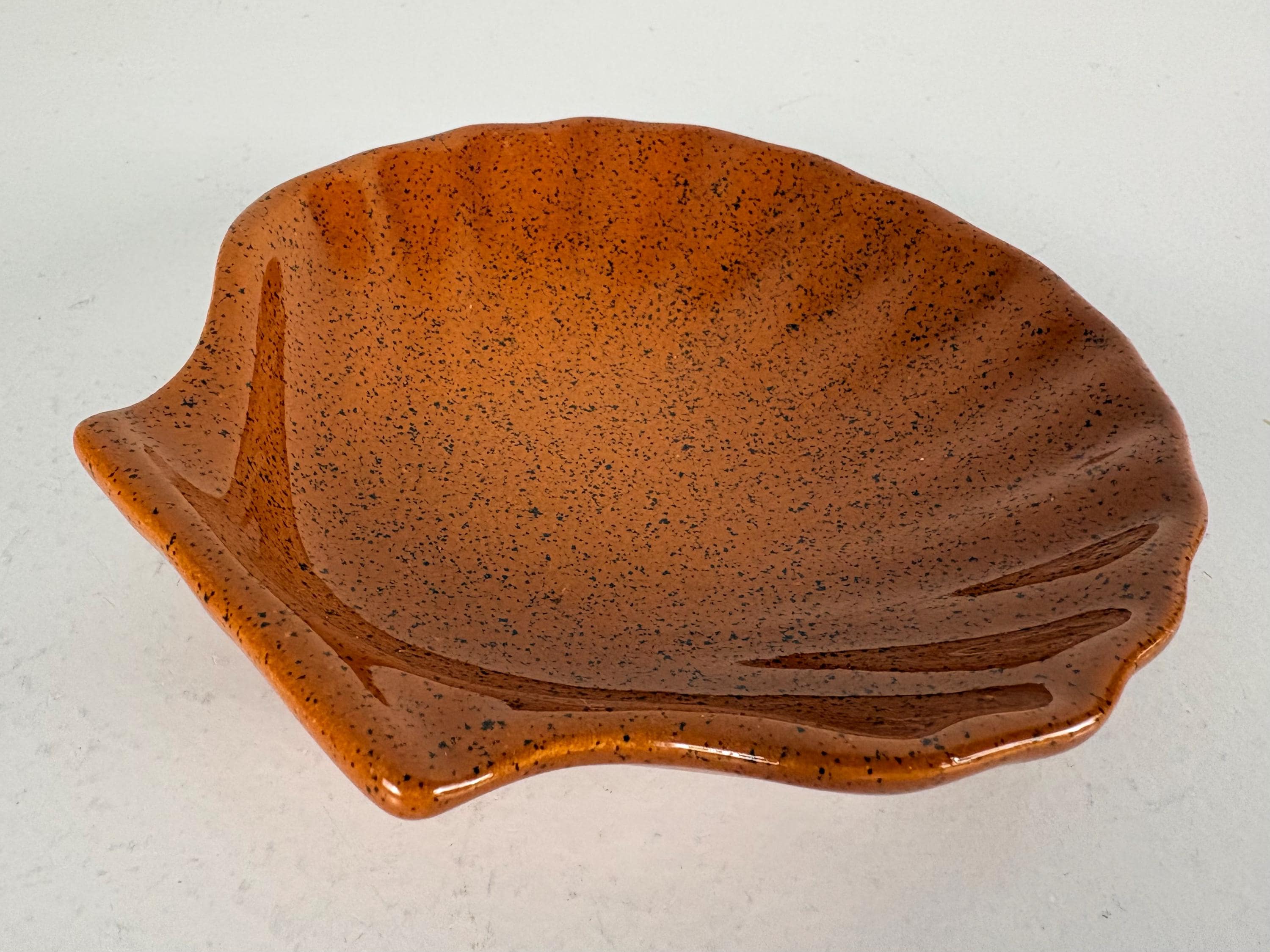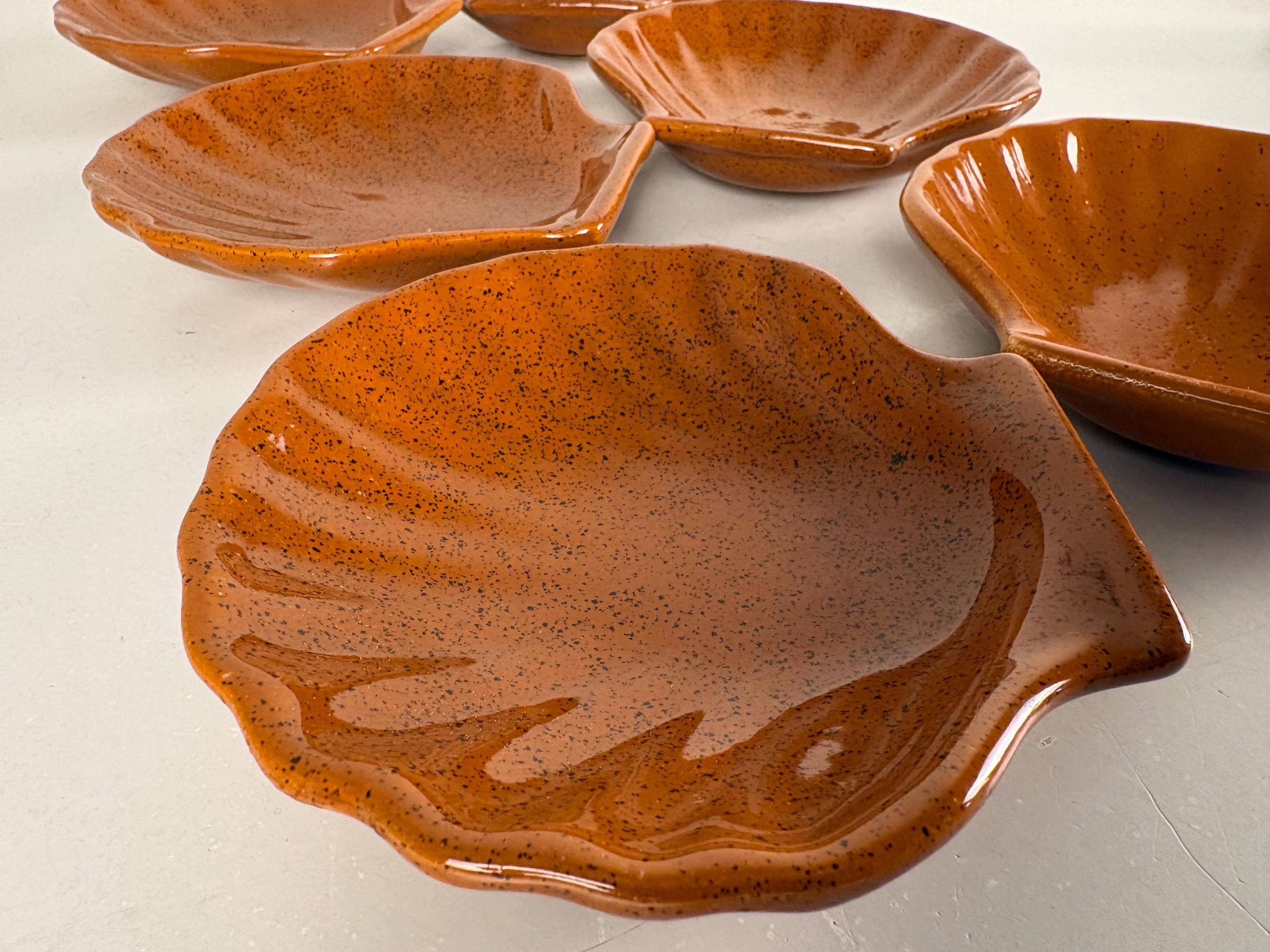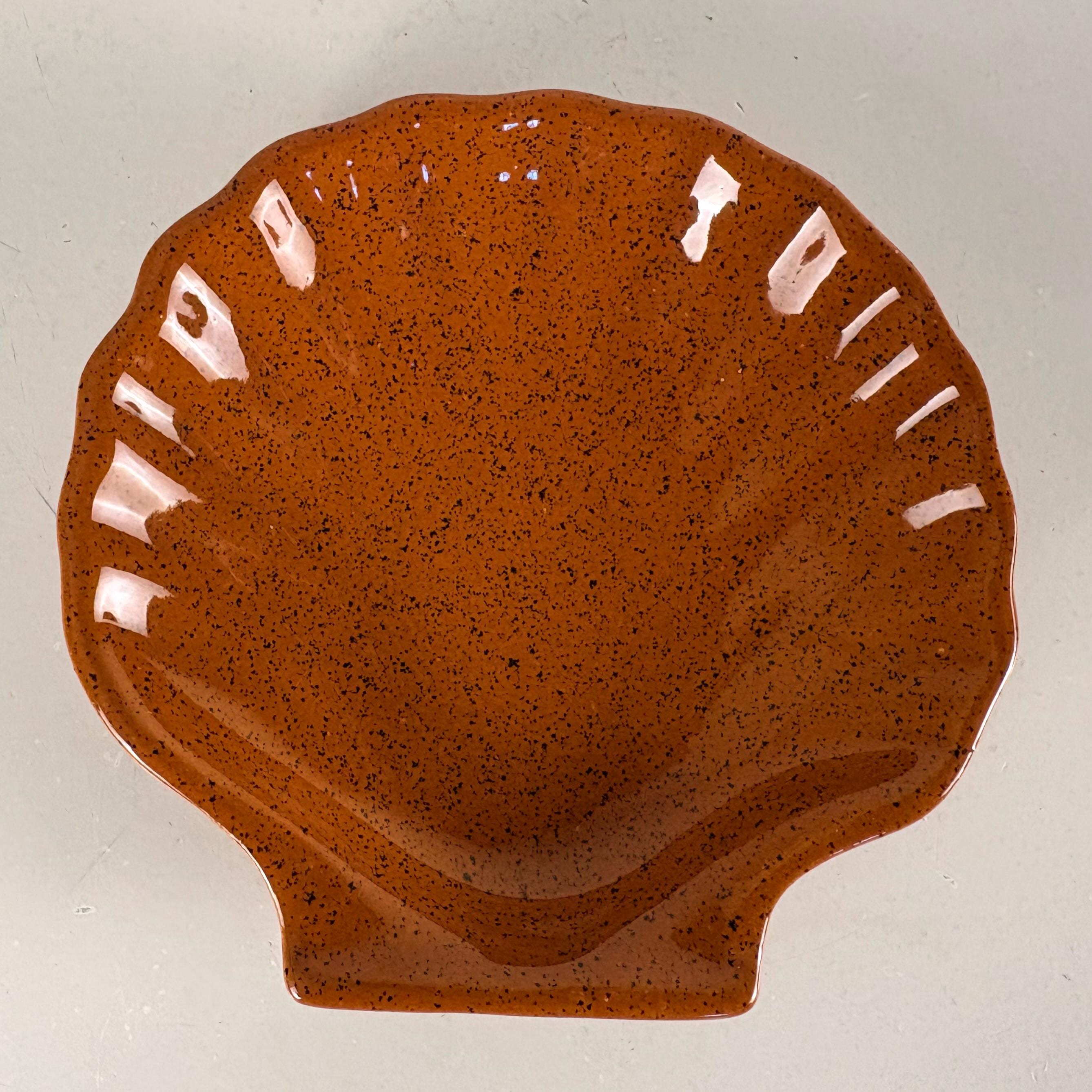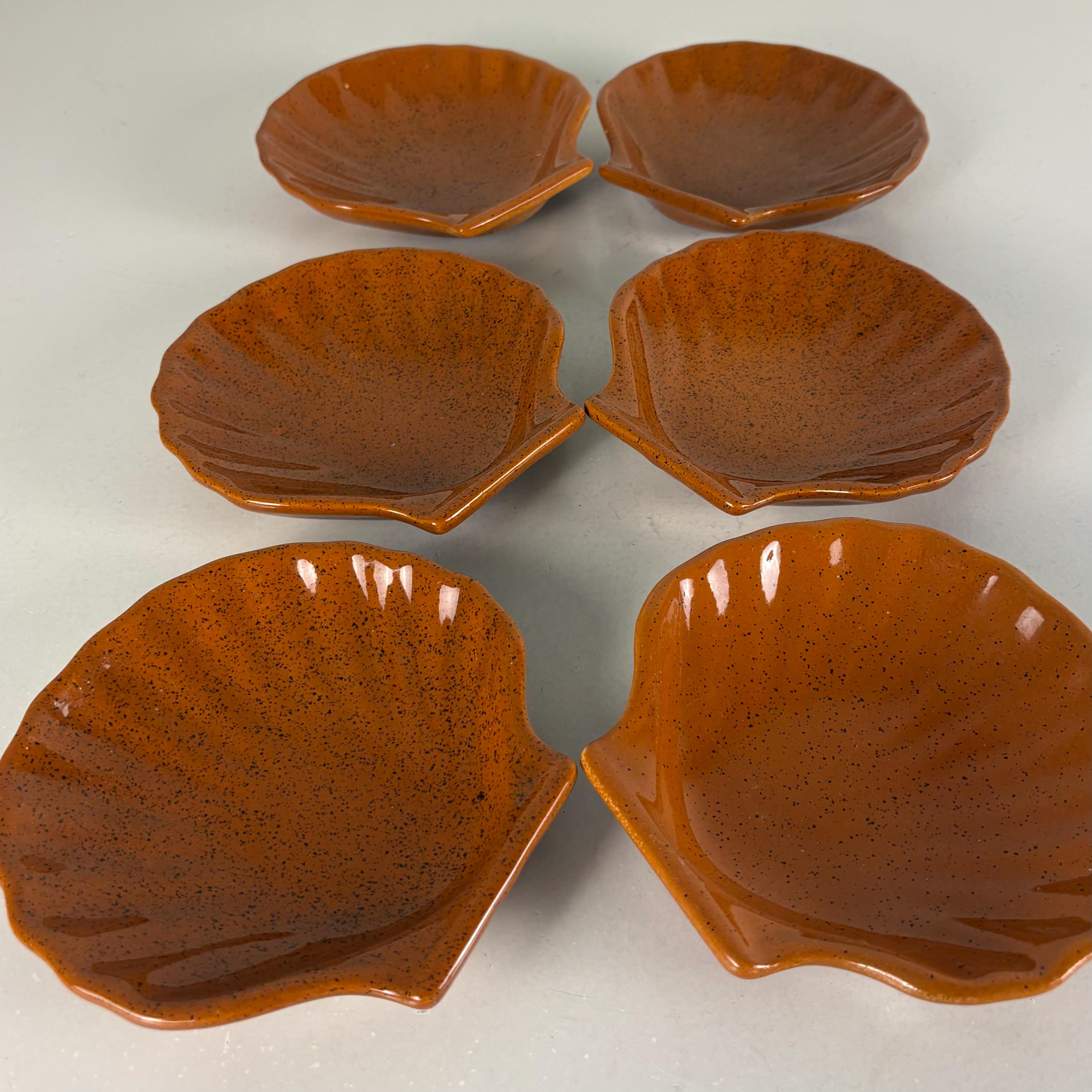 Set of 6 vintage seafood, shellfish, plates, sea scallop, Coquilles Saint-Jacques plates. The brown plates have the Emile Henry France logo mark at the bottom, made in France 1970s