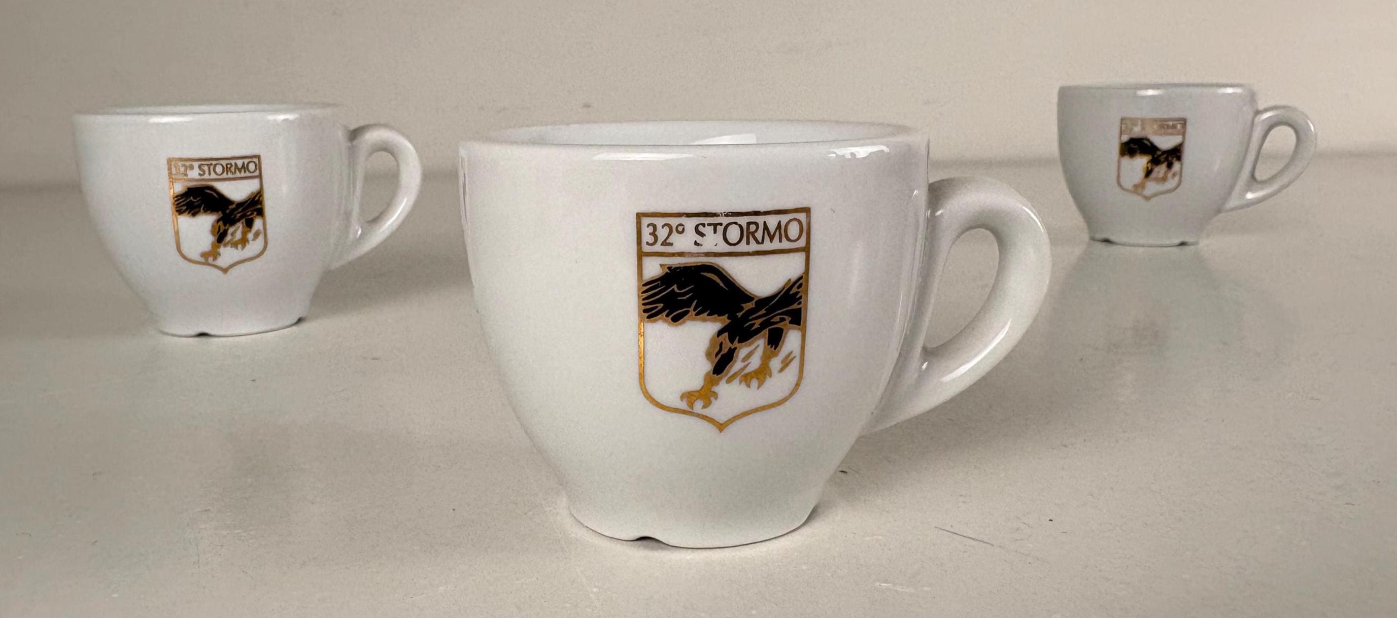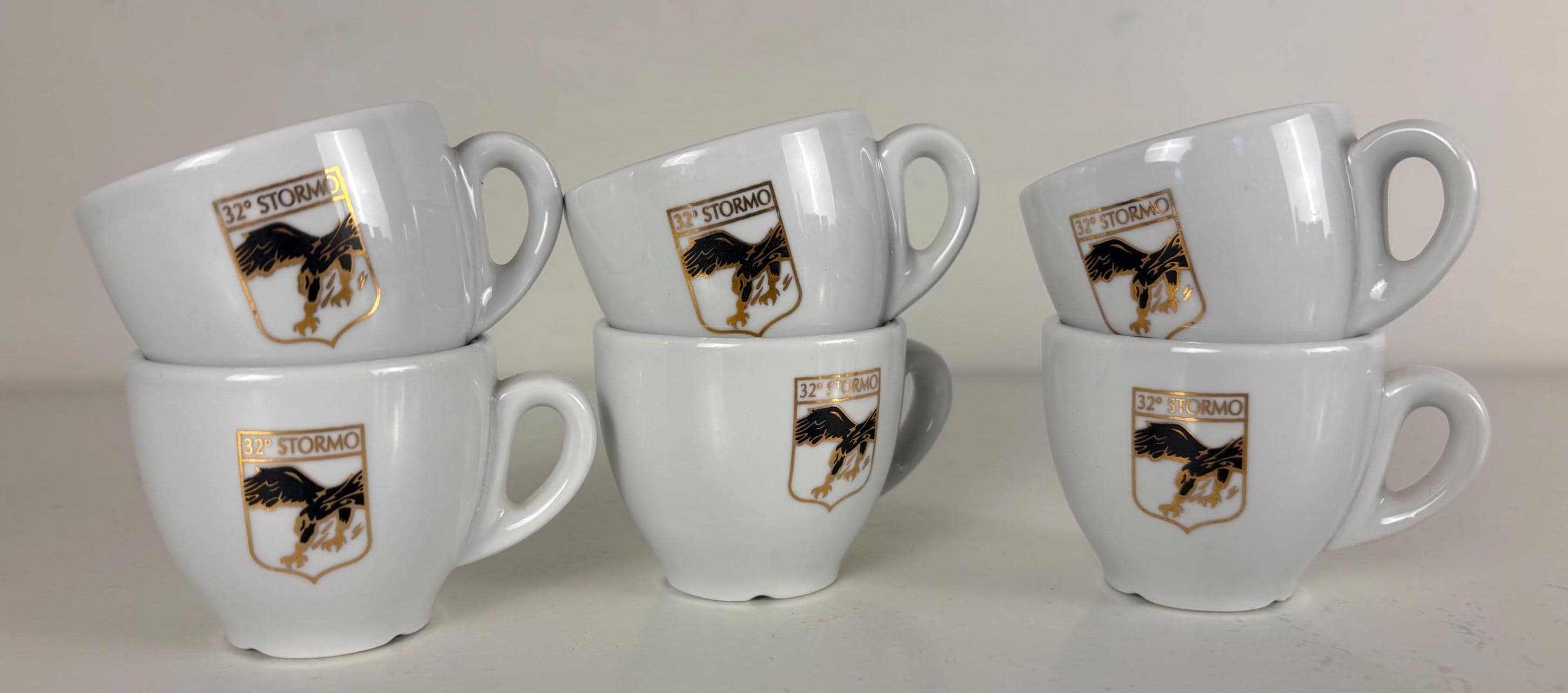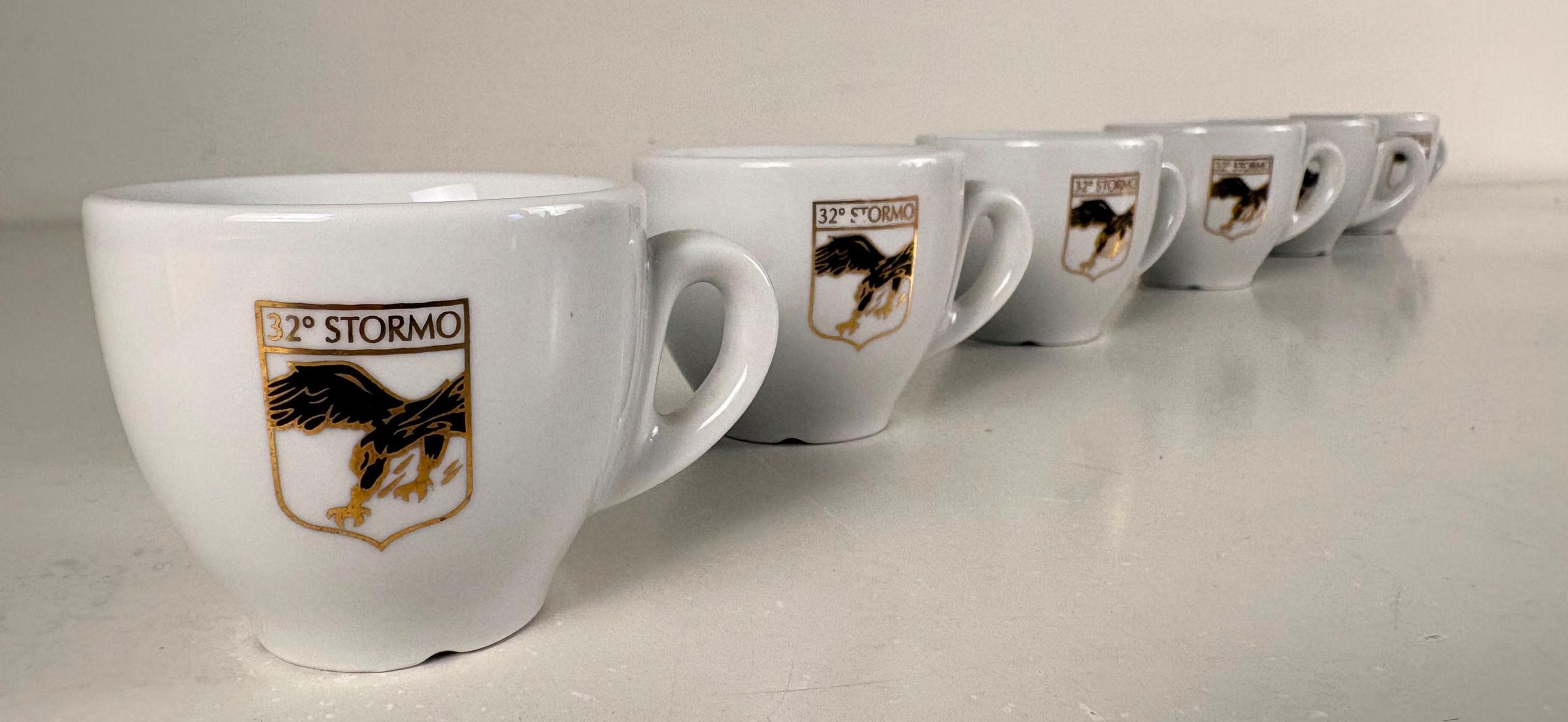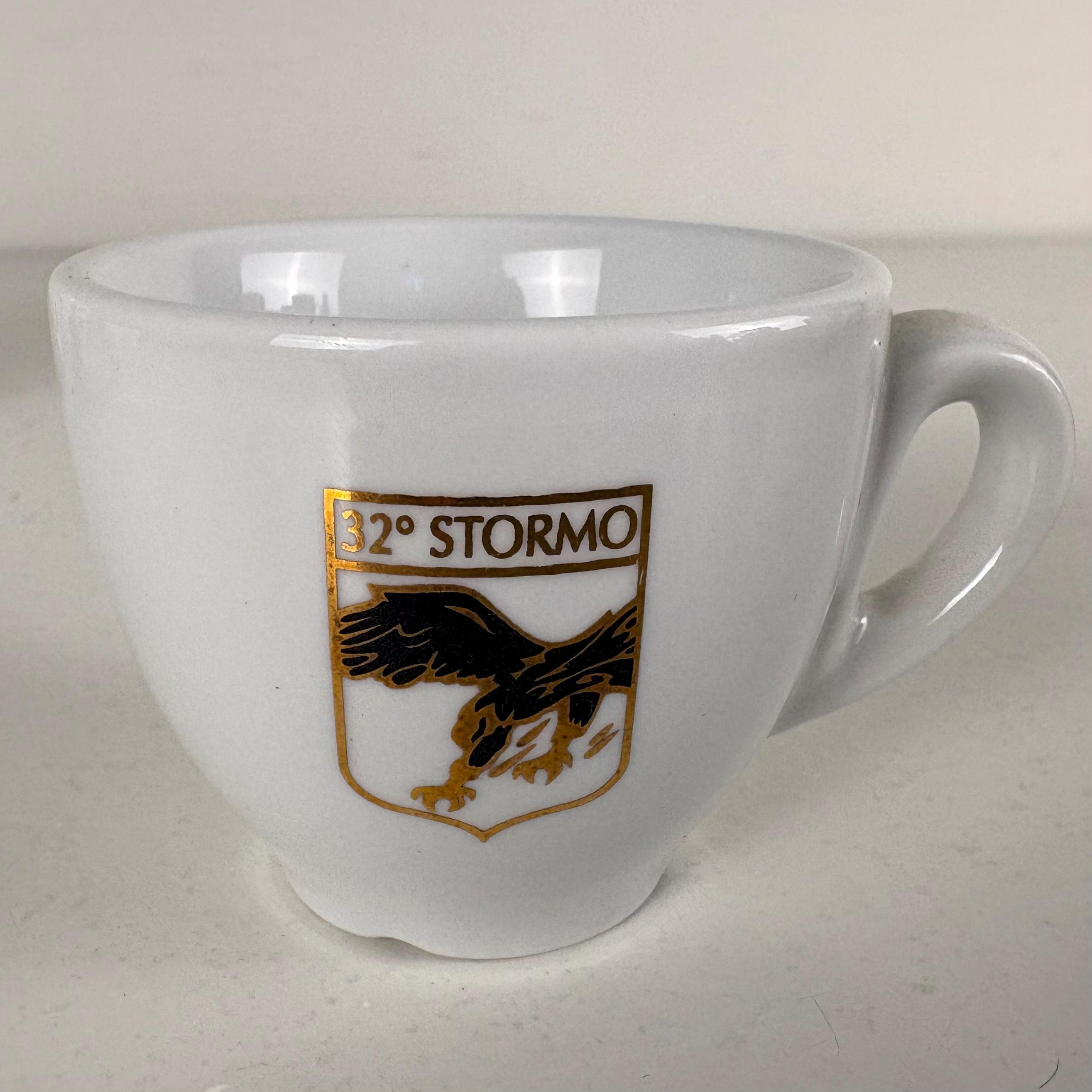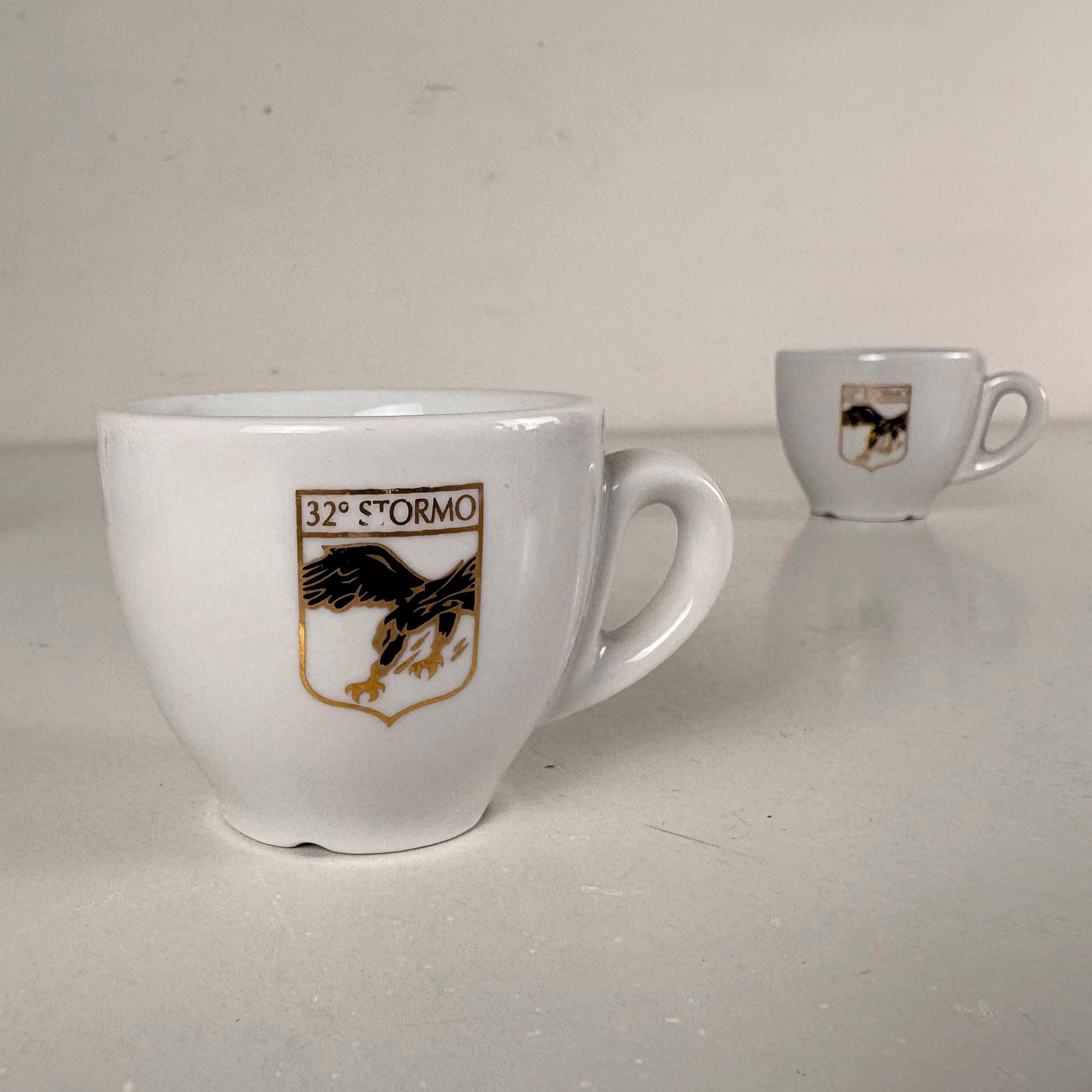 Sets of 2 Tognana espresso cups, white with the 32th Stormo Air Force Aeronautica Militare AM, 32th Wing, Italy 2000s. The logo is in black with golden details. Espresso cups collectibles.