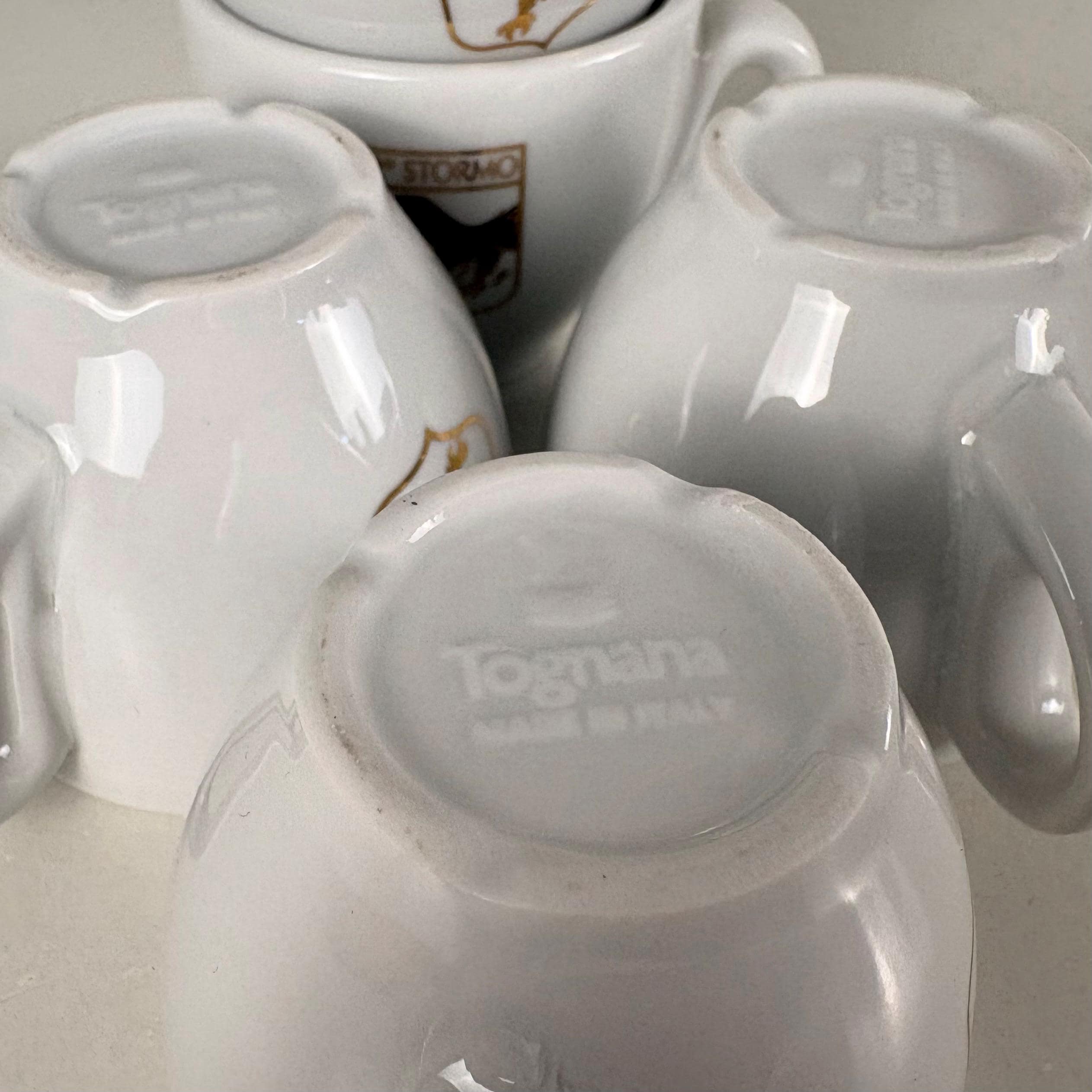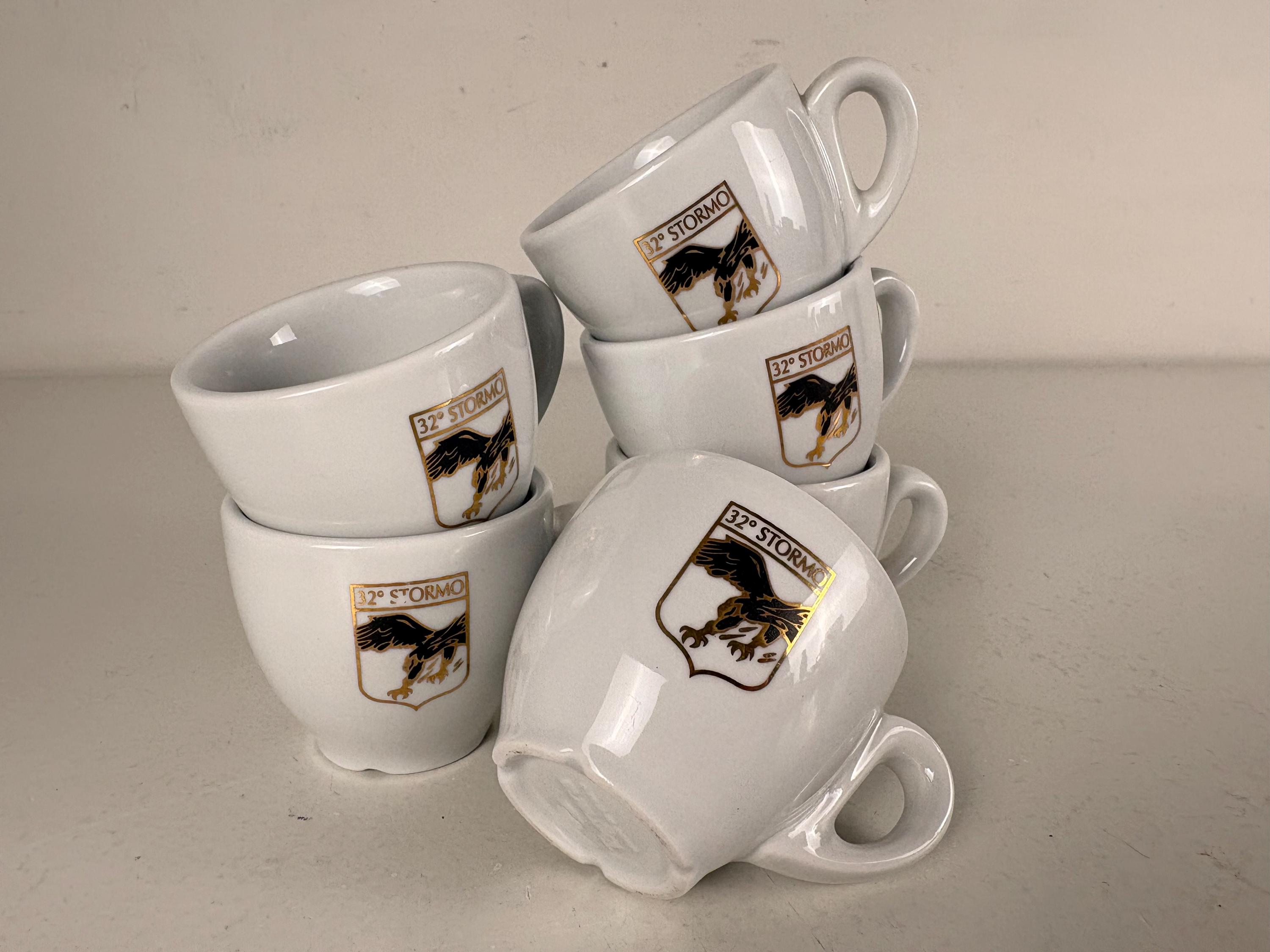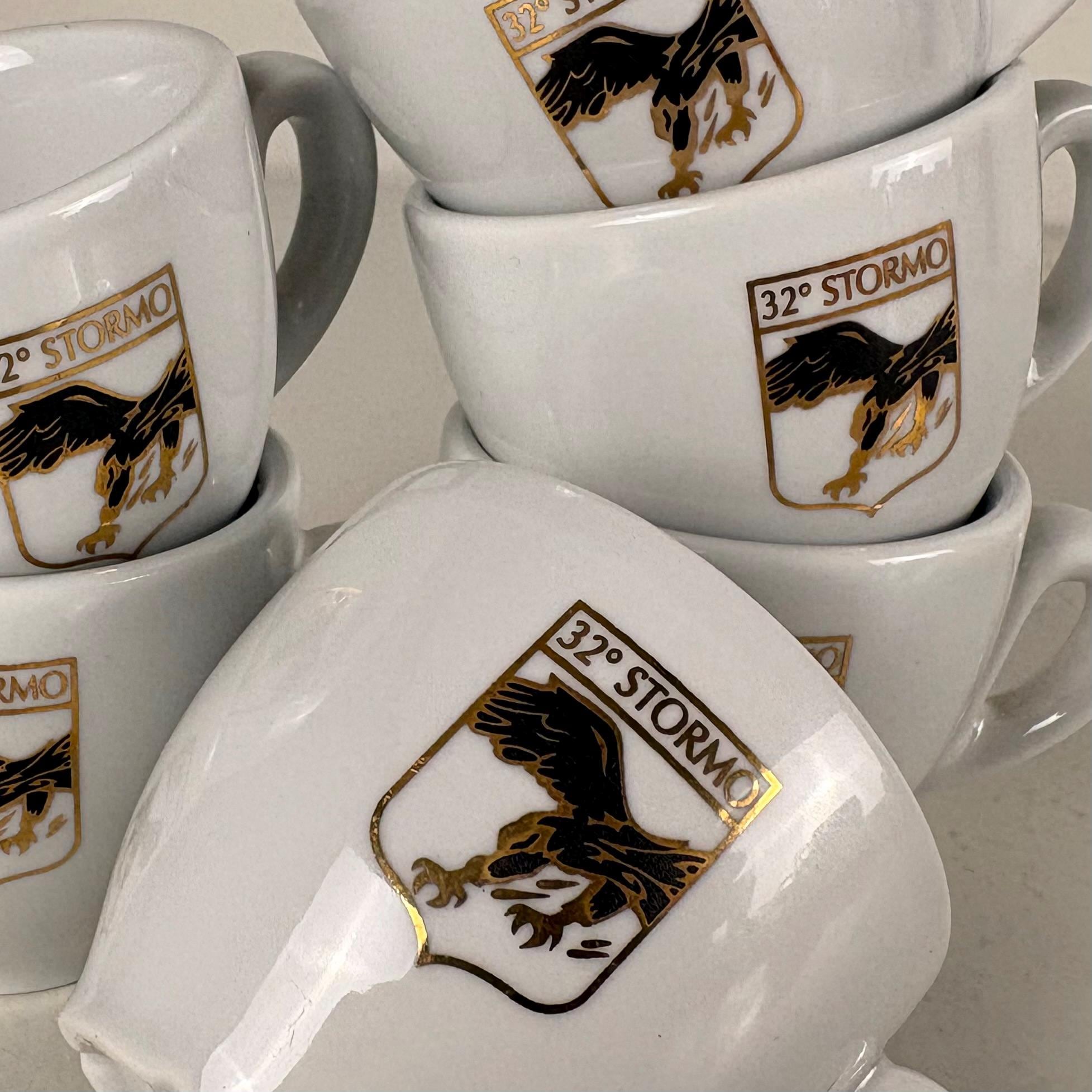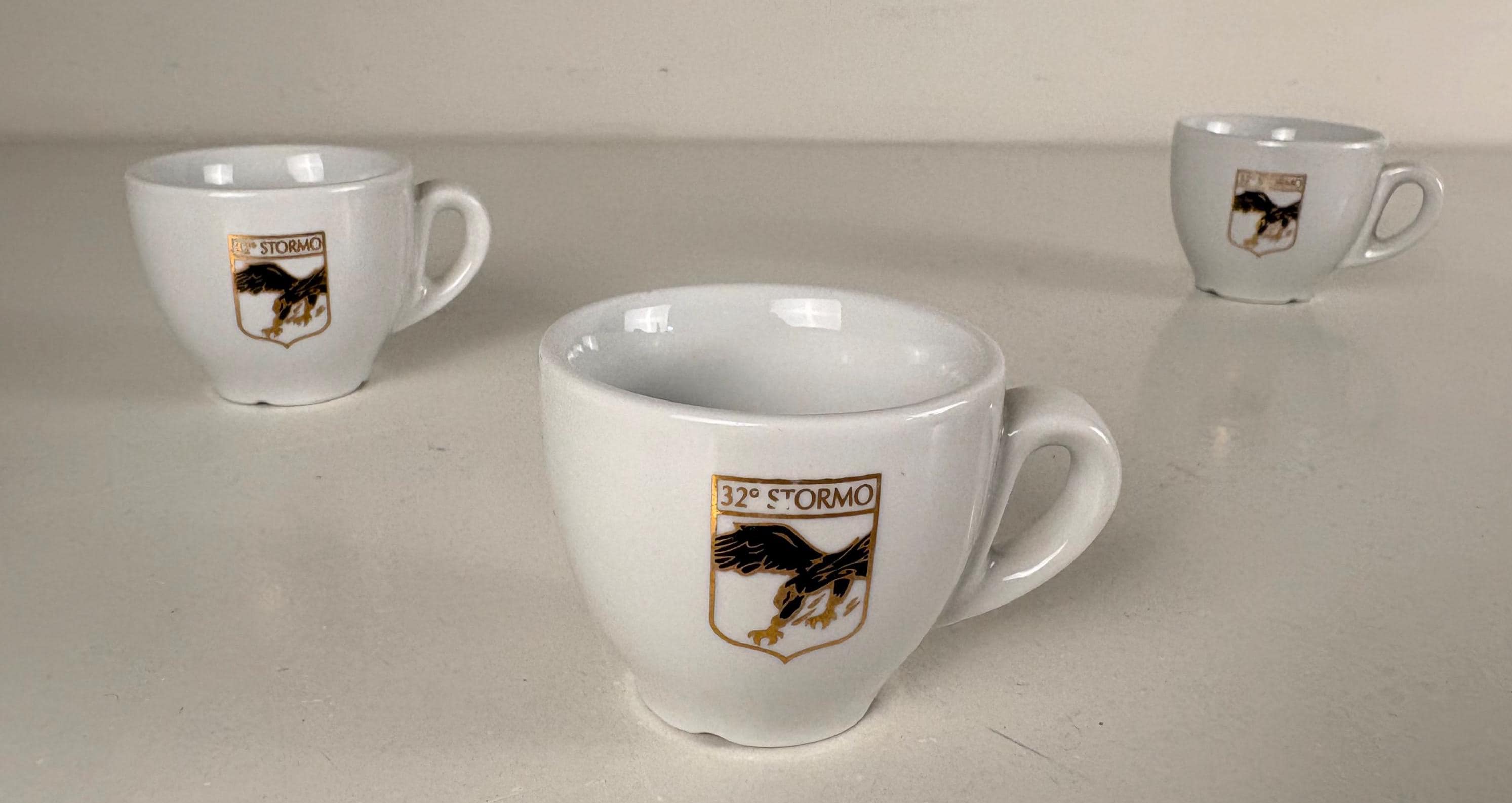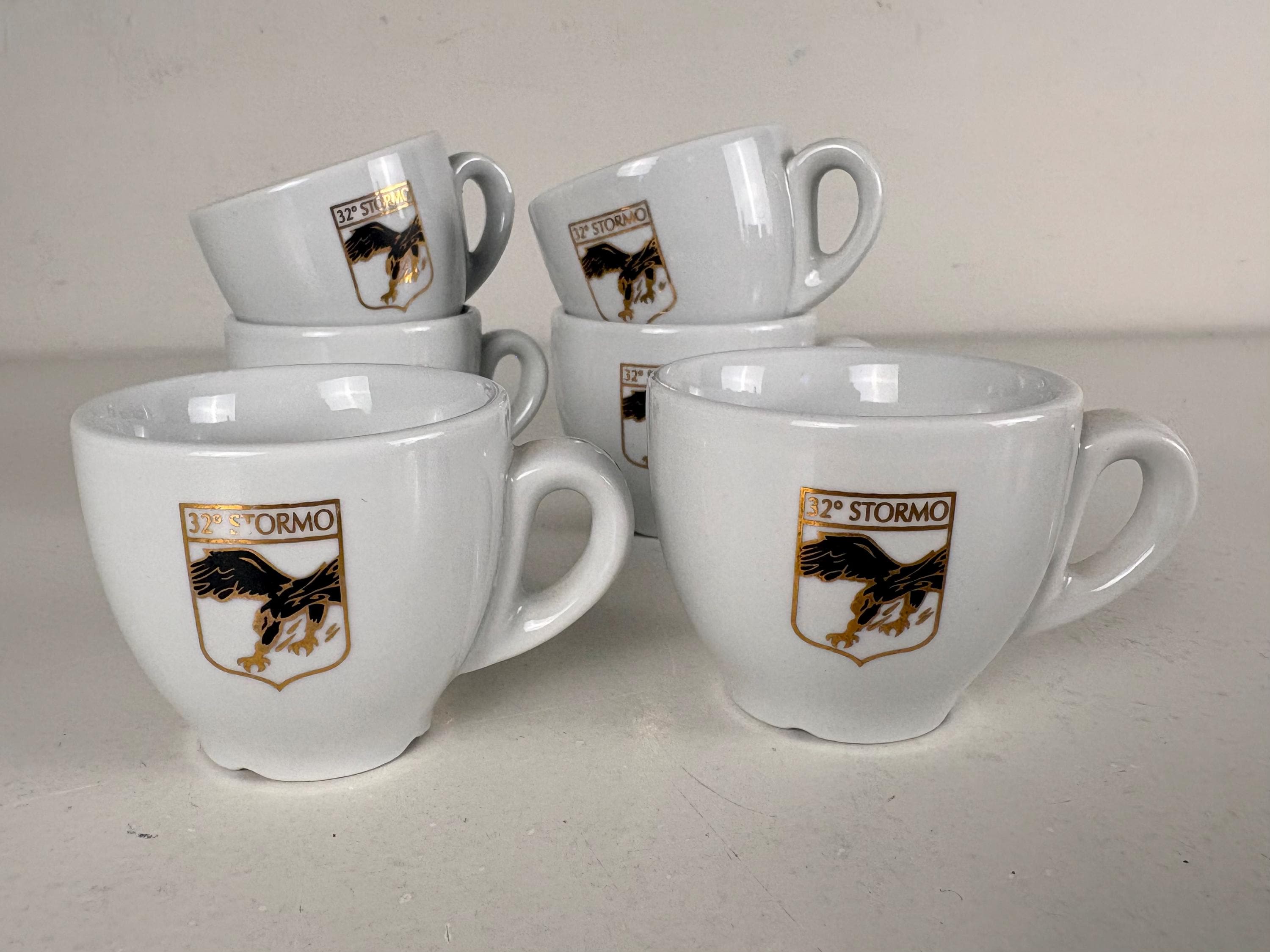 Sets of 2 Tognana espresso cups, white with the 32th Stormo Air Force Aeronautica Militare AM, 32th Wing, Italy 2000s. The logo is in black with golden details. Espresso cups collectibles.