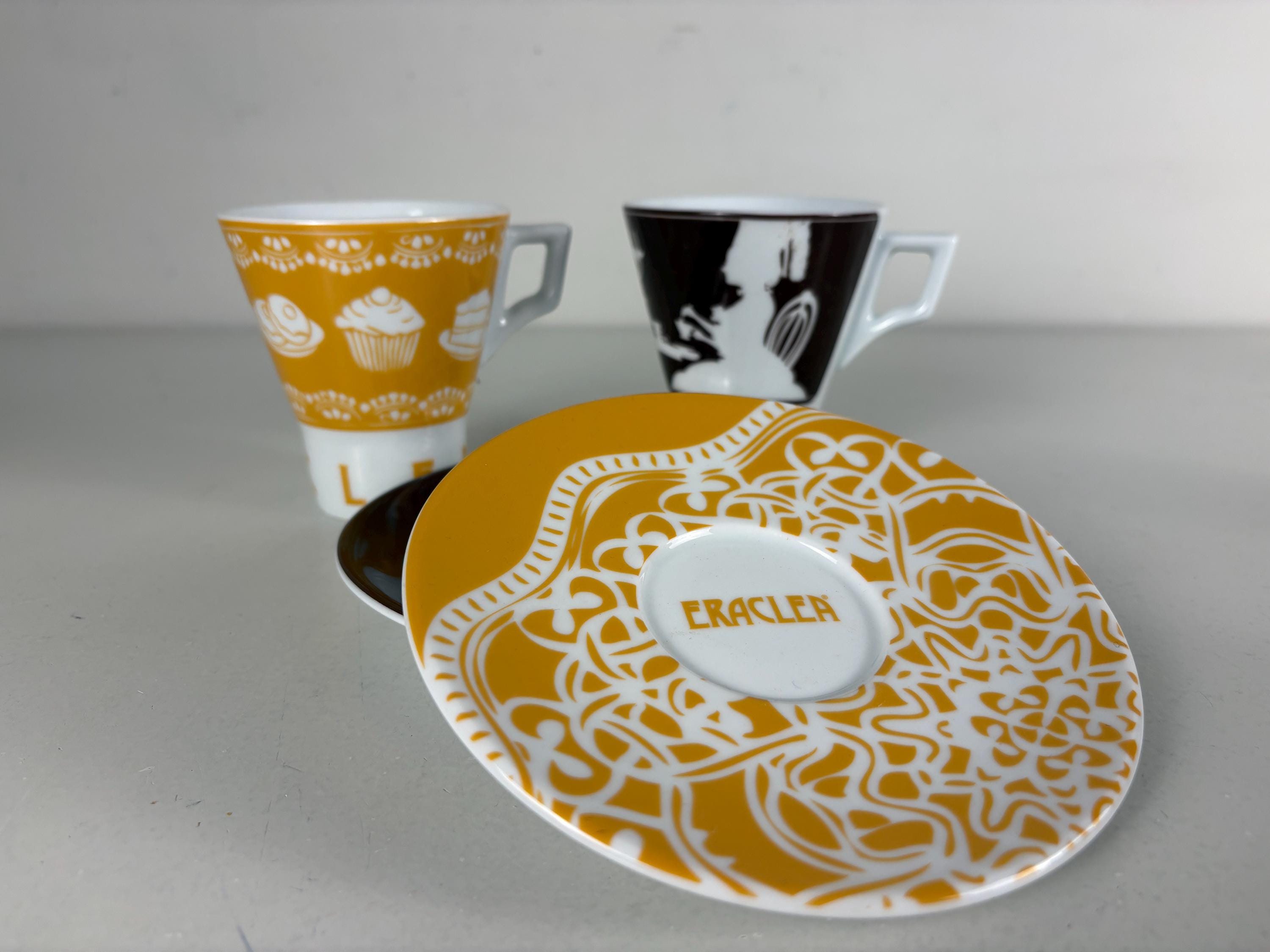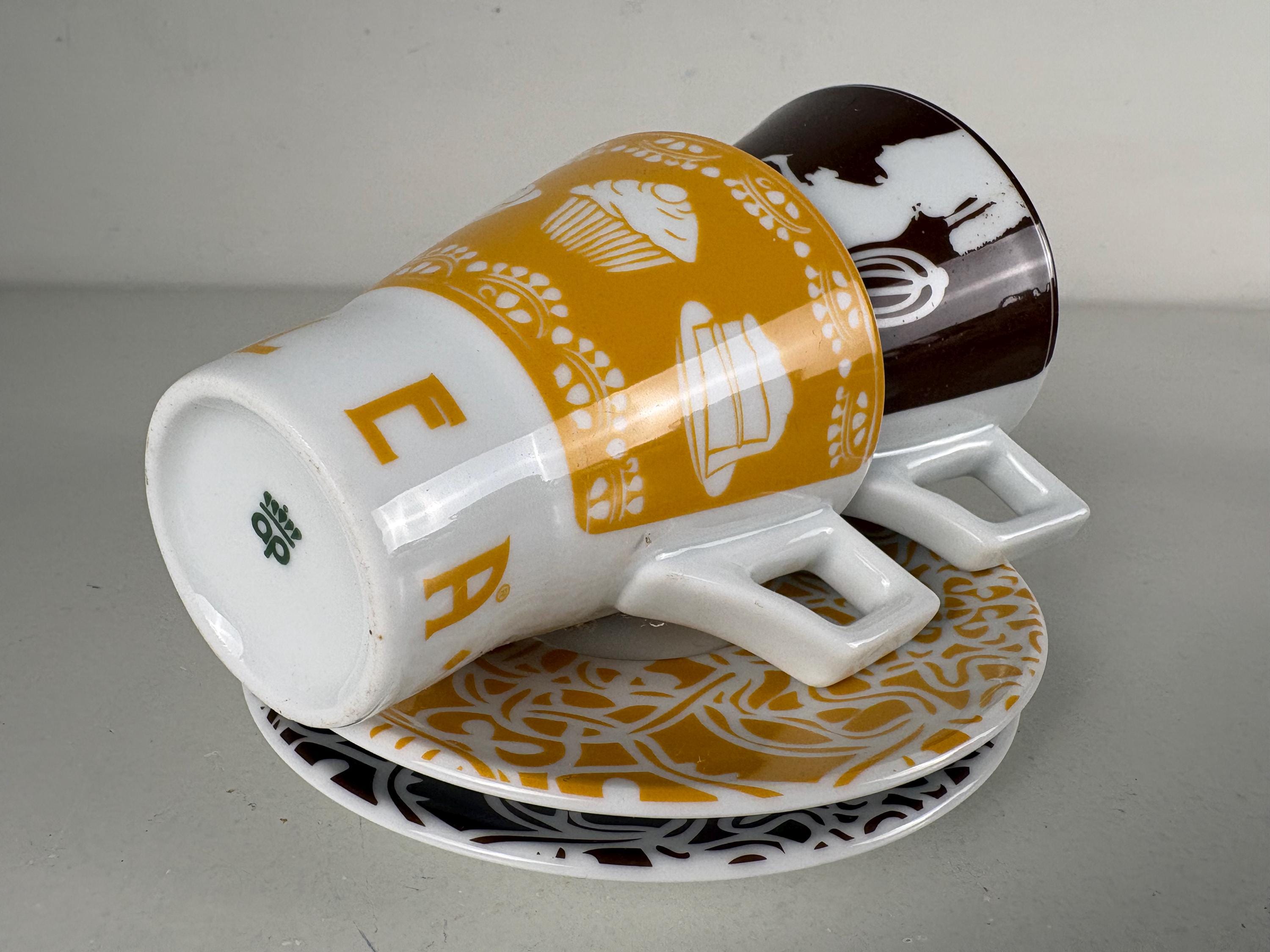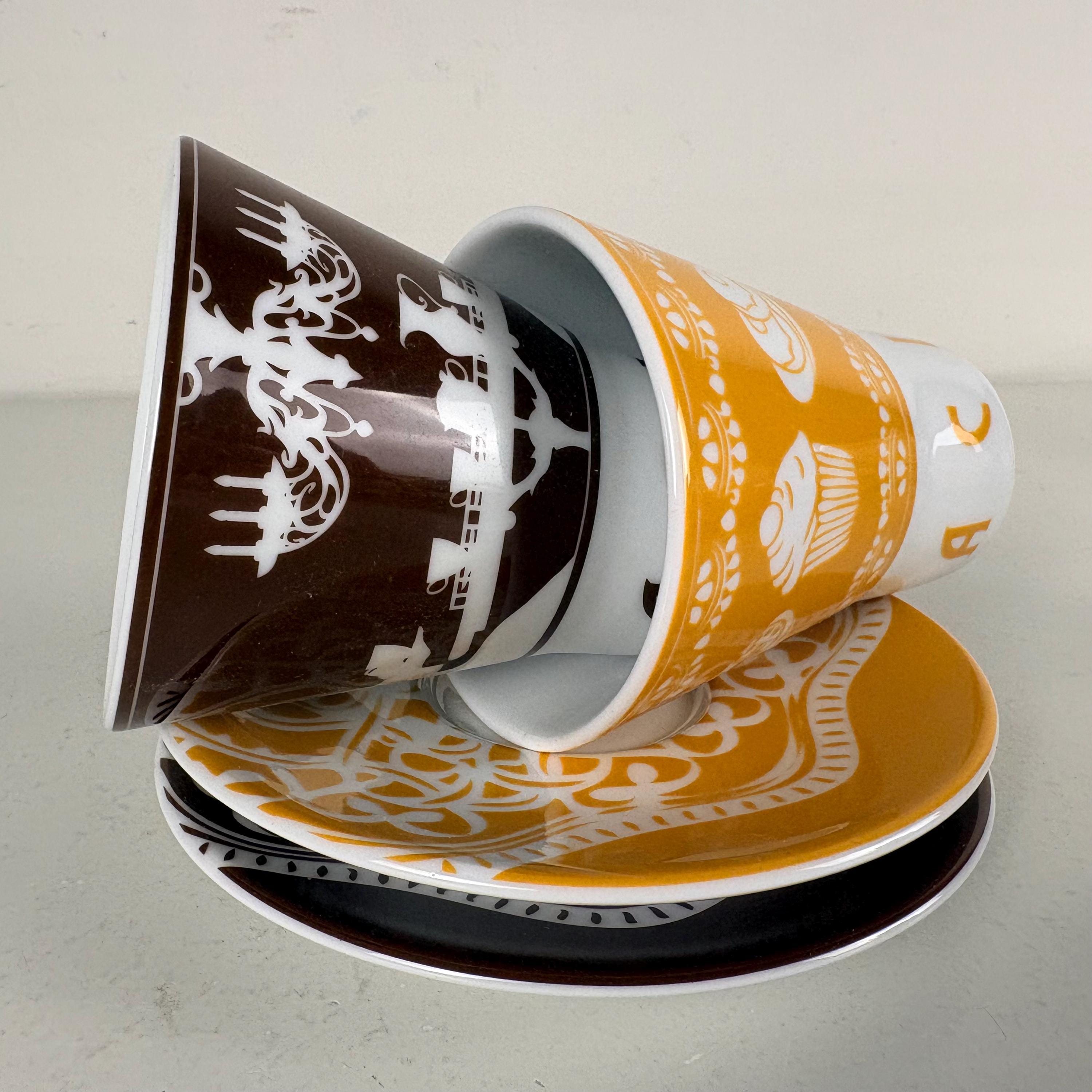 We offer sets of 2 hot chocolate cups with matching saucers, yellow and dark brown, bar quality porcelain from Eraclea Italy manufactured by Apulum Romania in the 2000s.