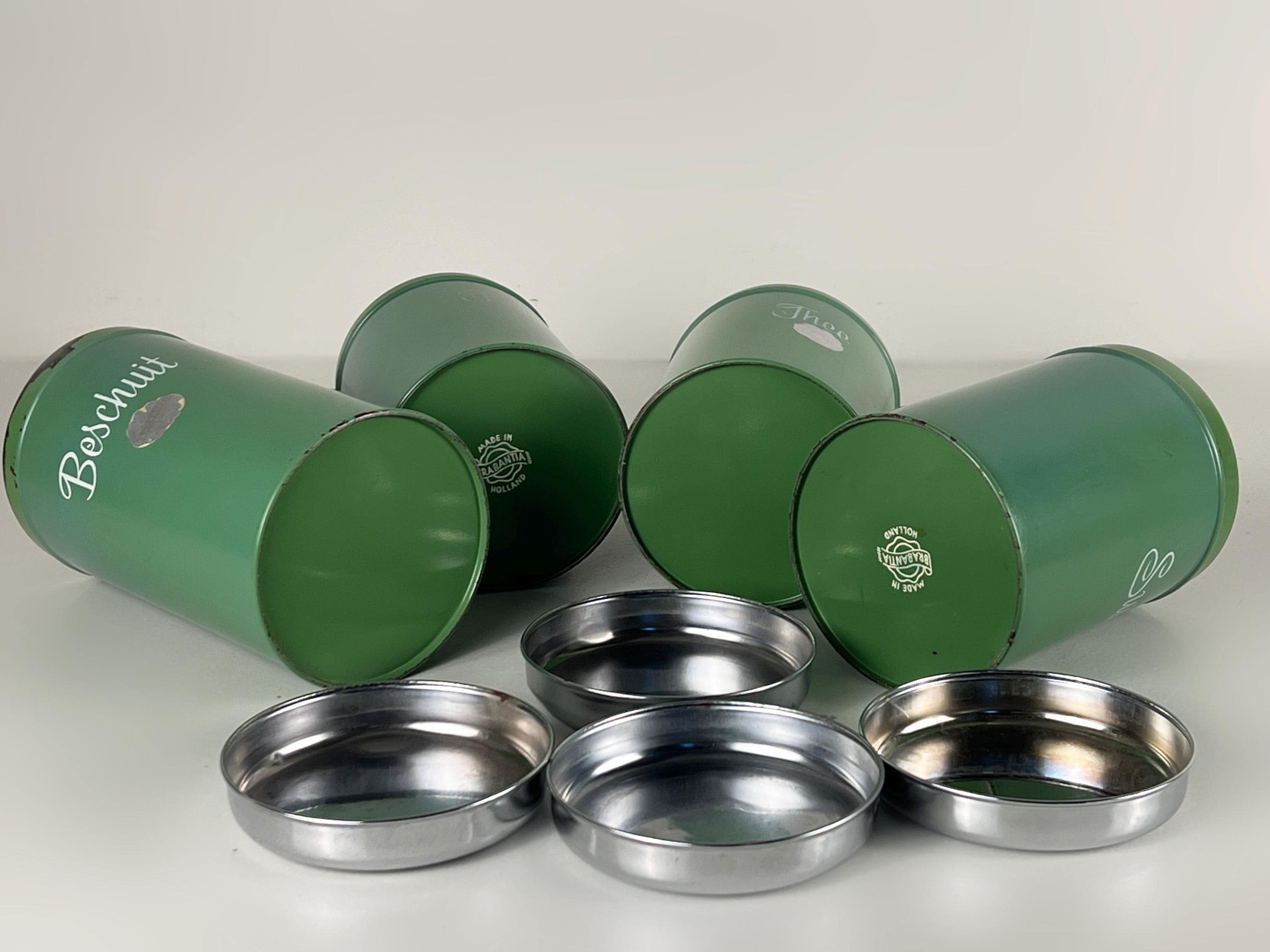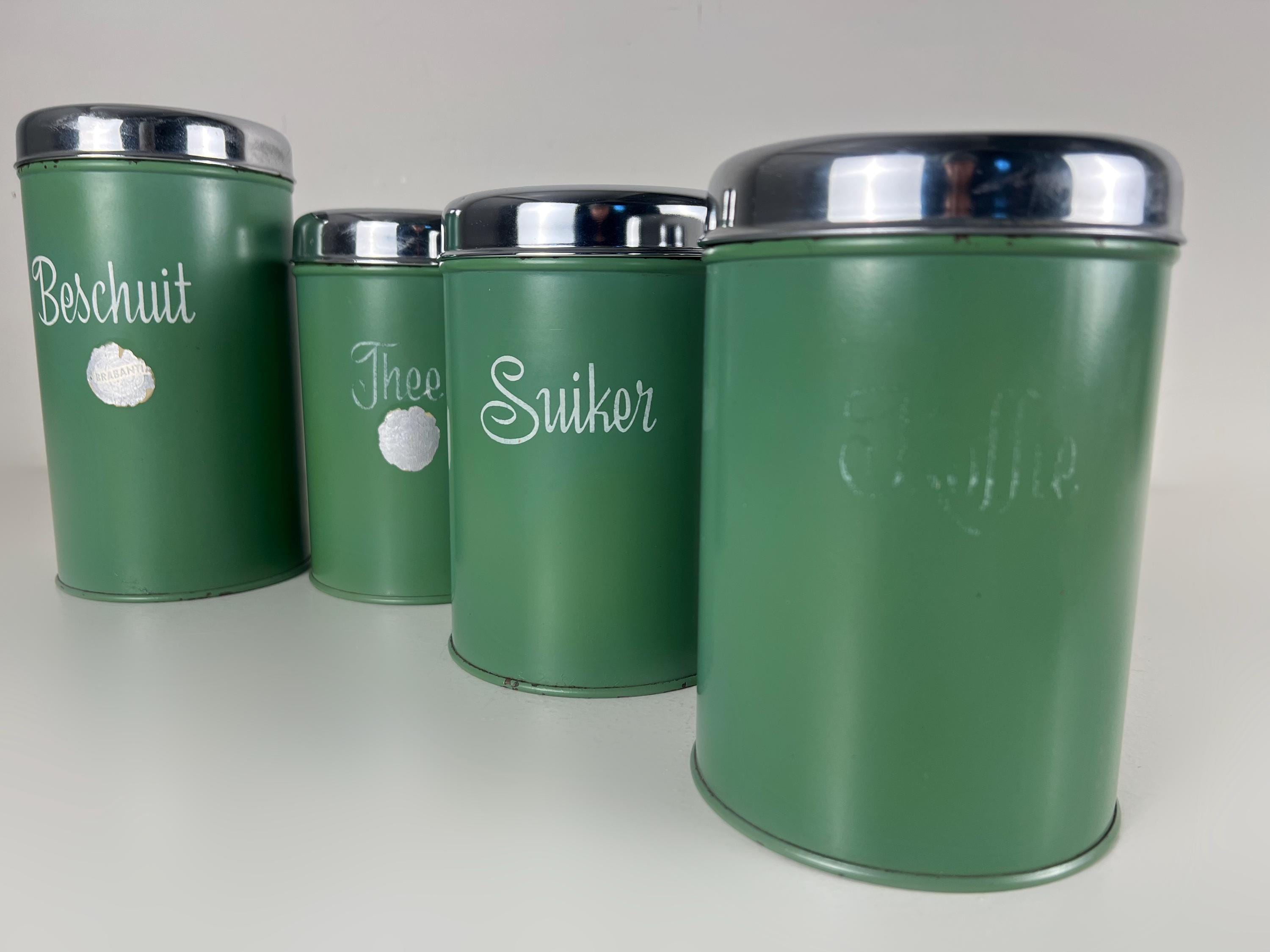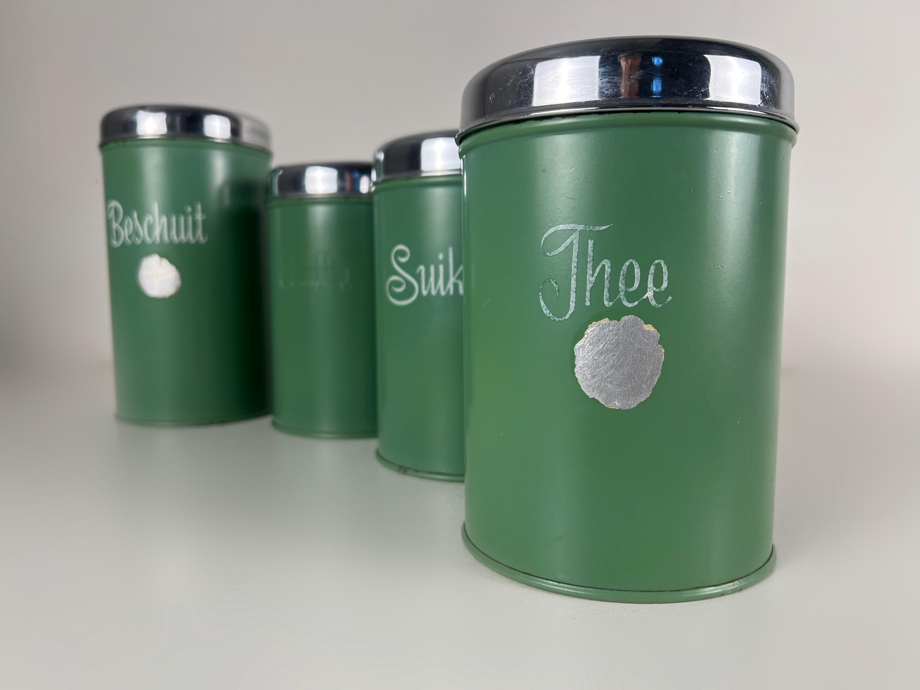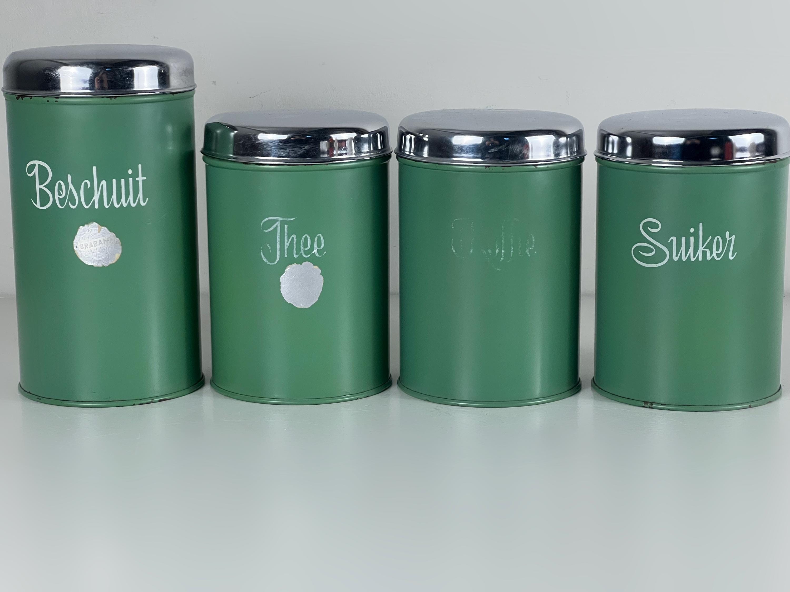 Set of 4 very decorative vintage green metal storage containers with metal lid The containers are marked Koffie (coffee), Tea (tea) and Sugar (sugar) and rusk (rusk) in white painted letters. Mid century modern Brabantia kitchenware from Holland from the 1950s.
