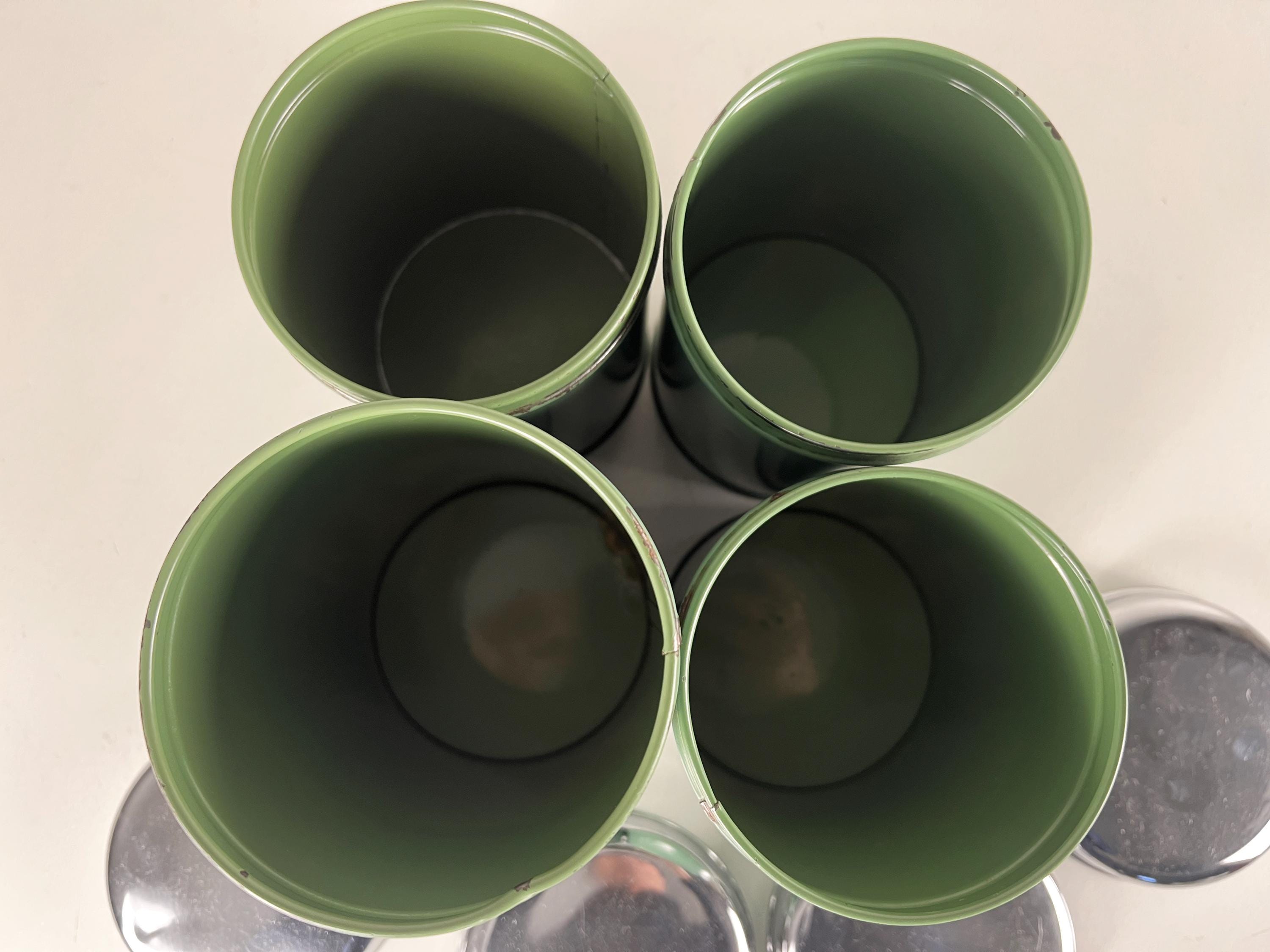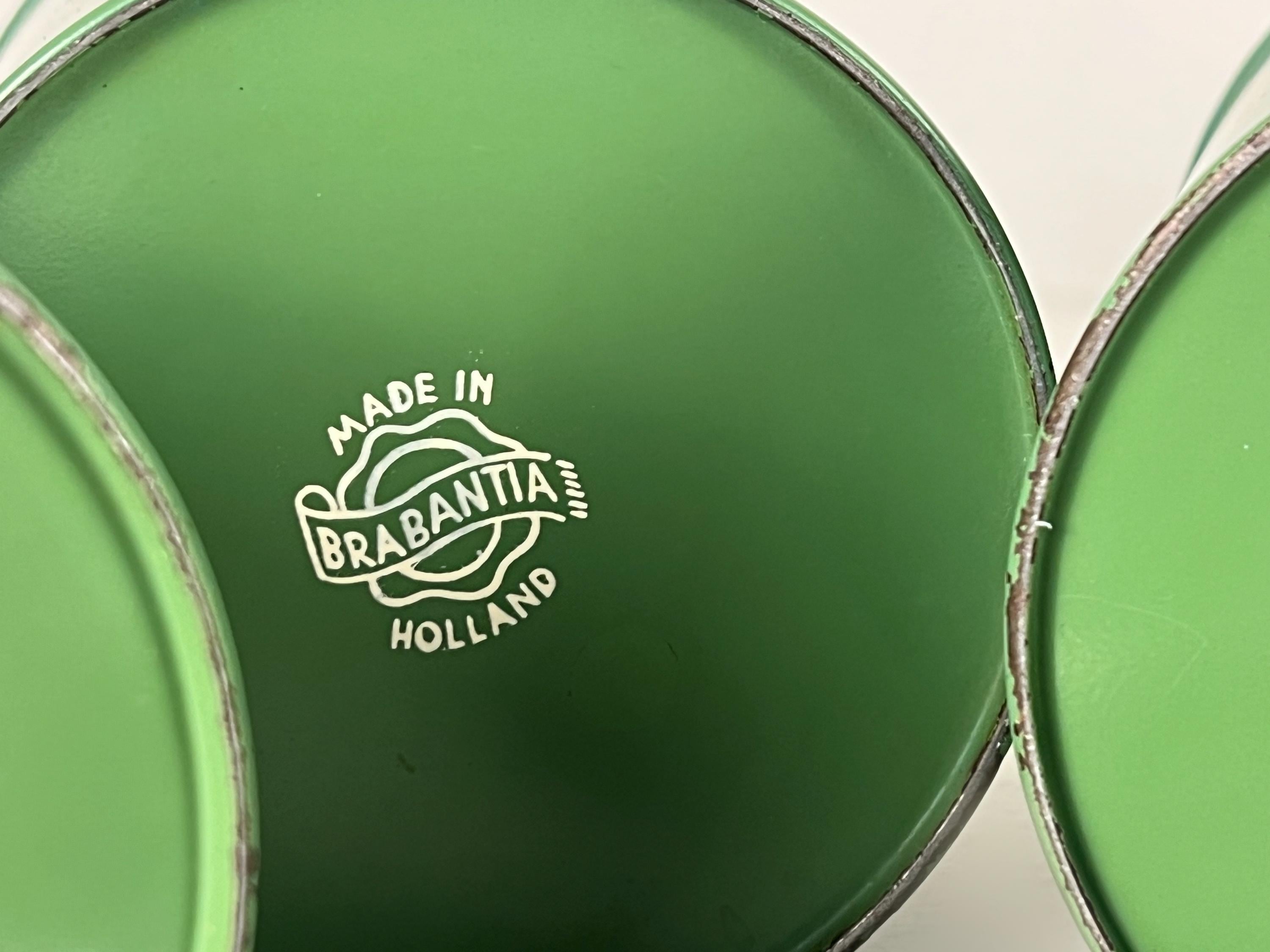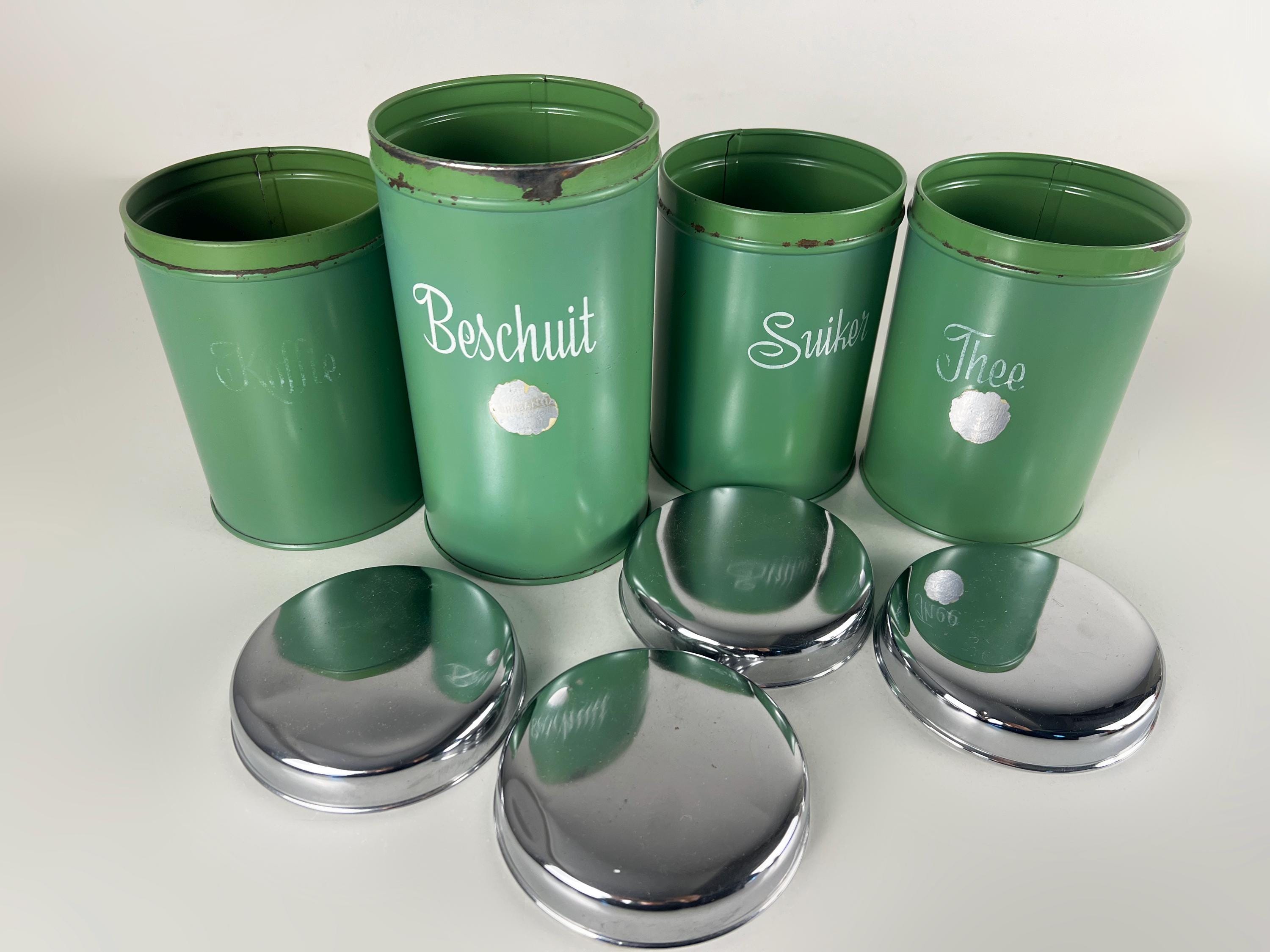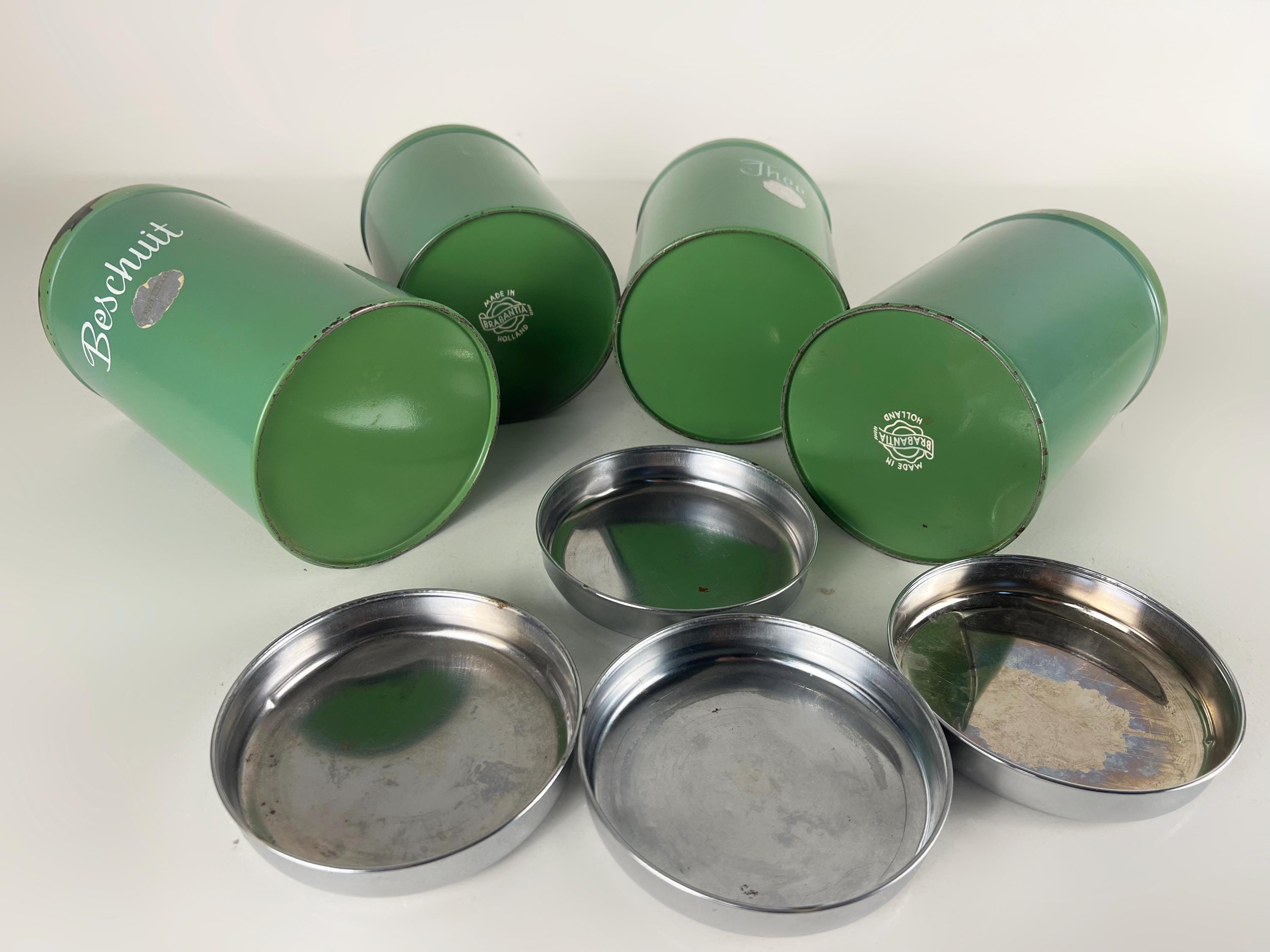 Set of 4 very decorative vintage green metal storage containers with metal lid The containers are marked Koffie (coffee), Tea (tea) and Sugar (sugar) and rusk (rusk) in white painted letters. Mid century modern Brabantia kitchenware from Holland from the 1950s.