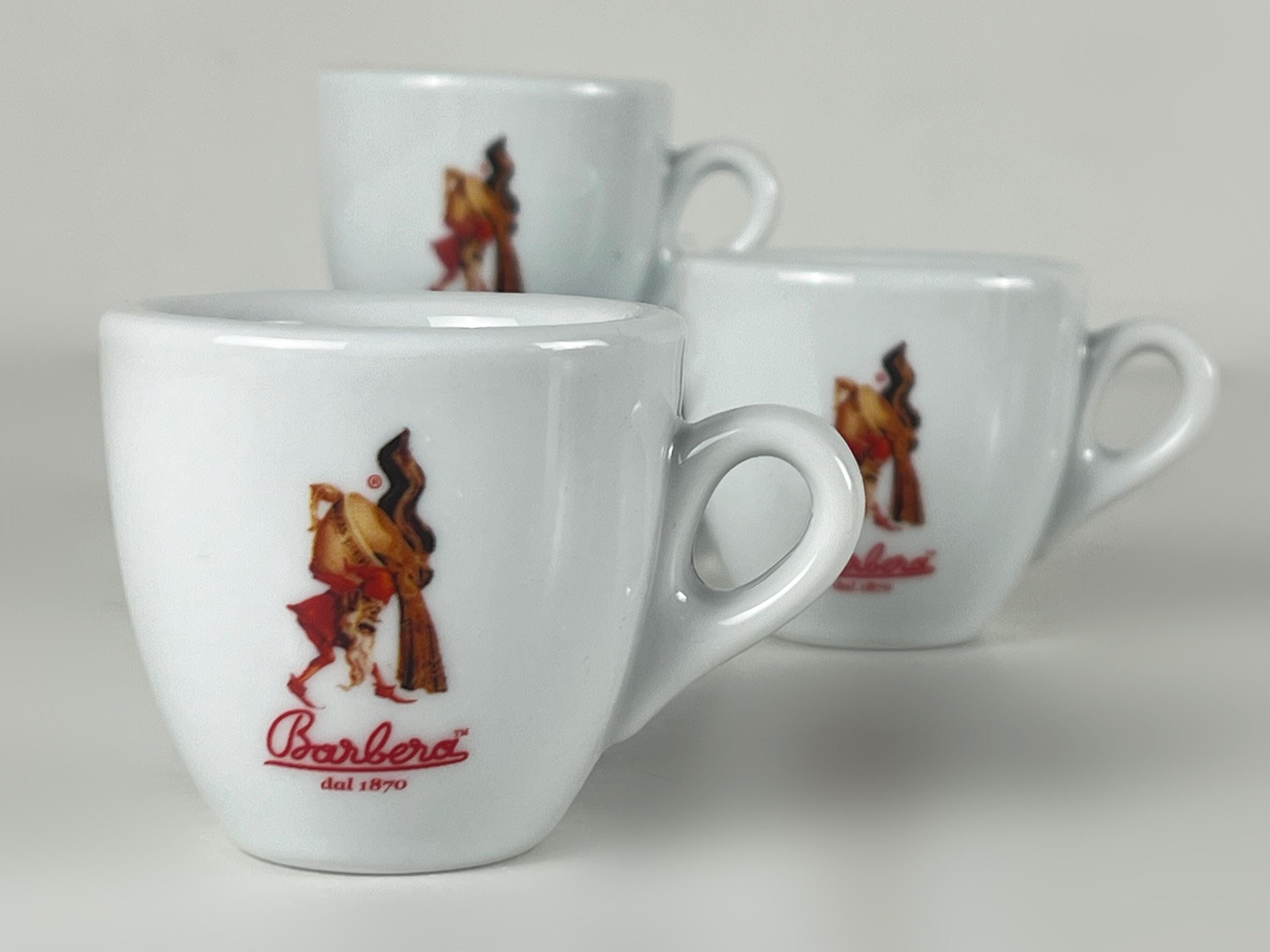 Nice vintage set of 2 or 3 thick bar quality espresso cups. The cups are Illustrated with the Italian Barbera coffee logo, produced in Palermo Italy by Nuova Point.