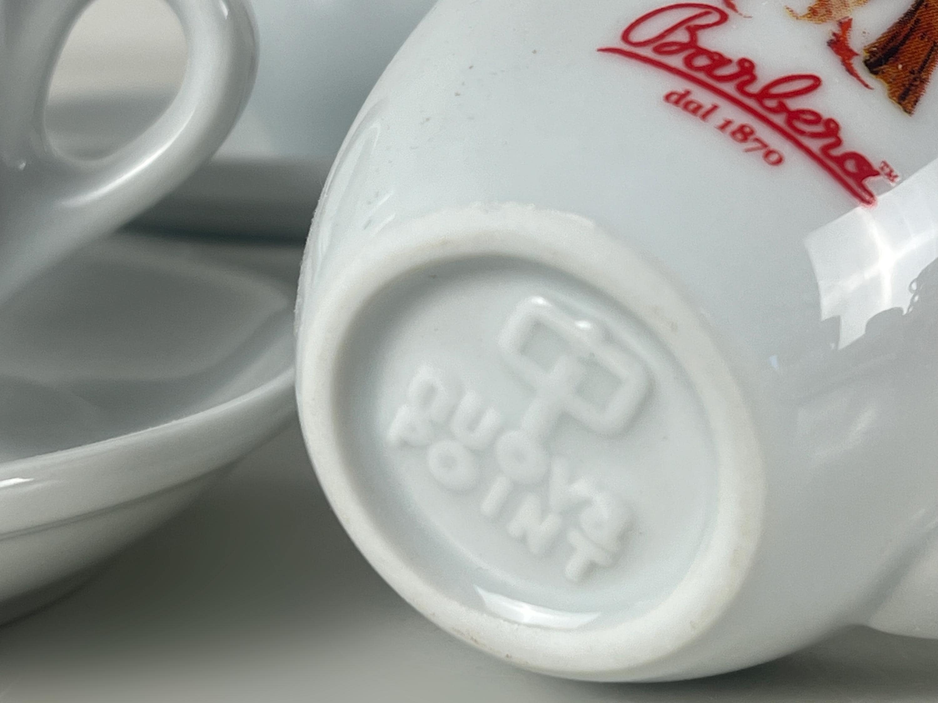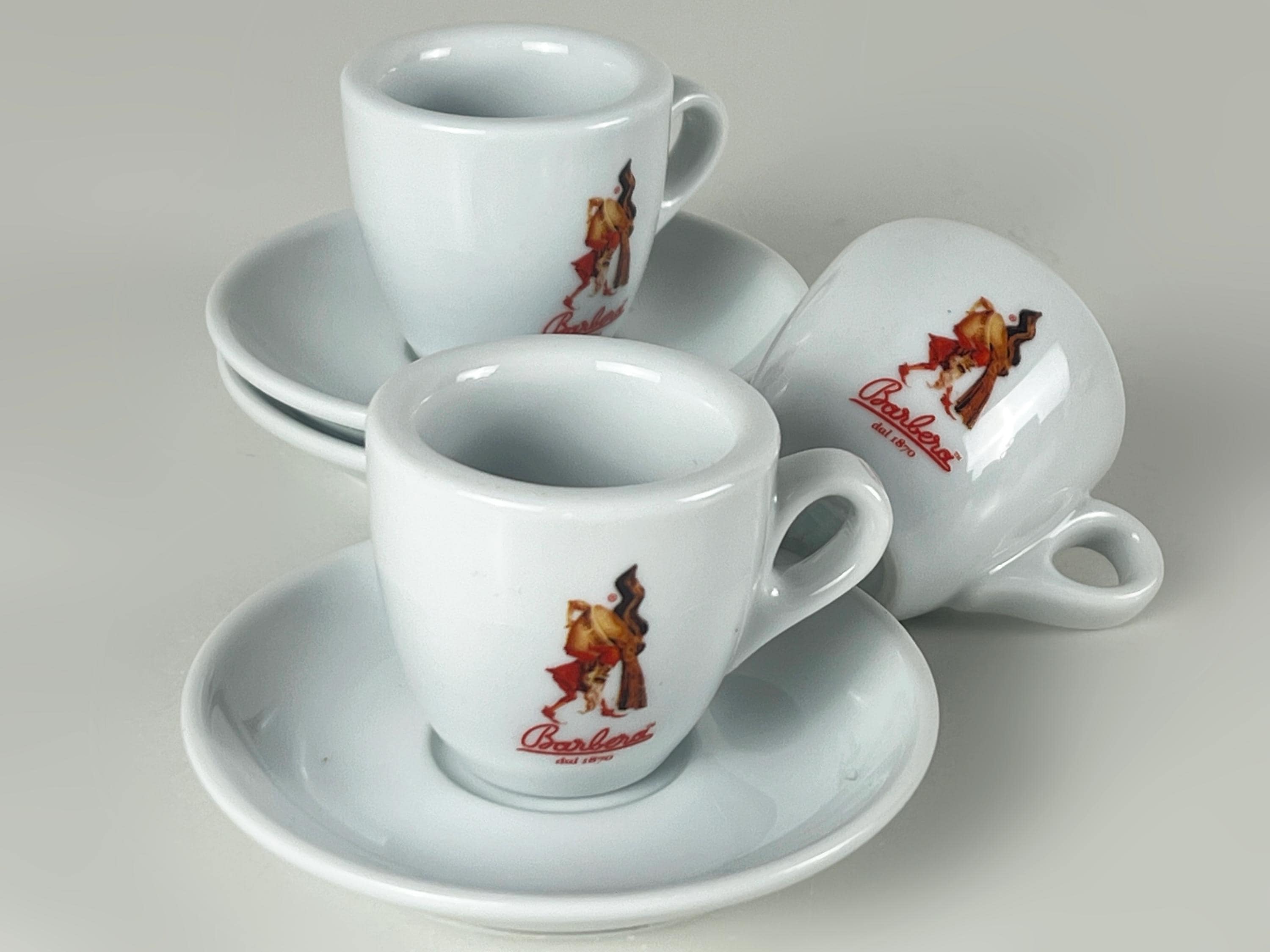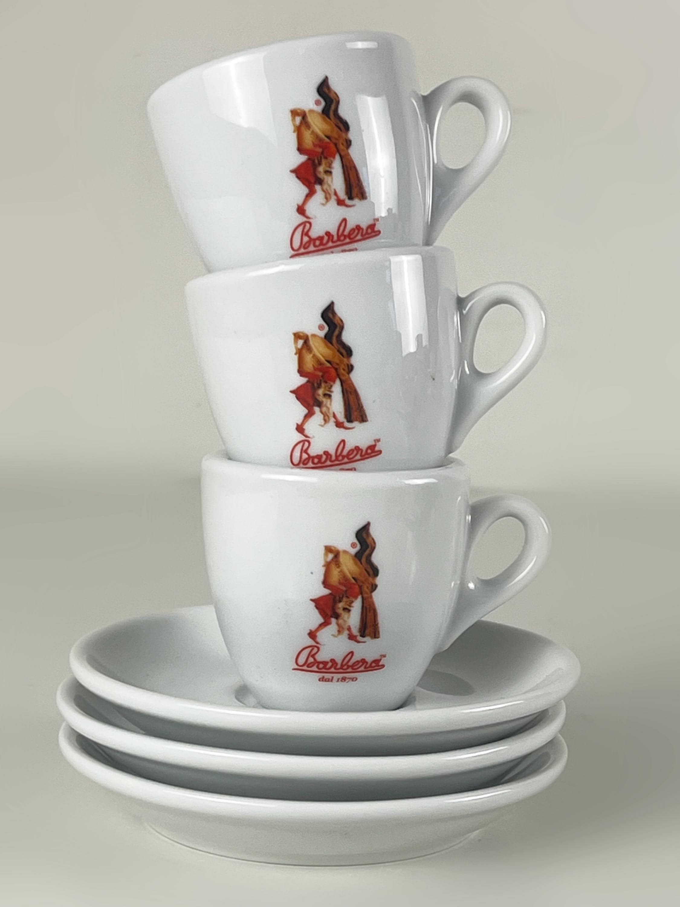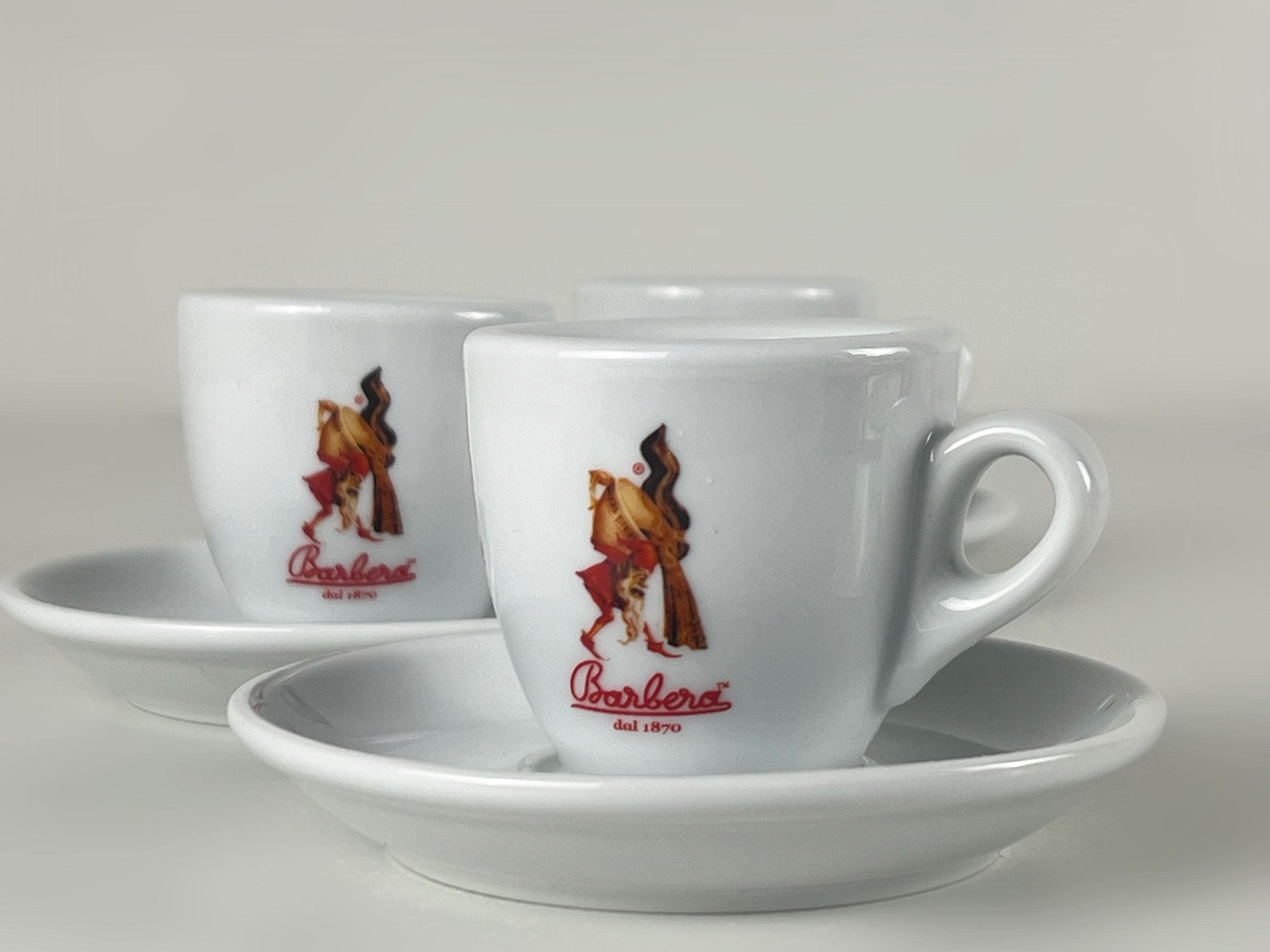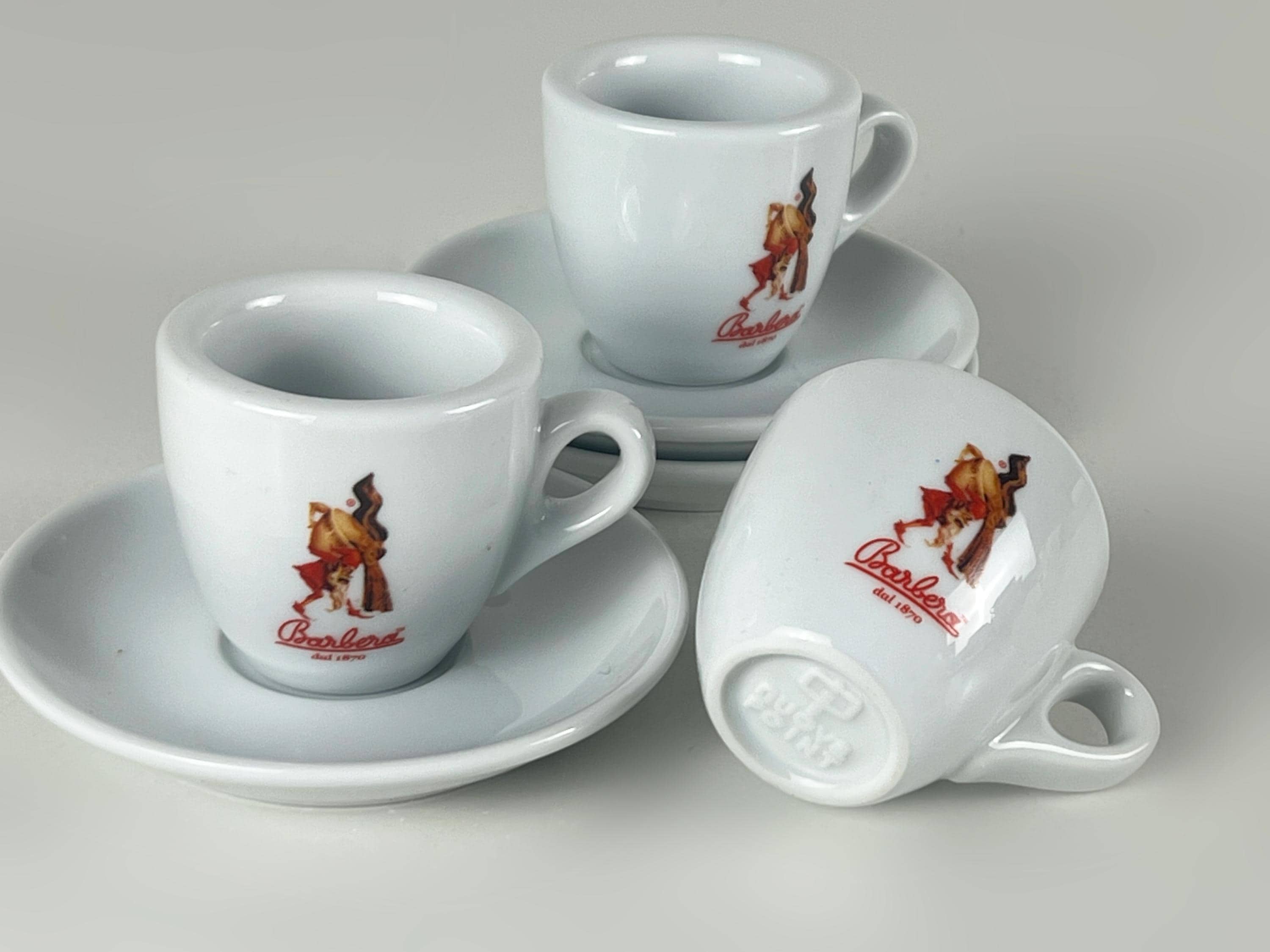 Set of 2 or 3 porcelain bar quality espresso cups and saucers. The cups are illustrated with Italian Barbera coffee logo. Nuova Point Italy.