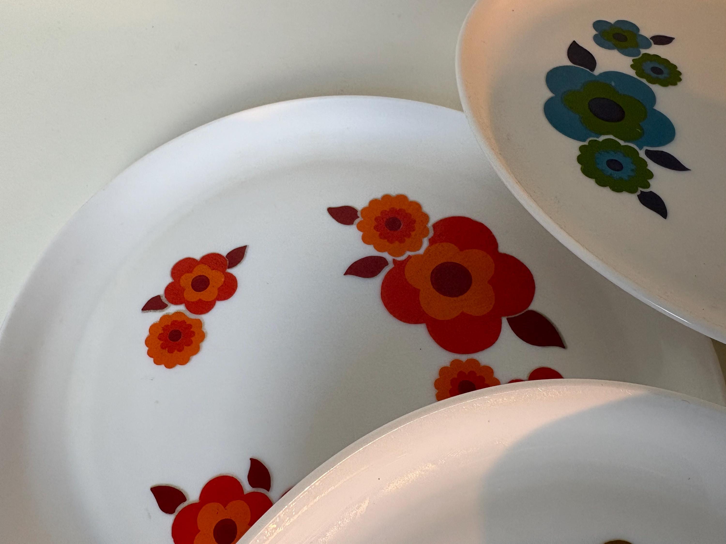 Sets of 2 Retro Arcopal Lotus decor dinner plates Arcopal France 1970s kitchenware, retro mcm flower design.