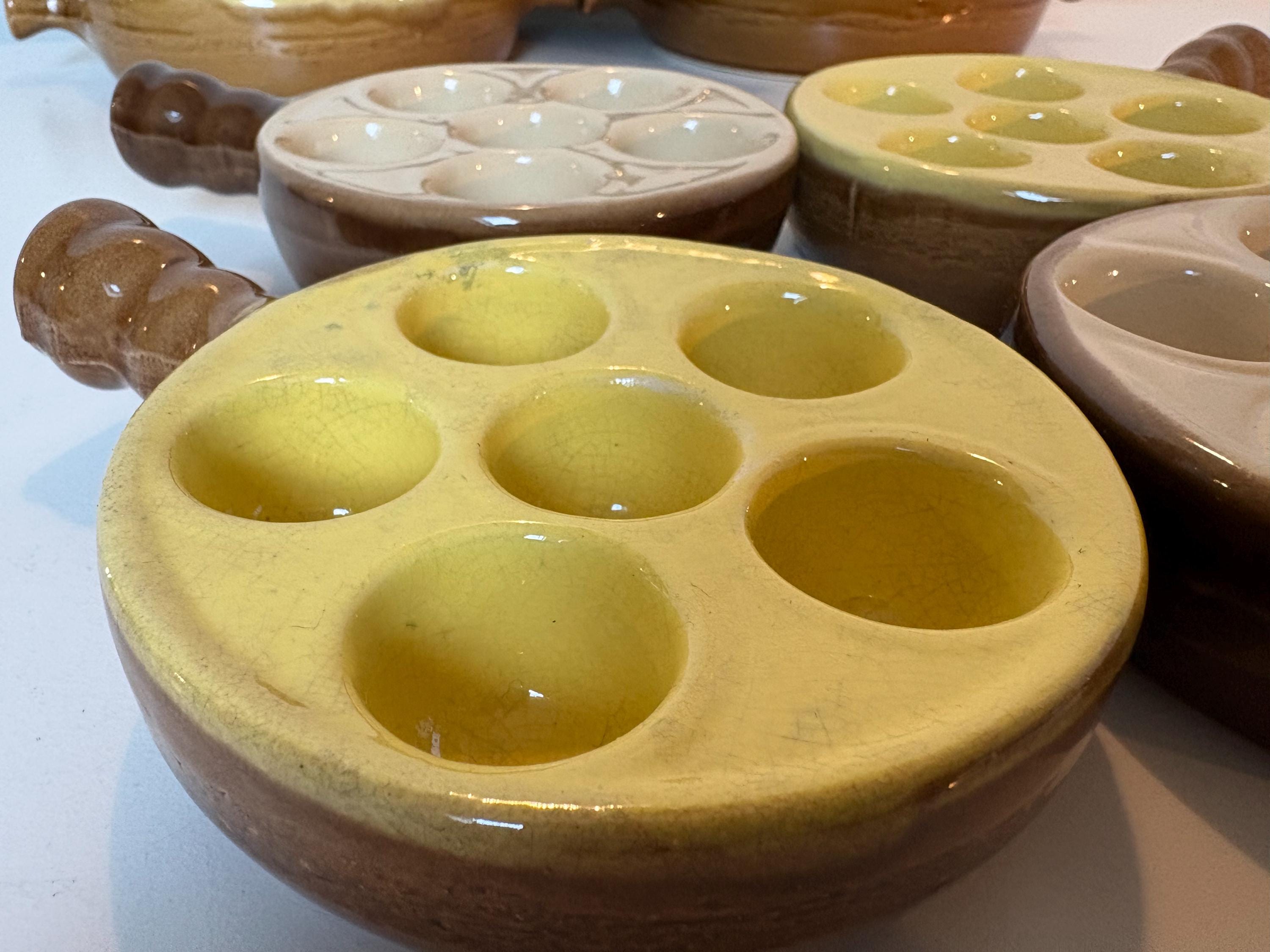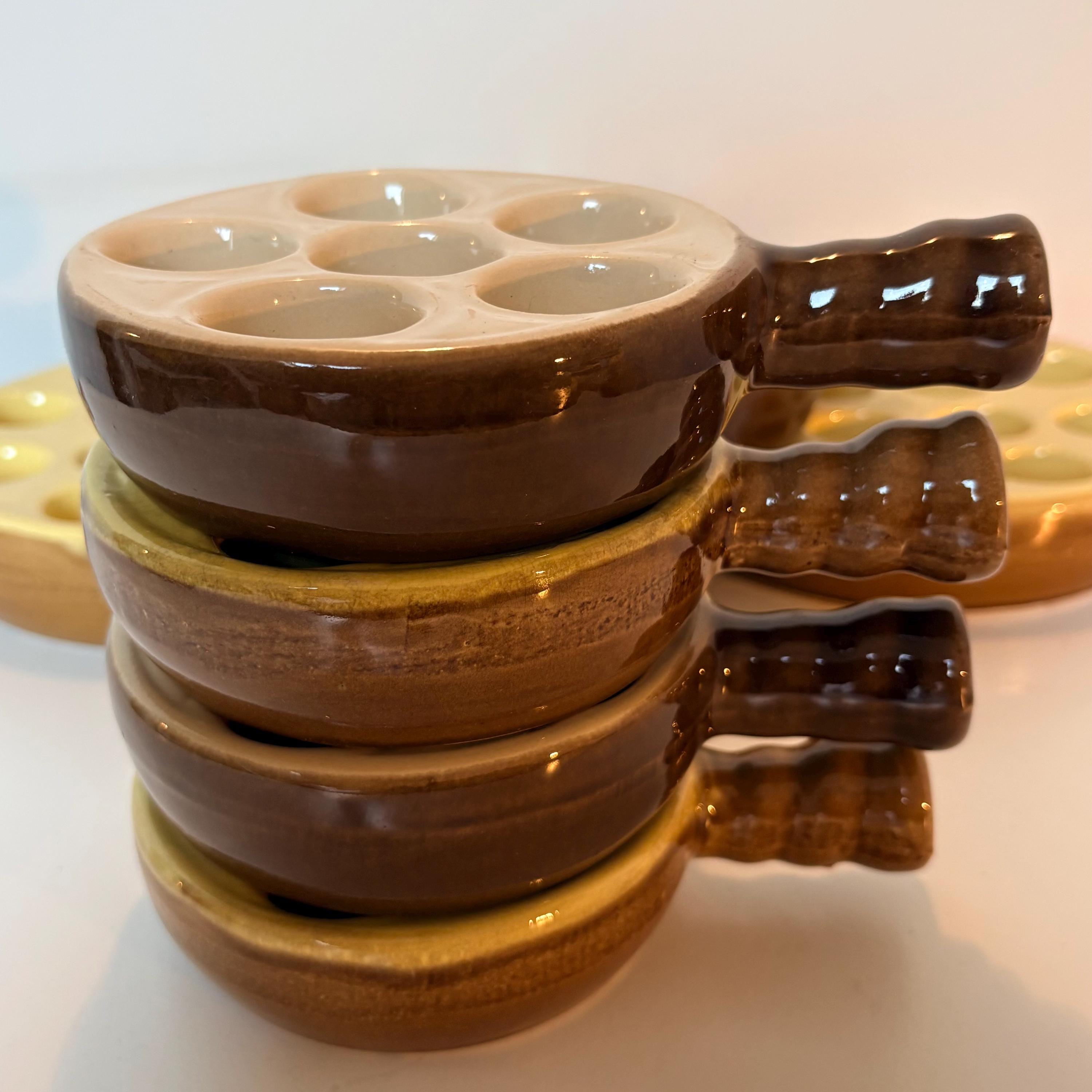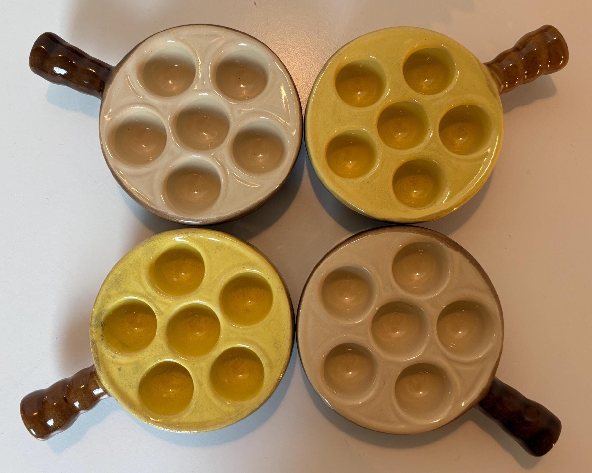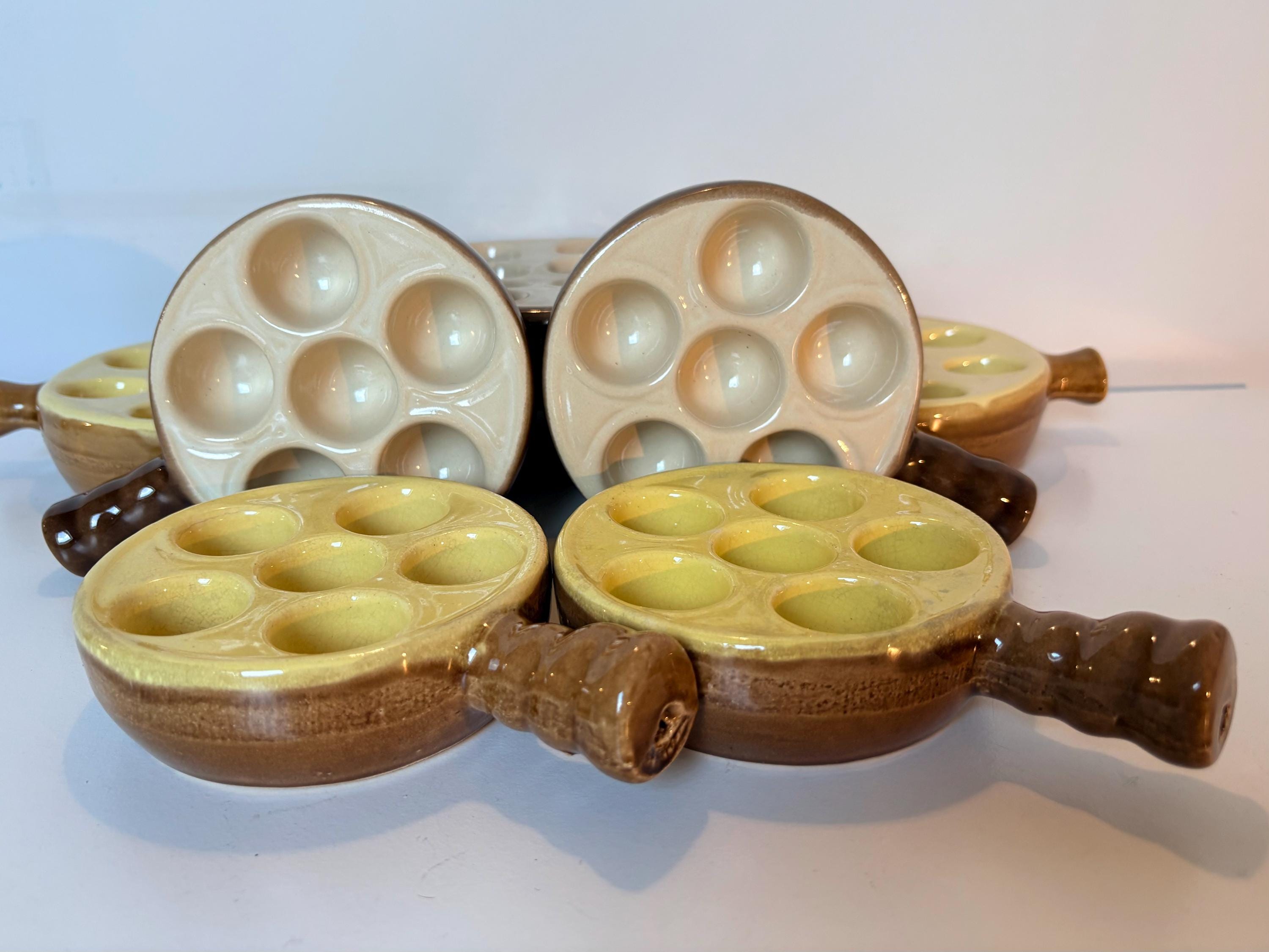 Set of 4 vintage escargot bakeware dishes in brown, beige and yellow shades made in France 1980s. Mix and match set.